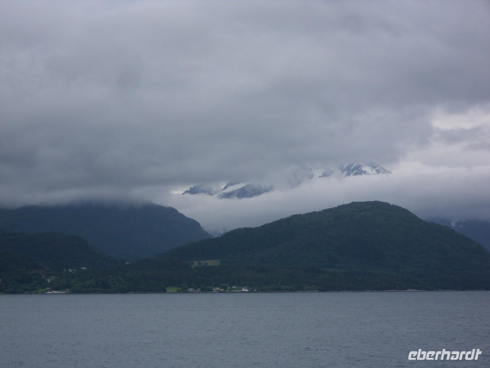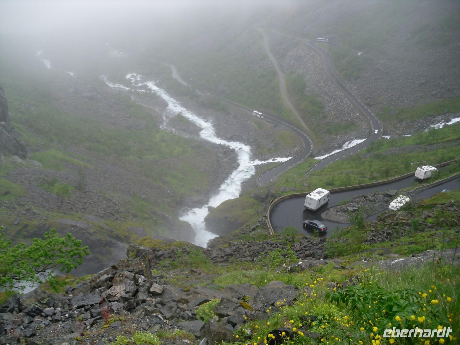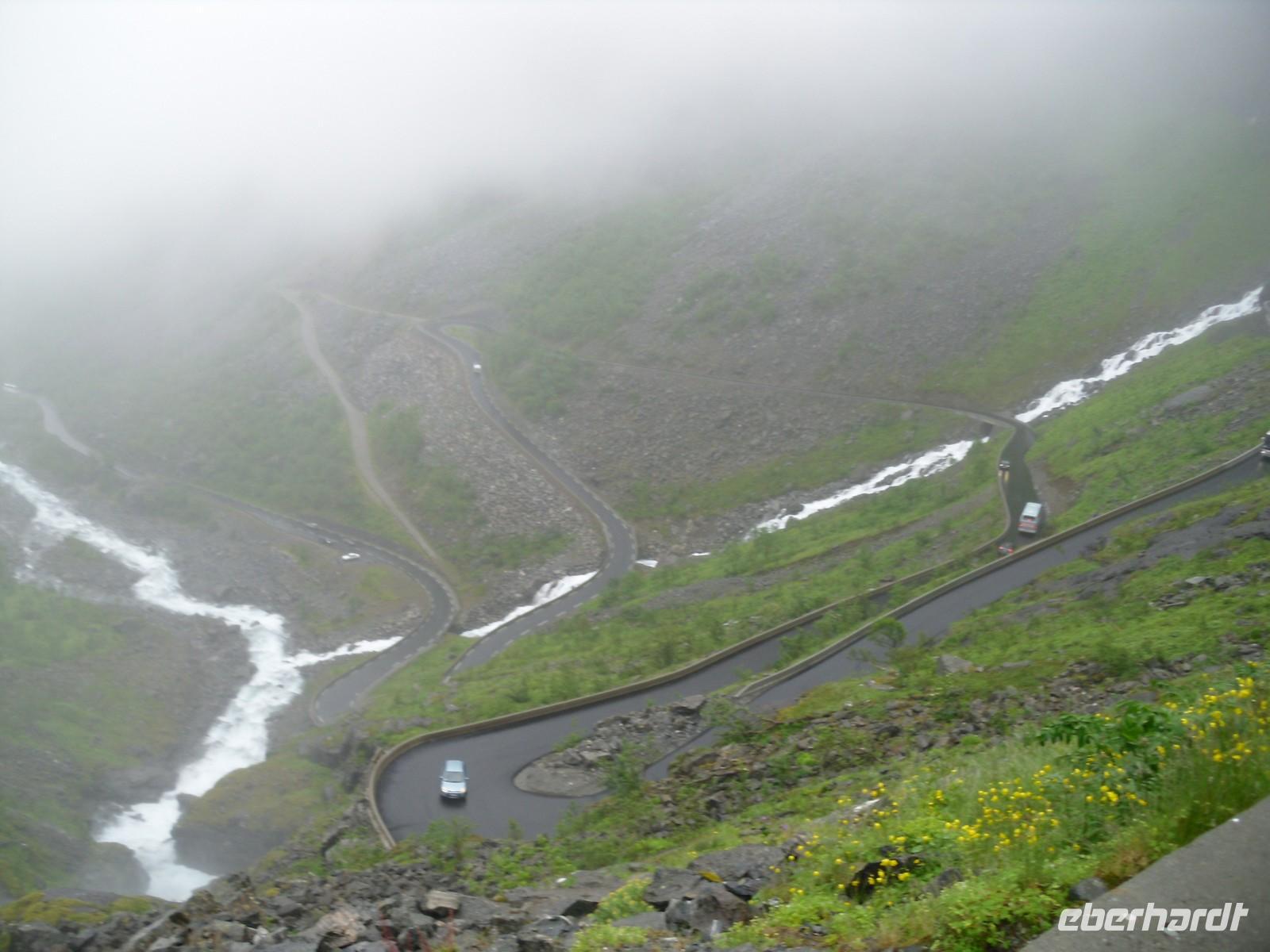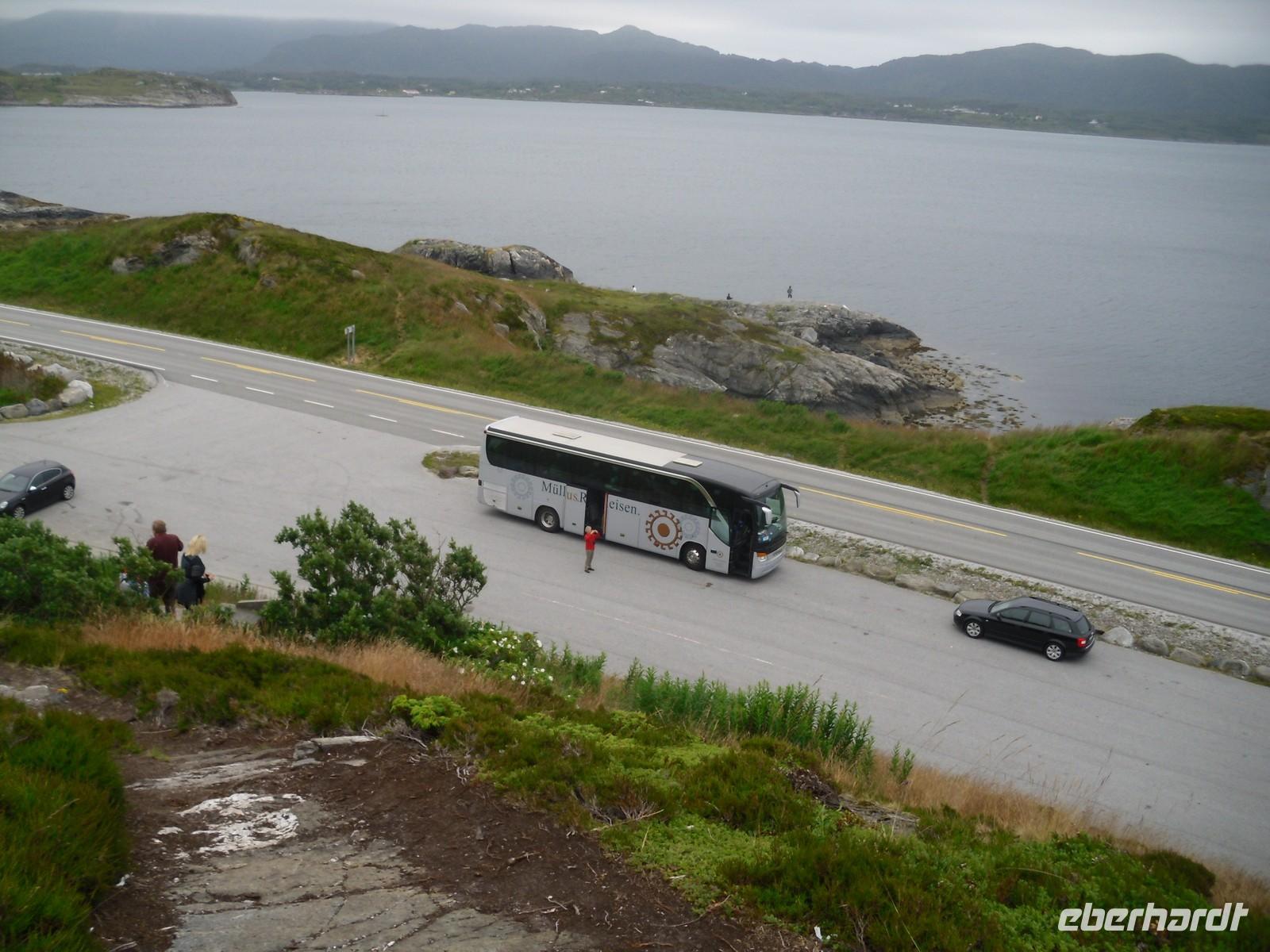 Nach einem vorzüglichen Sonntagsfrühstück verstauen wir wieder unsere Koffer im Bus und fahren zunächst hinauf auf den Varden, der Hausberg von Molde. Uns ist heute auch wieder kein schönes Wetter vergönnt und so müssen wir ohne Ausblick den Aussichtspunkt verlassen. Am heutigen Tag haben wir auch eine kurze Fährüberfahrt von Sølsnes nach Afarnes, ein ganz neues Erlebnis für unsere Reisegäste. Das Erklimmen der "Trollstigen" ist unser nächster Höhepunkt. Vorbei an Andalsnes, hier ist der Endpunkt der Raumabahn, sie soll eine der schönsten Eisenbahnstrecken Norwegens sein. Wir machen uns auf den Weg, die von hohen Gipfeln und tiefen Schluchten