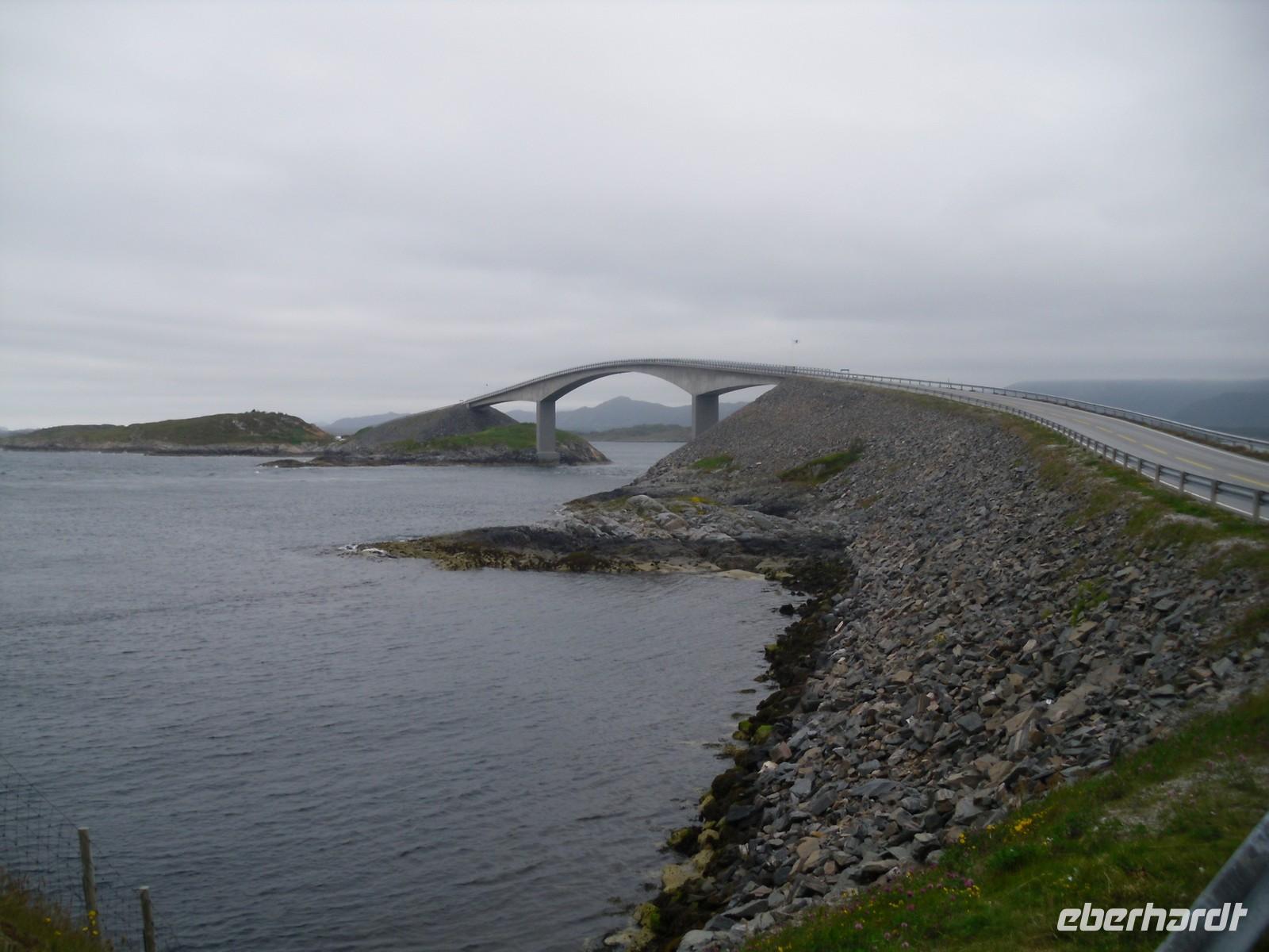 versuchen wir uns aufzuwärmen. Schnell noch ein Foto von der Klippfischfrau und auf geht es zum nächsten Höhepunkt unserer Reise, die Fahrt auf der Atlantikstraße, mitten durch die offene See und die markante Schärenlandschaft. Die Straße führt zuerst in einen langen, neuen Tunnel unter dem Fjord entlang, dann die Atlantikstraße mit mehreren Brücken und Dämmen in einer tollen Form der Straße auf einer Länge von 8 km. Wir legen 2 Fotostopps ein und klettern dabei auch auf einen Hügel, um schöne Aussichten zu genießen. Wir haben für unsere Fahrt nach Molde noch die Sonne und blauen Himmel gesehen. In das Gebiet der Romsdalsalpen können wir kaum sehen, aber nach dem Abendessen zeigt sich der Himmel gnädig und es gibt Berge zu sehen. Genächtigt wird heute in der "Stadt der Rosen" so der Beiname von Molde, das milde Klima verlieh ihr einst den Namen. Am späten Abend legen noch 2 Schiffe der Hurtigrute direkt vor unseren Balkonen des Hotels an, was bei uns nochmal große Freude auslöst. 23.00 Uhr ist es noch taghell, es wird wieder sehr spät mit dem Schlafengehen.