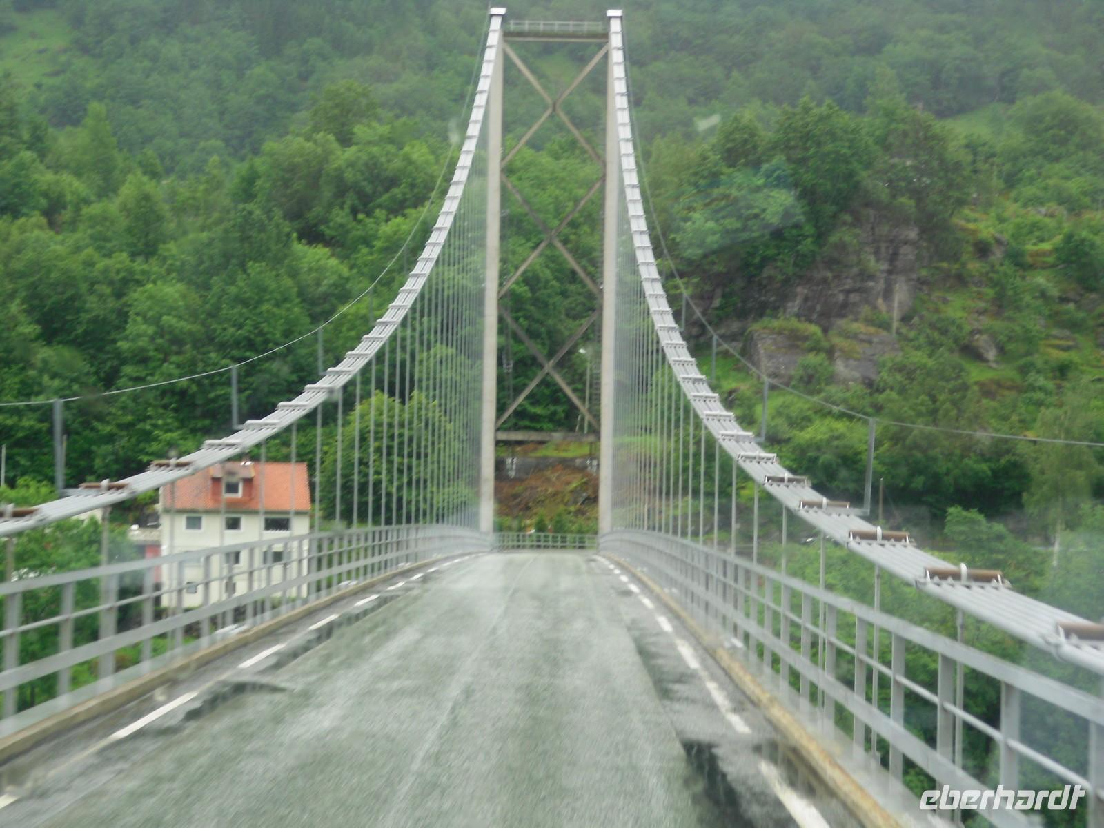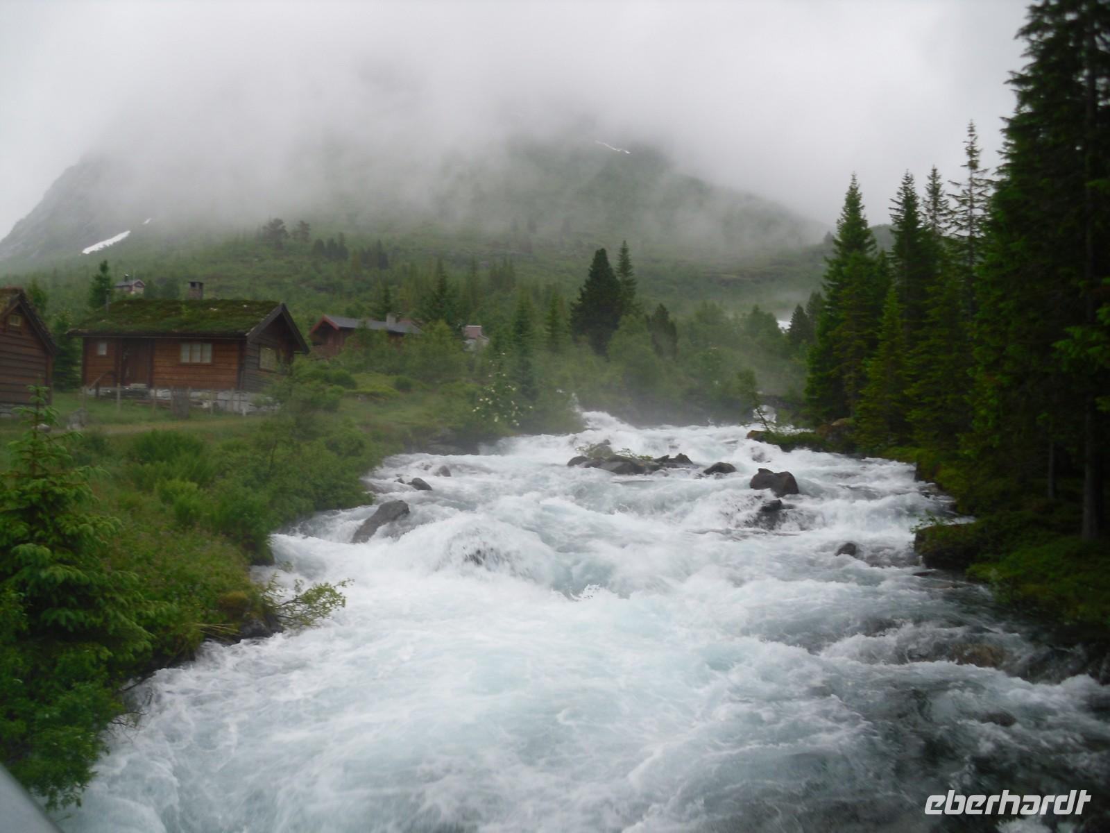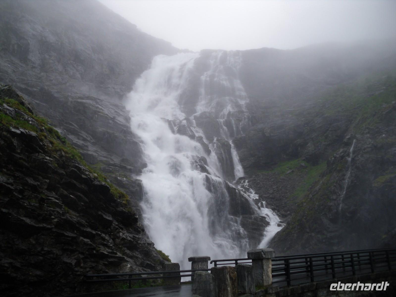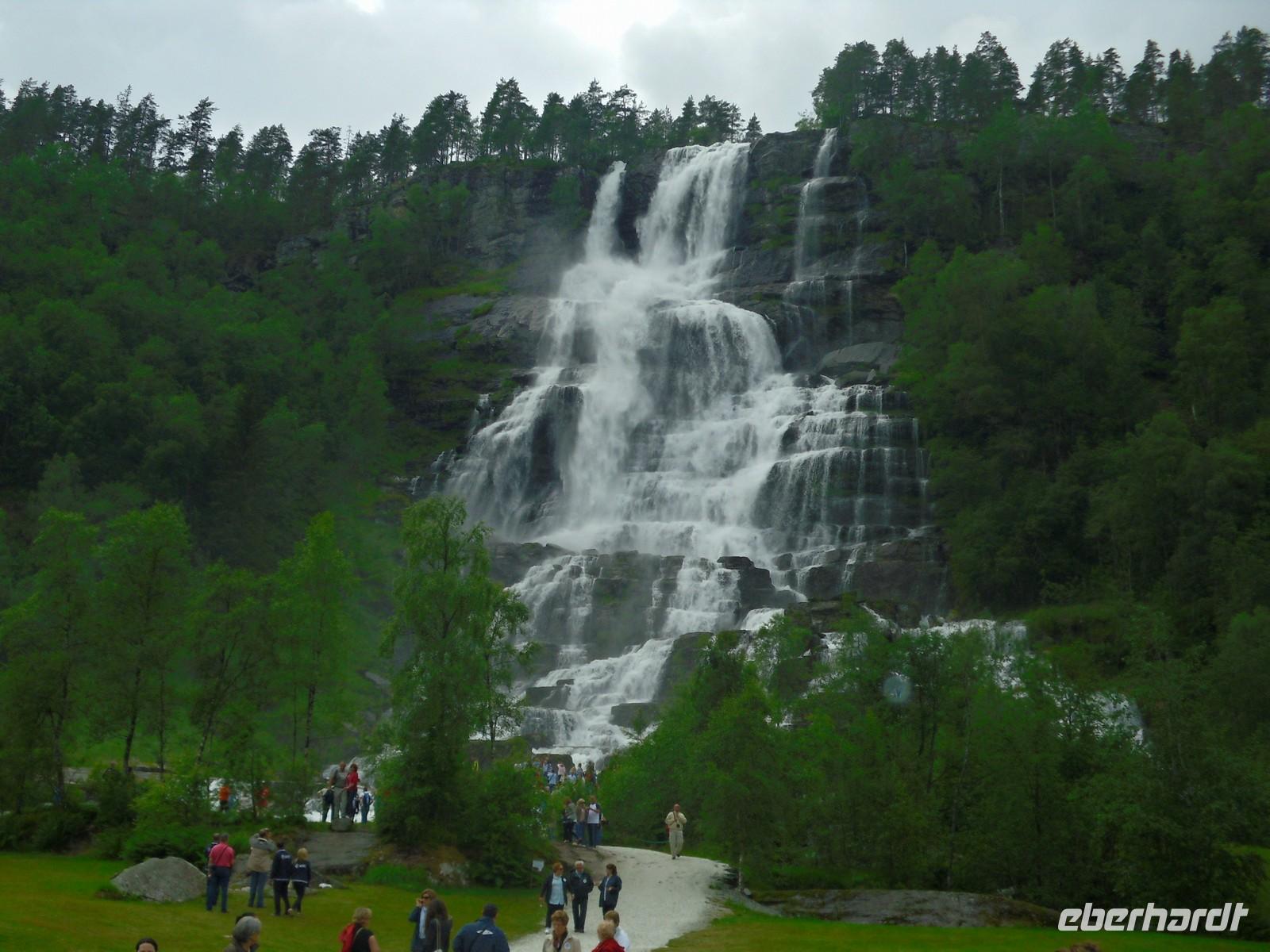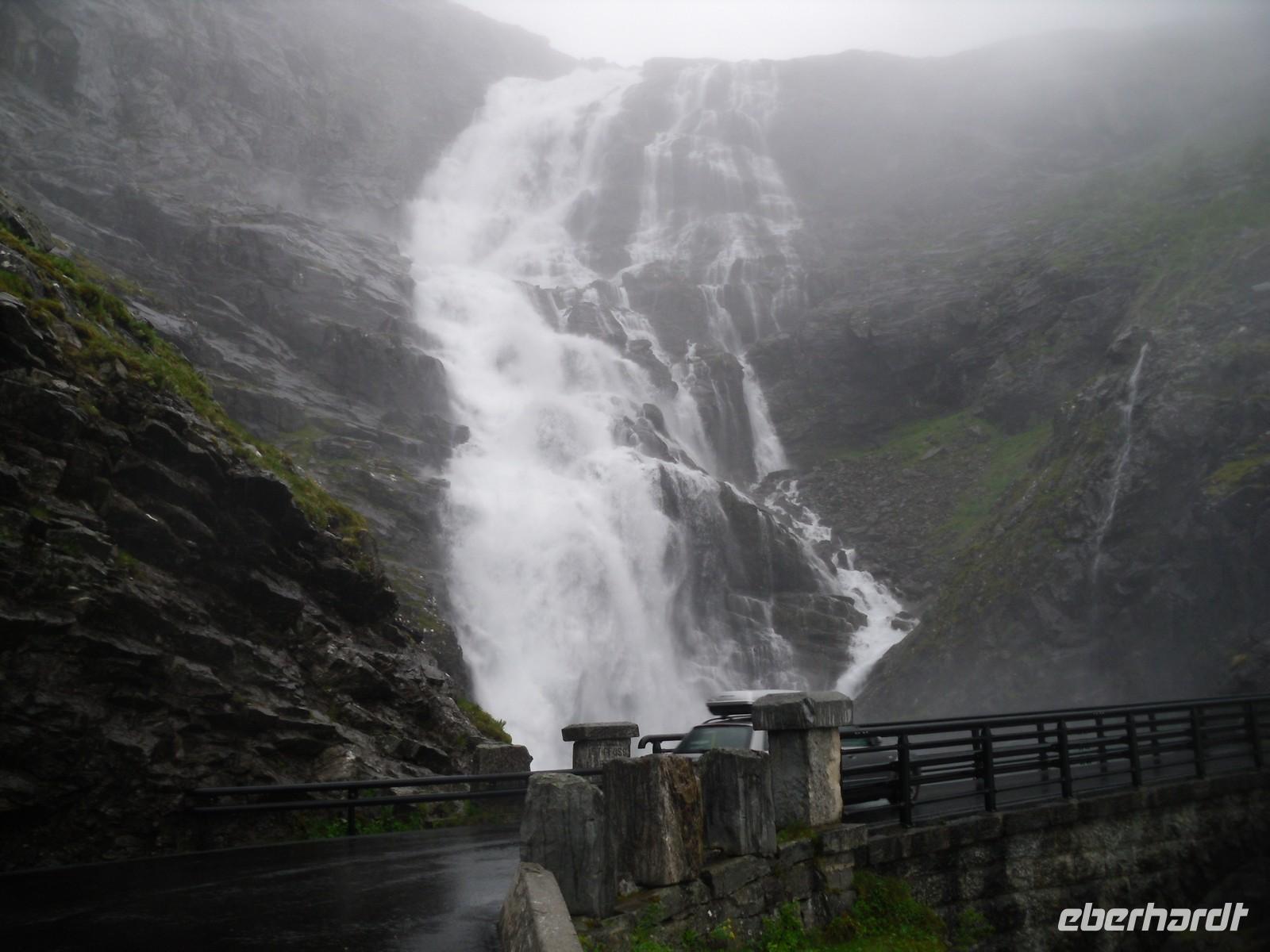 Mit einem sehr netten Reiseleiter, Bernhard mit französischem Akzent, erleben wir heute Morgen eine Stadtrundfahrt durch Bergen und die Führung im hanseatischen Viertel. Die Stadt ist fast schon südländisch geprägt, versprüht ein maritimes Flair-hier ist auch der Anfang der Linie der Hurtigruten und mit der Bergenbahn fährt man von hier bis in den Osten nach Oslo. Während der Hansezeit war sie die größte Stadt Skandinaviens. Wir müssen Regen nicht nur in Bergen sondern am gesamten Tag ertragen, es ist furchtbar. Zur Mittagszeit verlassen wir die Stadt und setzen unsere Fahrt entlang des Hardangerfjordes fort. Am Steindalsfossen lassen wir unsere Gäste mal hinter einen Wasserfall schauen, die Legende sagt: Wer sich hier küsst, soll die ewige Liebe verspüren. Eine Fährüberfahrt von Bruravik nach Brimnes bringt uns weg aus Fjordnorwegen bis