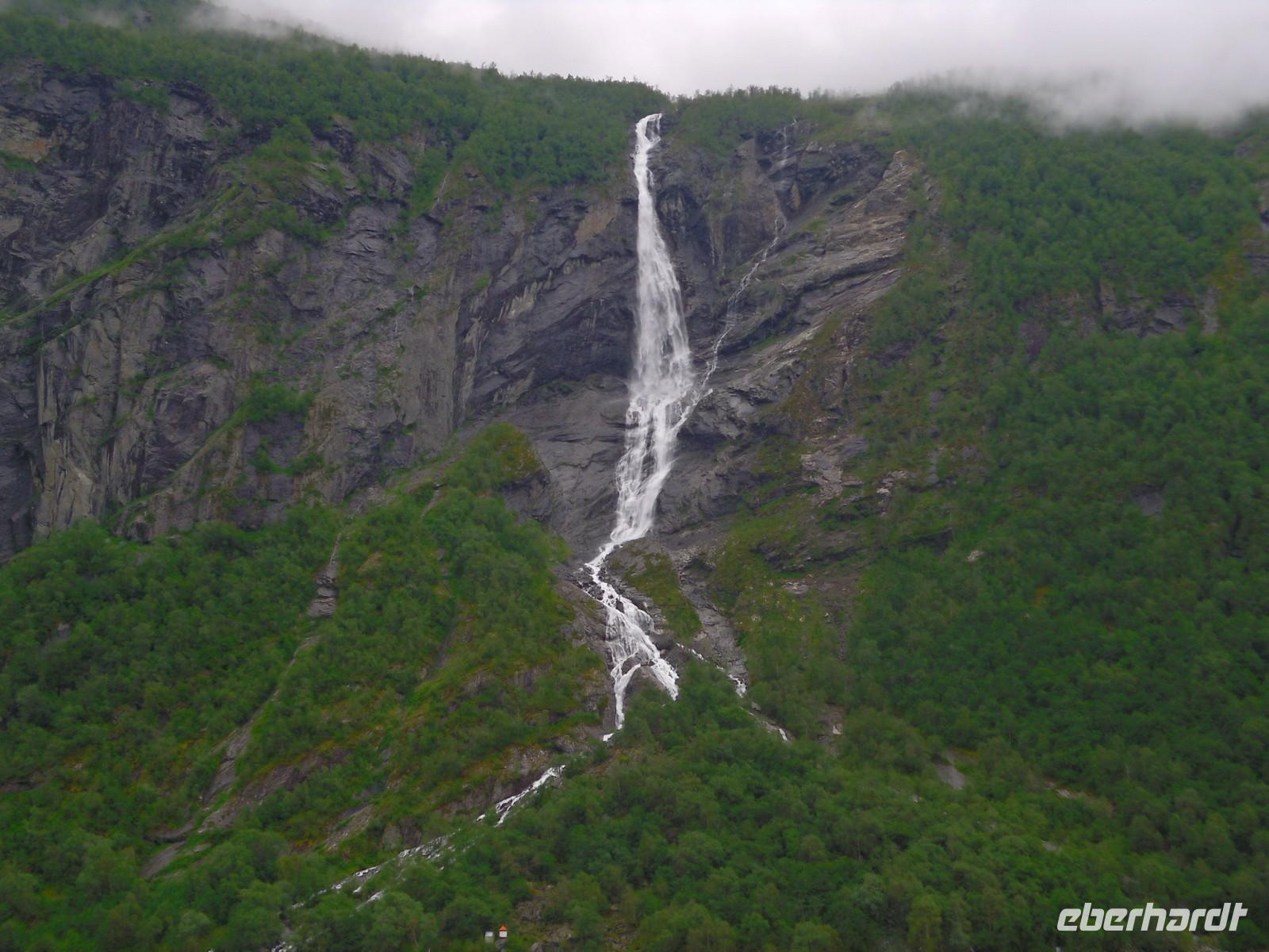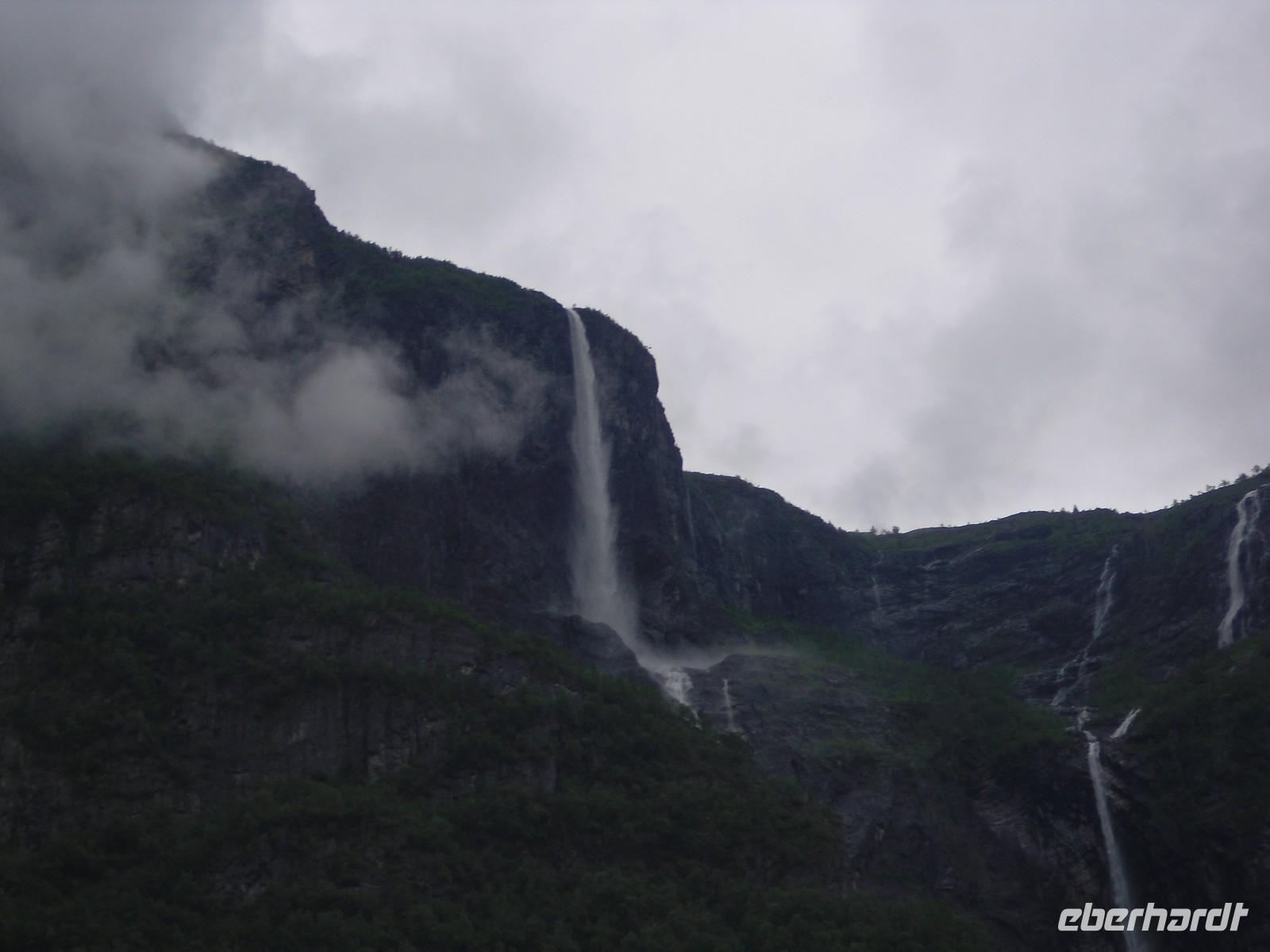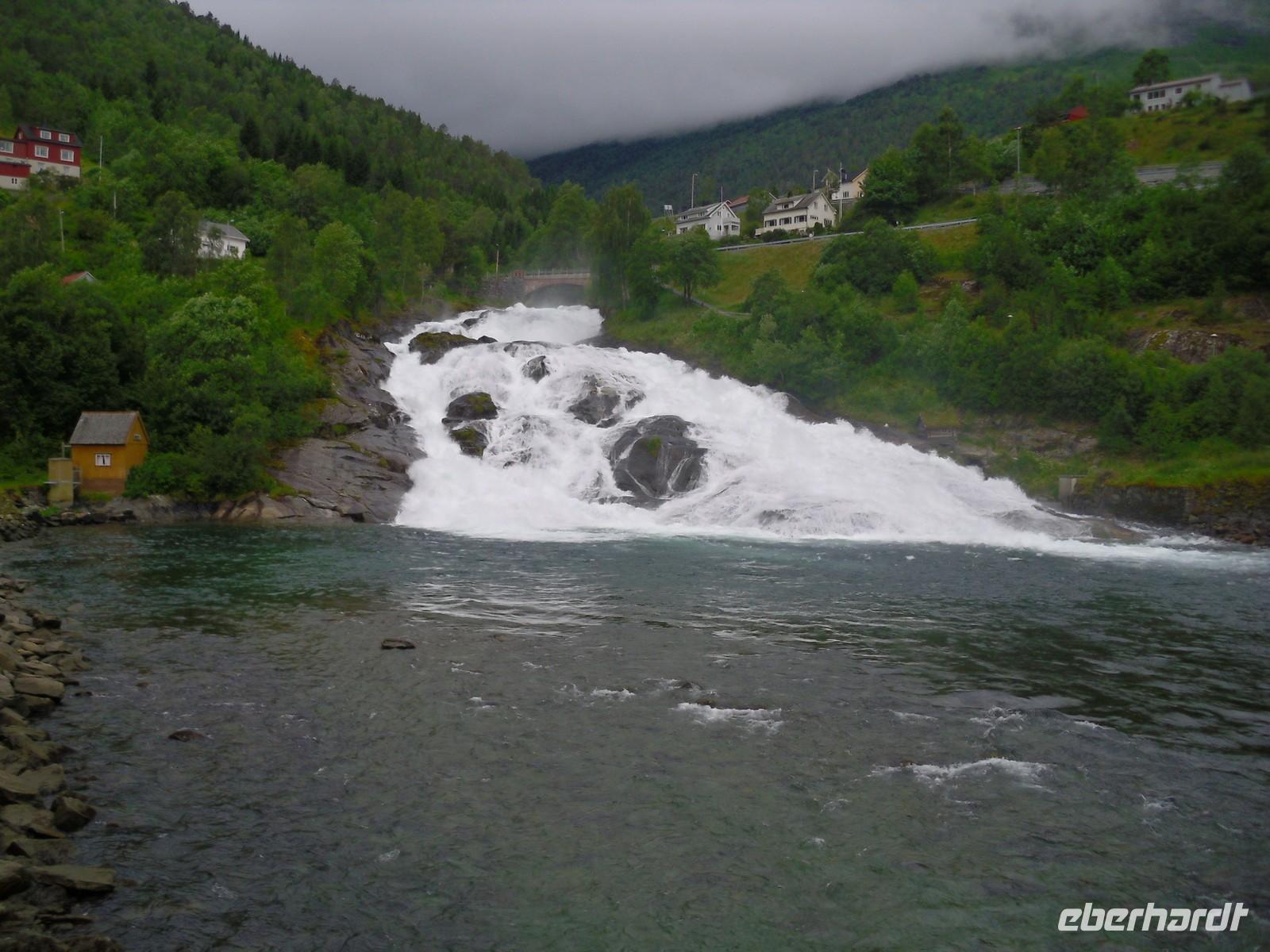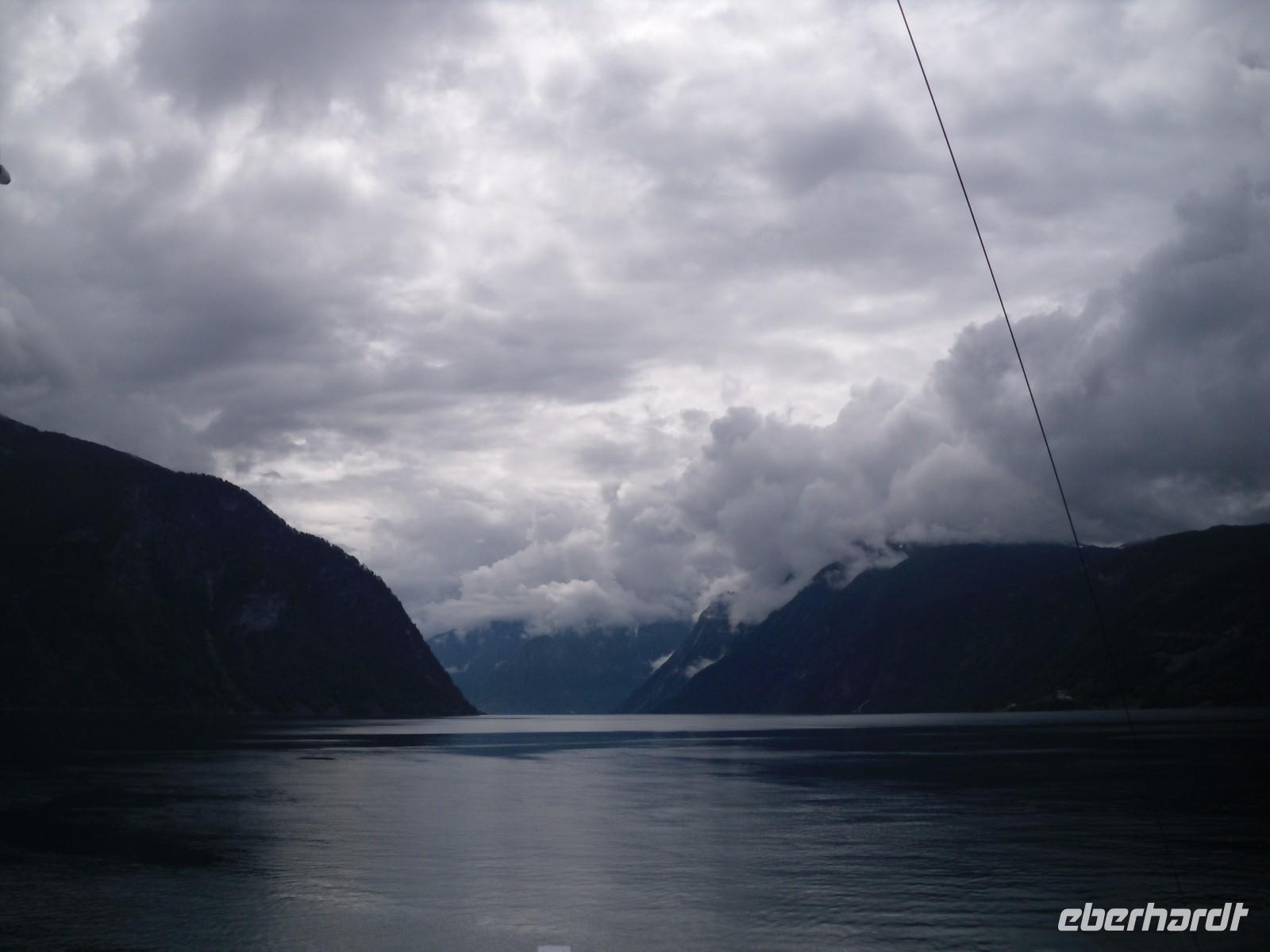 Mit einem sehr netten Reiseleiter, Bernhard mit französischem Akzent, erleben wir heute Morgen eine Stadtrundfahrt durch Bergen und die Führung im hanseatischen Viertel. Die Stadt ist fast schon südländisch geprägt, versprüht ein maritimes Flair-hier ist auch der Anfang der Linie der Hurtigruten und mit der Bergenbahn fährt man von hier bis in den Osten nach Oslo. Während der Hansezeit war sie die größte Stadt Skandinaviens. Wir müssen Regen nicht nur in Bergen sondern am gesamten Tag ertragen, es ist furchtbar. Zur Mittagszeit verlassen wir die Stadt und setzen unsere Fahrt entlang des Hardangerfjordes fort. Am Steindalsfossen lassen wir unsere Gäste mal hinter einen Wasserfall schauen, die Legende sagt: Wer sich hier küsst, soll die ewige Liebe verspüren. Eine Fährüberfahrt von Bruravik nach Brimnes bringt uns weg aus Fjordnorwegen bis