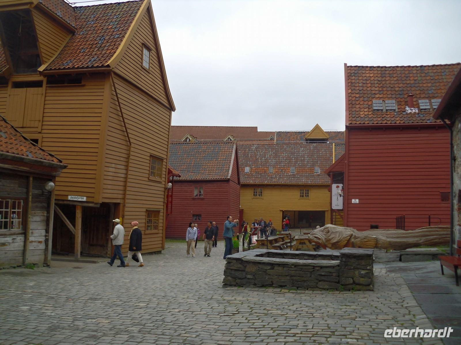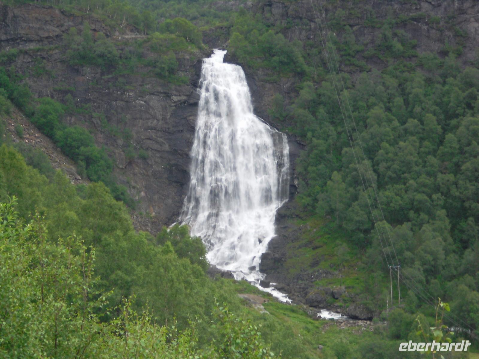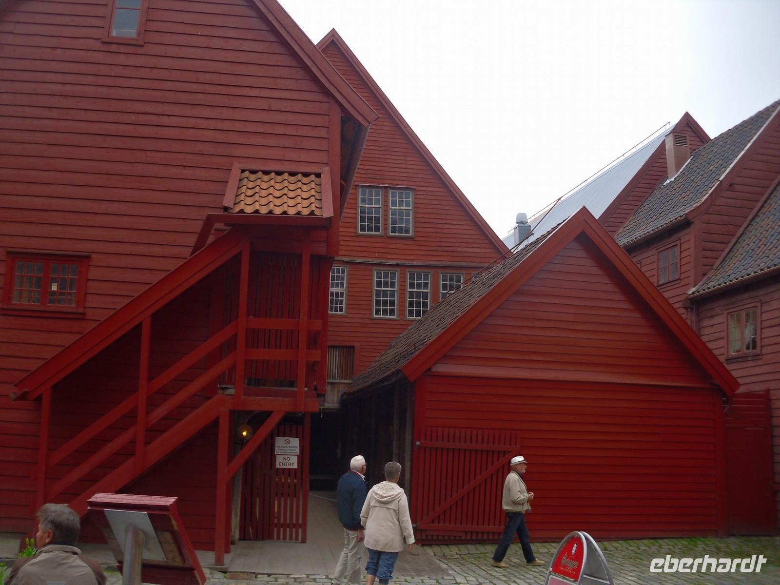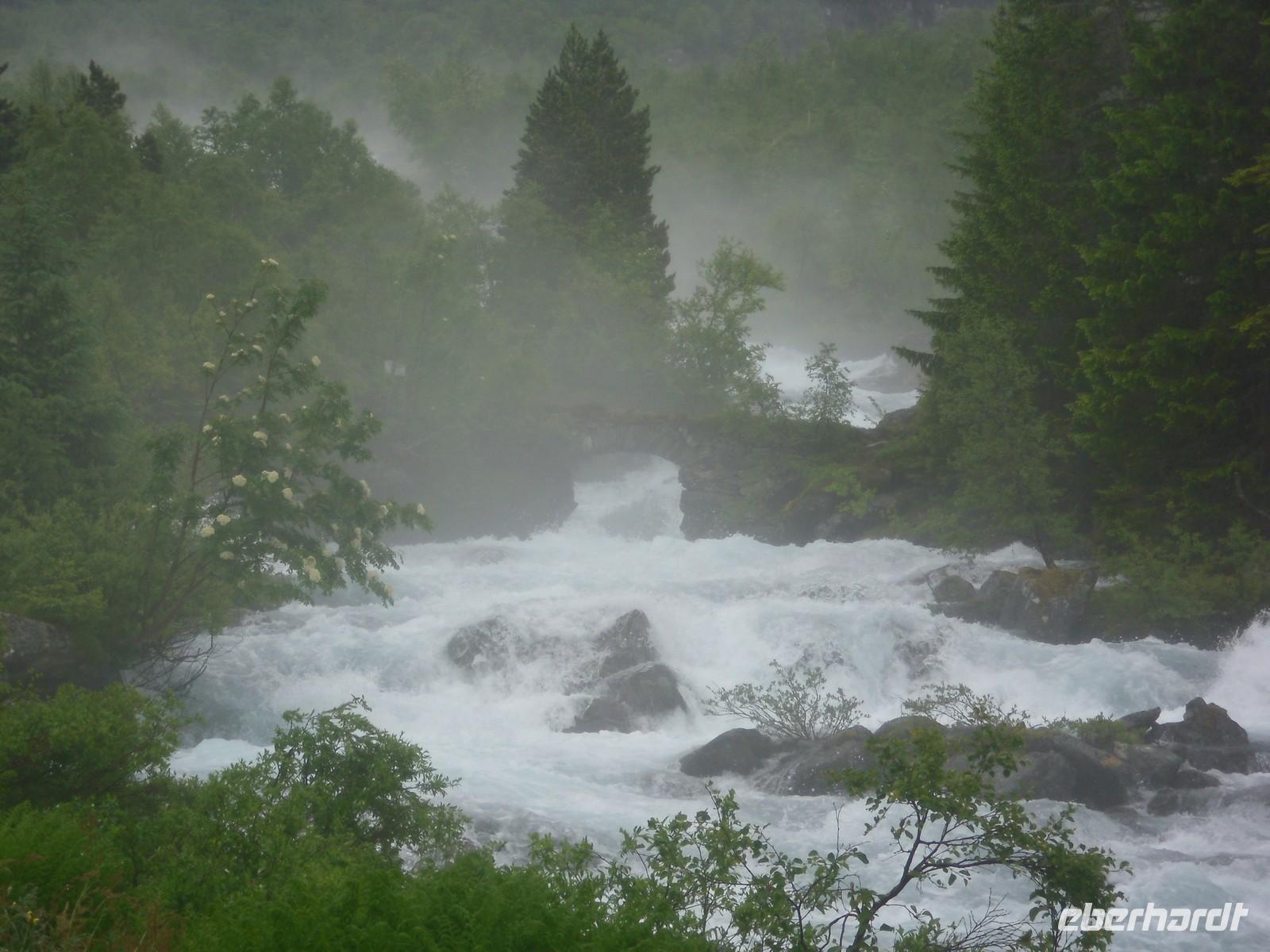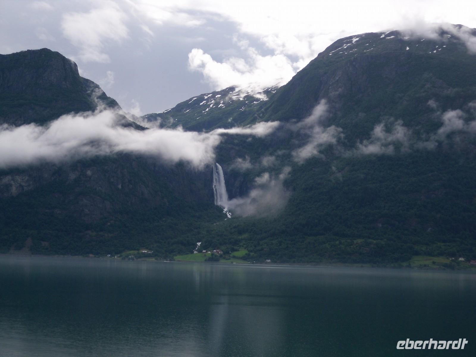Mit einem sehr netten Reiseleiter, Bernhard mit französischem Akzent, erleben wir heute Morgen eine Stadtrundfahrt durch Bergen und die Führung im hanseatischen Viertel. Die Stadt ist fast schon südländisch geprägt, versprüht ein maritimes Flair-hier ist auch der Anfang der Linie der Hurtigruten und mit der Bergenbahn fährt man von hier bis in den Osten nach Oslo. Während der Hansezeit war sie die größte Stadt Skandinaviens. Wir müssen Regen nicht nur in Bergen sondern am gesamten Tag ertragen, es ist furchtbar. Zur Mittagszeit verlassen wir die Stadt und setzen unsere Fahrt entlang des Hardangerfjordes fort. Am Steindalsfossen lassen wir unsere Gäste mal hinter einen Wasserfall schauen, die Legende sagt: Wer sich hier küsst, soll die ewige Liebe verspüren. Eine Fährüberfahrt von Bruravik nach Brimnes bringt uns weg aus Fjordnorwegen bis