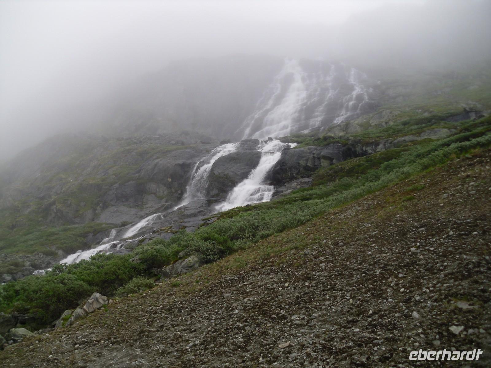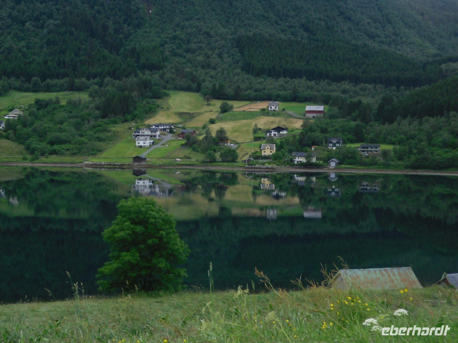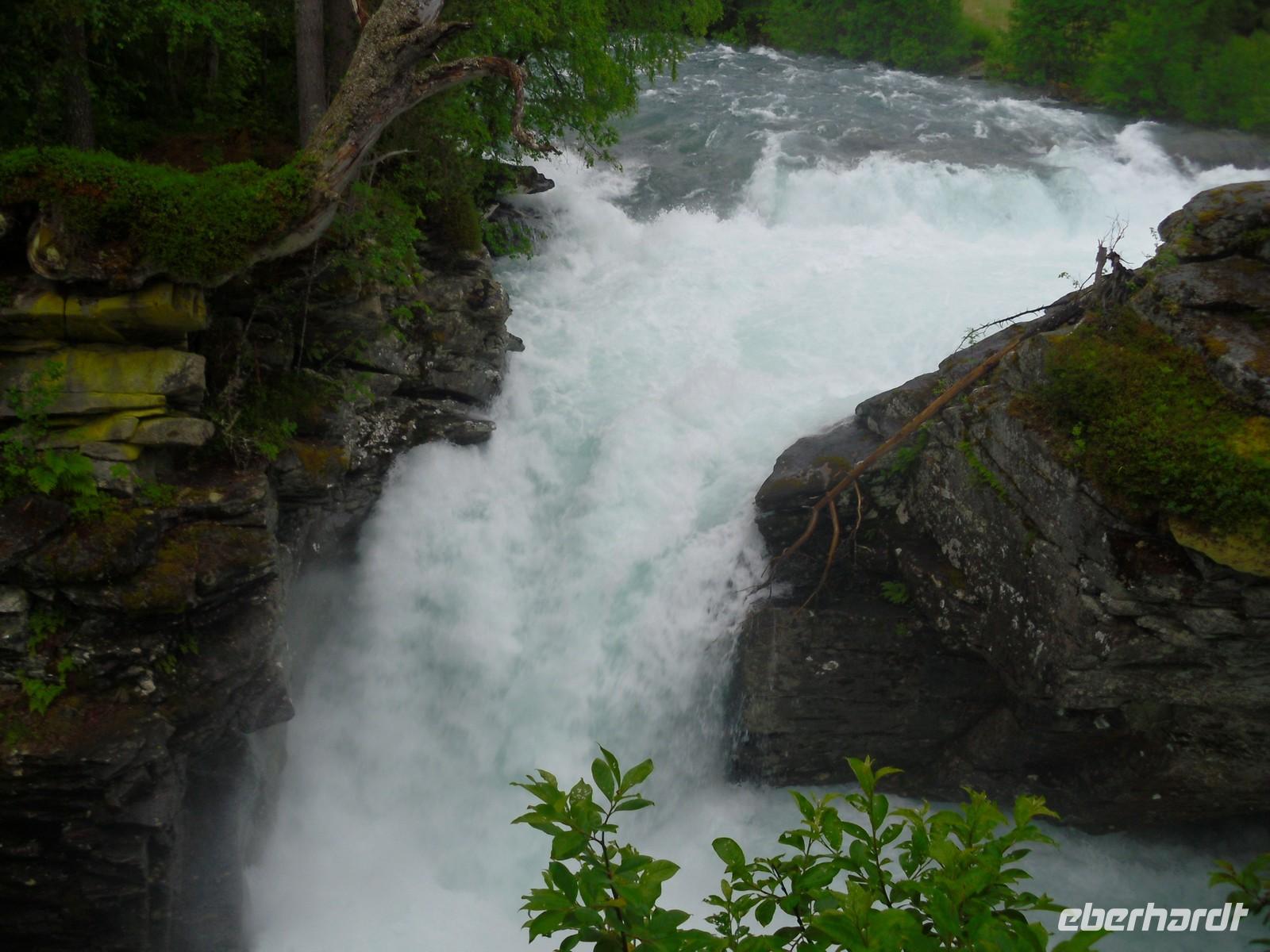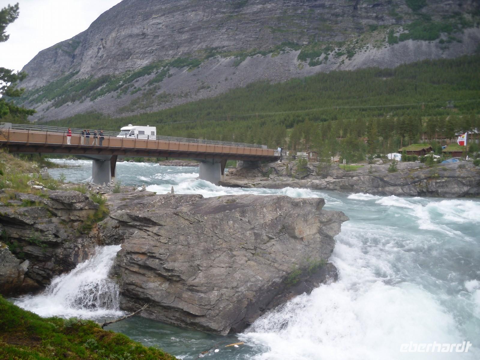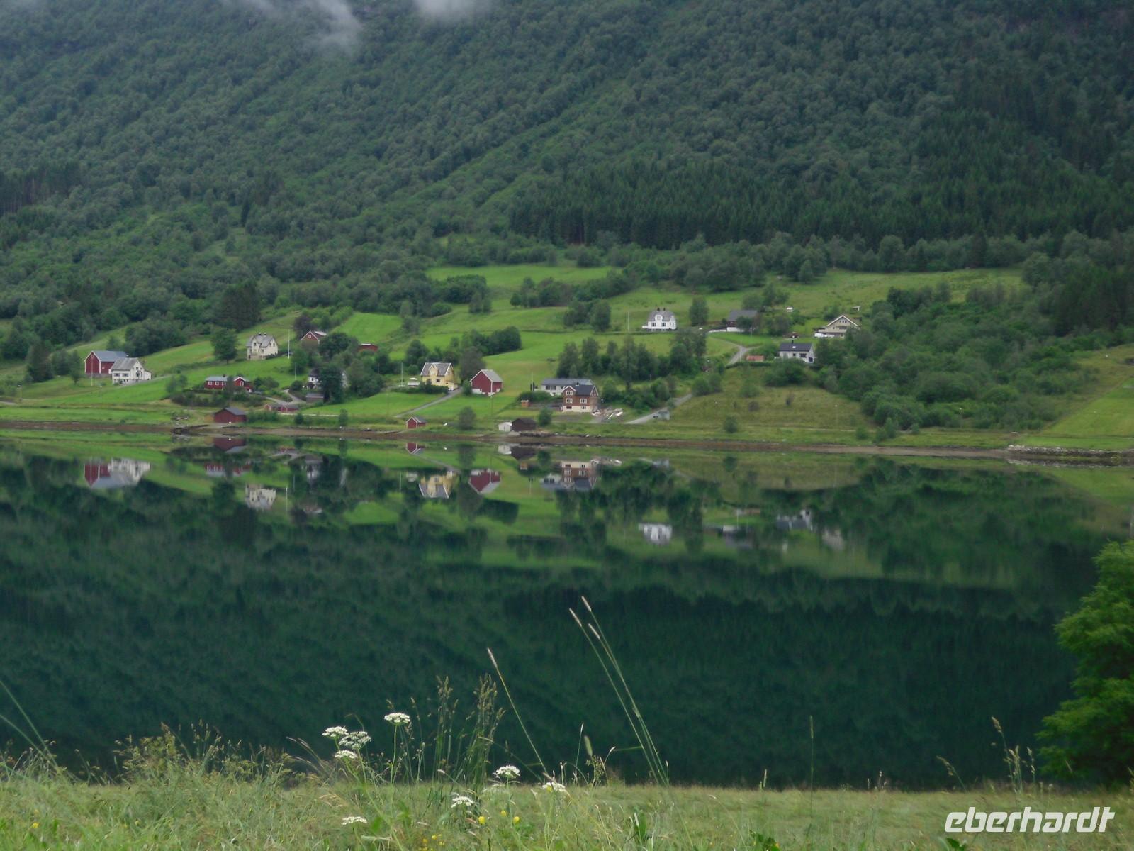 Mit einem sehr netten Reiseleiter, Bernhard mit französischem Akzent, erleben wir heute Morgen eine Stadtrundfahrt durch Bergen und die Führung im hanseatischen Viertel. Die Stadt ist fast schon südländisch geprägt, versprüht ein maritimes Flair-hier ist auch der Anfang der Linie der Hurtigruten und mit der Bergenbahn fährt man von hier bis in den Osten nach Oslo. Während der Hansezeit war sie die größte Stadt Skandinaviens. Wir müssen Regen nicht nur in Bergen sondern am gesamten Tag ertragen, es ist furchtbar. Zur Mittagszeit verlassen wir die Stadt und setzen unsere Fahrt entlang des Hardangerfjordes fort. Am Steindalsfossen lassen wir unsere Gäste mal hinter einen Wasserfall schauen, die Legende sagt: Wer sich hier küsst, soll die ewige Liebe verspüren. Eine Fährüberfahrt von Bruravik nach Brimnes bringt uns weg aus Fjordnorwegen bis