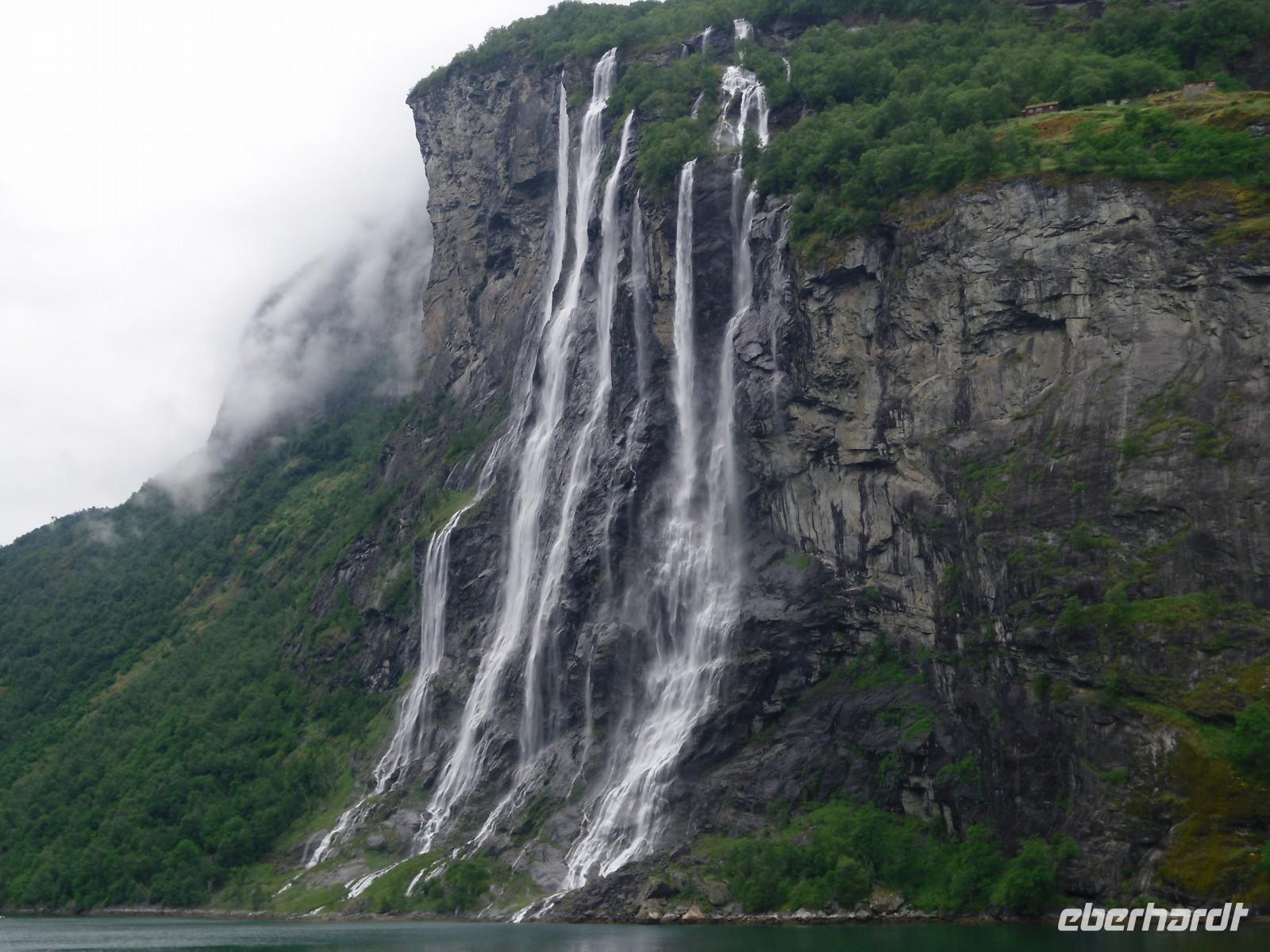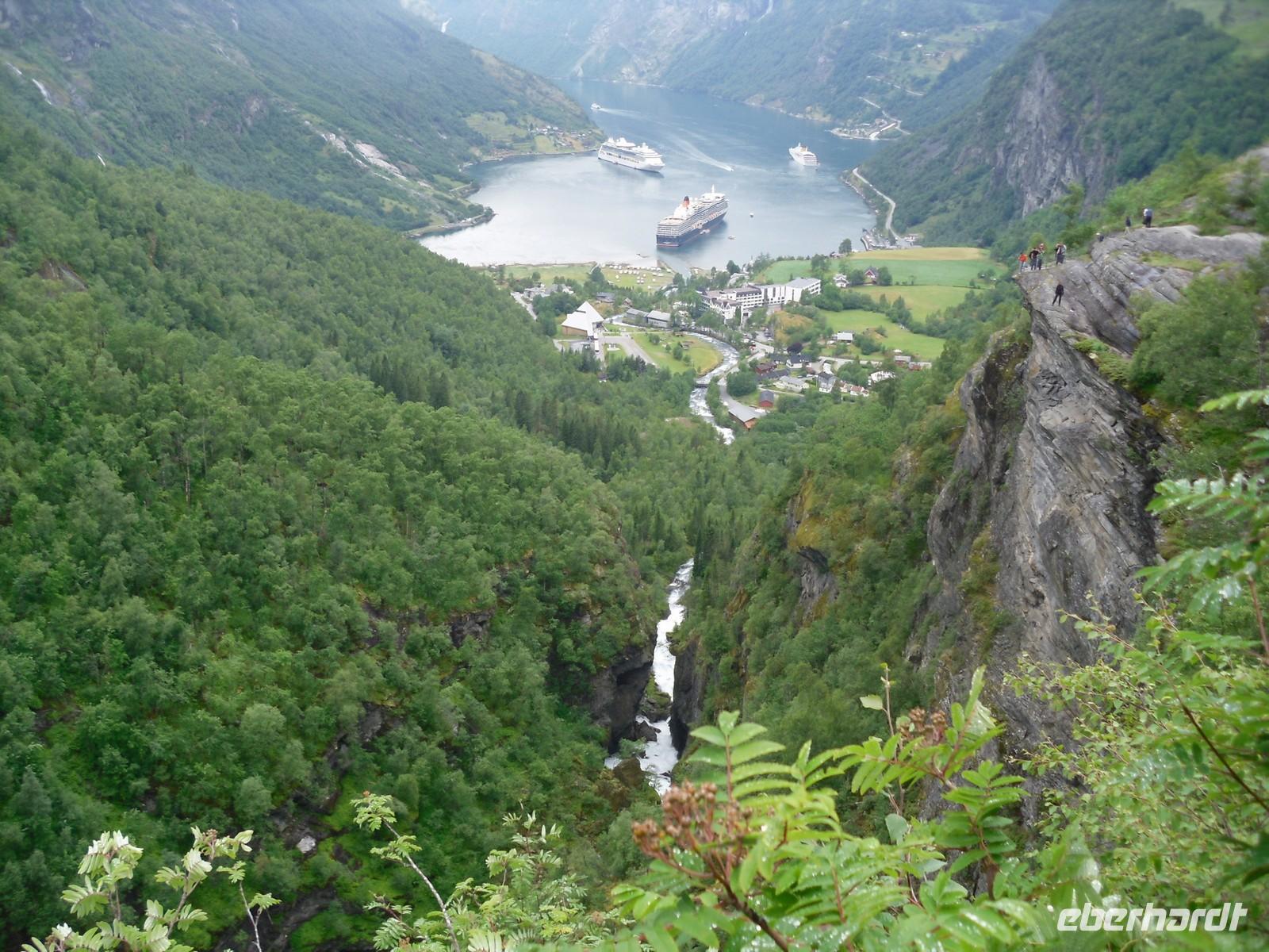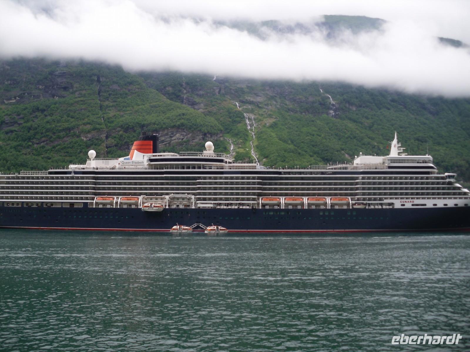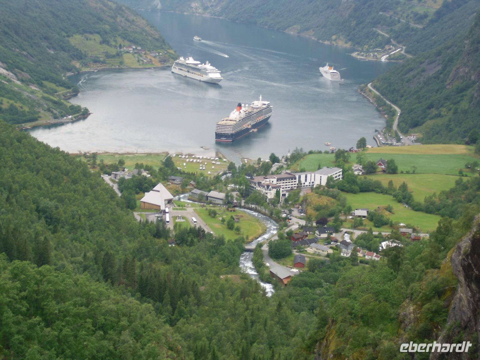 Heute früh können wir mit trockenem Wetter Gepäckverladen und unser Tagesprogramm sieht als Nächstes eine kurze Fährüberfahrt von Magerholm nach Ørsneset vor. Nach einer schönen Fahrt mit Blick in einen Gletscher erreichen wir Hellesylt und hier ist Start für die Kreuzfahrt auf dem Geirangerfjord. Er zählt wohl zu den schönsten und meistbesuchten Fjorden mit bis zu 800 Meter hohen Felswänden zu beiden Seiten und den in die Tiefe tosenden Wasserfällen mit Namen "Die sieben Schwestern" oder "Der Freier“. In Geiranger verlassen wir die Fähre und hier liegen 3 Kreuzfahrtschiffe u.a. die „Queen Elisabeth.“ Es braucht einiges an Geduld, um bei den vielen Fährgästen vor Ort mit dem Bus vorbeizukommen. In mächtigen Spitzkehren schrauben wir uns