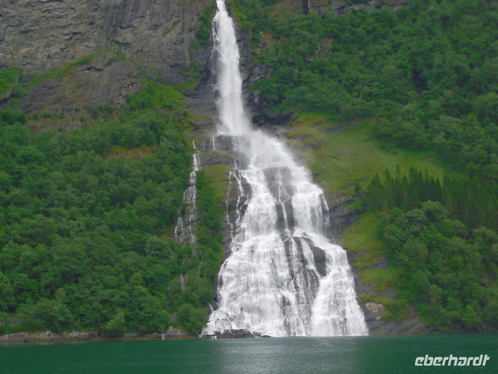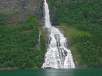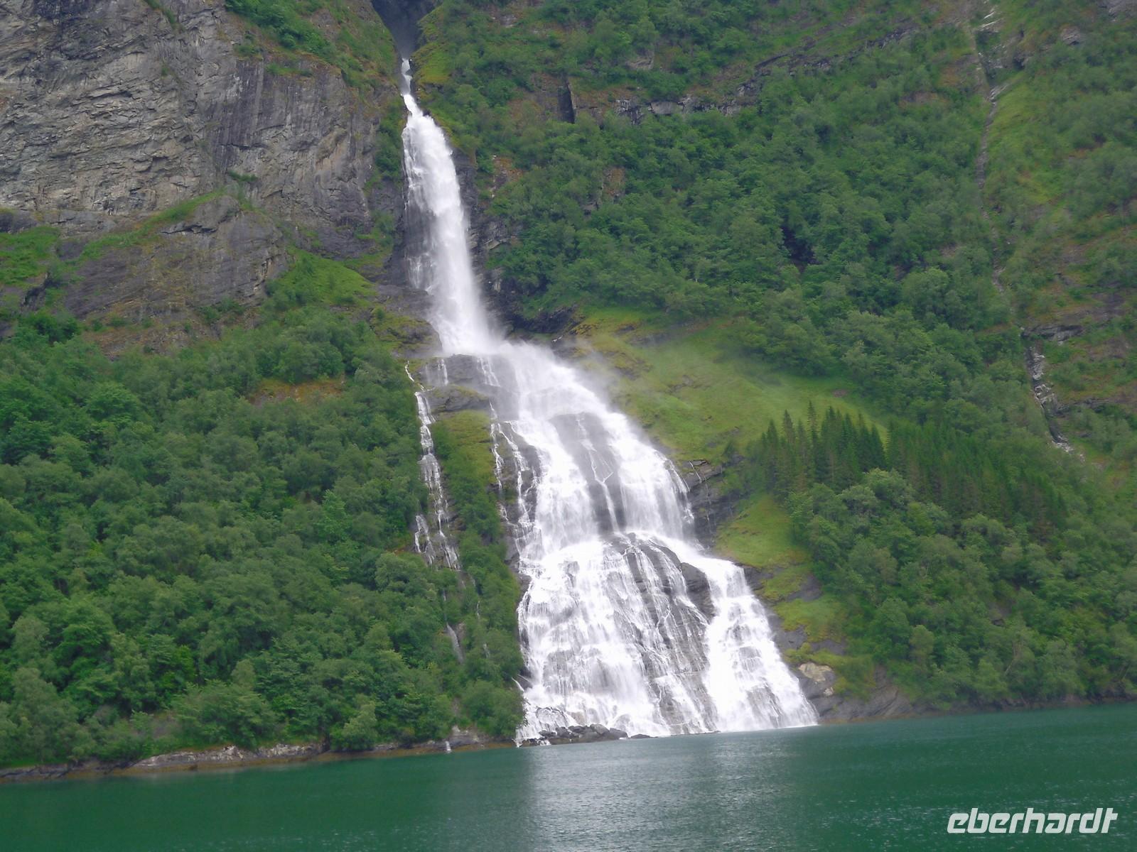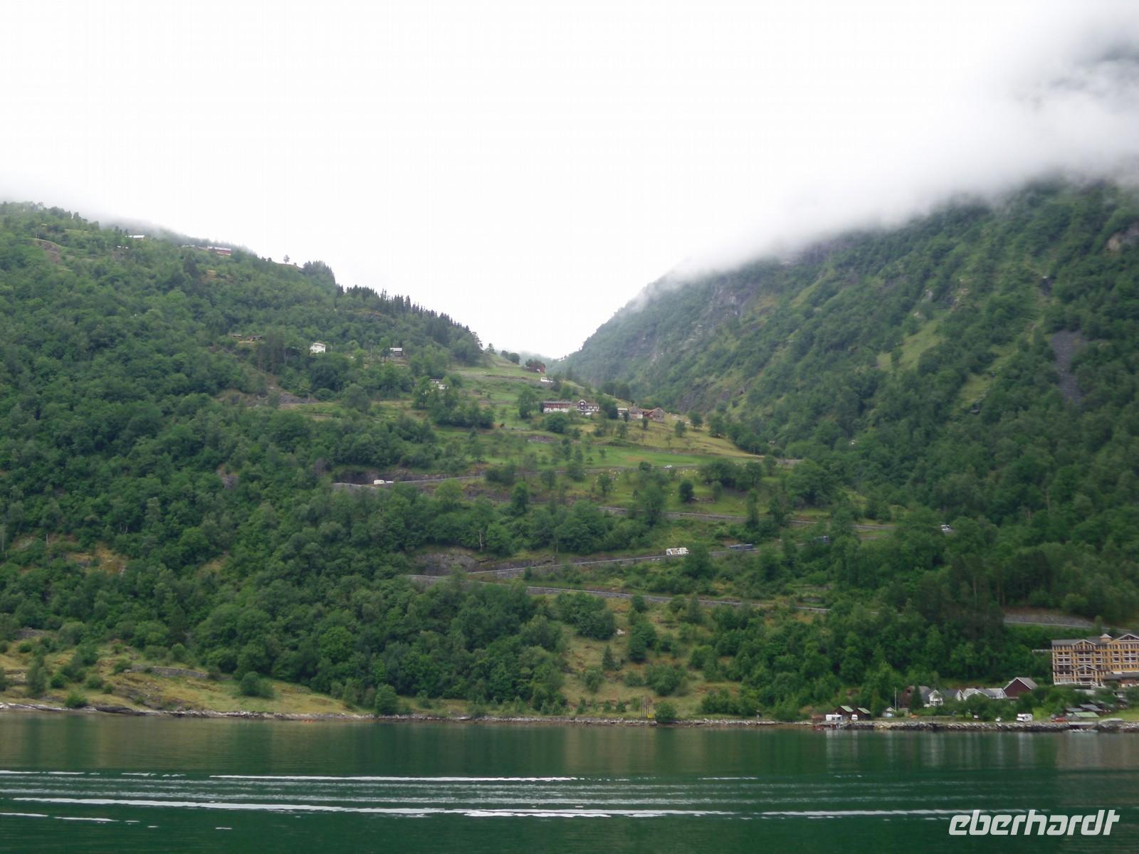 Heute früh können wir mit trockenem Wetter Gepäckverladen und unser Tagesprogramm sieht als Nächstes eine kurze Fährüberfahrt von Magerholm nach Ørsneset vor. Nach einer schönen Fahrt mit Blick in einen Gletscher erreichen wir Hellesylt und hier ist Start für die Kreuzfahrt auf dem Geirangerfjord. Er zählt wohl zu den schönsten und meistbesuchten Fjorden mit bis zu 800 Meter hohen Felswänden zu beiden Seiten und den in die Tiefe tosenden Wasserfällen mit Namen "Die sieben Schwestern" oder "Der Freier“. In Geiranger verlassen wir die Fähre und hier liegen 3 Kreuzfahrtschiffe u.a. die „Queen Elisabeth.“ Es braucht einiges an Geduld, um bei den vielen Fährgästen vor Ort mit dem Bus vorbeizukommen. In mächtigen Spitzkehren schrauben wir uns