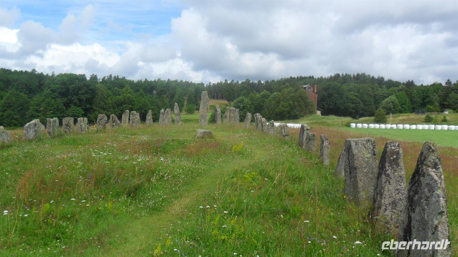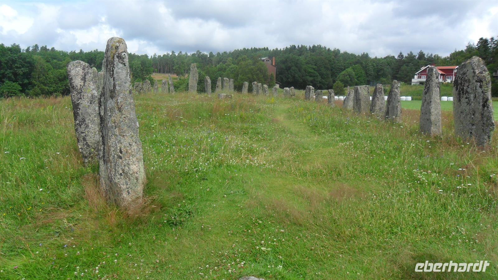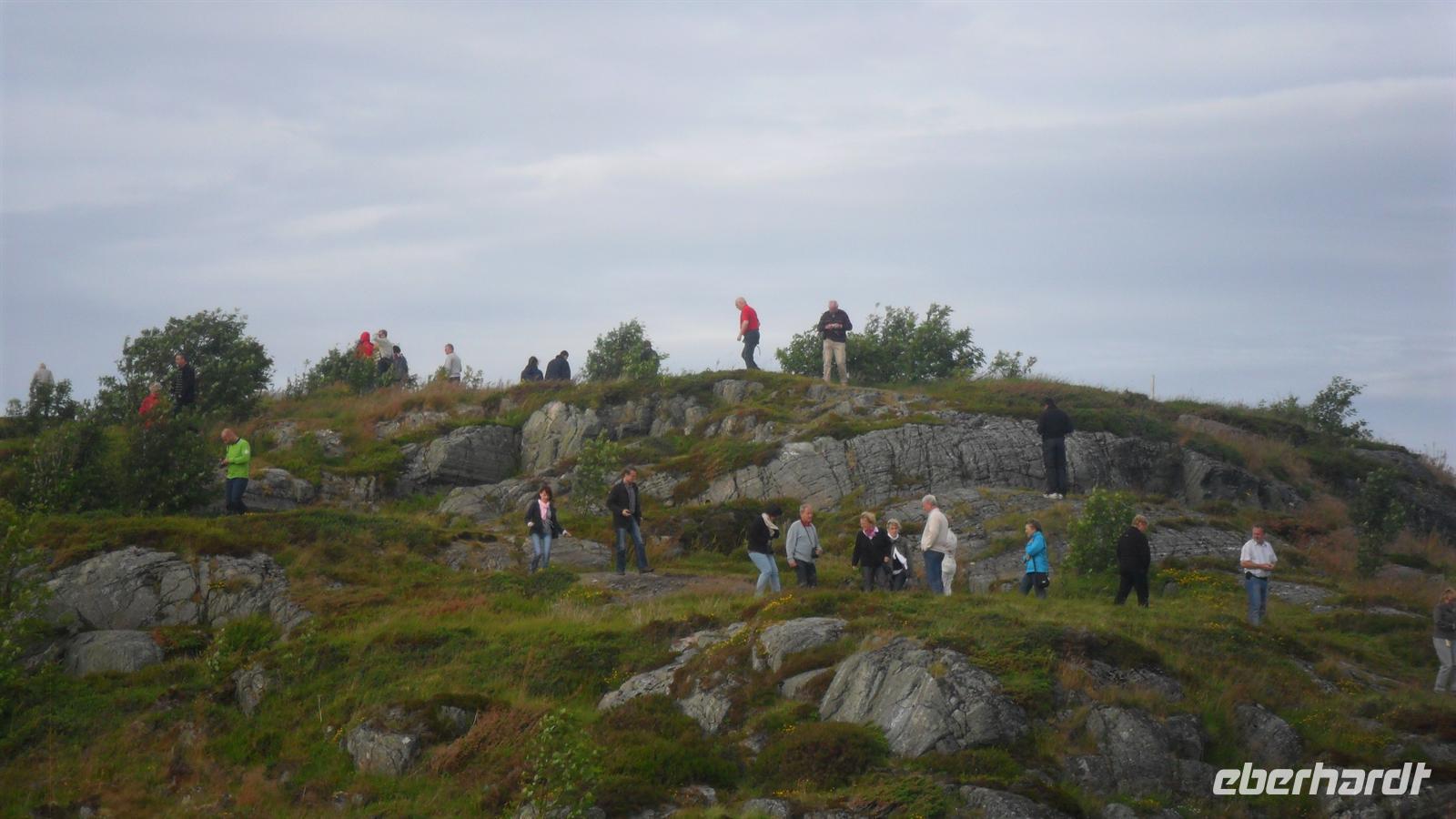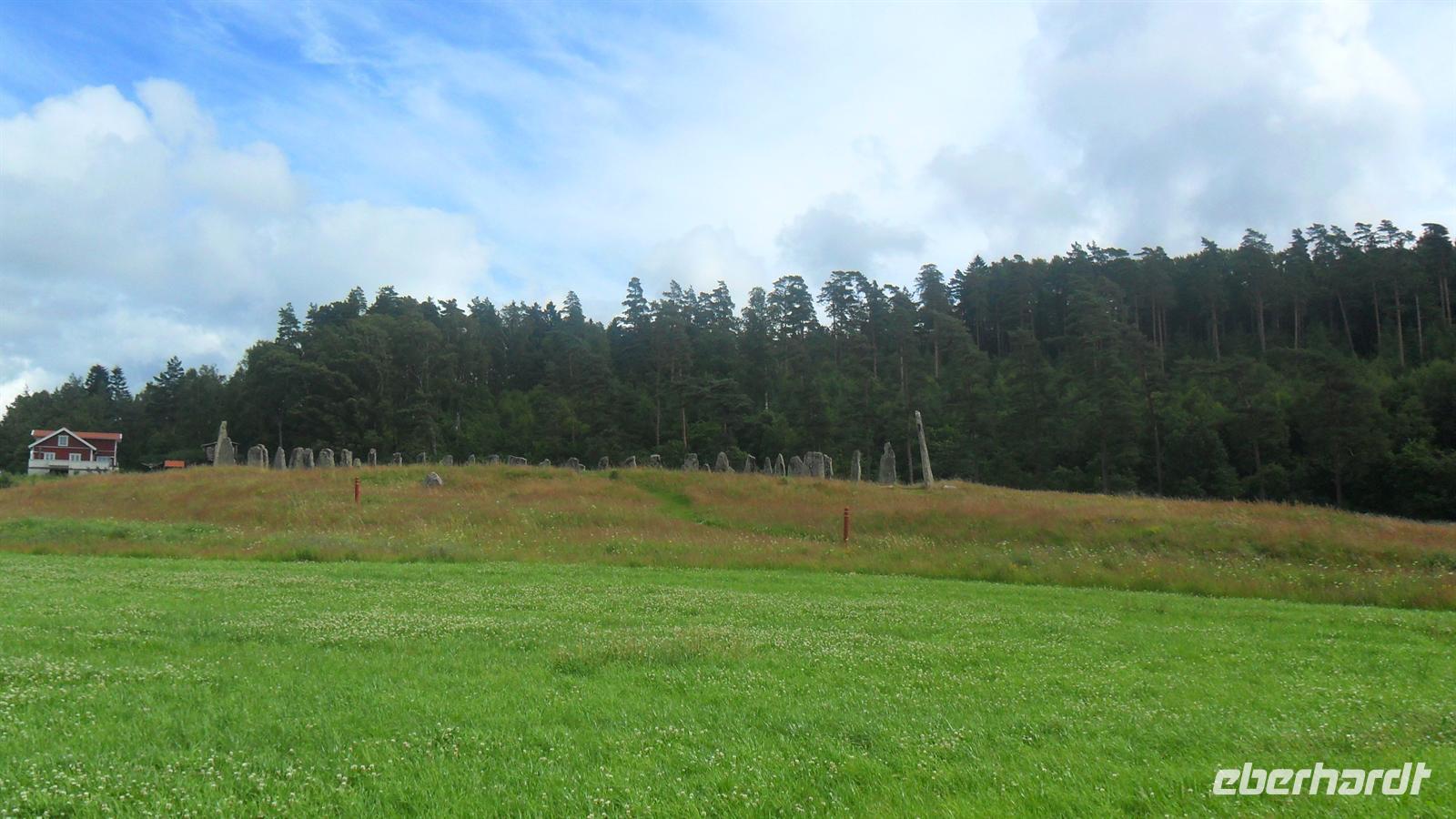 Die Einfahrt in den Hafen von Göteborg, zwischen den Schären an der Festung Elvsborg vorbei, ist eine der schönsten in Nordeuropa. Nach kurzer Wartezeit nahm uns der Bus auf und wir folgten der gut ausgebauten E 6 von Göteborg nach Norden. Wir machten wie immer nach etwa zwei Fahrtstunden eine Rastpause, aber ich hatte noch vor Erreichen der norwegischen Grenze ein kleines „Extra“ geplant. So verließen wir die E 6 für einen Abstecher zur uralten sogenannten „Schiffssetzung“ - das „Blomsholm Schiff“. Es besteht aus 49 gewaltigen Steinen, aufgestellt auf einem Hügel in Form eines riesigen Schiffes. Das etwa 42 m lange Monument stammt möglicherweise aus der Bronzezeit, vielleicht aber auch aus der Eisen- oder gar erst Völkerwanderungszeit..