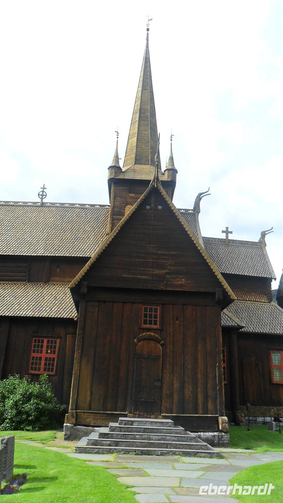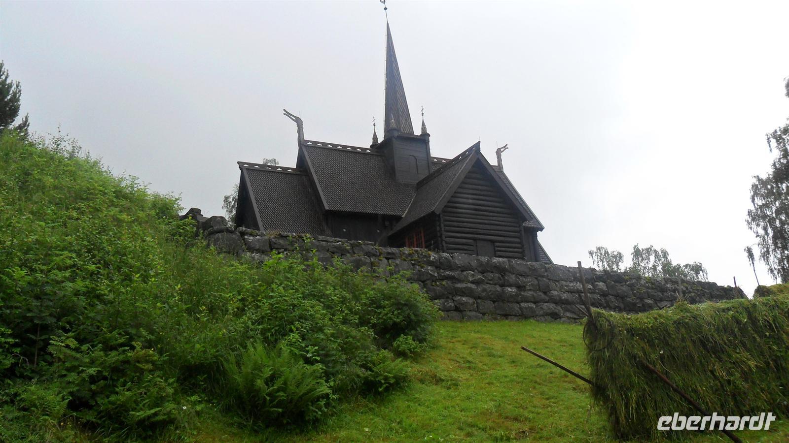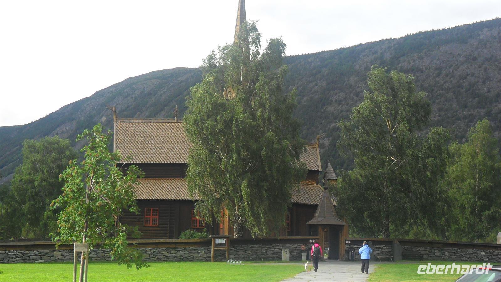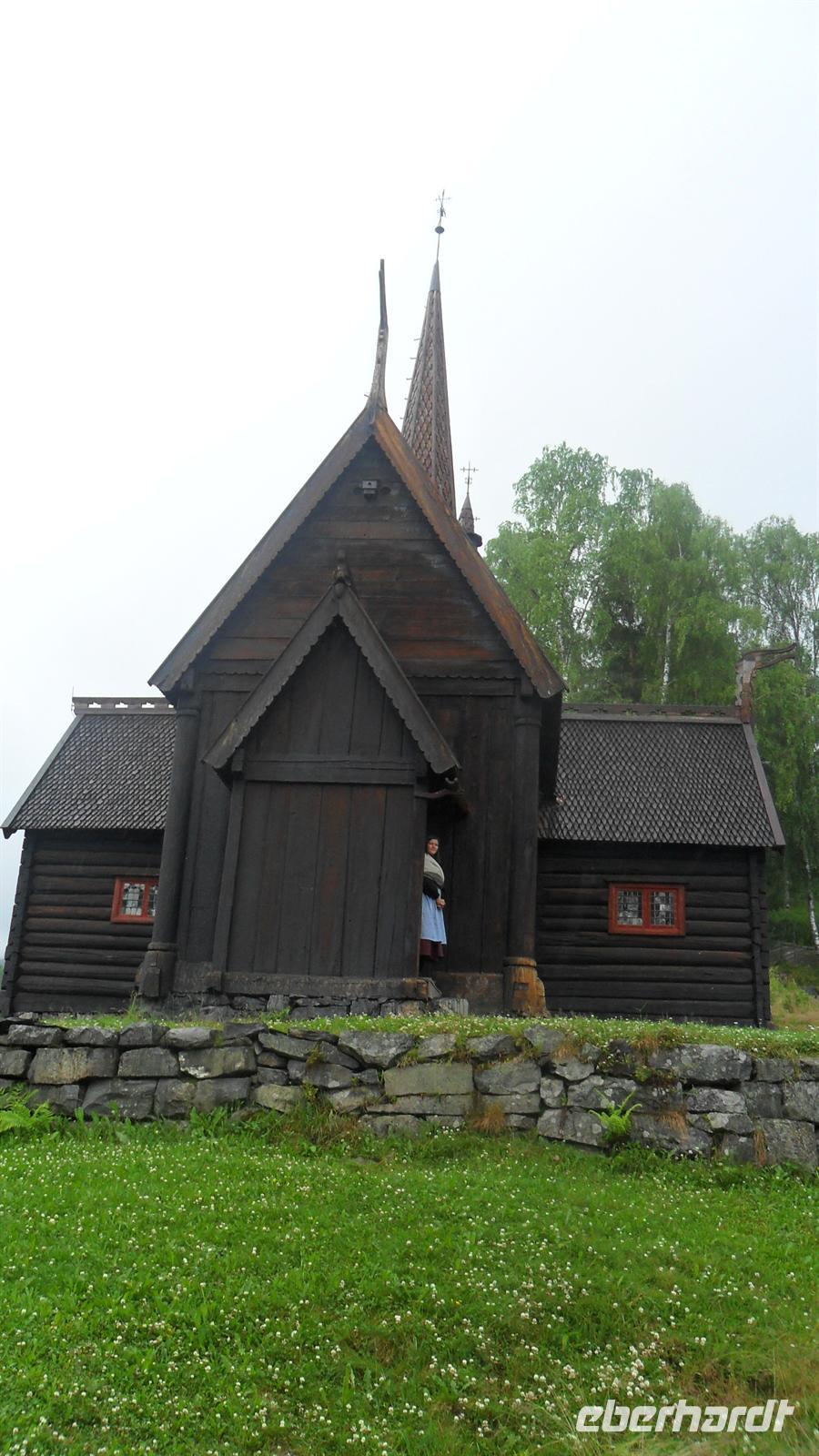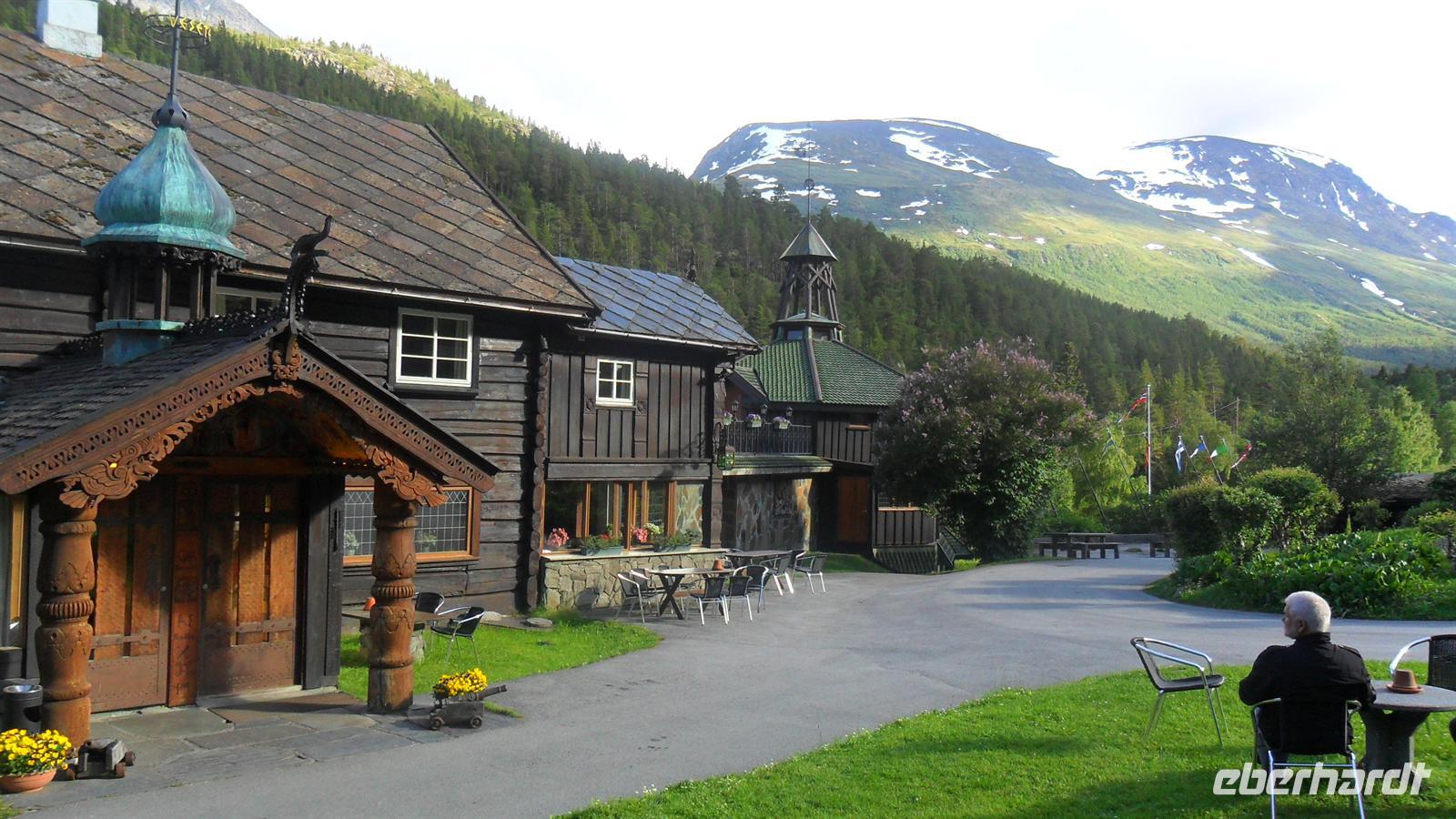 Im Ort Geiranger lagen auch dieses Mal zwei große Kreuzfahrtschiffe. Obwohl sich der Fjord mehr als hundert Kilometer ins Landesinnere einschneidet, ist er wie alle Fjorde wegen seiner großen Meter Tiefe für jeden Tiefgang befahrbar. Die zahllosen Touristen waren fast zuviel für den kleinen Ort. Nach etwas Freizeit im gönnten wir uns einen Fotostopp am „Postkarten-Aussichtspunkt und legten bei der Weiterfahrt noch einen Stopp am im Juli immer noch mit Eisschollen bedeckten Djupvatten-See ein und dann nochmals am Dønfoss, einem malerisch gelegenen Campingplatz neben spektakulären Stromschnellen. Letzte Besichtigung war dann die schöne Stabkirche von Lom. Diese besondere Art von Holzkirchen gibt es mit zwei Ausnahmen nur in Norwegen und sie gehören zu den interessantesten Bauwerken des Landes. Sie haben ihren Namen von der Bauform, durch die sie ihre Stabilität von vier Masten - norwegisch „Staver“ - erhalten. Sie wurden immer nur in traditioneller Art mit Hölzpflöcken zusammengehalten und weisen meist noch Schindeln und Planken aufweisen - denn oft sind sie aus alten Schiffen gebaut,. Wie alle Stabkirchen aus Masten, Planken und Schindeln erbaut und später mit Balkenvorbauten versehen, gehört sie zu den Bauwerken, die man sehen, fühlen und riechen kann, denn alle Stabkirchen haben einen charakteristischen Geruch wegen ihrer „Wetterfestmachung" durch Harz und Teer. Nun blieb noch die Weiterfahrt zum Hotel Elveseter - eine Übernachtung, die es in sich hat. Das Ambiente des Hotels - eines überwiegend in Holz gebauten großen Bauernhofes aus dem 18. Jh. begeistert immer wieder. Man fühlt sich wie in einem großen Museum und obwohl das Hotel - aufgrund der Erhaltung des alten Bauzustandes - für heutige Besucher nicht sehr komfortabel erscheint, ist es doch wieder einmal der „Renner“ Hier haben wir uns nach dem Abendessen noch am Bus getroffen, um mit dem Angebot des Bordservice das gestern gewesene Bergfest der Reise und die gerade vergangene norwegische Mittsommer zu feiern!