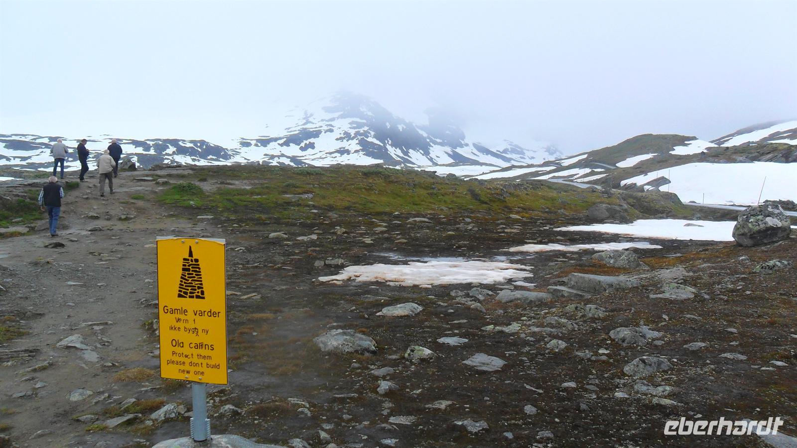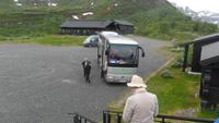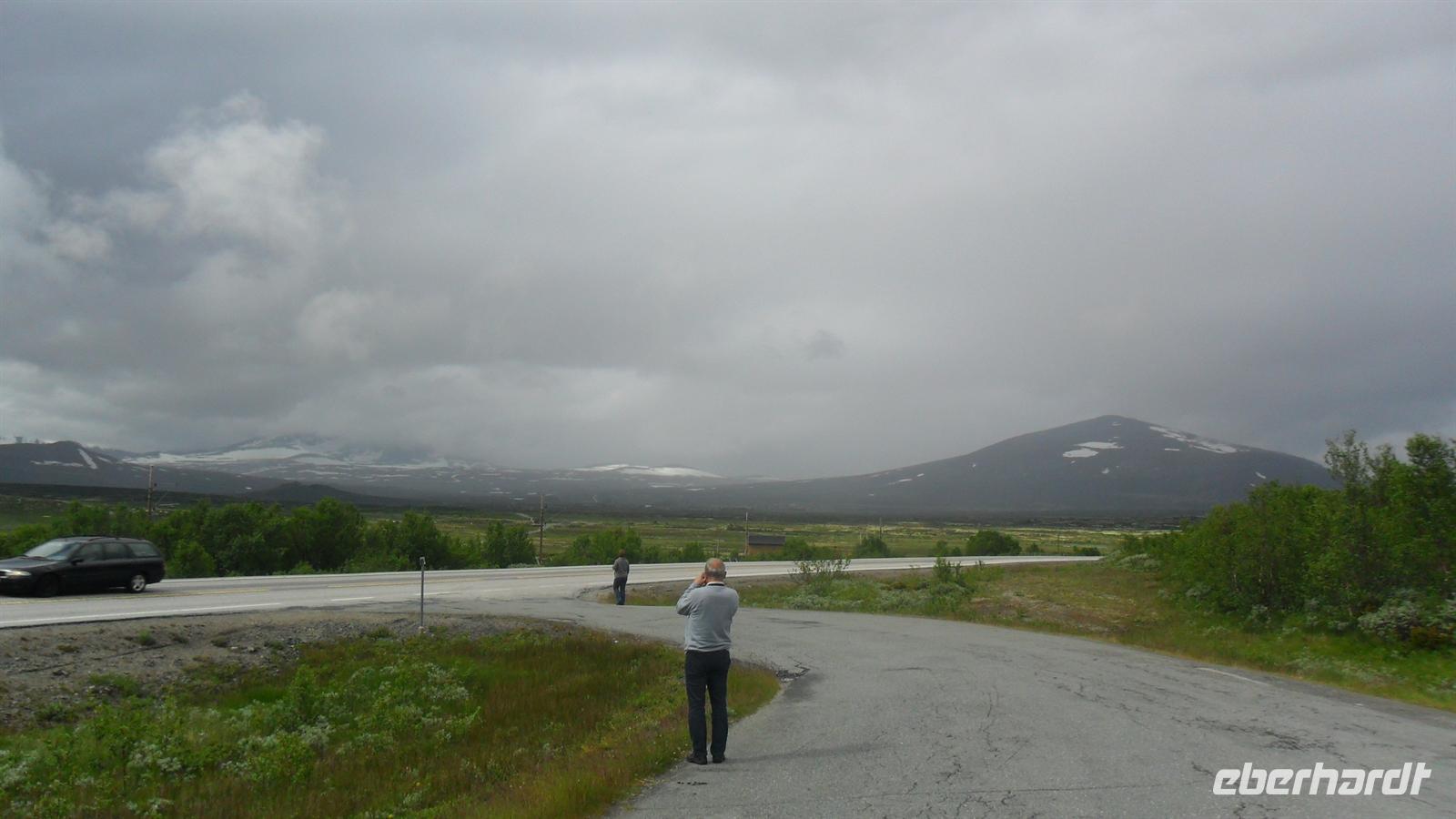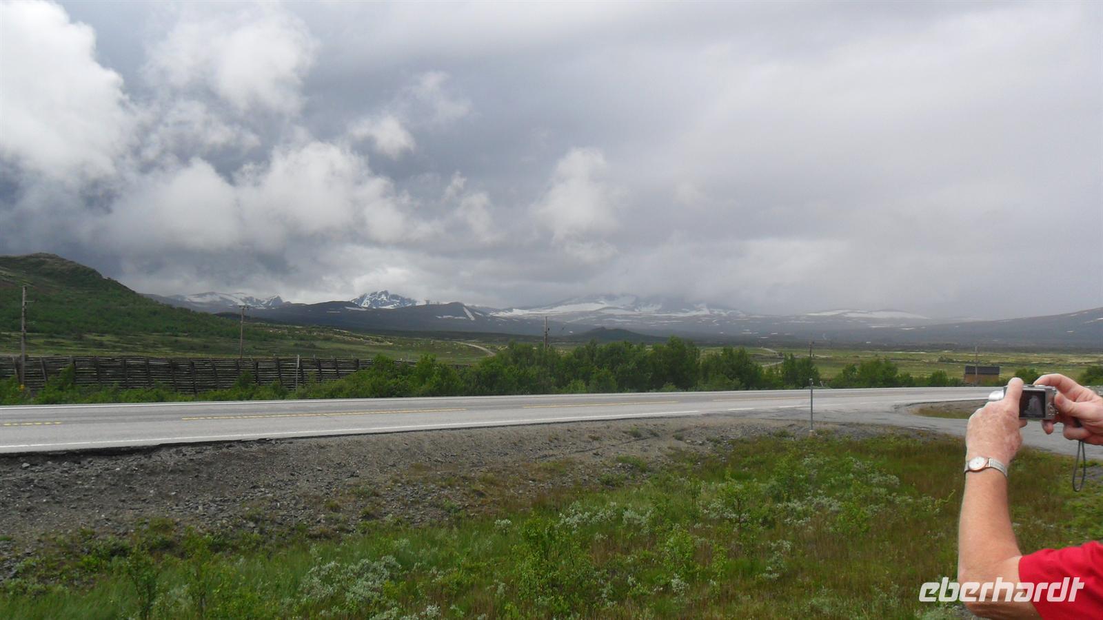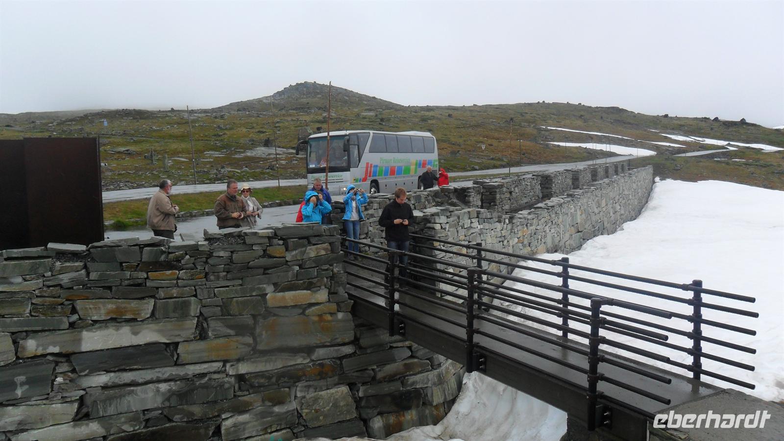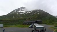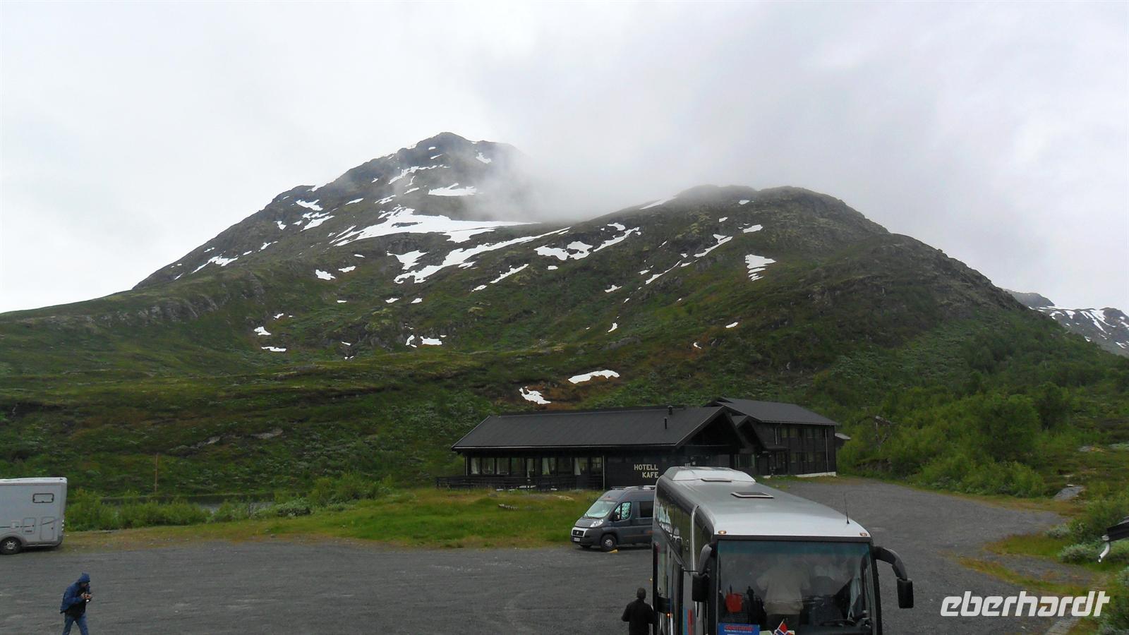 Auch heute war eine recht frühe Abfahrt notwendig, bei der es zunächst über eines der höchsten norwegischen Fjelle ging. Zahlreiche Fotostopps auf dem Sognefjell sind zu empfehlen, denn mit Gletschern, steilen Bergen und Seen gibt es viele Punkte für tolle Fotos. Obwohl diesmal das kalte, regnerisch-neblige Wetter mit vielen, tiefhängenden Wolken nicht gerade fotogünstig war gab es wie fast immer einen Stopp am Oskarshaug, einem nach einem dänischen Kronprinzen benannten Aussichtspunkt mit dem einzigen Toilettenhäuschen in den Bergen.