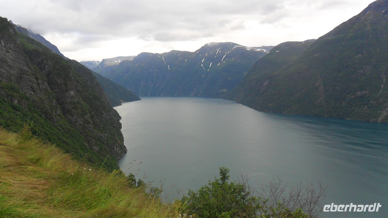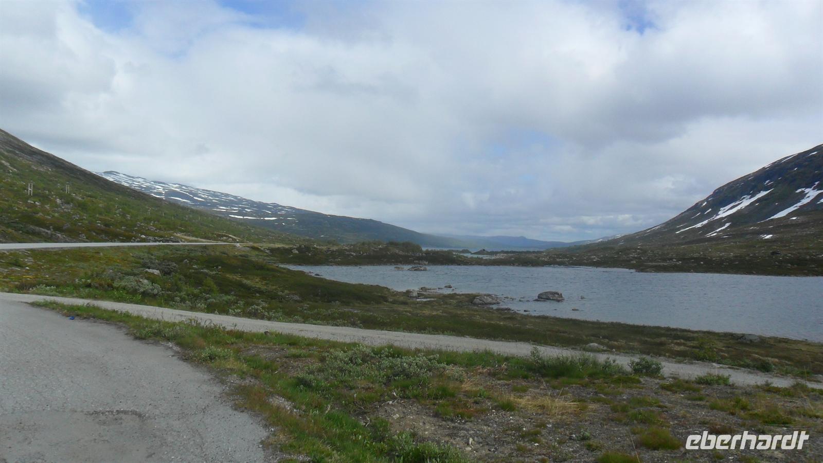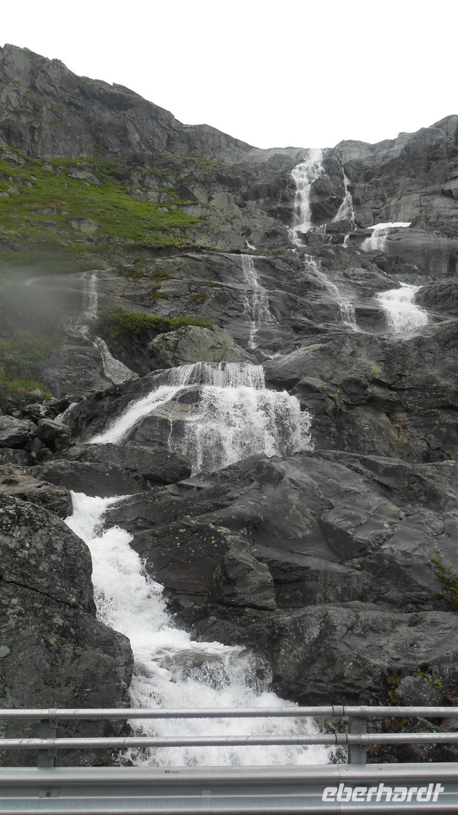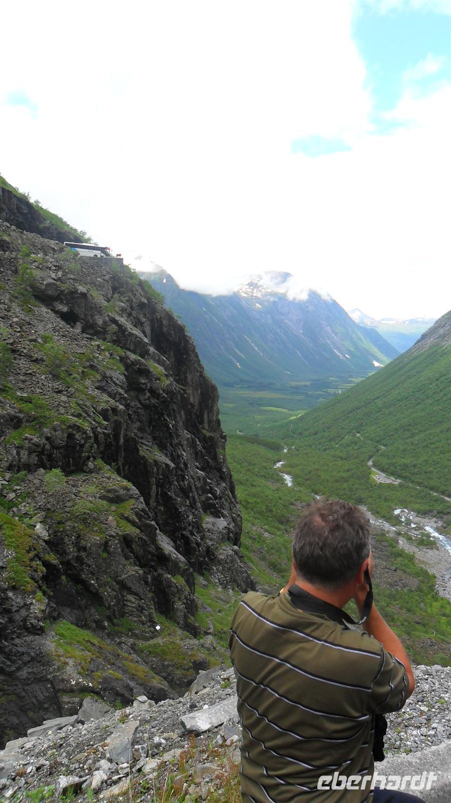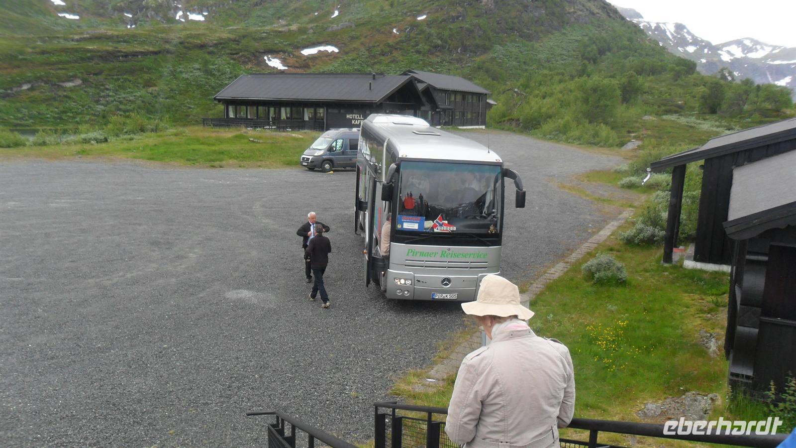 Auch heute war eine recht frühe Abfahrt notwendig, bei der es zunächst über eines der höchsten norwegischen Fjelle ging. Zahlreiche Fotostopps auf dem Sognefjell sind zu empfehlen, denn mit Gletschern, steilen Bergen und Seen gibt es viele Punkte für tolle Fotos. Obwohl diesmal das kalte, regnerisch-neblige Wetter mit vielen, tiefhängenden Wolken nicht gerade fotogünstig war gab es wie fast immer einen Stopp am Oskarshaug, einem nach einem dänischen Kronprinzen benannten Aussichtspunkt mit dem einzigen Toilettenhäuschen in den Bergen.