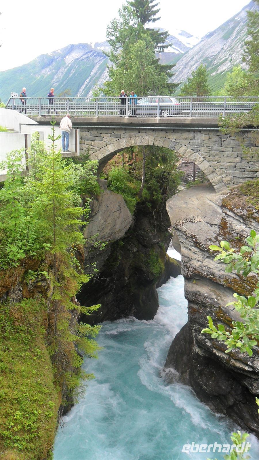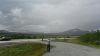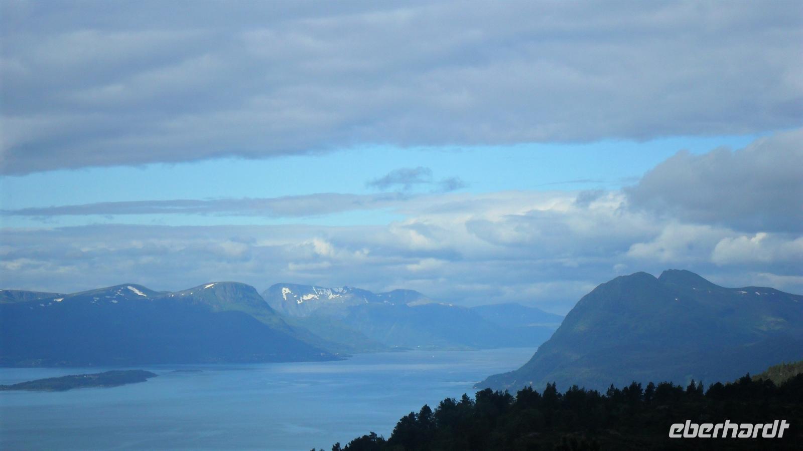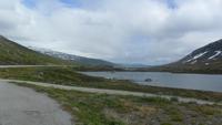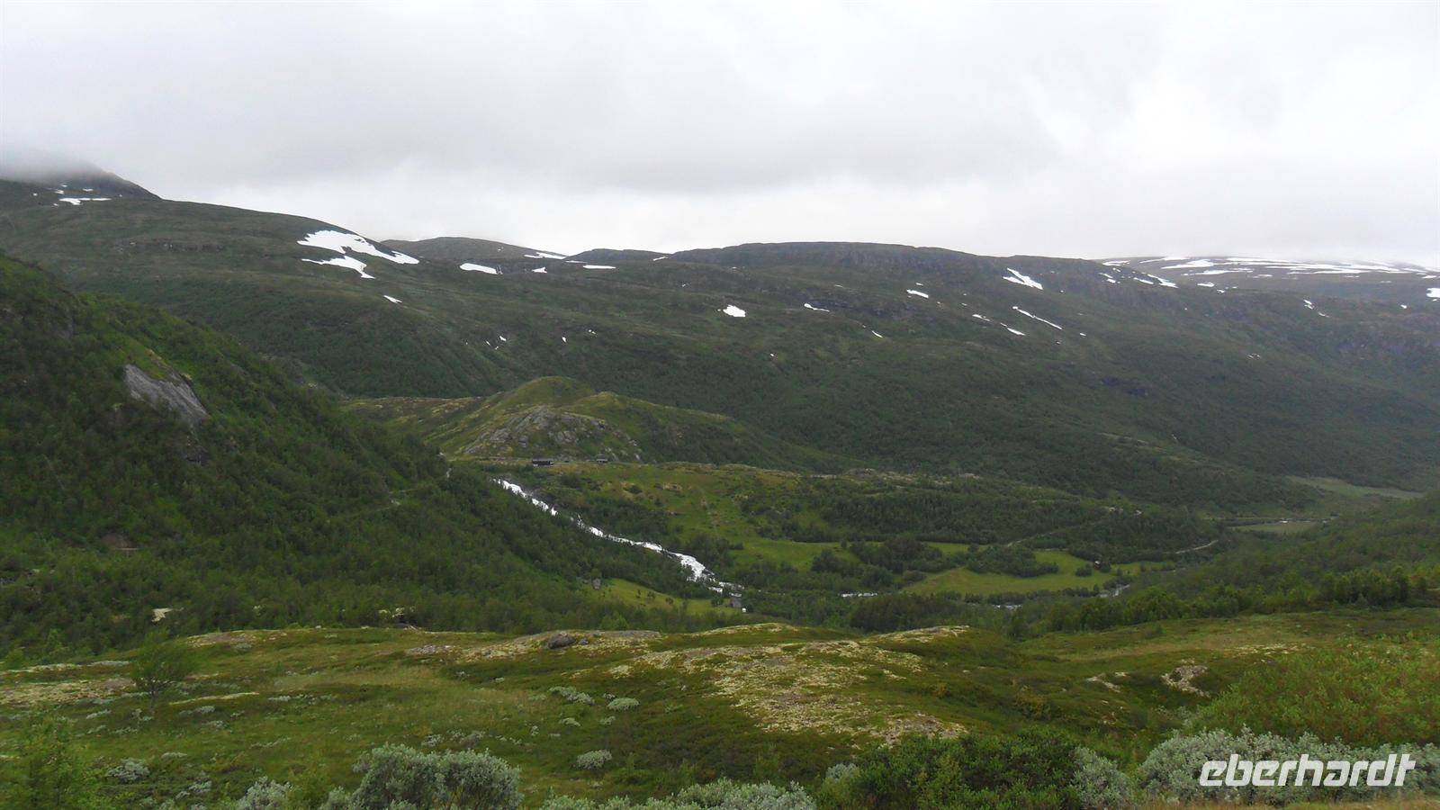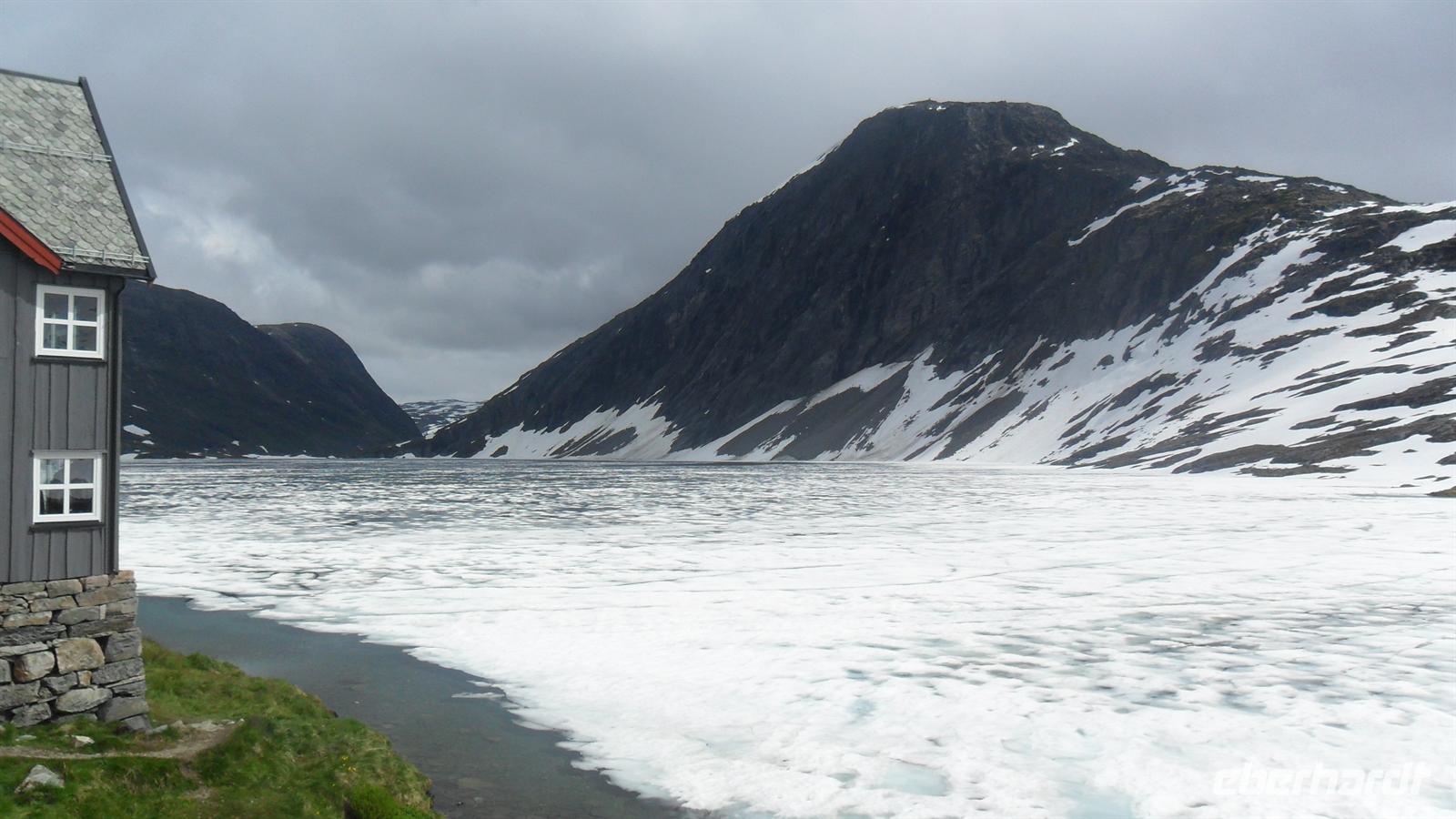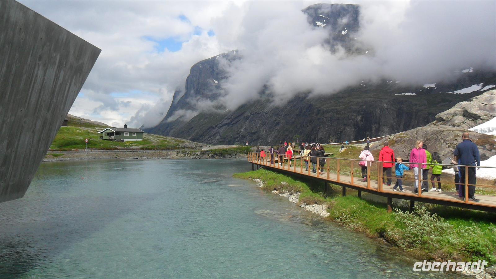 Auch heute war eine recht frühe Abfahrt notwendig, bei der es zunächst über eines der höchsten norwegischen Fjelle ging. Zahlreiche Fotostopps auf dem Sognefjell sind zu empfehlen, denn mit Gletschern, steilen Bergen und Seen gibt es viele Punkte für tolle Fotos. Obwohl diesmal das kalte, regnerisch-neblige Wetter mit vielen, tiefhängenden Wolken nicht gerade fotogünstig war gab es wie fast immer einen Stopp am Oskarshaug, einem nach einem dänischen Kronprinzen benannten Aussichtspunkt mit dem einzigen Toilettenhäuschen in den Bergen.
