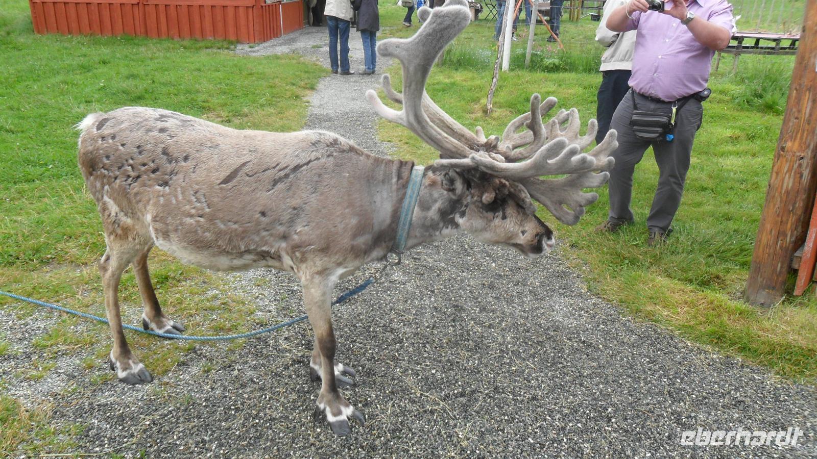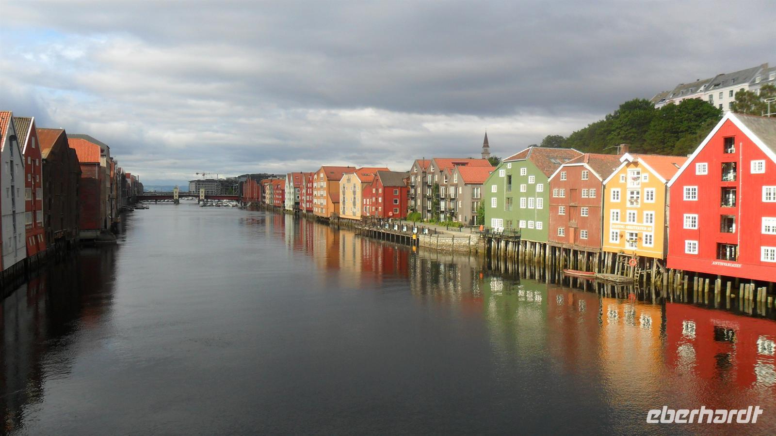 Auch ich warnte unsere Gäste vor den Umtrieben der gefährlichen Kobolde und erzählte von den hinterhältigen, zauberkräftigen und garstigen Trollen, die zwischen fünfzig Zentimetern und zwölf Metern groß sein können und nur sehr selten dem Menschen freundlich gesonnen sind. Ob nun der Troll und seine Frau Tusse oder die Wasserfallgeister oder gar die hübsch aussehenden aber durchtriebenen Huldra - gefährlich sind sie alle! Etwas Spass hatten schon alle an den an den Erklärungen all der Geschichten, Sitten und Gebräuche, die mit den Ttrollen in Norwegen zusammenhängen. Nach einer Mittagspause in Dombås überquerten wir das Dovrefjell, eine wilde und oft unwirtliche Hochfläche mit Fotostopp in Dovregubbens Hall, dem mutmaßlichen Hof des gefährlichsten und größten aller Trolle. Hier gibt es auch die historische Brücke, die früher Bestandteil des historischen Königsweges vom Krönungsort Trondheim nach Bergen, Stavanger und Oslo war. Einen weiteren Fotostopp gönnten wir uns noch an einem Lappencamp, wo neben einer Kota - dem Sommerzelt der Lappen - eine Gamme - seine Winterwohnung - sowie ein einsames Rentier zu bewundern und zu fotografieren waren. Bei der Ankunft in Trondheim hatte der Regen aber aufgehört: so dass wir noch eine kleine Besichtigung der historischen Altstadtbro machen konnten, mit Blick auf die UNESCO-Welterbespeicher am Nidelven. Unweit von hier lagen das Stadtzentrum, aber auch unser Hotel Rica Bakklandet, in das wir eincheckten und wo wir nach dem Abendessen übernachteten.