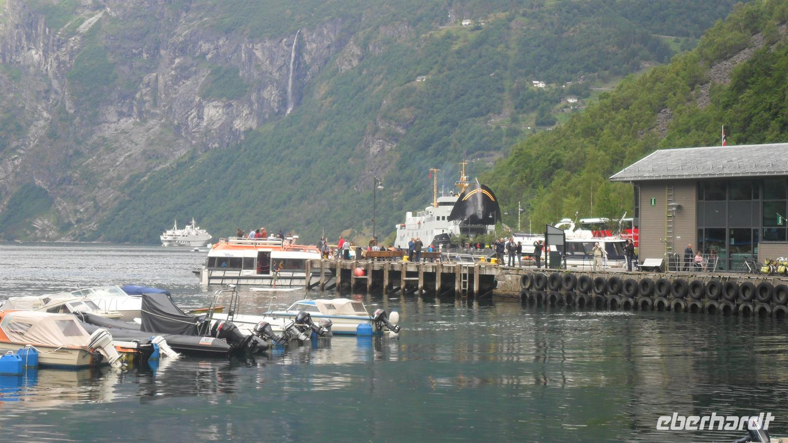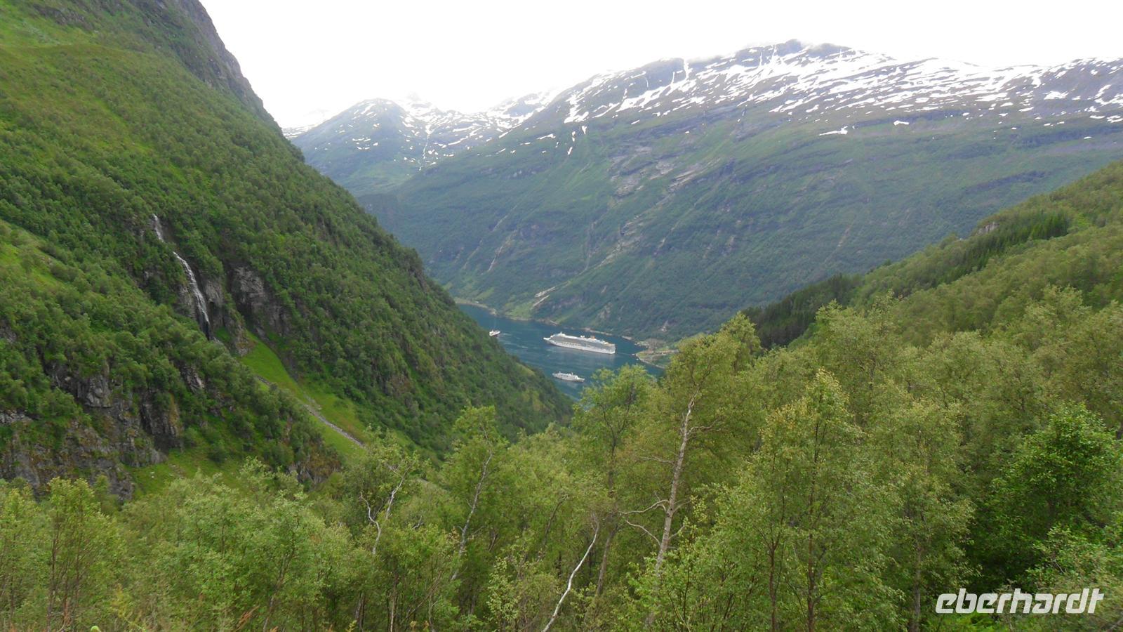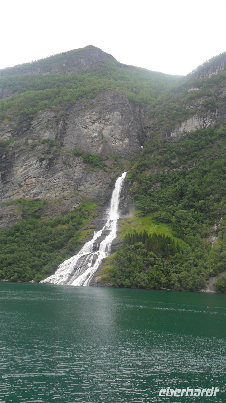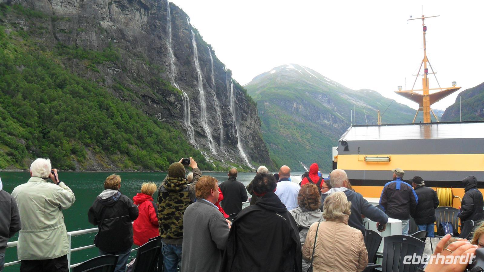 Auch heute war das Wetter recht gut und die Fahrt begann recht früh. Wichtig für uns war, um 11.00 Uhr die Geiranger-Fähre im Ort Hellesylt zu erreichen. Deren spektakuläre Fahrt zeigt - vom Sunnylfsfjord kommend - die gesamte Länge des Geiranger Fjordes mit allem Sehenswerten rundherum, das vom Schiffspersonal kommentiert wird. Wie immer staunten unsere Gäste bei dieser Fahrt im unter UNESCO-Weltnaturerbeschutz stehenden Fjord, während sie an den steil aufstrebenden Berghängen vorbeifuhren. Diese warten mit vielen imposanten Wasserfällen auf, zu denen auch die berühmten der „Sieben Schwestern" , des „Brautschleiers“ und des „Freiers“ gehören.