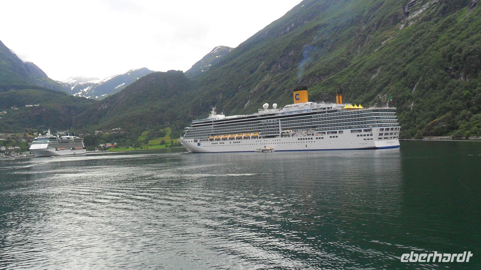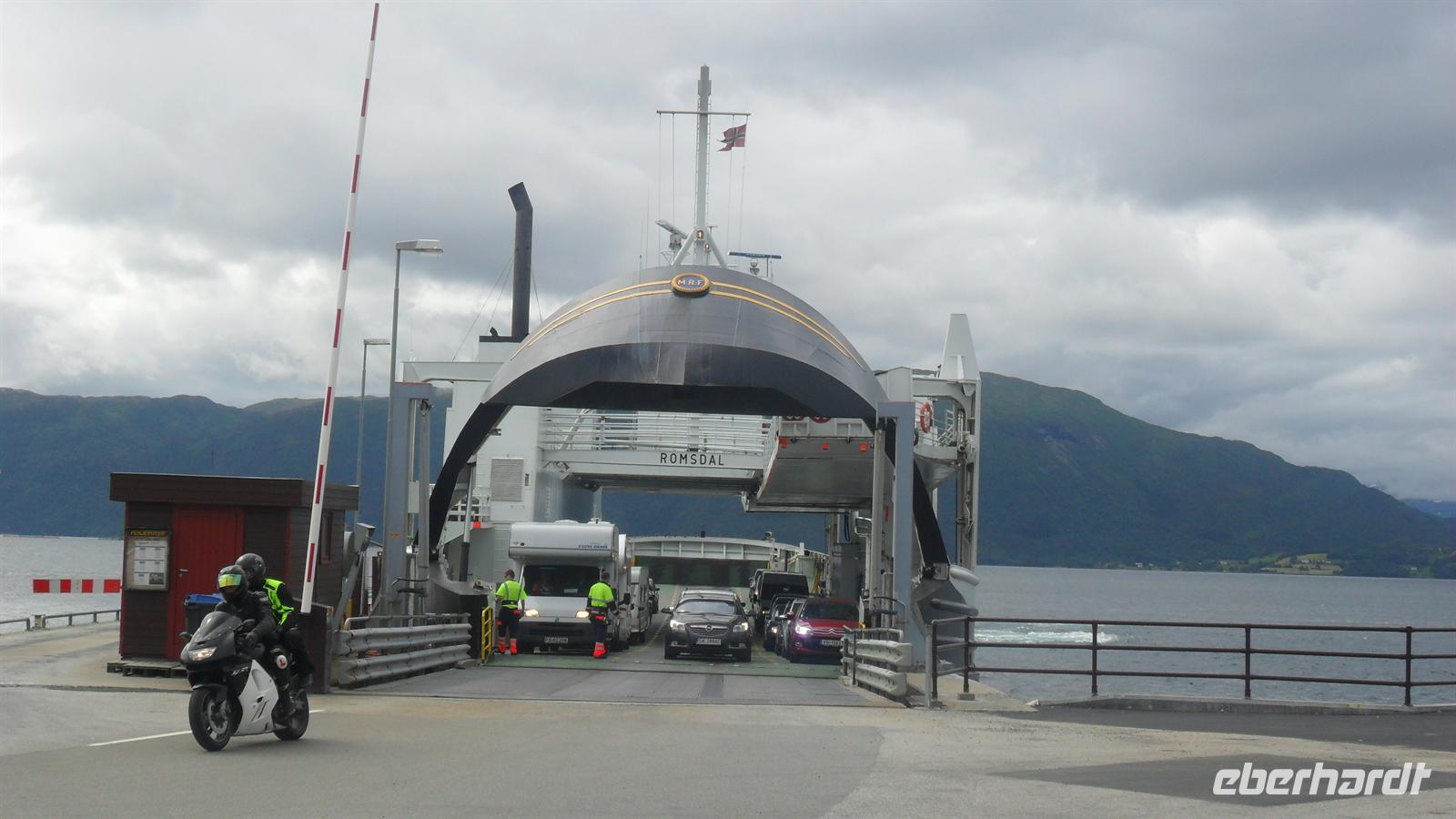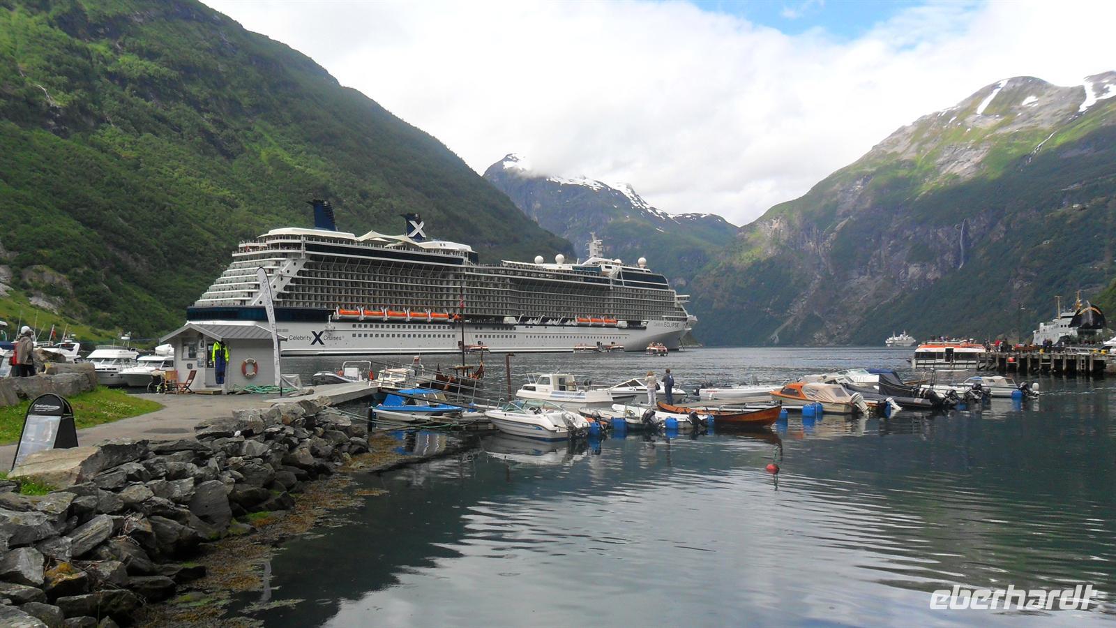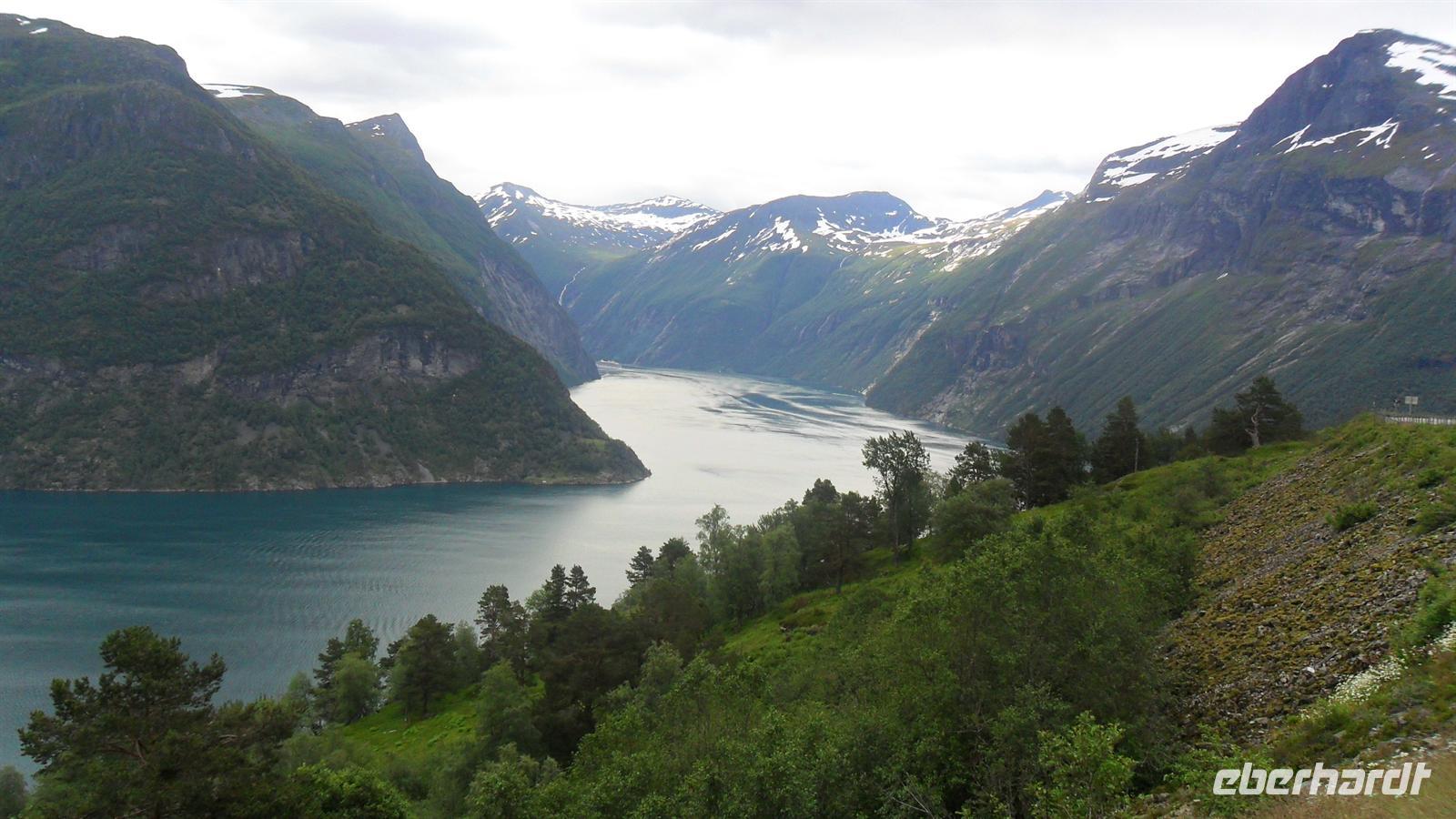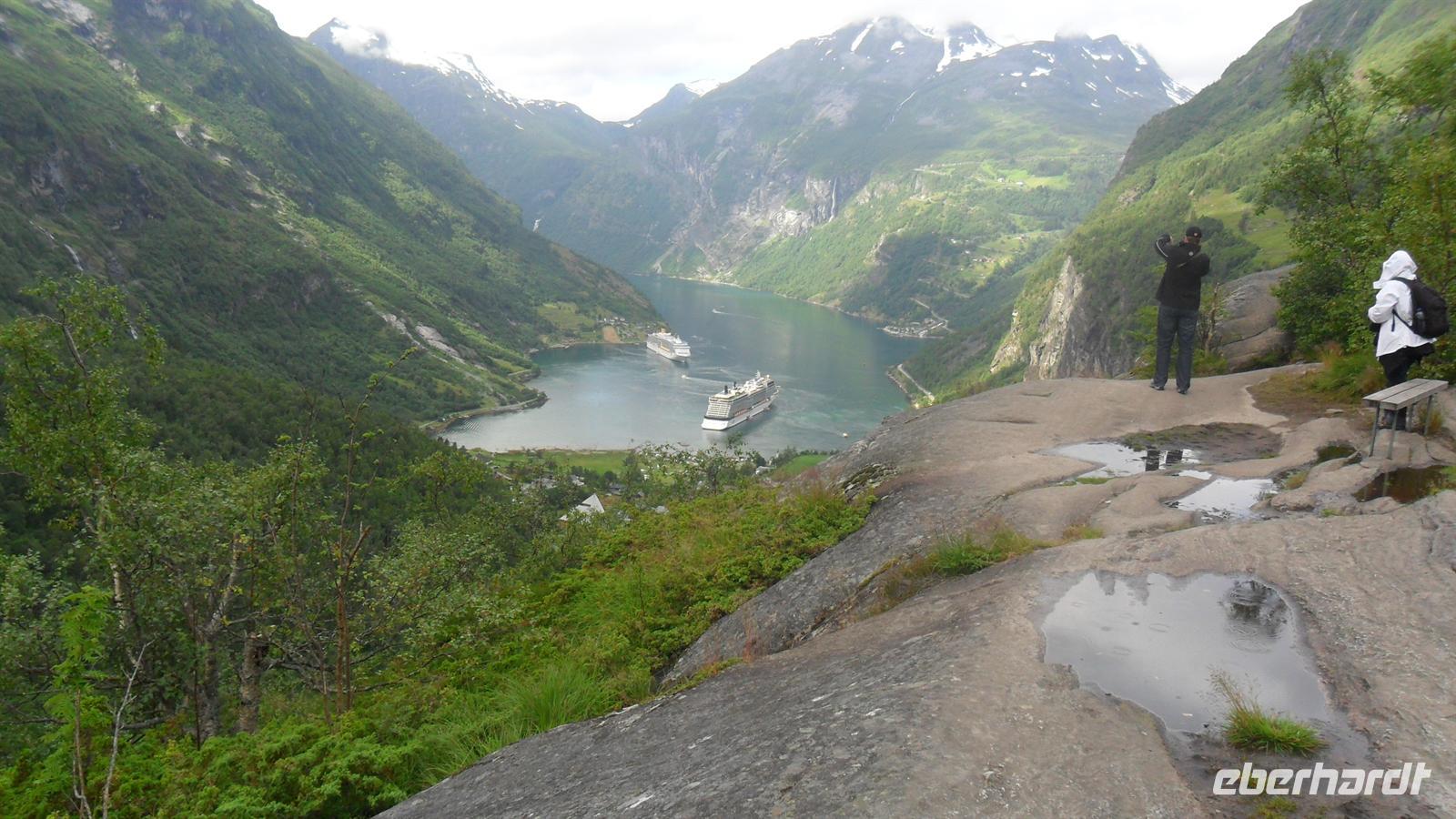 Auch heute war das Wetter recht gut und die Fahrt begann recht früh. Wichtig für uns war, um 11.00 Uhr die Geiranger-Fähre im Ort Hellesylt zu erreichen. Deren spektakuläre Fahrt zeigt - vom Sunnylfsfjord kommend - die gesamte Länge des Geiranger Fjordes mit allem Sehenswerten rundherum, das vom Schiffspersonal kommentiert wird. Wie immer staunten unsere Gäste bei dieser Fahrt im unter UNESCO-Weltnaturerbeschutz stehenden Fjord, während sie an den steil aufstrebenden Berghängen vorbeifuhren. Diese warten mit vielen imposanten Wasserfällen auf, zu denen auch die berühmten der „Sieben Schwestern" , des „Brautschleiers“ und des „Freiers“ gehören.