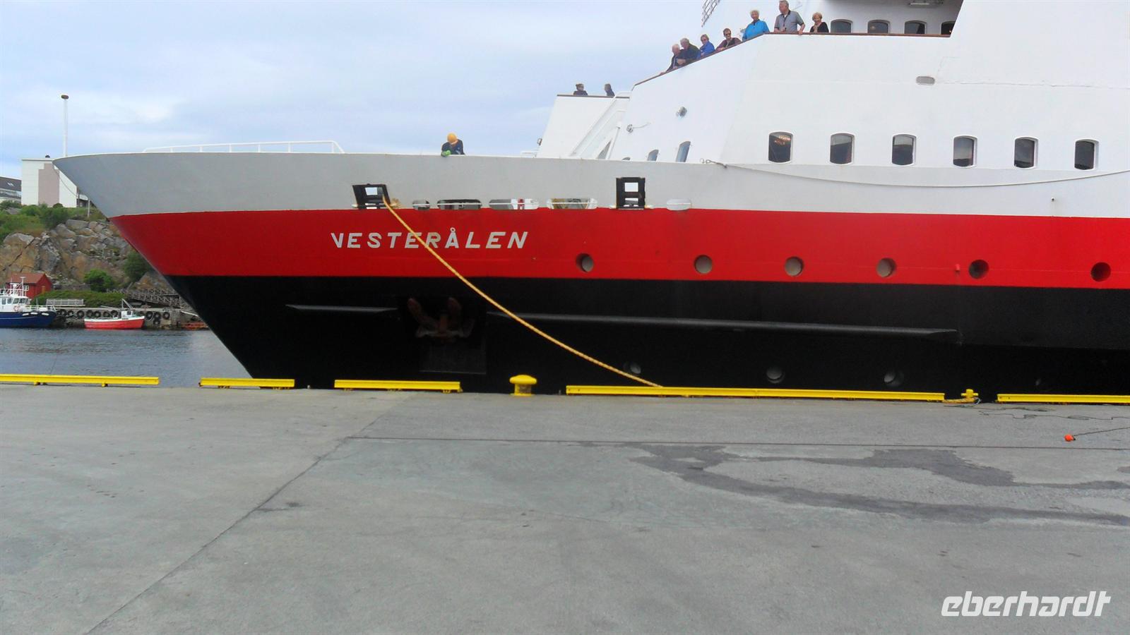 Als erstes heute ging es zu einer Außenbesichtigung des berühmten Nidarosdomes, des größten und bekanntesten Kirchenbauwerkes in Norwegen. Erbaut aus dem in der Nähe vorkommenden grünen Seifenstein mit seiner herrlichen Westfassade, als Schirmfassade zur Schau erbau, steht der Trondheimer Dom am Nid-Fluß - seit dem 11. Jahrhundert mit zahlreichen Umbauten über dem ehemaligen Grab des Heiligen Olav, der einst das Christentum in Norwegen einführte. Kurz besahen wir uns noch das nebenliegende Bischofspalais, von dem einige wenige mittelalterliche Reste neben modernen Anbauten erhalten sind, bevor wir zum Trondheimer Postschiff-Kai fuhren. Um 10.00 Uhr ging von hier das Schiff der Hurtigruten, seit 1893 in Norwegen ein Symbol für Zuverlässigkeit und Regelmäßigkeit. Damals hatten die ersten Schiffe einen regelmäßigen Post- und Passagierdienst zwischen Nord- und Südnorwegen aufgenommen, weswegen man die Hurtigrute bis heute „Reichsstraße Nr. 1“ nennt. Mit den komfortablen und bequemen Schiffen kann mit ihnen täglich sowohl in nördlicher als auch in südlicher Richtung fahren und dabei auf der kompletten Strecke 34 Häfen anlaufen. Für sechseinhalb Stunden konnten die Gäste sich als Deckspassagiere an Bord der „Vesterålen“ entspannen und dabei die grandiose Küstenszenerie Norwegens an sich vorbeiziehen lassen.