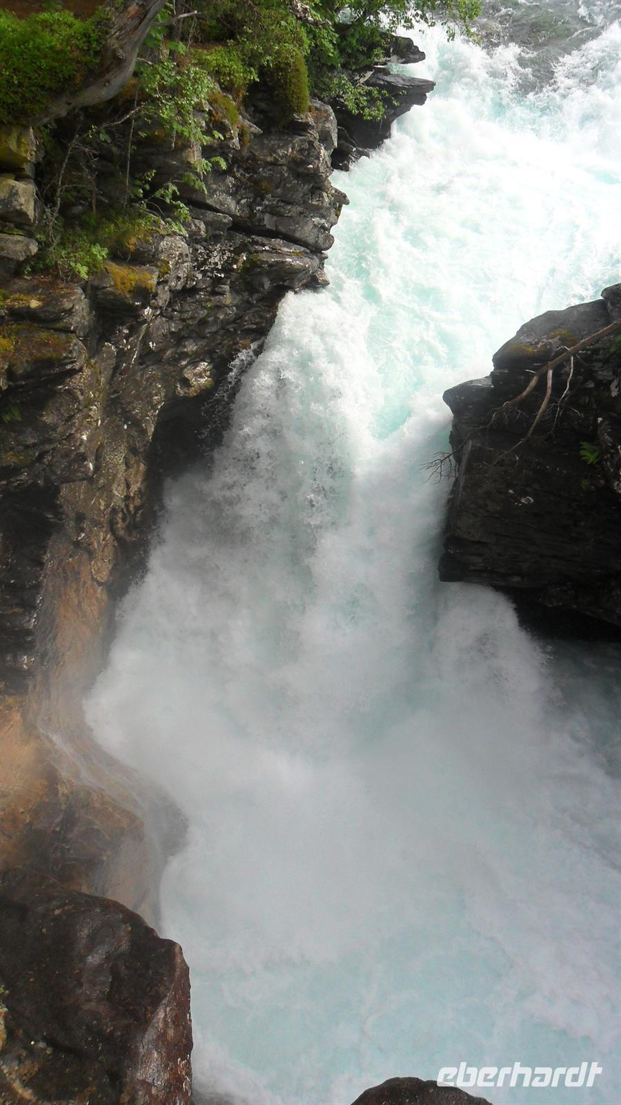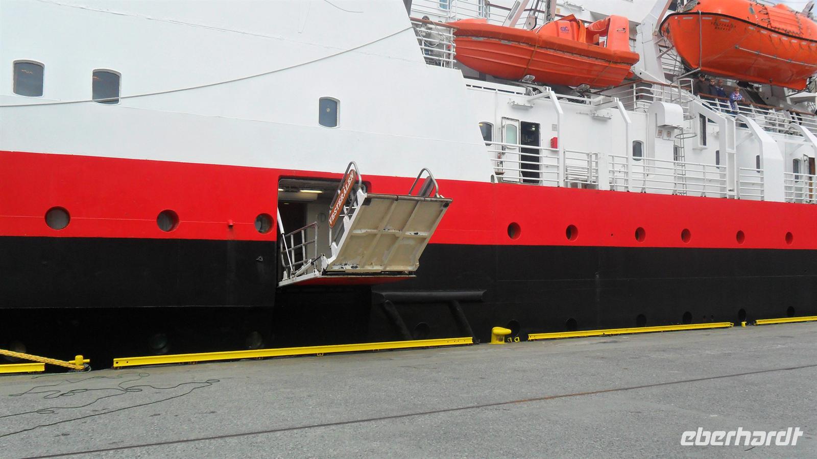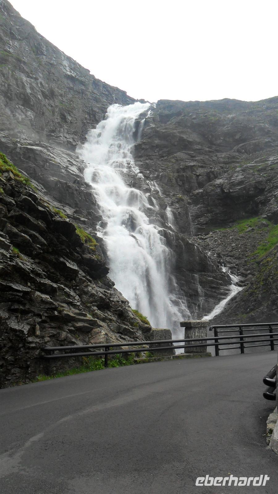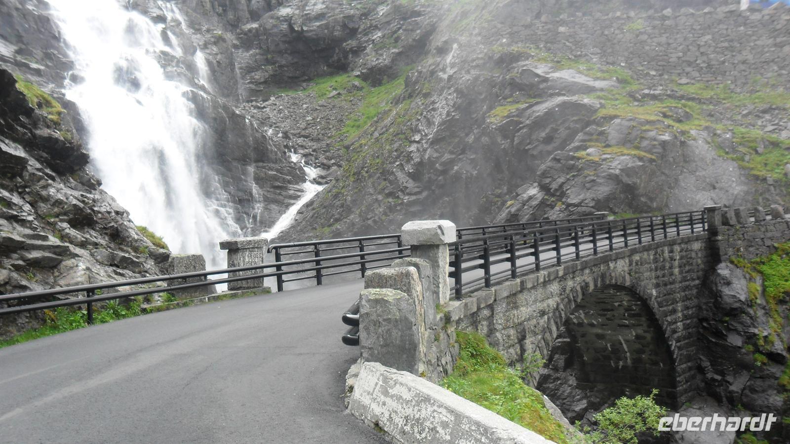 Für Bergen - die regenreichste Stadt Europas - war ausgesprochen schönes Wetter. : Unser örtlicher Reiseleiter in Bergen, von Geburt Franzose, sprach hervorragend deutsch mit interessantem Akzent und gestaltete seine Führung interessant und witzig. Vom Hafen ging es durch die Altstadt mit der alten Festung, dann zum neueren Teil Bergens und zum anderen Hafen, in dem heute die Kreuzfahrtschiffe anlegen. Hier befindet sich die größere der beiden Bergenfestungen mit der historischen Håkonshalle und dem Rosenkranzturm. Daneben aber liegt das, was Bergen am interessantesten macht: Bryggen, das alte Hanseviertel, das überwiegend aus Holzhäusern besteht und zum UNESCO-Weltkulturerbe zählt. Dieses Viertel war im Mittelalter die Niederlassung der Hanse, lag aber außerhalb der Stadt Bergen. Deshalb war Bergen nie Hansestadt, besaß aber ein Hansekontor in der Nachbarschaft. Nachdem Monsieur Bernard uns Bergen und das Hanseviertel erklärt hatte, blieb noch eine Stunde Freizeit am Fischmarkt übrig, bevor wir uns auf den Heimweg machten. Die Mittagspause legten wir an einem tollen Wasserfall ein, am Steindalsfoss mit einer Höhe von ca. 50 m, hinter dessen Wasserschwall ein Rundweg entlangführt.