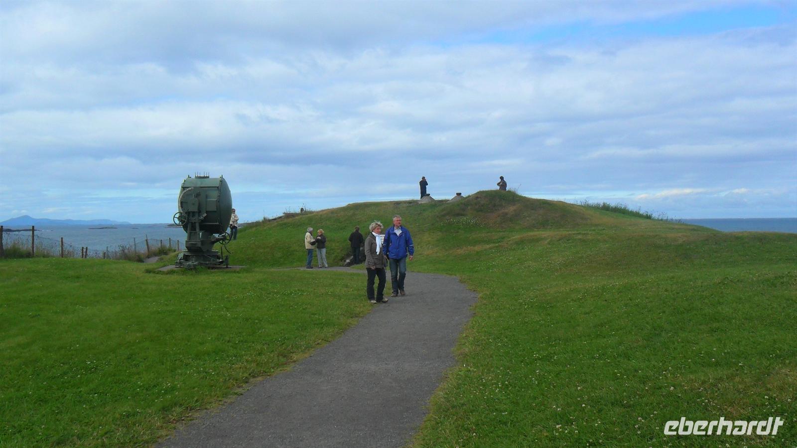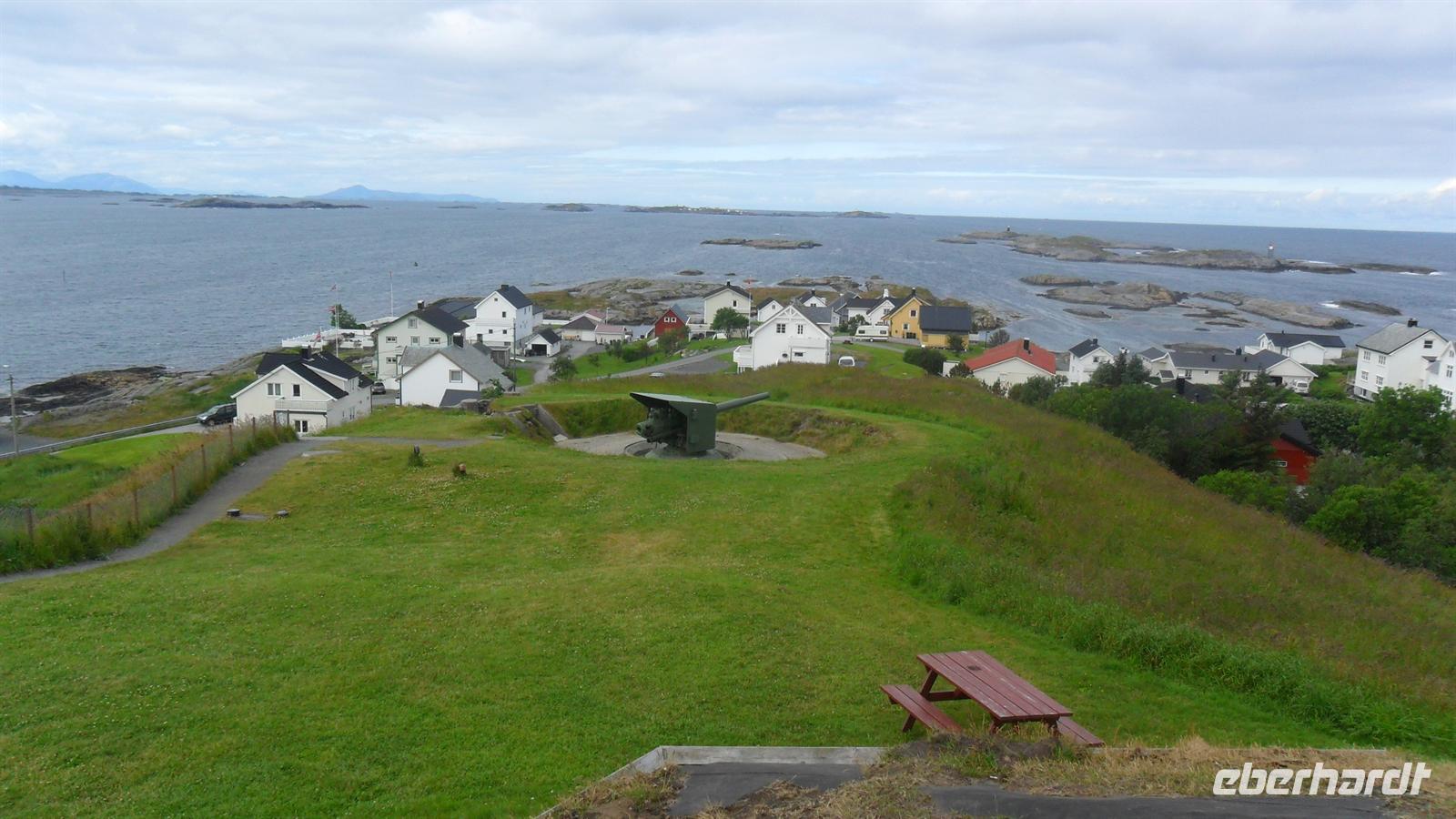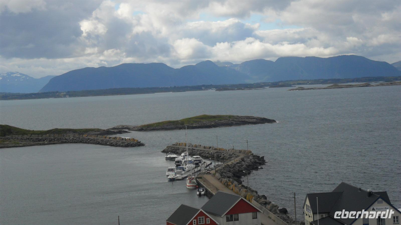In Molde, der „Stadt der Rosen" wie sie wegen ihres milden Klimas und der vielen Blumen genannt wird, begann unser Erlebnistag mit der Auffahrt auf den Hausberg, den 407 m hohen Varden. Der grandiose Ausblick auf die Fjord- und Inselwelt der Provinz Møre og Romsdal zeigt mehrere Fjorde und hunderte Gipfel der umliegenden Bergwelt. Anschließend hatte ich im Sinne von „Richtig reisen!" eine kleine Extratour vor: Wir fuhren in das herrlich an der Schärenküste gelegene Bud, wo im 16. Jh. der Bischof von Bud versucht hatte, einen Aufstand gegen die damalige dänische Herrschaft zu organisieren um Norwegen unabhängig zu machen. Die Kirche von Bud und die Gegend hat dadurch Berühmtheit erlangt. Der hübsche heutige Kirchenbau stammt erst aus dem Jahre 1717 und wird überragt durch den über der Kirche gelegene Hügel Ergan. Während des zweiten Weltkrieges hatten deutsche Truppen hier eine Küstenfestung eingerichtet: Zu sehen sind noch Reste der Küstenfestung mit alten Bunkeranlagen sowie langsam verrottendem Kriegsgerät und natürlich der unvergleichliche Ausblick auf die vorgelagerten Inseln und den Schärengarten von Hustadsvik.