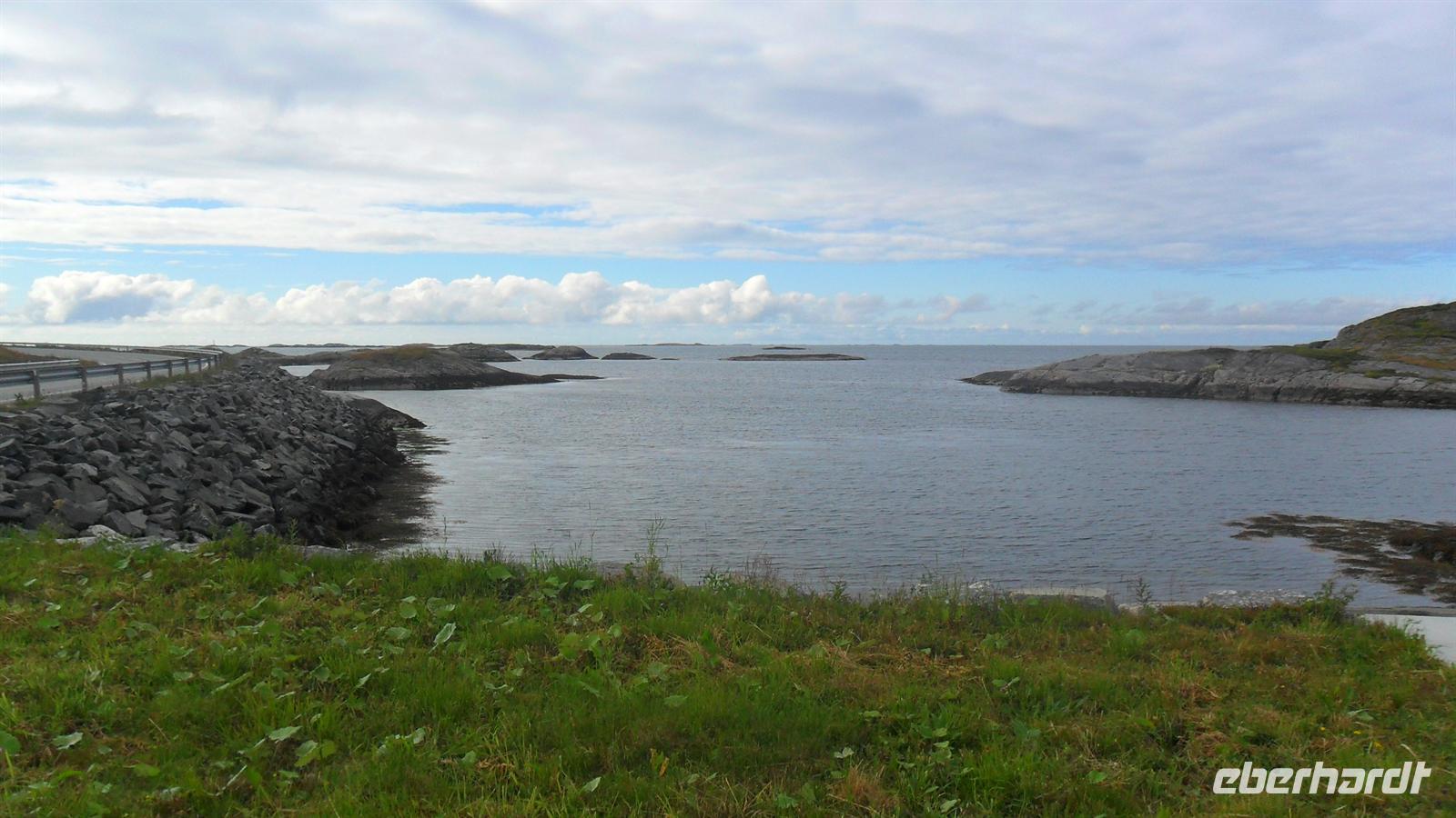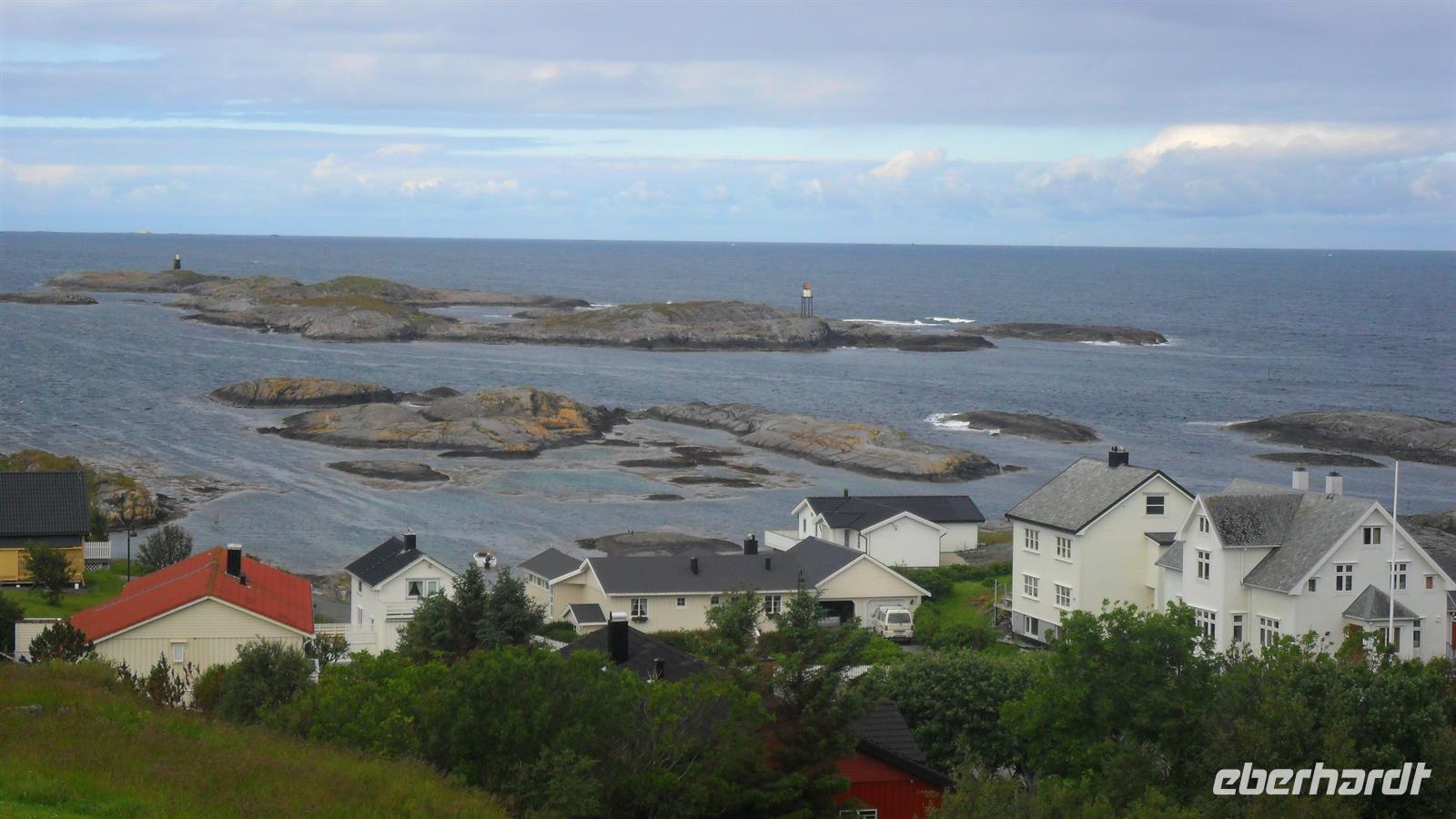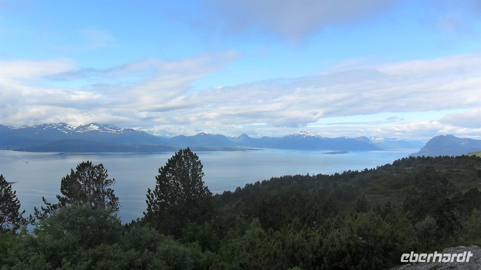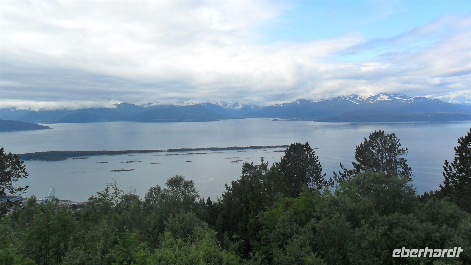 In Molde, der „Stadt der Rosen" wie sie wegen ihres milden Klimas und der vielen Blumen genannt wird, begann unser Erlebnistag mit der Auffahrt auf den Hausberg, den 407 m hohen Varden. Der grandiose Ausblick auf die Fjord- und Inselwelt der Provinz Møre og Romsdal zeigt mehrere Fjorde und hunderte Gipfel der umliegenden Bergwelt. Anschließend hatte ich im Sinne von „Richtig reisen!" eine kleine Extratour vor: Wir fuhren in das herrlich an der Schärenküste gelegene Bud, wo im 16. Jh. der Bischof von Bud versucht hatte, einen Aufstand gegen die damalige dänische Herrschaft zu organisieren um Norwegen unabhängig zu machen. Die Kirche von Bud und die Gegend hat dadurch Berühmtheit erlangt. Der hübsche heutige Kirchenbau stammt erst aus dem Jahre 1717 und wird überragt durch den über der Kirche gelegene Hügel Ergan. Während des zweiten Weltkrieges hatten deutsche Truppen hier eine Küstenfestung eingerichtet: Zu sehen sind noch Reste der Küstenfestung mit alten Bunkeranlagen sowie langsam verrottendem Kriegsgerät und natürlich der unvergleichliche Ausblick auf die vorgelagerten Inseln und den Schärengarten von Hustadsvik.