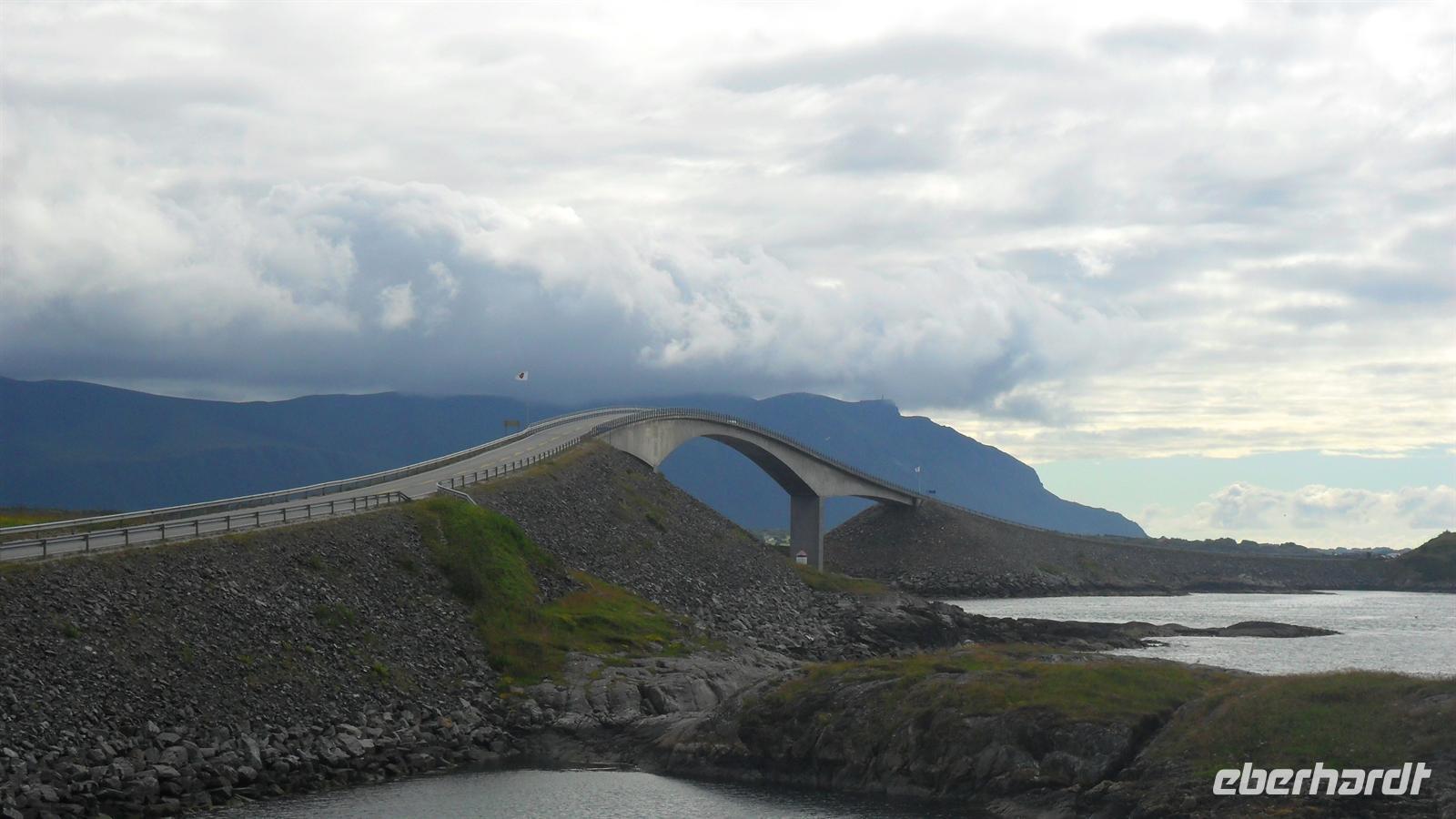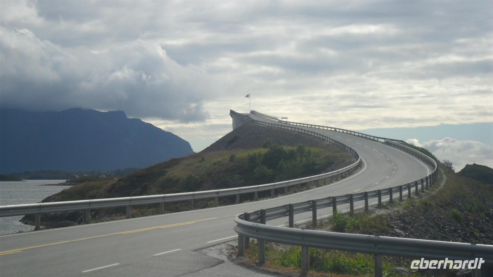 Der Bus fuhr unterdessen über Land und wir erwarteten die Hurtigrutenfahrer in Kristiansund pünktlich um 16.30 Uhr. Die Stadt war immer für ihren Klippfisch berühmt, einen speziell haltbar gemachten Fisch durch Einsalzen und Antrocknen, und wir besuchten noch kurz die Denkmäler von der Klippfischfrau und der Seemine aus dem zweiten Weltkrieg. Die anschließende Fahrt durch den Tunnel führte uns zum spektakulären Atlanterhavsveien. Diese Straße verbindet über neun Brücken und zwölf Damme zahlreiche Inseln, die früher zwischen Herbst und Frühjahr kaum zu erreichen waren. Hier ist es äußerst malerisch, wovon wir uns bei zwei Fotostopps überzeugen konnten. aufkam. Im Winter ist die Straße schlimmen Stürmen und Sturmfluten ausgesetzt - nicht selten wird selbst die höchste Brücke von Wellen überspült. Wir setzten unsere Fahrt in die „Stadt der Rosen“ nach Molde fort und genossen eine gutes Abendessen und eine bequeme Übernachtung im Alexandra Hotel, vor dem infolge des laufenden Jazz Musikfestvals noch lange Live-Musik gemacht wurde.