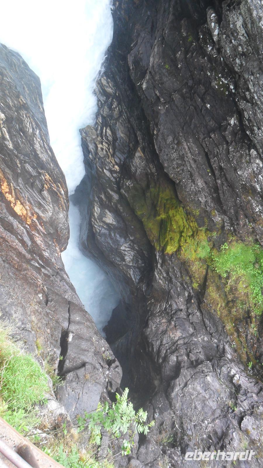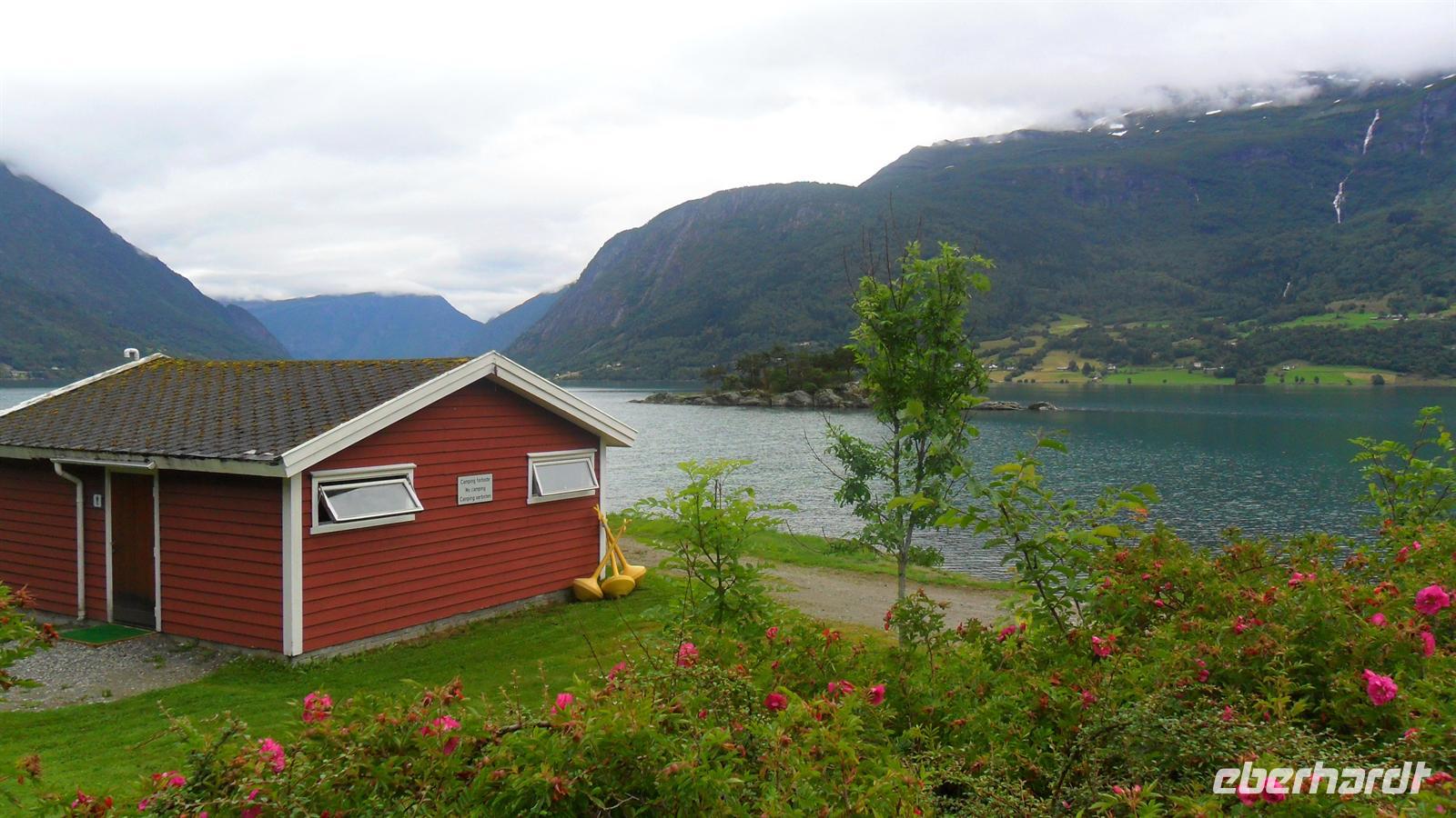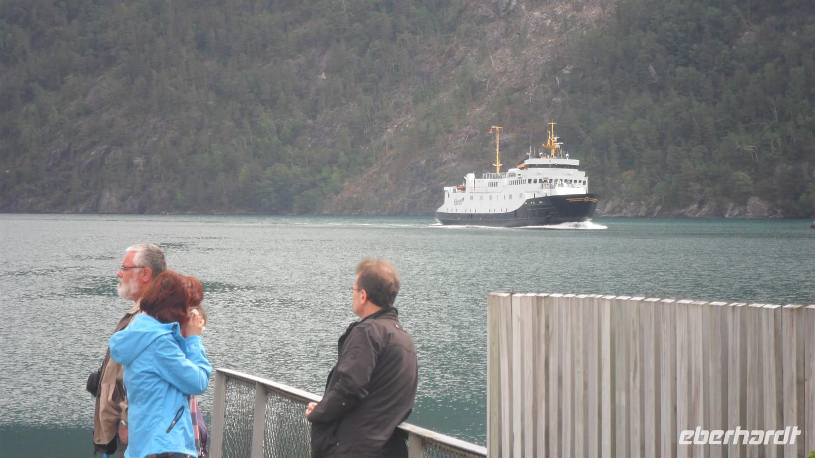 Die Weiterfahrt von hier führte wieder ins Tal, wo wir von Kaupanger aus unsere längste Fjordfahrt unternahmen. Fast zweieinhalb Stunden dauert es zum kleinen Ort Gudvangen mitten in den Bergen, am Ende des Naeroyfjords, des engsten aller Fjorde Norwegens. Imposant und von Bord des Fährschiffes gut zu genießen ist es schon, wie die Felskanten der steile Berge immer näher kommen und man gewahr wird, dass es hier Stellen gibt, an die das ganze Jahr die Sonne nicht hinkommt.