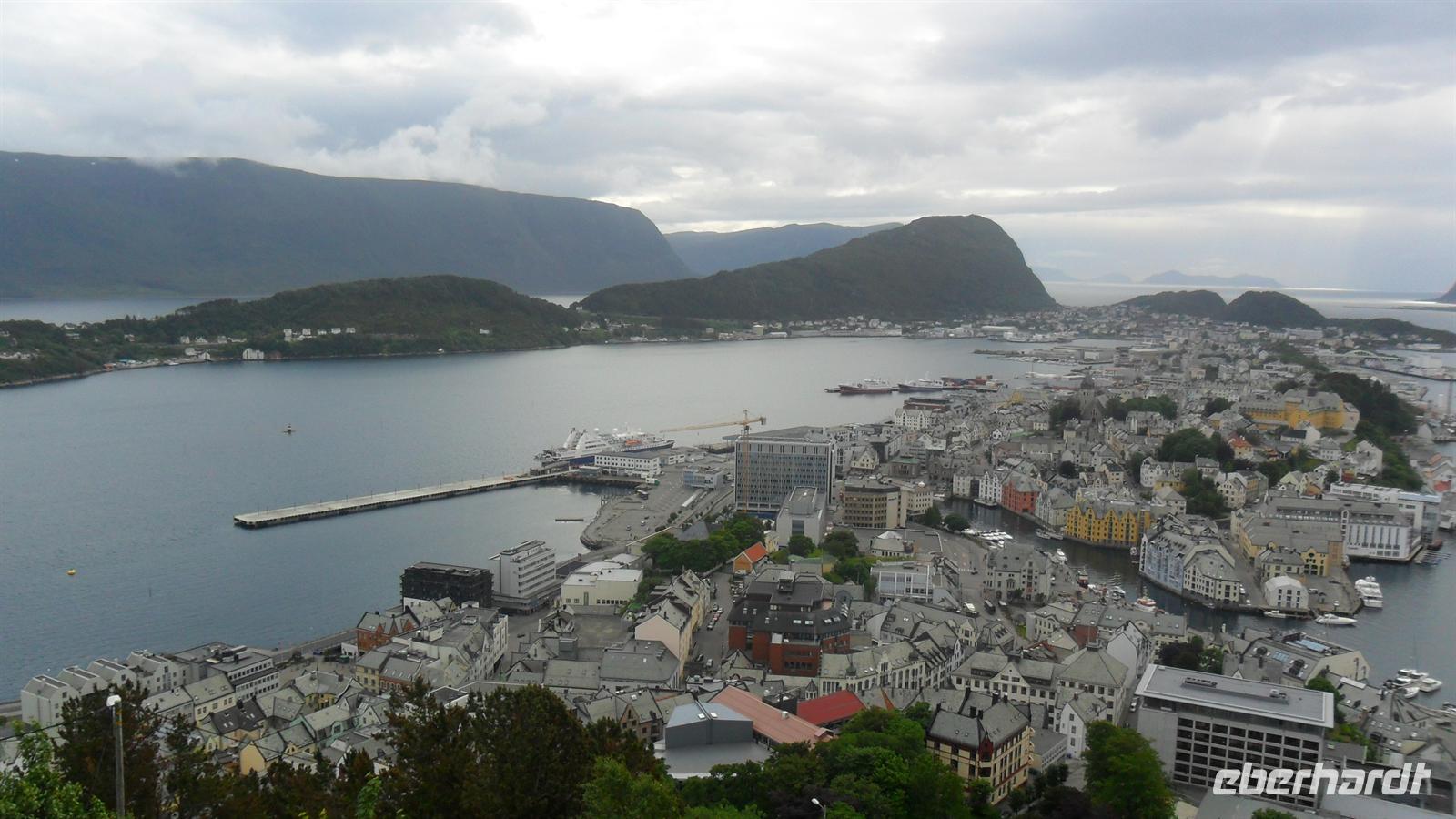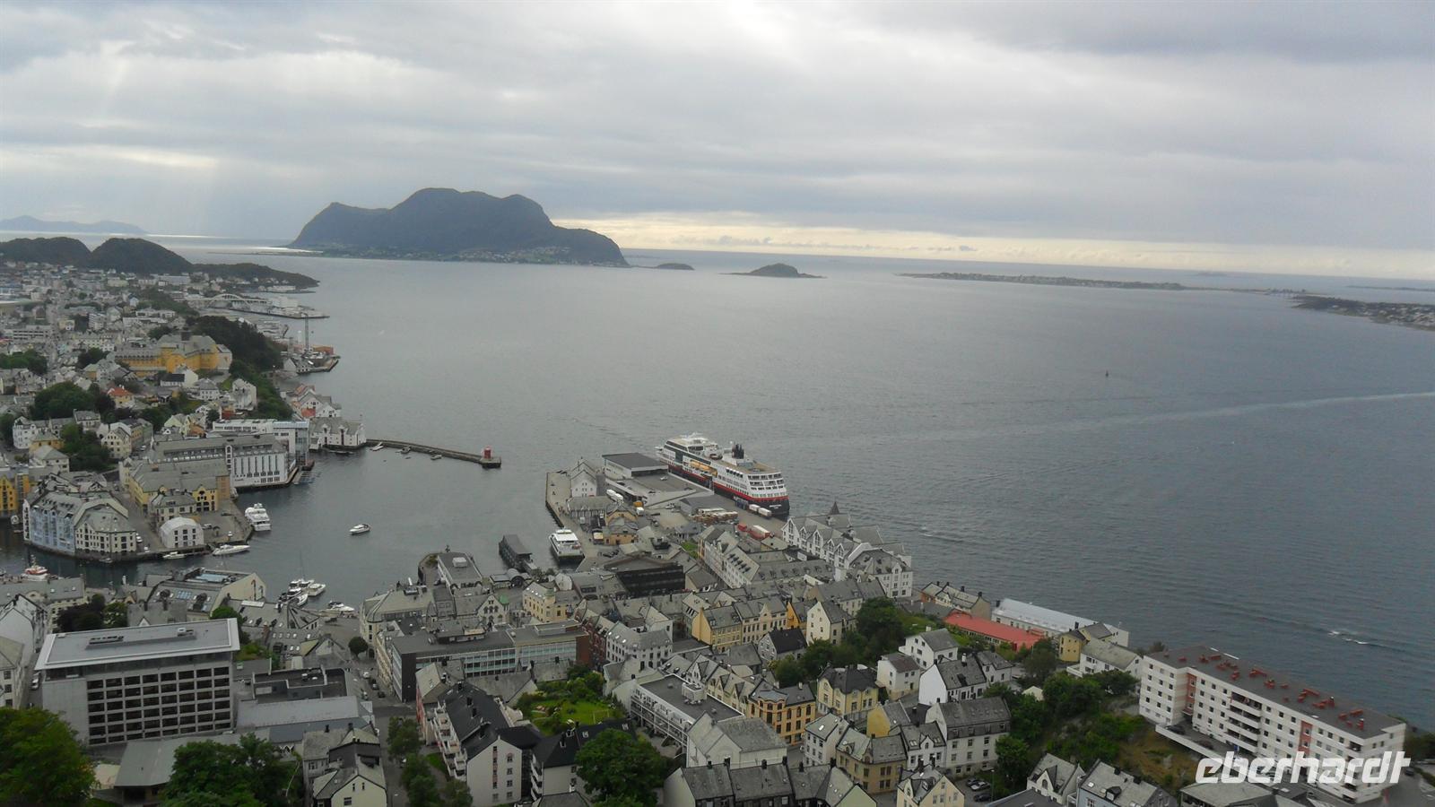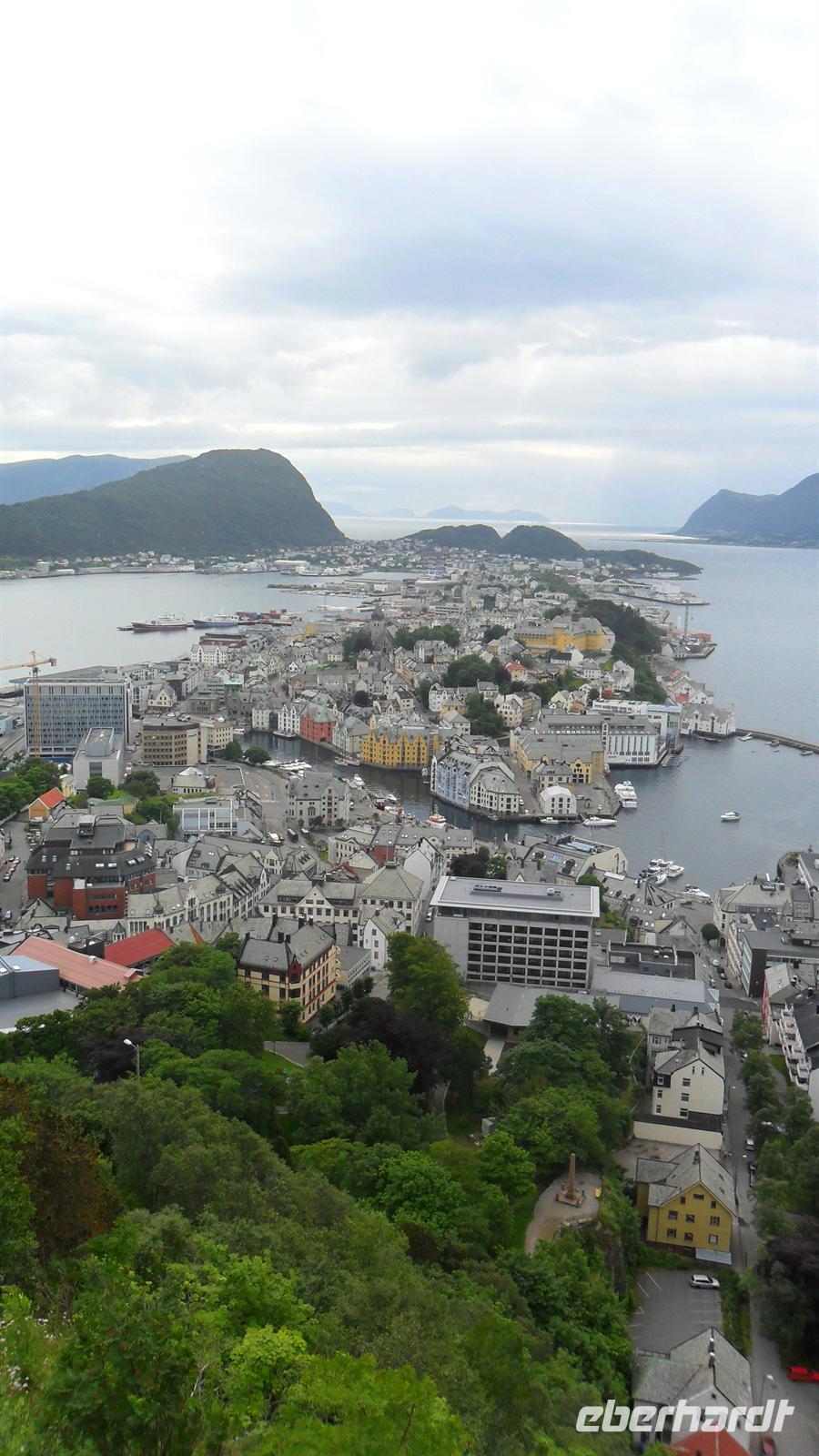 Anschließend folgte eine Fahrt mit dem Bus über Landstraßen und mit Fjord-Fähre nach Andalsnes. Vor der Auffahrt zum Trollstigen konnten wir ein weiteres „Extra“ einbauen: Bus-Chauffeur Frank und ich hatten unterwegs landestypische Spezialitäten eingekauft und konnten jetzt ein schönes Picnick offerieren, mit Bären- und Rentierschinken, Rentier- und Elchwurst sowie mehreren Sorten einheimischem Käse - dazu gab es Wein. Wie schon vermutet, waren auch dieses Mal die Gäste sehr angetan! Später ging es den Trollstigen hinauf, eine der spektakulärsten Bergstraßen Europas. Auf Dutzenden von Spitzkehren und Haarnadelkurven inmitten herrlicher Bergwelt erreicht man die Passhöhe, wo man die verschiedenen An- und Aussichtspunkte sowie die Souvenirshops aufzusuchen konnte. Das gute Wetter hatte mitgespielt - auch beim Fotostopp an der Gudbrandsbru mit ihrem neuen, hervorragend gestalteten Aussichtspunkt an den "Strudeltöpfen der Trolle“ genau über dem Zusammenfluss zweier Wasserfälle. Vor unserer Ankunft in ålesund fuhren wir aber noch auf den Hausberg oberhalb einer der schönsten Städte Norwegens. Vom 189 m hohen Stadtberg Aksla hat man eine phantastische Aussicht auf Norwegens Jugendstilstadt, das auf Dutzenden Inseln liegende ålesund, das 1904 komplett abgebrannt und dann im Jugendstil wiedererrichtet worden war. Im Rica Parken Hotel, mitten im Stadtzentrum hatten wir dann Abendessen und Übernachtung.