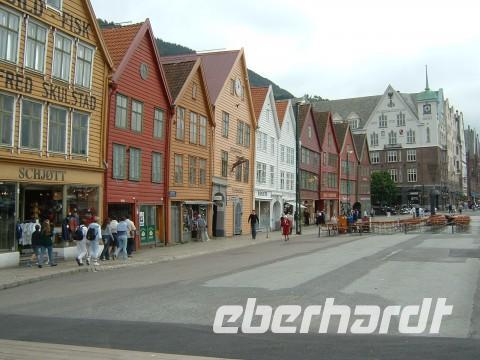 Nach Erreichen von Gudvangen befanden wir uns schon auf der Straße zu unserem Tagesziel Bergen - hielten aber zwischendurch noch am Tvindefoss an, einem der schönsten Wasserfälle Norwegens. Mit etwa 150 m Fallhöhe auch einer der größten, stürzt er mehrstrahlig von den Felsen herab und sieht überwältigend aus. Und gerade hier überraschte uns ein kräftiger Regenguß! Aber wir haben trotz aller Widrigkeiten ein Grppenfoto „geschossen“ und unsere Reise nach Bergen fortgesetzt. Die zweitgrößte Stadt Norwegens mit ihren vielen Sehenswürdigkeiten erreichten wir am Abend. Mitten im Zentrum stand unser Hotel Scandic Bergen, in dem wir nach dem Abendessen übernachteten. Einige Mitreisende allerdings ließen es sich nicht nehmen, zur Talstation der „Fløi-Bahn“ zu laufen und sich eine abendliche Auffahrt auf Bergens Hausberg mit der herrlichen Aussicht zu gönnen.