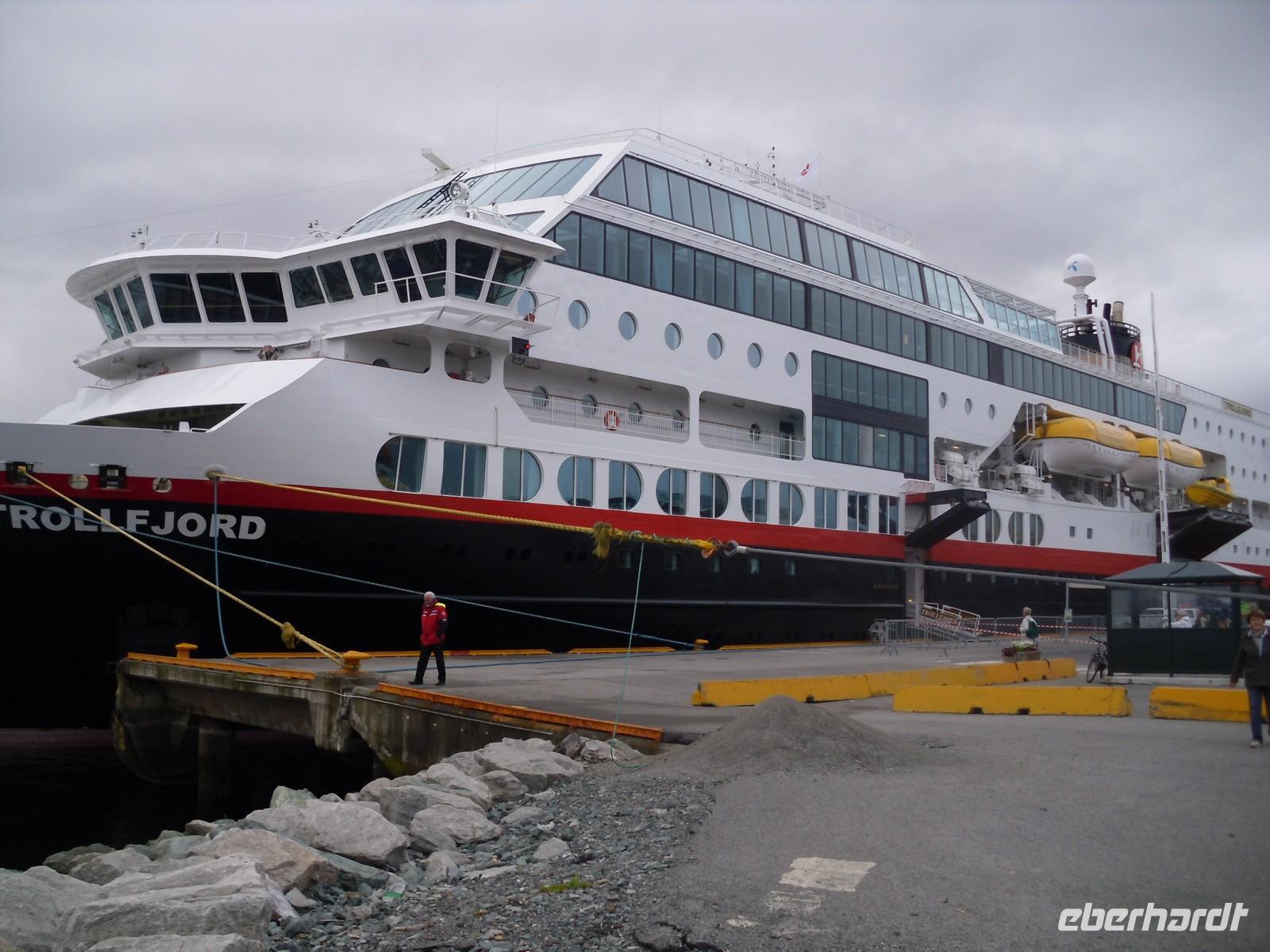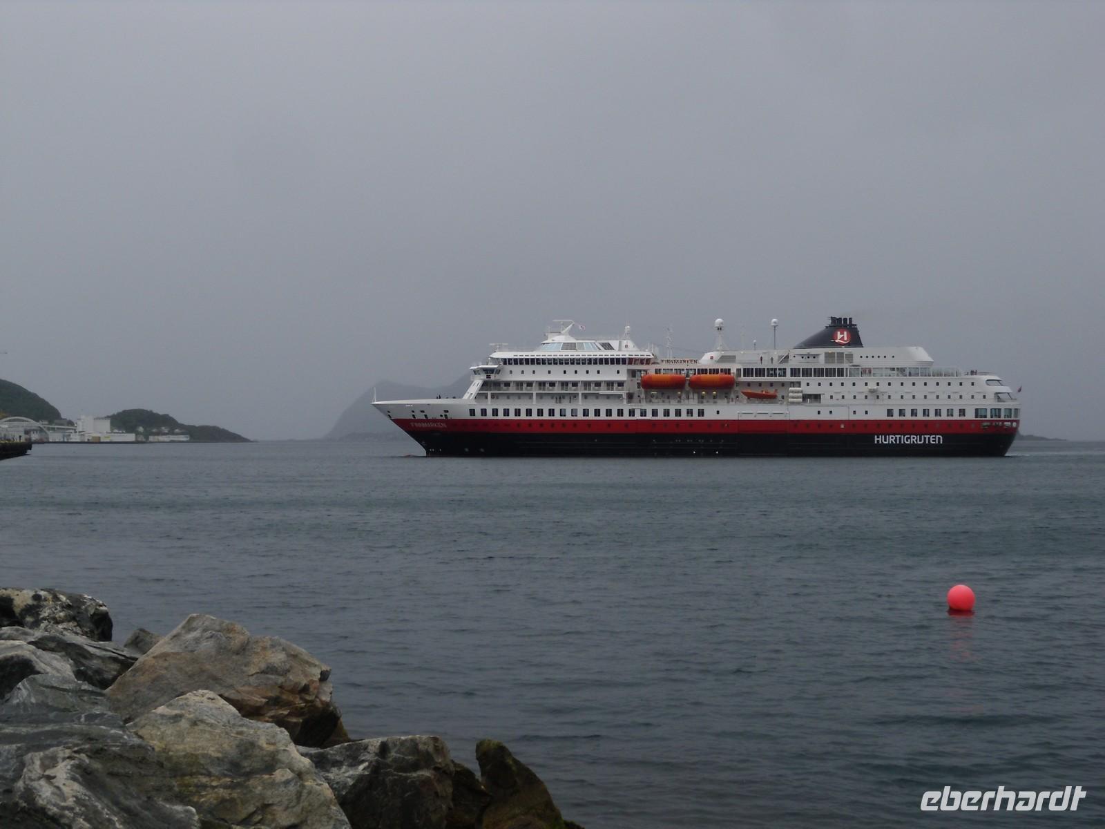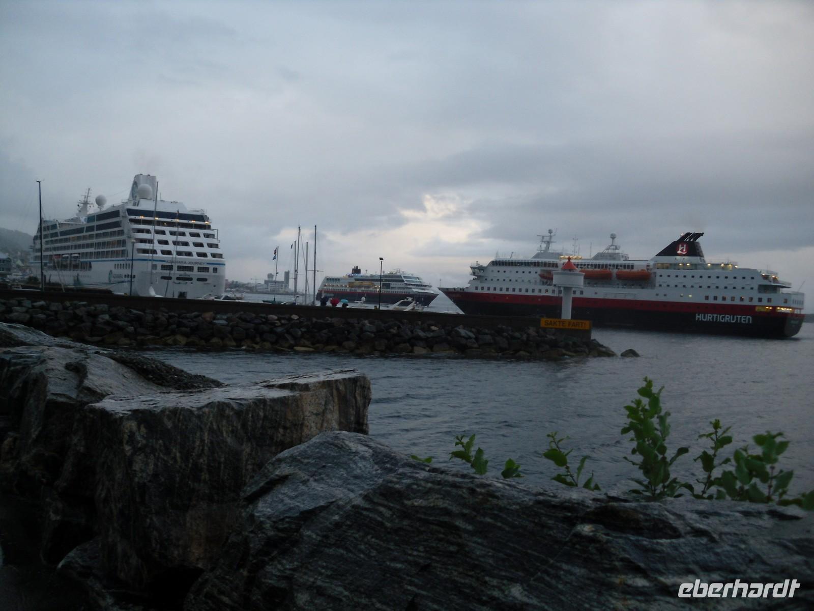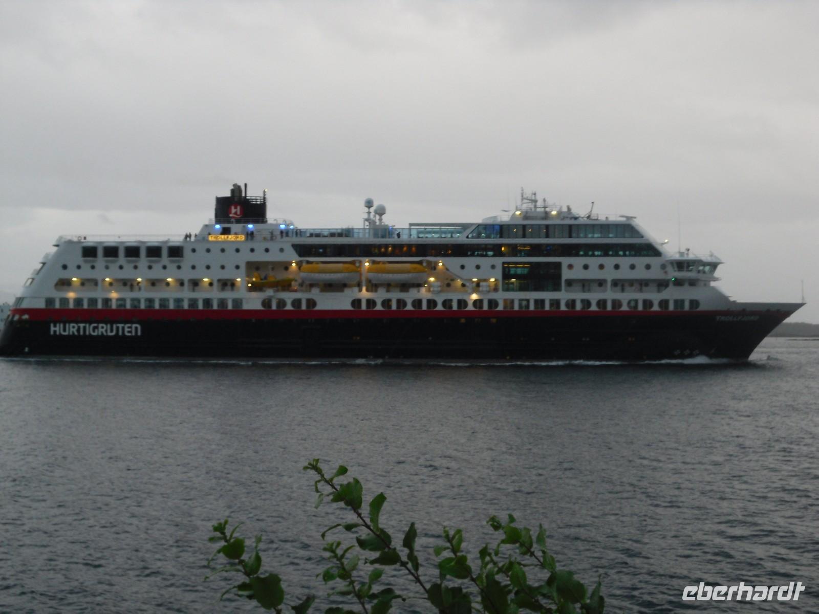 Auch heute Morgen scheint uns nicht die Sonne. Vom Hotel aus fahren wir gemeinsam zum Nidaros-Dom, er ist Skandinaviens größter und prächtigster Sakralbau, ihn besichtigen wir von außen, fotografiert wird auch das reich verzierte Hauptportal und einige Gäste gehen in den Dom. Der Nidarosdom ist ganz in der Nähe der Gamle Bybrua-die alte Stadtbrücke, von ihr hat man einen schönen Blick auf die alten Speicherhäuser am Nidelv und die weiße Festung Kristiansten. Bei Abfahrt vom Dom zum Hurtigrutenkai müssen wir schon wieder einen Regenschauer erleben. Zehn Uhr gehen wir gemeinsam an Bord der MS“ Trollfjord“ zur "Schönsten Seereise der Welt". Nun haben wir bis zum Nachmittag Zeit zum Relaxen, genießen die Atmosphäre an Bord und lassen die beeindruckenden Küsten und das weite, offene Meer an uns vorüber ziehen. Die Sonne zeigt sich kurz und der Regen dazu bringt uns einen fantastischen Regenbogen. Kühle Temperaturen und wieder kräftige Regenschauer erwarten uns im Hafen von Kristiansund, mit Kaffee und Kuchen versuchen wir uns aufzuwärmen. Schnell noch ein Foto von der Klippfischfrau und auf geht es zum nächsten Höhepunkt unserer Reise, die Fahrt auf der Atlantikstraße, mitten durch die offene See und die markante Schärenlandschaft. Die Straße führt zuerst in einen langen, neuen Tunnel unter dem Fjord entlang, dann die Atlantikstraße mit mehreren Brücken und Dämmen in einer tollen Form der Straße auf einer Länge von 8 km. Wir legen 1 Fotostopp ein und klettern dabei auch auf einen Hügel, um schöne Aussichten zu genießen und nach der Moltebeere Ausschau zu halten. Ein schönes Pflänzlein wird von den Gästen gefunden und zur Anschauung mitgebracht. Wir haben für unsere Fahrt nach Molde noch trockene Abschnitte erlebt, in das Gebiet der Romsdalsalpen können wir aber kaum sehen. Die Zimmerverteilung im Hotel ist heute etwas problematisch, das Hotel ist ausgebucht wegen des Jazz Festivals hier in Molde. Nach dem Abendessen zeigt sich der Himmel nicht gnädig und es gibt Regen in Massen. Platsch nass beenden wir heute Abend unseren Rundgang in der "Stadt der Rosen" so der Beiname von Molde, das milde Klima verlieh ihr einst den Namen. 2 Schiffe der Hurtigrute legen in Molde an, was wir direkt vom Restaurant des Hotels beobachten können.