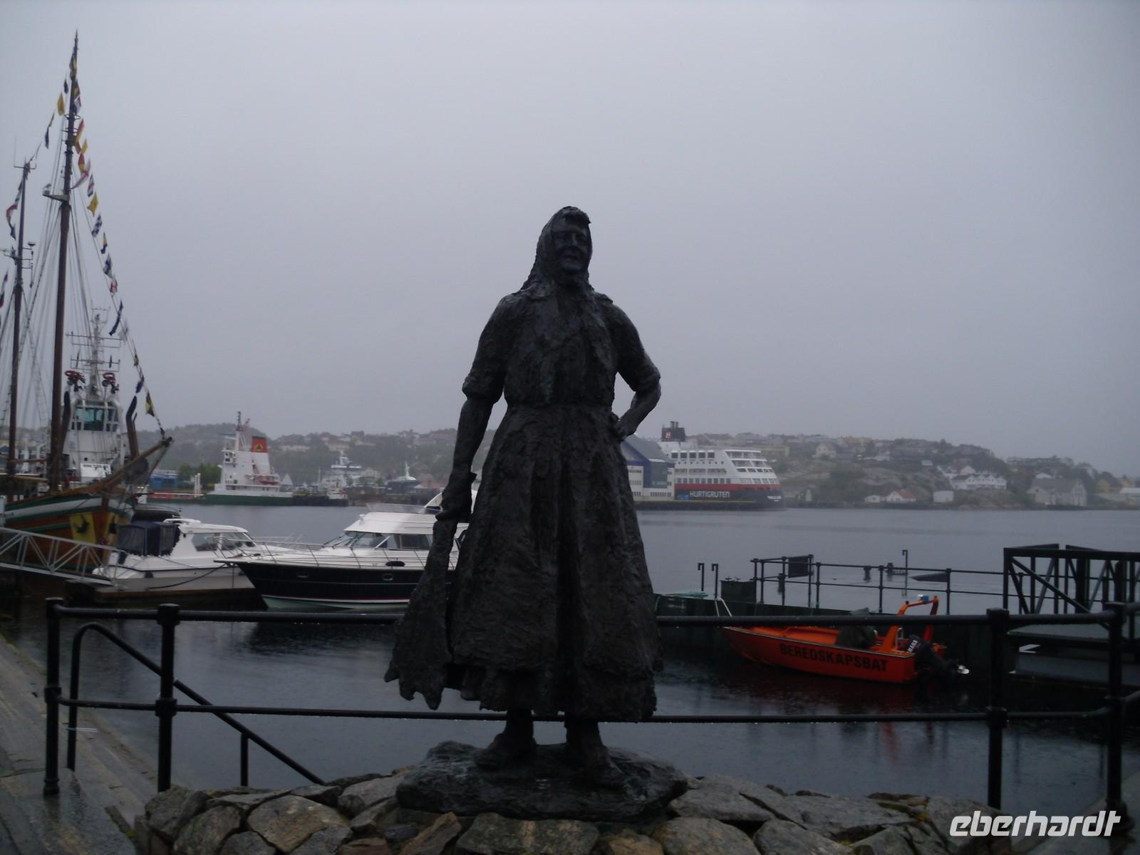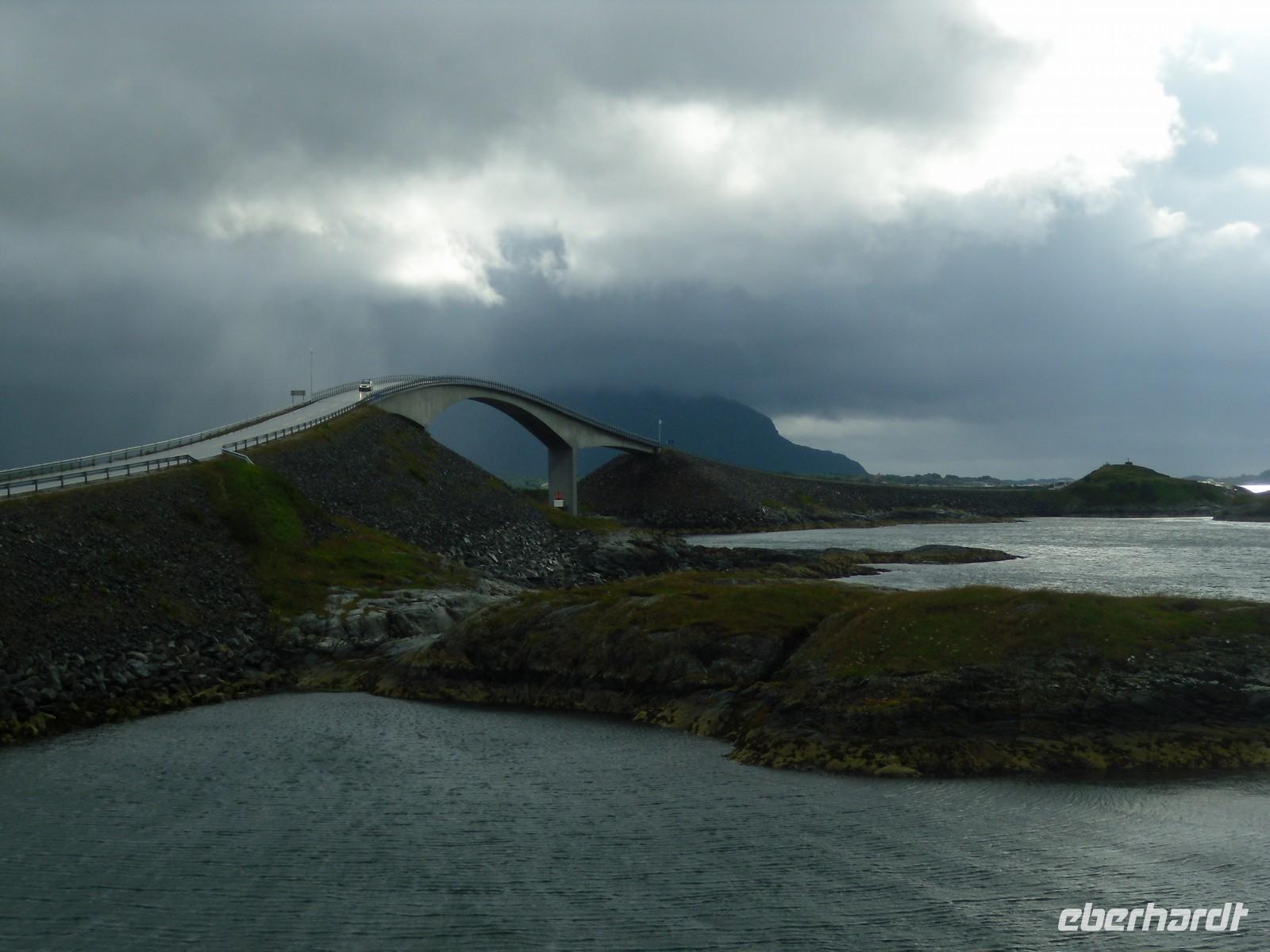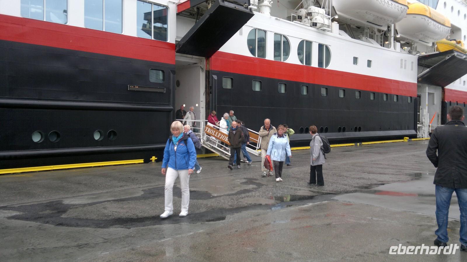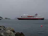 Auch heute Morgen scheint uns nicht die Sonne. Vom Hotel aus fahren wir gemeinsam zum Nidaros-Dom, er ist Skandinaviens größter und prächtigster Sakralbau, ihn besichtigen wir von außen, fotografiert wird auch das reich verzierte Hauptportal und einige Gäste gehen in den Dom. Der Nidarosdom ist ganz in der Nähe der Gamle Bybrua-die alte Stadtbrücke, von ihr hat man einen schönen Blick auf die alten Speicherhäuser am Nidelv und die weiße Festung Kristiansten. Bei Abfahrt vom Dom zum Hurtigrutenkai müssen wir schon wieder einen Regenschauer erleben. Zehn Uhr gehen wir gemeinsam an Bord der MS“ Trollfjord“ zur "Schönsten Seereise der Welt". Nun haben wir bis zum Nachmittag Zeit zum Relaxen, genießen die Atmosphäre an Bord und lassen die beeindruckenden Küsten und das weite, offene Meer an uns vorüber ziehen. Die Sonne zeigt sich kurz und der Regen dazu bringt uns einen fantastischen Regenbogen. Kühle Temperaturen und wieder kräftige Regenschauer erwarten uns im Hafen von Kristiansund, mit Kaffee und Kuchen versuchen wir uns aufzuwärmen. Schnell noch ein Foto von der Klippfischfrau und auf geht es zum nächsten Höhepunkt unserer Reise, die Fahrt auf der Atlantikstraße, mitten durch die offene See und die markante Schärenlandschaft. Die Straße führt zuerst in einen langen, neuen Tunnel unter dem Fjord entlang, dann die Atlantikstraße mit mehreren Brücken und Dämmen in einer tollen Form der Straße auf einer Länge von 8 km. Wir legen 1 Fotostopp ein und klettern dabei auch auf einen Hügel, um schöne Aussichten zu genießen und nach der Moltebeere Ausschau zu halten. Ein schönes Pflänzlein wird von den Gästen gefunden und zur Anschauung mitgebracht. Wir haben für unsere Fahrt nach Molde noch trockene Abschnitte erlebt, in das Gebiet der Romsdalsalpen können wir aber kaum sehen. Die Zimmerverteilung im Hotel ist heute etwas problematisch, das Hotel ist ausgebucht wegen des Jazz Festivals hier in Molde. Nach dem Abendessen zeigt sich der Himmel nicht gnädig und es gibt Regen in Massen. Platsch nass beenden wir heute Abend unseren Rundgang in der "Stadt der Rosen" so der Beiname von Molde, das milde Klima verlieh ihr einst den Namen. 2 Schiffe der Hurtigrute legen in Molde an, was wir direkt vom Restaurant des Hotels beobachten können.