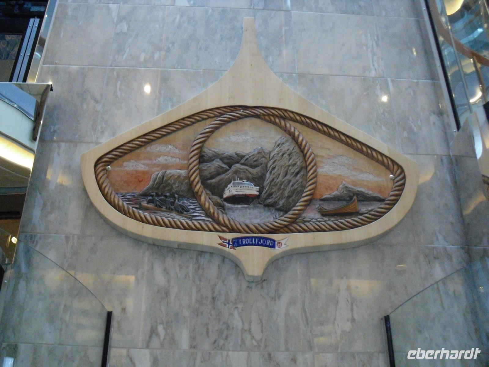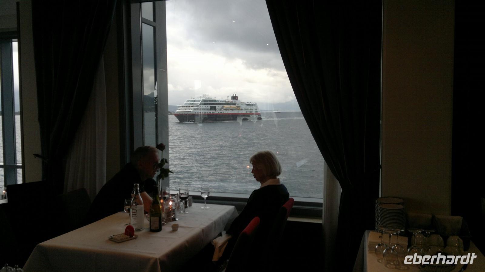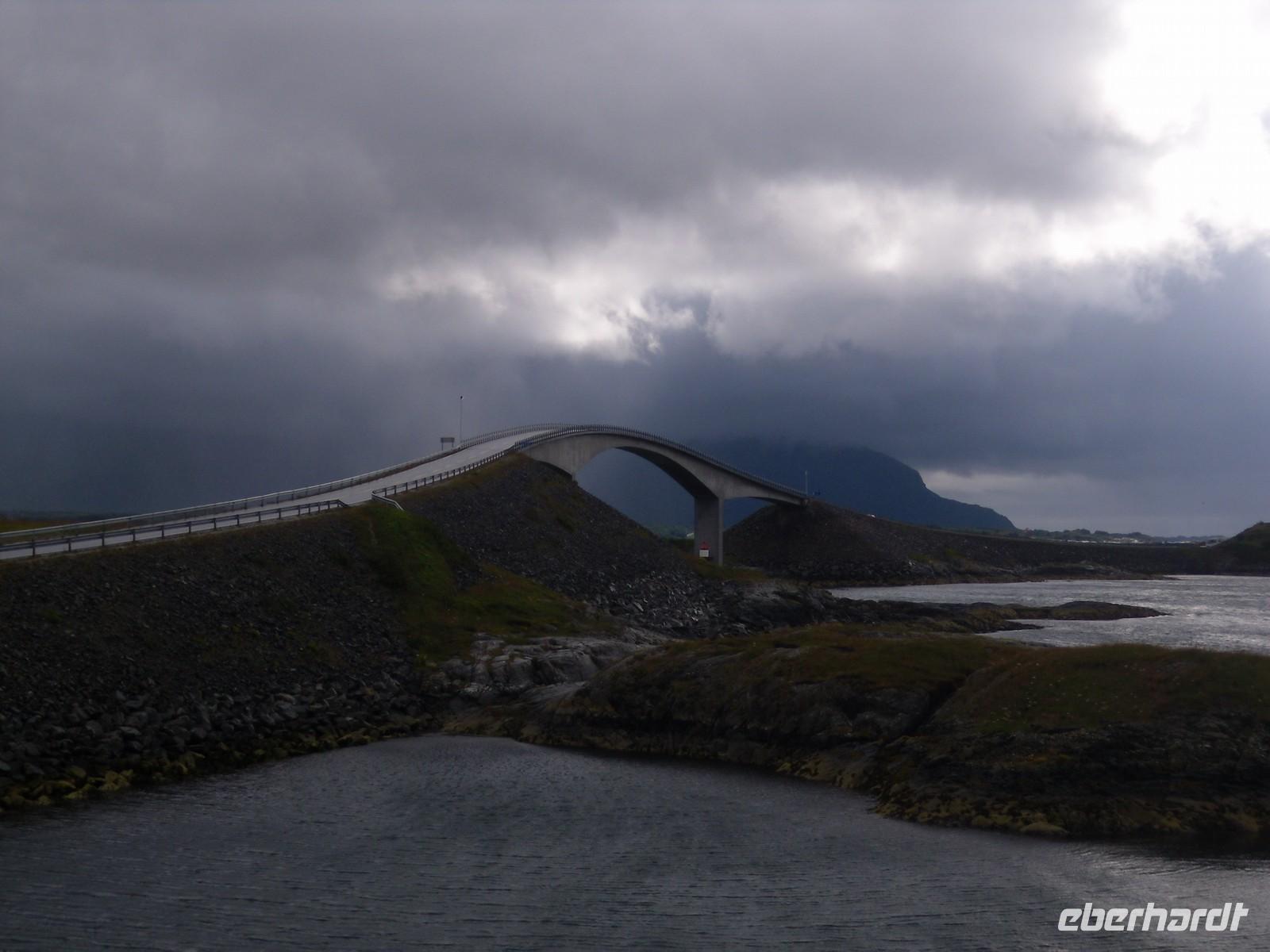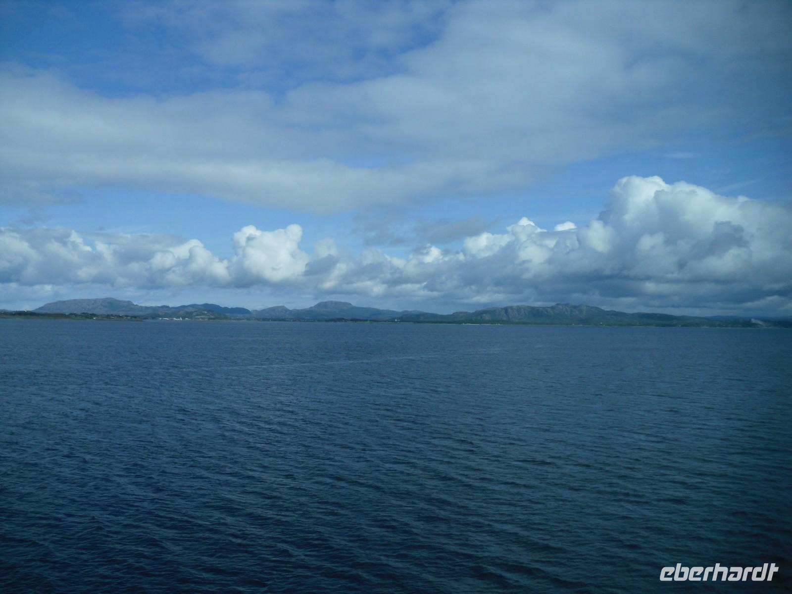 Auch heute Morgen scheint uns nicht die Sonne. Vom Hotel aus fahren wir gemeinsam zum Nidaros-Dom, er ist Skandinaviens größter und prächtigster Sakralbau, ihn besichtigen wir von außen, fotografiert wird auch das reich verzierte Hauptportal und einige Gäste gehen in den Dom. Der Nidarosdom ist ganz in der Nähe der Gamle Bybrua-die alte Stadtbrücke, von ihr hat man einen schönen Blick auf die alten Speicherhäuser am Nidelv und die weiße Festung Kristiansten. Bei Abfahrt vom Dom zum Hurtigrutenkai müssen wir schon wieder einen Regenschauer erleben. Zehn Uhr gehen wir gemeinsam an Bord der MS“ Trollfjord“ zur "Schönsten Seereise der Welt". Nun haben wir bis zum Nachmittag Zeit zum Relaxen, genießen die Atmosphäre an Bord und lassen die beeindruckenden Küsten und das weite, offene Meer an uns vorüber ziehen. Die Sonne zeigt sich kurz und der Regen dazu bringt uns einen fantastischen Regenbogen. Kühle Temperaturen und wieder kräftige Regenschauer erwarten uns im Hafen von Kristiansund, mit Kaffee und Kuchen versuchen wir uns aufzuwärmen. Schnell noch ein Foto von der Klippfischfrau und auf geht es zum nächsten Höhepunkt unserer Reise, die Fahrt auf der Atlantikstraße, mitten durch die offene See und die markante Schärenlandschaft. Die Straße führt zuerst in einen langen, neuen Tunnel unter dem Fjord entlang, dann die Atlantikstraße mit mehreren Brücken und Dämmen in einer tollen Form der Straße auf einer Länge von 8 km. Wir legen 1 Fotostopp ein und klettern dabei auch auf einen Hügel, um schöne Aussichten zu genießen und nach der Moltebeere Ausschau zu halten. Ein schönes Pflänzlein wird von den Gästen gefunden und zur Anschauung mitgebracht. Wir haben für unsere Fahrt nach Molde noch trockene Abschnitte erlebt, in das Gebiet der Romsdalsalpen können wir aber kaum sehen. Die Zimmerverteilung im Hotel ist heute etwas problematisch, das Hotel ist ausgebucht wegen des Jazz Festivals hier in Molde. Nach dem Abendessen zeigt sich der Himmel nicht gnädig und es gibt Regen in Massen. Platsch nass beenden wir heute Abend unseren Rundgang in der "Stadt der Rosen" so der Beiname von Molde, das milde Klima verlieh ihr einst den Namen. 2 Schiffe der Hurtigrute legen in Molde an, was wir direkt vom Restaurant des Hotels beobachten können.