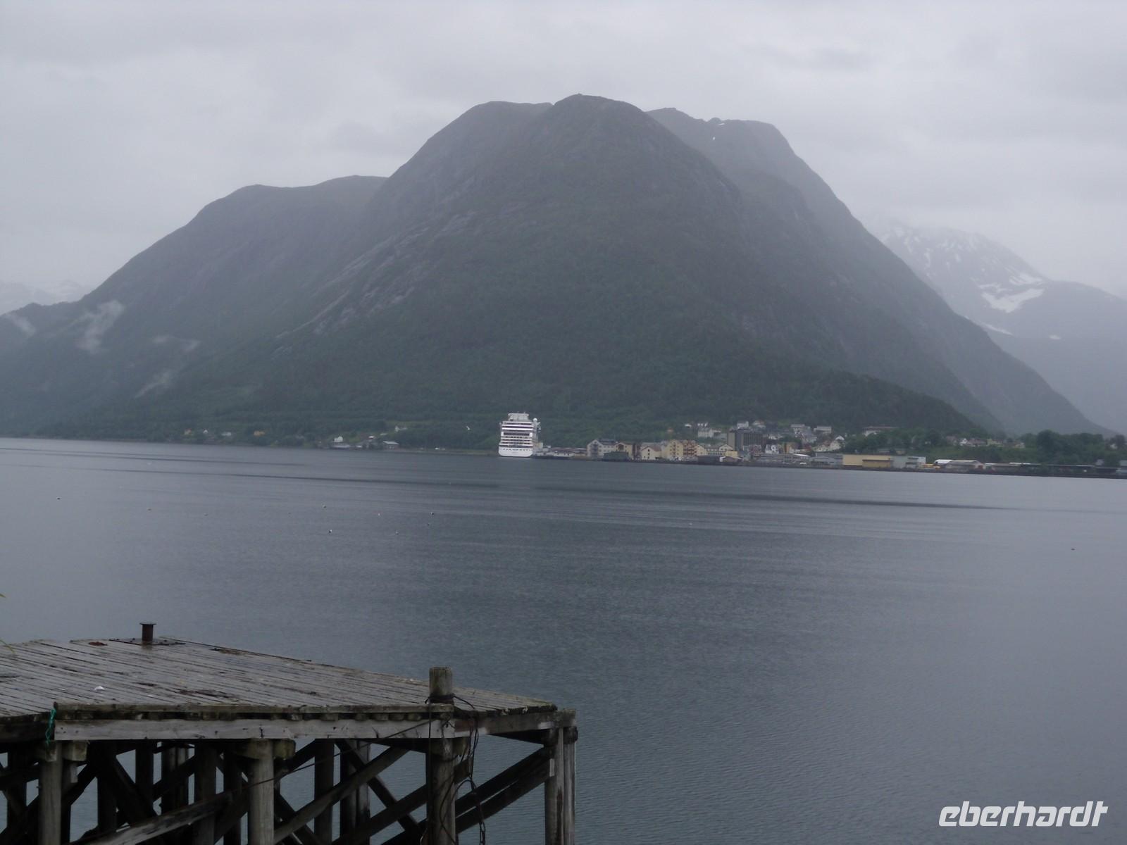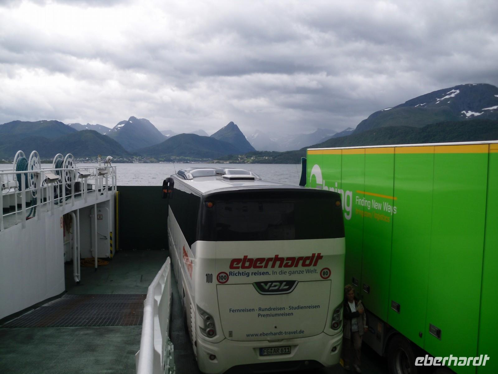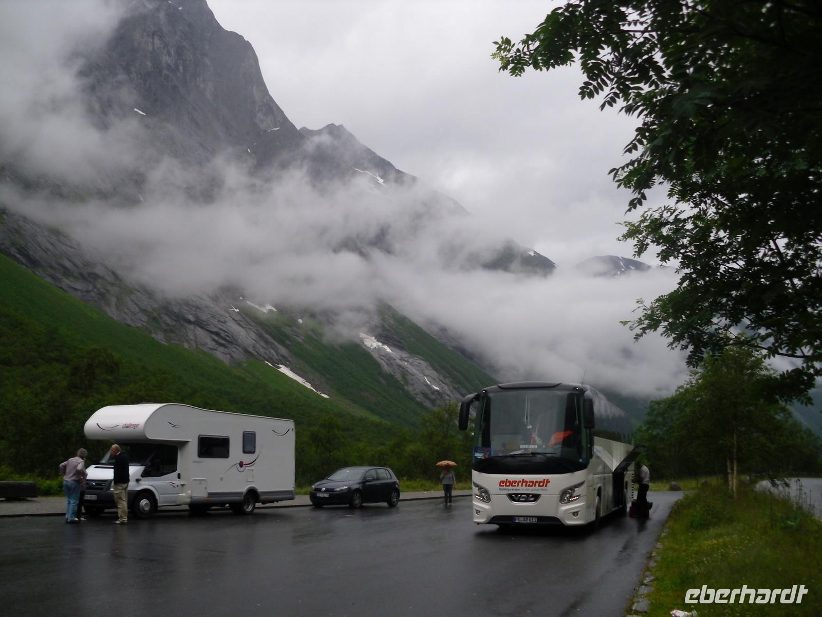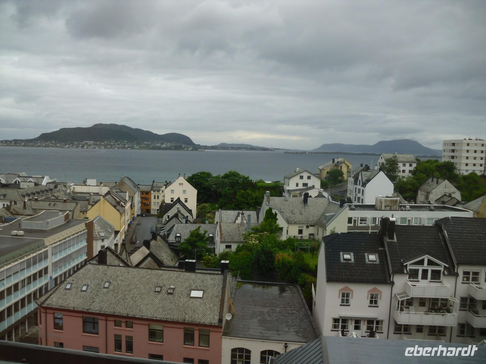 Nach einem vorzüglichen Sonntagsfrühstück und wieder Regen verstauen wir unsere Koffer im Bus und fahren zunächst hinauf auf den Varden, der Hausberg von Molde. Uns ist heute auch wieder kein schönes Wetter vergönnt und so müssen wir ohne Ausblick den Aussichtspunkt verlassen. Am heutigen Tag haben wir auch eine kurze Fährüberfahrt von Sølsnes nach Afarnes, ein ganz neues Erlebnis für unsere Reisegäste. Das Erklimmen der "Trollstigen" ist unser nächster Höhepunkt. Vorbei an Andalsnes, hier ist der Endpunkt der Raumabahn, sie soll eine der schönsten Eisenbahnstrecken Norwegens sein, gelangen wir zur Trollwand und hier wird bei Regen ein Fotostopp eingelegt. Danach machen wir uns auf den Weg, die von hohen Gipfeln und tiefen Schluchten umgebene Bergstraße Trollstiege, die ihren Namen von der Volkssage um die dort "hausenden Trolle" erhalten hat, zu erkunden. Die 11 Haarnadelkurven überwinden wir mit Hochachtung vor der Fahrkunst unseres Fahrers Peter Möbius, leider ist wieder Laufen im Regen angesagt. Am Canyon Gudbrandsjuvet machen wir einen Fotostopp. Weiter geht es hinunter ins romantische Valldal, das Zentrum des Erdbeeranbaus und hier kaufen wir uns köstliche Erdbeeren direkt vom Erzeuger. Wir kommen an den großartigen Tafjord, der ein Seitenarm des Storfjordes ist. Fjorde sind das gewisse Etwas in Skandinavien, was aber zeichnet dieses Gewässer aus? Ein Fjord ist ein Berg und ein Fluss, die sich in einer viele tausend Jahre zurückliegenden Eiszeit miteinander verbunden haben. Auf unserer Strecke liegen die Fjordhauptstadt Bergen, der Sognefjord und der Nordfjord inmitten von Gletschern. In Stordal besichtigen wir die herrliche Rosenkirche, ein schönes Erlebnis des heutigen Tages. Unsere Ankunft in Alesund bekommen wir nicht trocken hin, hoffentlich scheint uns am Montag die Sonne. Am Abend erschließt sich der Ein oder Andere diese Stadt im Jugendstil, die 1904 bei einem großen Brand fast völlig zerstört wurde und auch wieder im Regen.