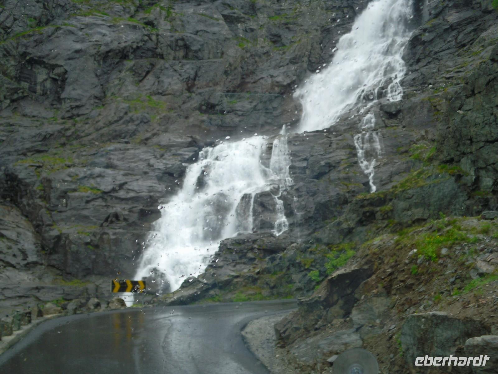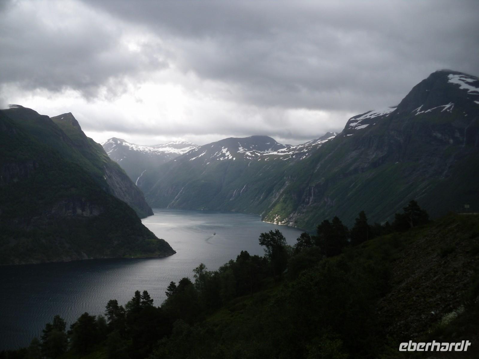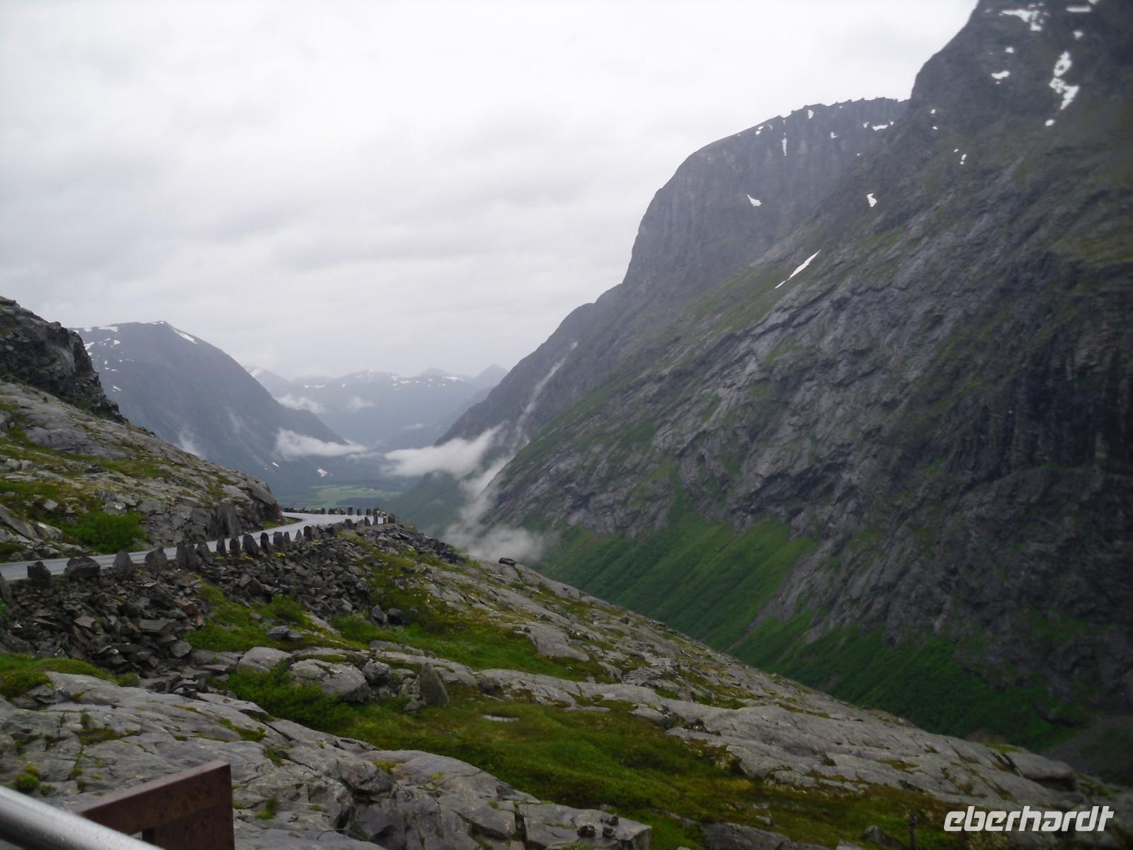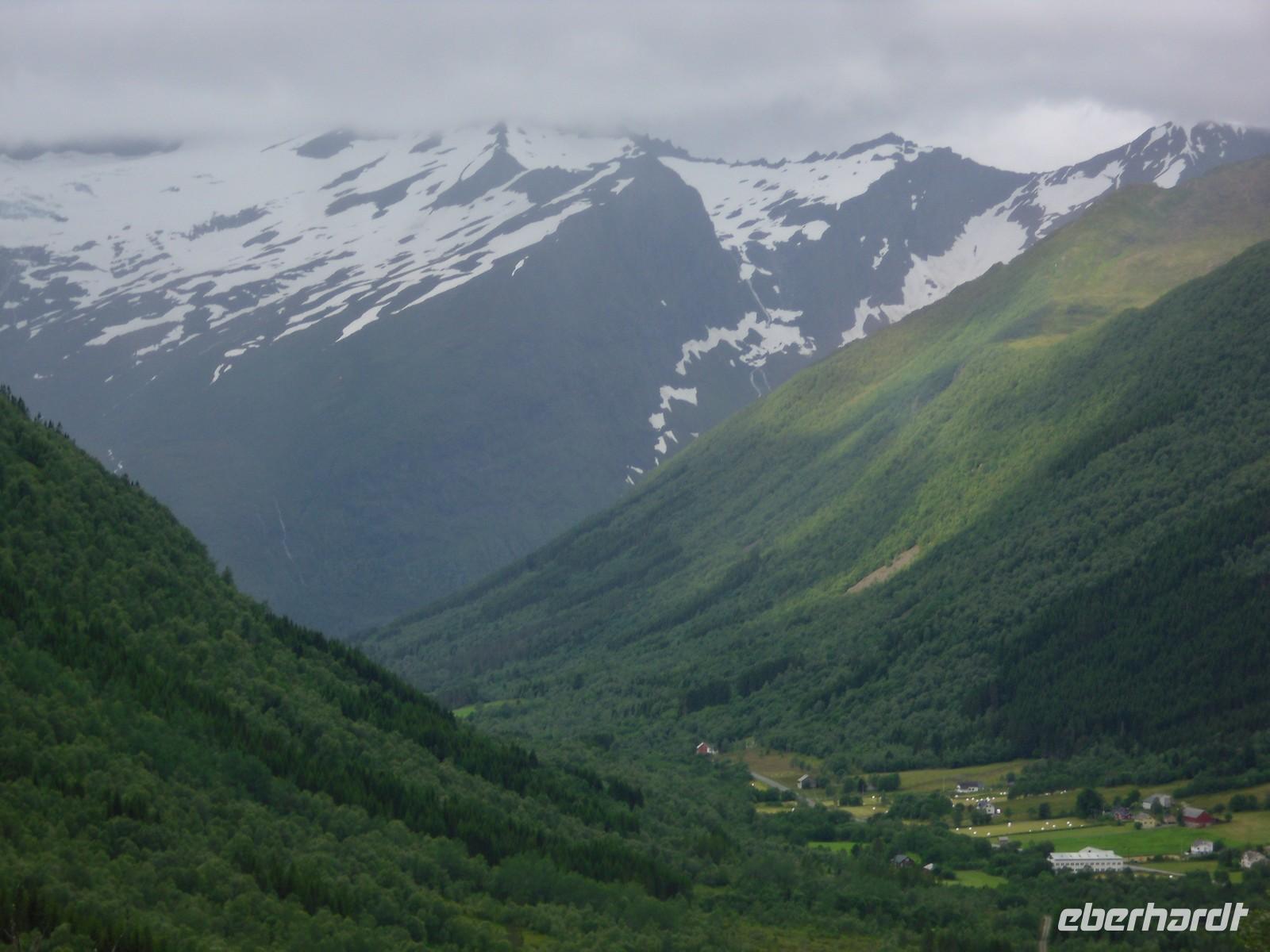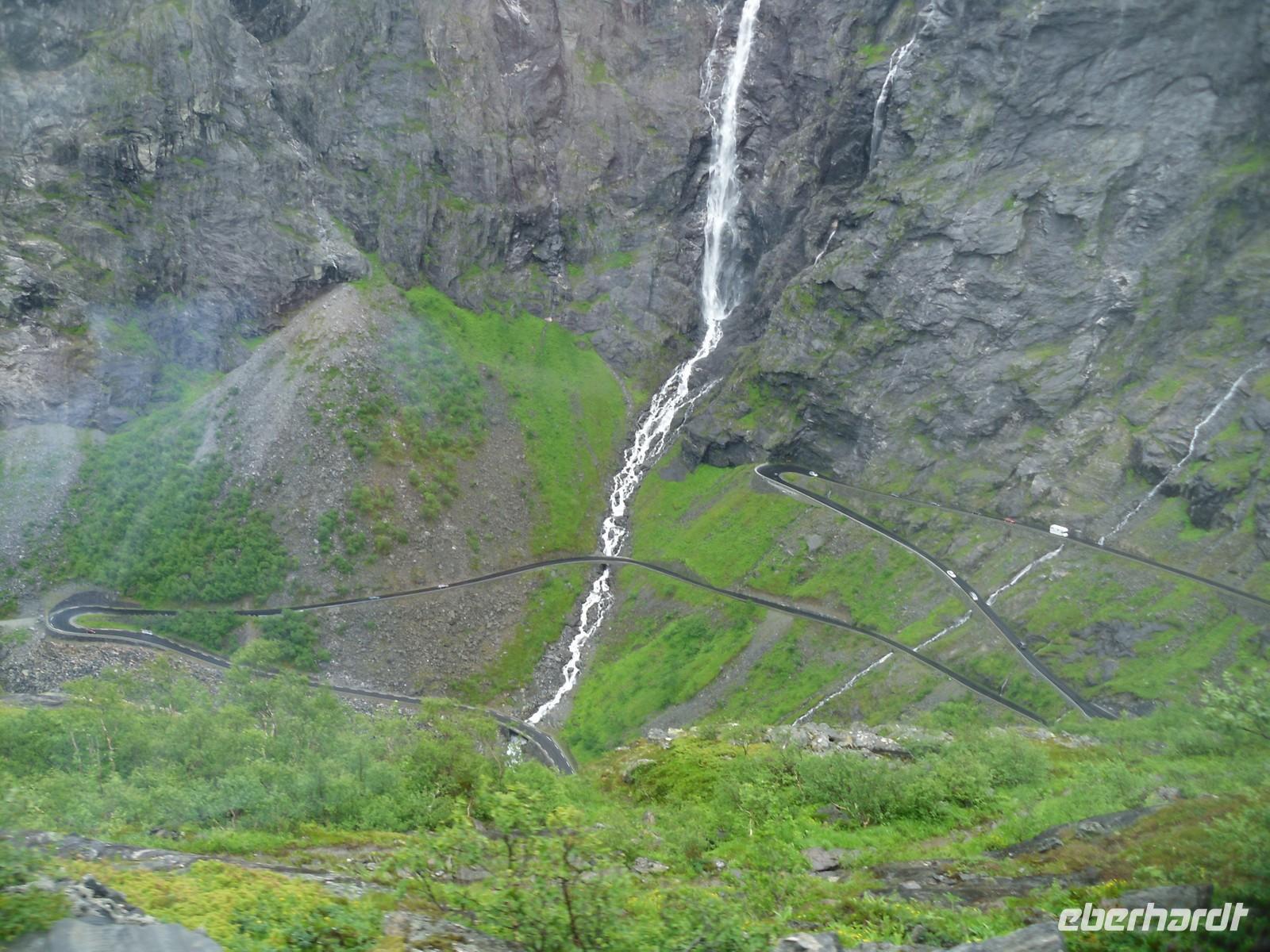 Nach einem vorzüglichen Sonntagsfrühstück und wieder Regen verstauen wir unsere Koffer im Bus und fahren zunächst hinauf auf den Varden, der Hausberg von Molde. Uns ist heute auch wieder kein schönes Wetter vergönnt und so müssen wir ohne Ausblick den Aussichtspunkt verlassen. Am heutigen Tag haben wir auch eine kurze Fährüberfahrt von Sølsnes nach Afarnes, ein ganz neues Erlebnis für unsere Reisegäste. Das Erklimmen der "Trollstigen" ist unser nächster Höhepunkt. Vorbei an Andalsnes, hier ist der Endpunkt der Raumabahn, sie soll eine der schönsten Eisenbahnstrecken Norwegens sein, gelangen wir zur Trollwand und hier wird bei Regen ein Fotostopp eingelegt. Danach machen wir uns auf den Weg, die von hohen Gipfeln und tiefen Schluchten umgebene Bergstraße Trollstiege, die ihren Namen von der Volkssage um die dort "hausenden Trolle" erhalten hat, zu erkunden. Die 11 Haarnadelkurven überwinden wir mit Hochachtung vor der Fahrkunst unseres Fahrers Peter Möbius, leider ist wieder Laufen im Regen angesagt. Am Canyon Gudbrandsjuvet machen wir einen Fotostopp. Weiter geht es hinunter ins romantische Valldal, das Zentrum des Erdbeeranbaus und hier kaufen wir uns köstliche Erdbeeren direkt vom Erzeuger. Wir kommen an den großartigen Tafjord, der ein Seitenarm des Storfjordes ist. Fjorde sind das gewisse Etwas in Skandinavien, was aber zeichnet dieses Gewässer aus? Ein Fjord ist ein Berg und ein Fluss, die sich in einer viele tausend Jahre zurückliegenden Eiszeit miteinander verbunden haben. Auf unserer Strecke liegen die Fjordhauptstadt Bergen, der Sognefjord und der Nordfjord inmitten von Gletschern. In Stordal besichtigen wir die herrliche Rosenkirche, ein schönes Erlebnis des heutigen Tages. Unsere Ankunft in Alesund bekommen wir nicht trocken hin, hoffentlich scheint uns am Montag die Sonne. Am Abend erschließt sich der Ein oder Andere diese Stadt im Jugendstil, die 1904 bei einem großen Brand fast völlig zerstört wurde und auch wieder im Regen.