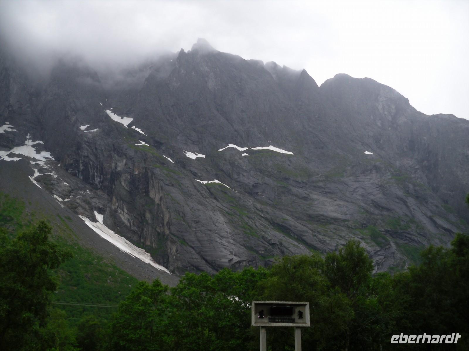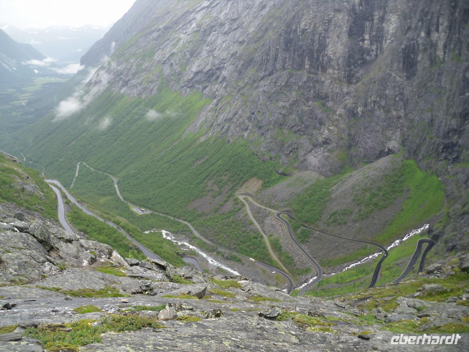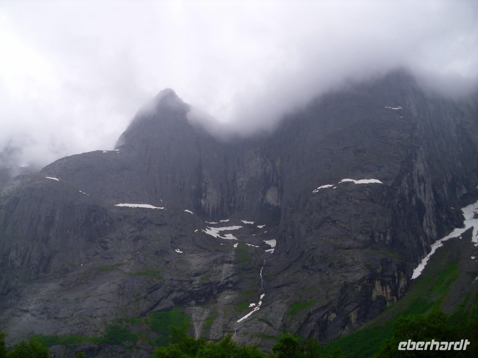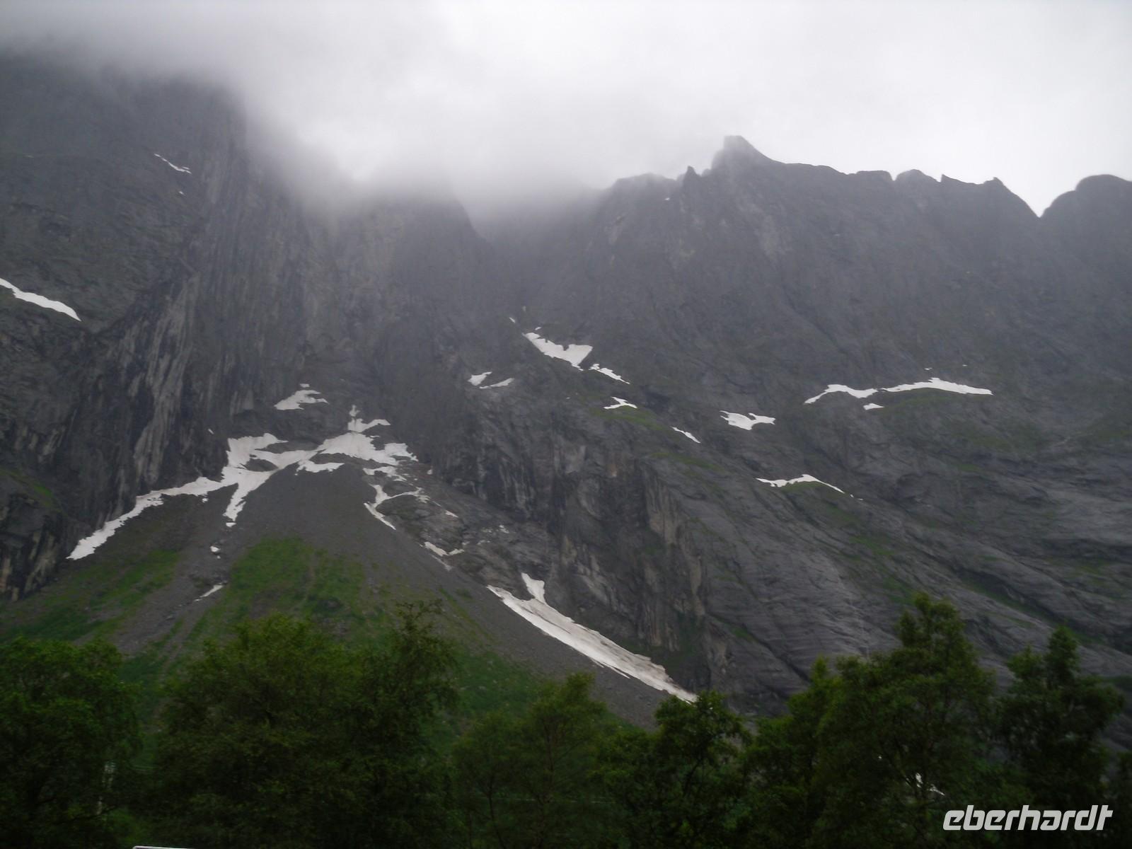 Nach einem vorzüglichen Sonntagsfrühstück und wieder Regen verstauen wir unsere Koffer im Bus und fahren zunächst hinauf auf den Varden, der Hausberg von Molde. Uns ist heute auch wieder kein schönes Wetter vergönnt und so müssen wir ohne Ausblick den Aussichtspunkt verlassen. Am heutigen Tag haben wir auch eine kurze Fährüberfahrt von Sølsnes nach Afarnes, ein ganz neues Erlebnis für unsere Reisegäste. Das Erklimmen der "Trollstigen" ist unser nächster Höhepunkt. Vorbei an Andalsnes, hier ist der Endpunkt der Raumabahn, sie soll eine der schönsten Eisenbahnstrecken Norwegens sein, gelangen wir zur Trollwand und hier wird bei Regen ein Fotostopp eingelegt. Danach machen wir uns auf den Weg, die von hohen Gipfeln und tiefen Schluchten umgebene Bergstraße Trollstiege, die ihren Namen von der Volkssage um die dort "hausenden Trolle" erhalten hat, zu erkunden. Die 11 Haarnadelkurven überwinden wir mit Hochachtung vor der Fahrkunst unseres Fahrers Peter Möbius, leider ist wieder Laufen im Regen angesagt. Am Canyon Gudbrandsjuvet machen wir einen Fotostopp. Weiter geht es hinunter ins romantische Valldal, das Zentrum des Erdbeeranbaus und hier kaufen wir uns köstliche Erdbeeren direkt vom Erzeuger. Wir kommen an den großartigen Tafjord, der ein Seitenarm des Storfjordes ist. Fjorde sind das gewisse Etwas in Skandinavien, was aber zeichnet dieses Gewässer aus? Ein Fjord ist ein Berg und ein Fluss, die sich in einer viele tausend Jahre zurückliegenden Eiszeit miteinander verbunden haben. Auf unserer Strecke liegen die Fjordhauptstadt Bergen, der Sognefjord und der Nordfjord inmitten von Gletschern. In Stordal besichtigen wir die herrliche Rosenkirche, ein schönes Erlebnis des heutigen Tages. Unsere Ankunft in Alesund bekommen wir nicht trocken hin, hoffentlich scheint uns am Montag die Sonne. Am Abend erschließt sich der Ein oder Andere diese Stadt im Jugendstil, die 1904 bei einem großen Brand fast völlig zerstört wurde und auch wieder im Regen.