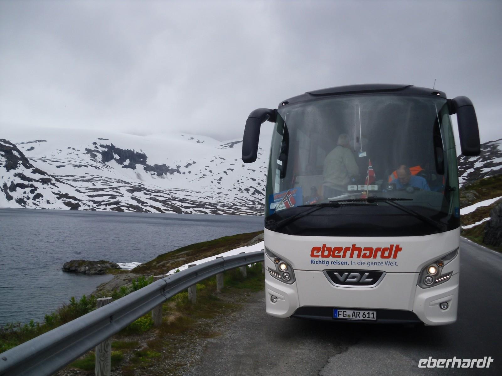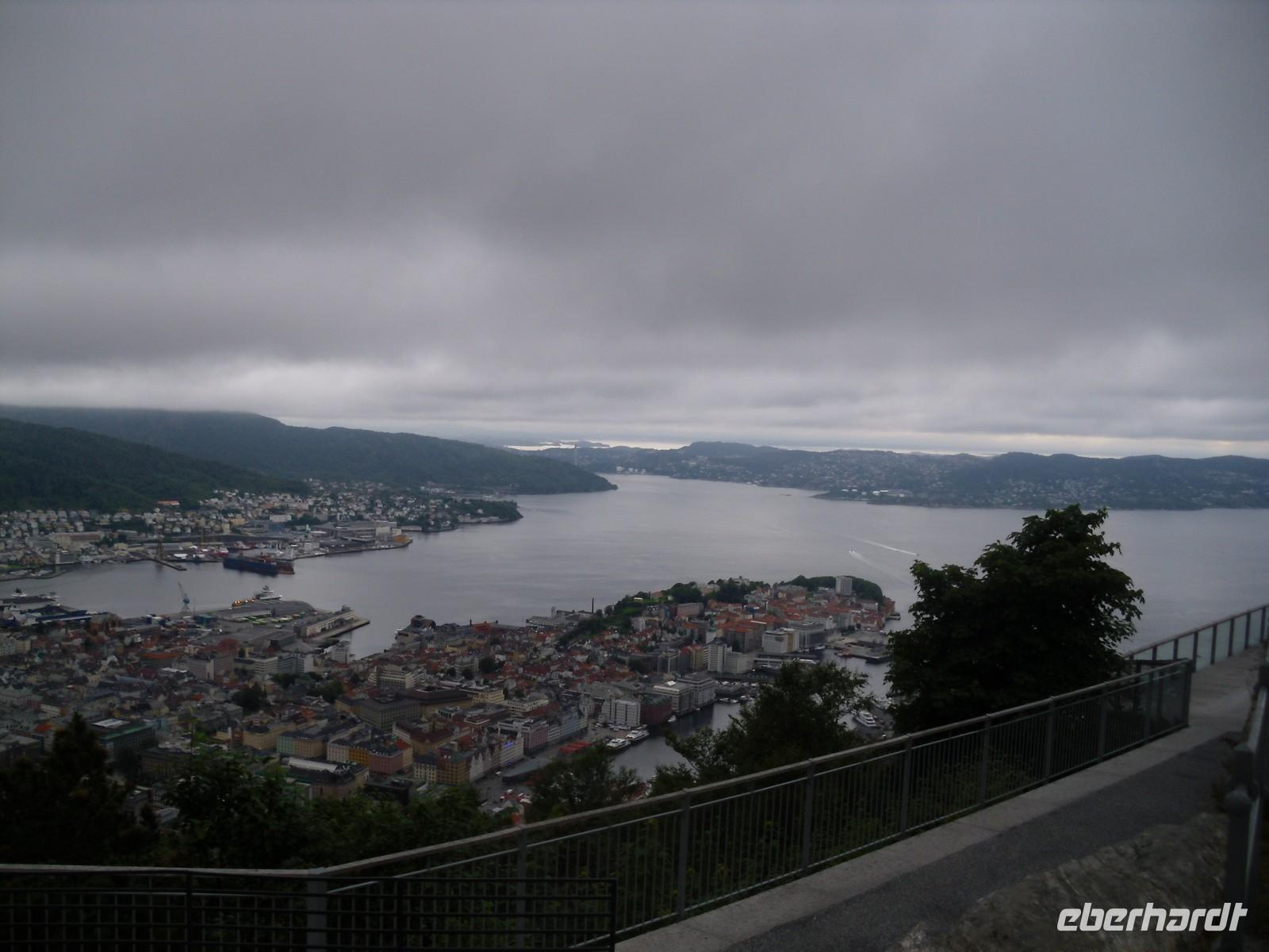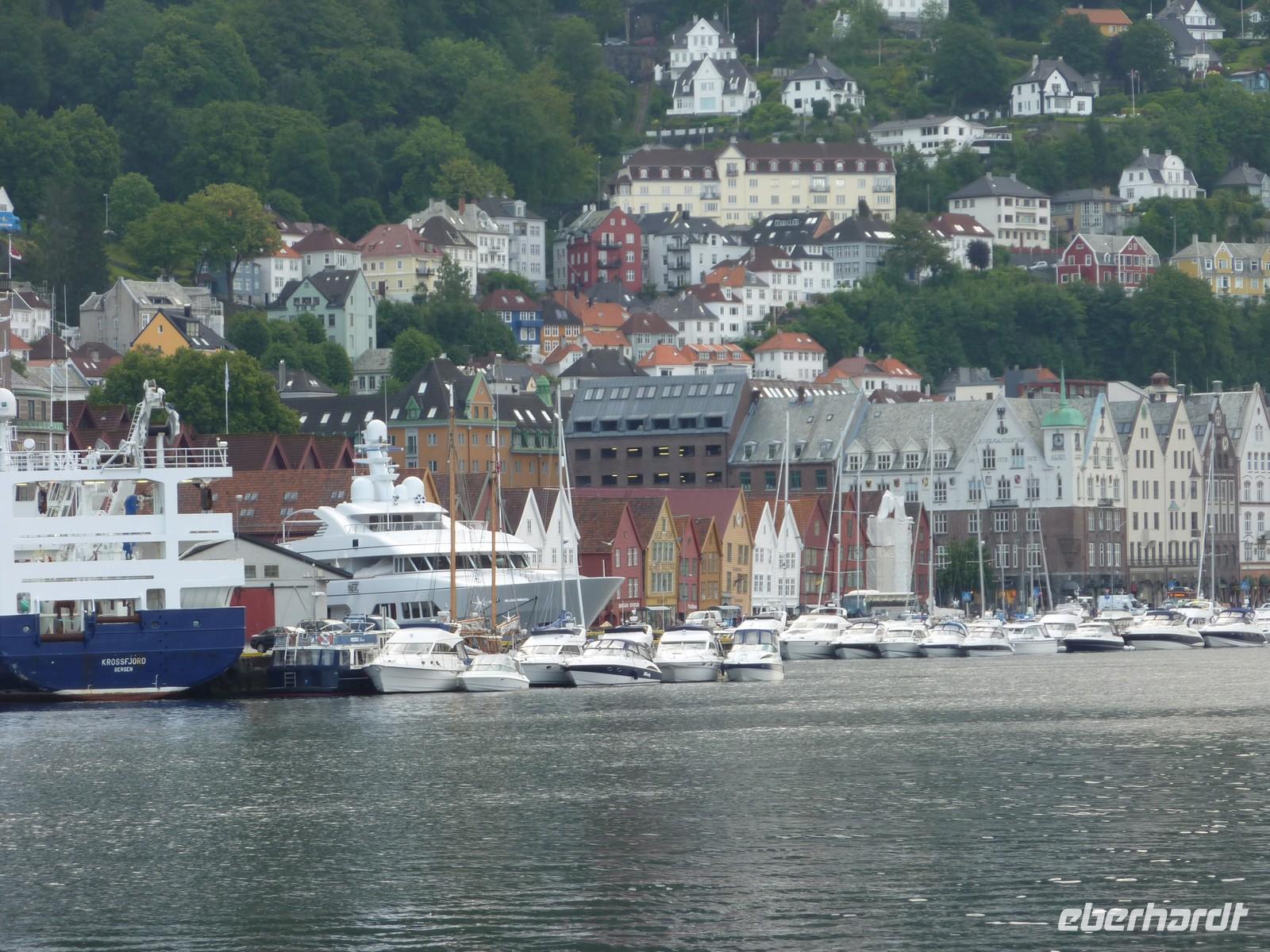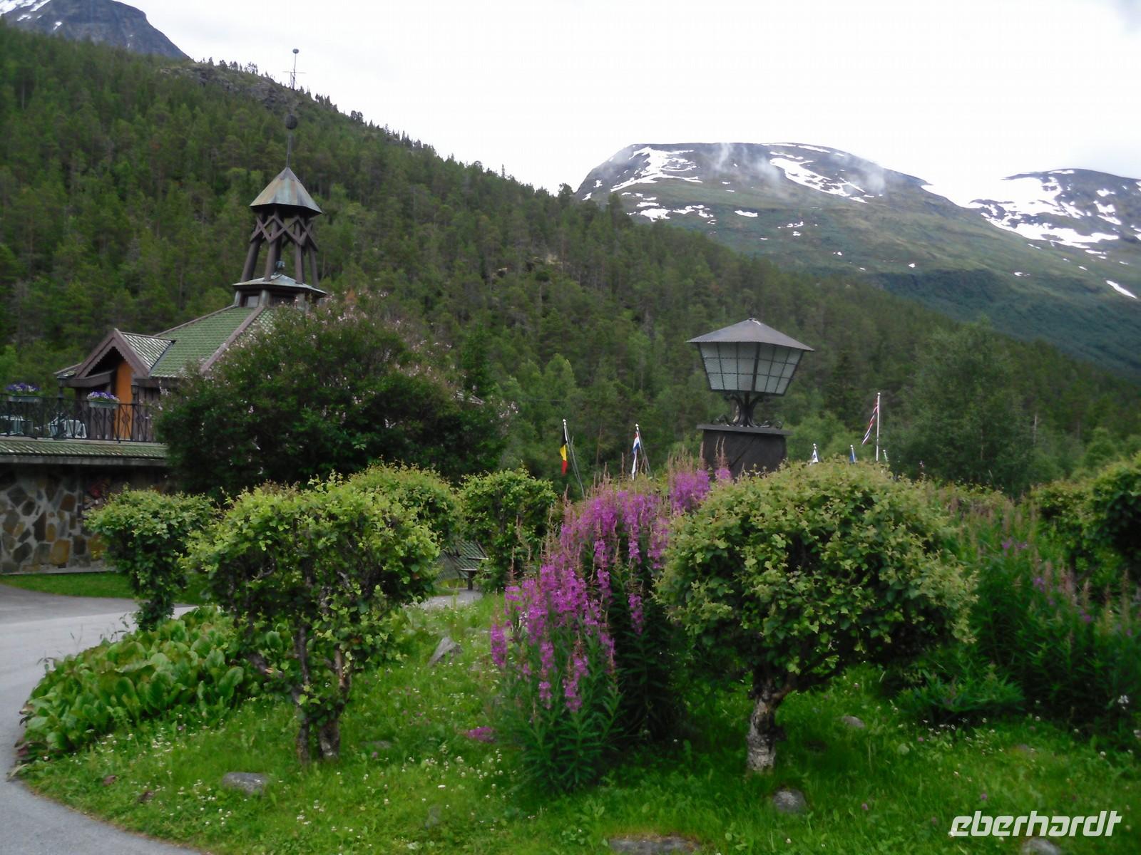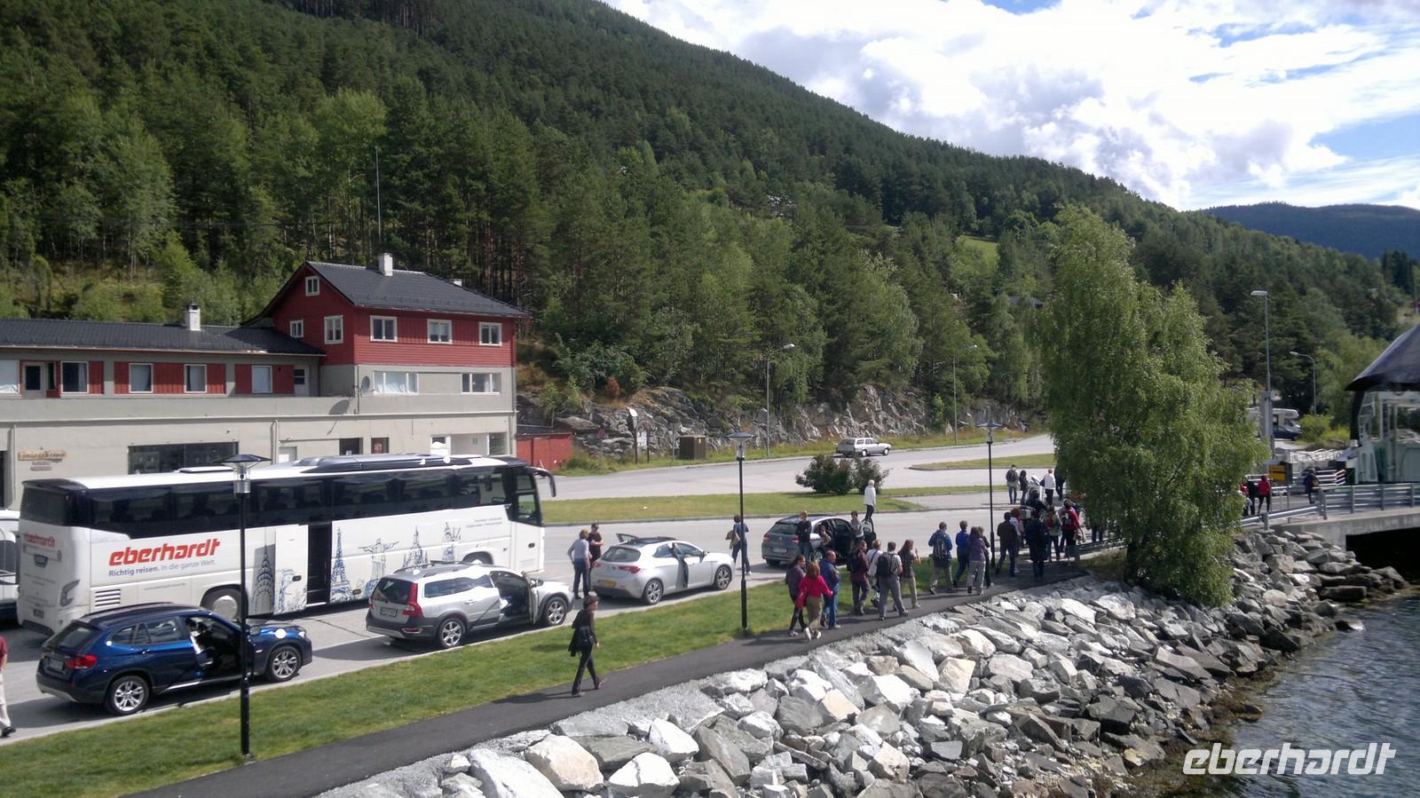 Nach einem guten Frühstück geht es für uns auf dem Sognefjellveggen bis hinauf auf über 1400 Meter. Auch heute steht wieder ein tolles Reiseprogramm auf unserem Plan. Der Nationalpark Jotunheimen besteht schon seit 1980 und er ist Heimat der 2 höchsten Gipfel Norwegens-der Galdhöpiggen mit 2468m und der Glittertind mit 2452m. Über das raue Sognefjell, das in Wolken gehüllt ist und hier blicken wir ein wenig Schnee und bei unseren Fotostopps unterwegs sehen wir heute endlich die Sonne. Wir gelangen in Kaupanger an den Sognefjord. Er ist mit 204 km Länge auch der am Längsten und Tiefsten in das Festland hineingehende Fjord der Welt. Wir krönen den Nachmittag mit einer Kreuzfahrt im Auerlands- und Nærøyfjord, sie sind Arme des königlichen Sognefjordes, in ihn fahren wir als Erstes hinein. Mit Bildern von steilen Berghängen und kleinen Bauernhöfen, die wie Adlernester auf dem Felsplateau liegen. Wir gehen in Gudvangen von Bord und dann sehen wir mit Ehrfurcht auf die Stahlheimstrasse. Einen Fotostopp legen wir am fantastischen Wasserfall Tvindefossen ein, hier gibt es für alle Gäste Molteberrmarmelade, Elch-und Rentiersalami zum Kosten. Der Chef der Anlage versteht unsere Aktion falsch und bittet uns abzufahren. Am Abend erreichen wir Bergen, gelegen auf mehreren Inseln und gerahmt von 7 Bergen. Bei Einfahrt in Bergen sehen wir Menschenmassen in Schlange anstehen und auf Nachfrage erfahren wir, dass Bruce Springsteen ein Konzert am Abend gibt. Nach dem Abendessen fahren viele Gäste noch zum Fløyen mit mir hinauf, er hüllt sich nicht in Wolken und bietet somit einen herrlichen Blick hinunter auf die Stadt und die Schärenwelt. Musik vom Konzert klingt bis zum Aussichtsberg herauf.