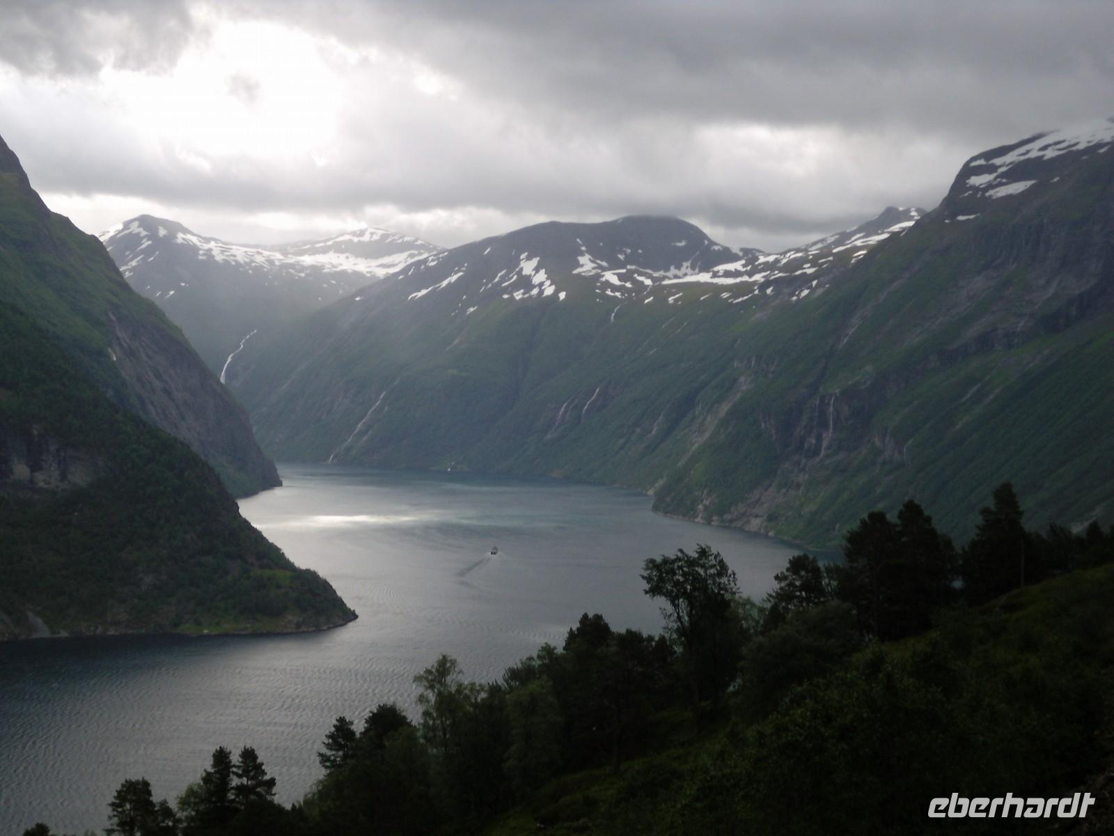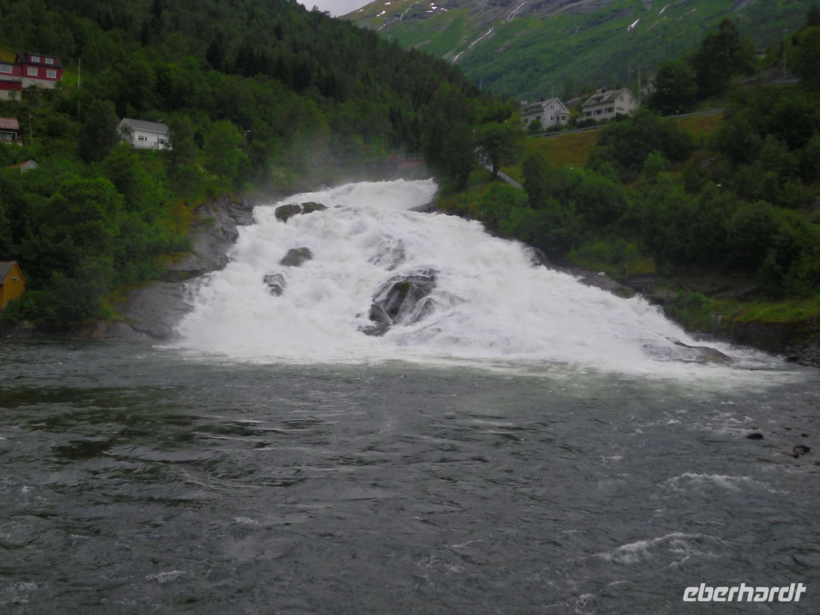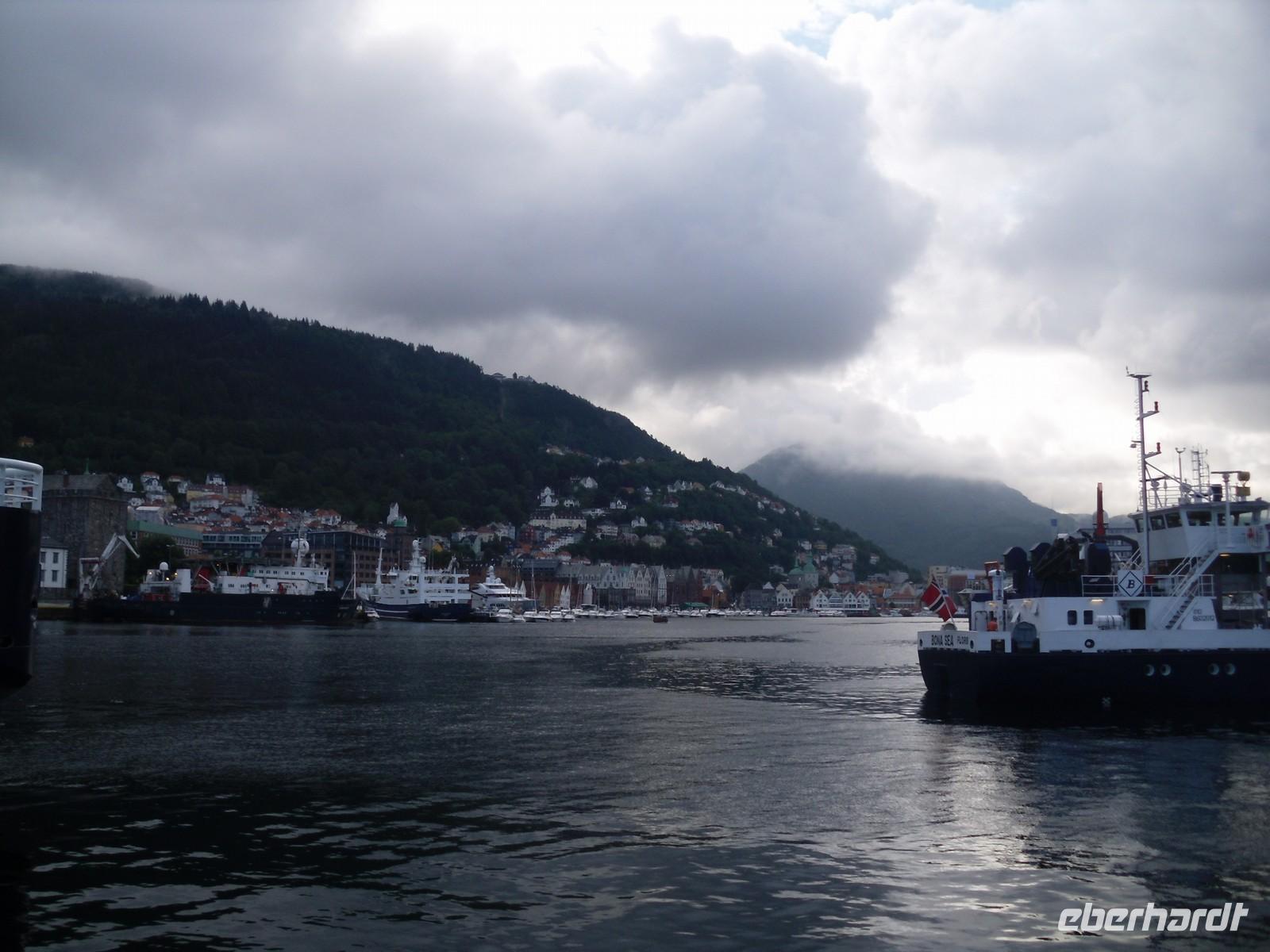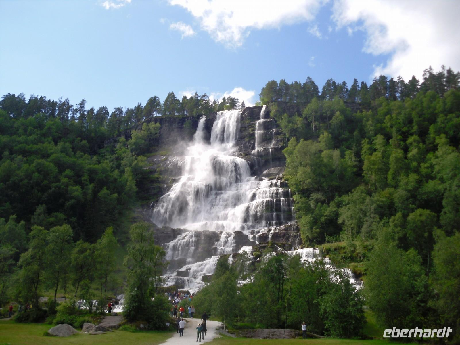 Nach einem guten Frühstück geht es für uns auf dem Sognefjellveggen bis hinauf auf über 1400 Meter. Auch heute steht wieder ein tolles Reiseprogramm auf unserem Plan. Der Nationalpark Jotunheimen besteht schon seit 1980 und er ist Heimat der 2 höchsten Gipfel Norwegens-der Galdhöpiggen mit 2468m und der Glittertind mit 2452m. Über das raue Sognefjell, das in Wolken gehüllt ist und hier blicken wir ein wenig Schnee und bei unseren Fotostopps unterwegs sehen wir heute endlich die Sonne. Wir gelangen in Kaupanger an den Sognefjord. Er ist mit 204 km Länge auch der am Längsten und Tiefsten in das Festland hineingehende Fjord der Welt. Wir krönen den Nachmittag mit einer Kreuzfahrt im Auerlands- und Nærøyfjord, sie sind Arme des königlichen Sognefjordes, in ihn fahren wir als Erstes hinein. Mit Bildern von steilen Berghängen und kleinen Bauernhöfen, die wie Adlernester auf dem Felsplateau liegen. Wir gehen in Gudvangen von Bord und dann sehen wir mit Ehrfurcht auf die Stahlheimstrasse. Einen Fotostopp legen wir am fantastischen Wasserfall Tvindefossen ein, hier gibt es für alle Gäste Molteberrmarmelade, Elch-und Rentiersalami zum Kosten. Der Chef der Anlage versteht unsere Aktion falsch und bittet uns abzufahren. Am Abend erreichen wir Bergen, gelegen auf mehreren Inseln und gerahmt von 7 Bergen. Bei Einfahrt in Bergen sehen wir Menschenmassen in Schlange anstehen und auf Nachfrage erfahren wir, dass Bruce Springsteen ein Konzert am Abend gibt. Nach dem Abendessen fahren viele Gäste noch zum Fløyen mit mir hinauf, er hüllt sich nicht in Wolken und bietet somit einen herrlichen Blick hinunter auf die Stadt und die Schärenwelt. Musik vom Konzert klingt bis zum Aussichtsberg herauf.