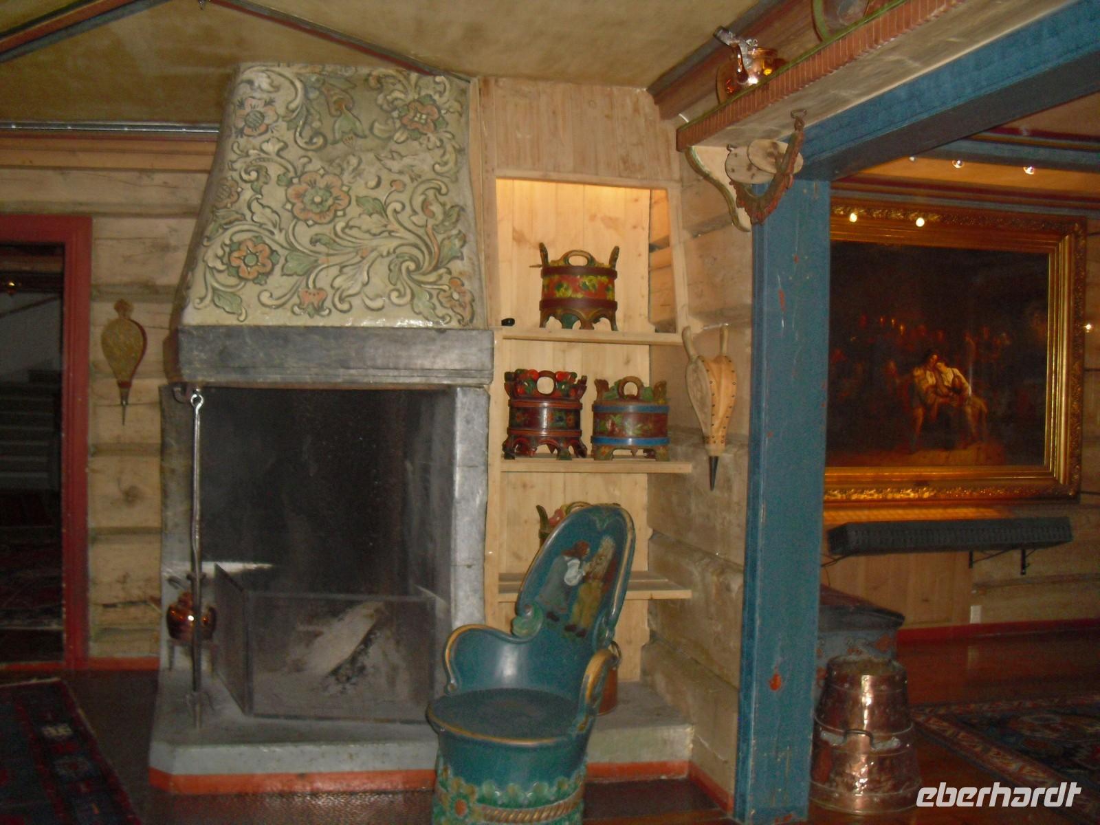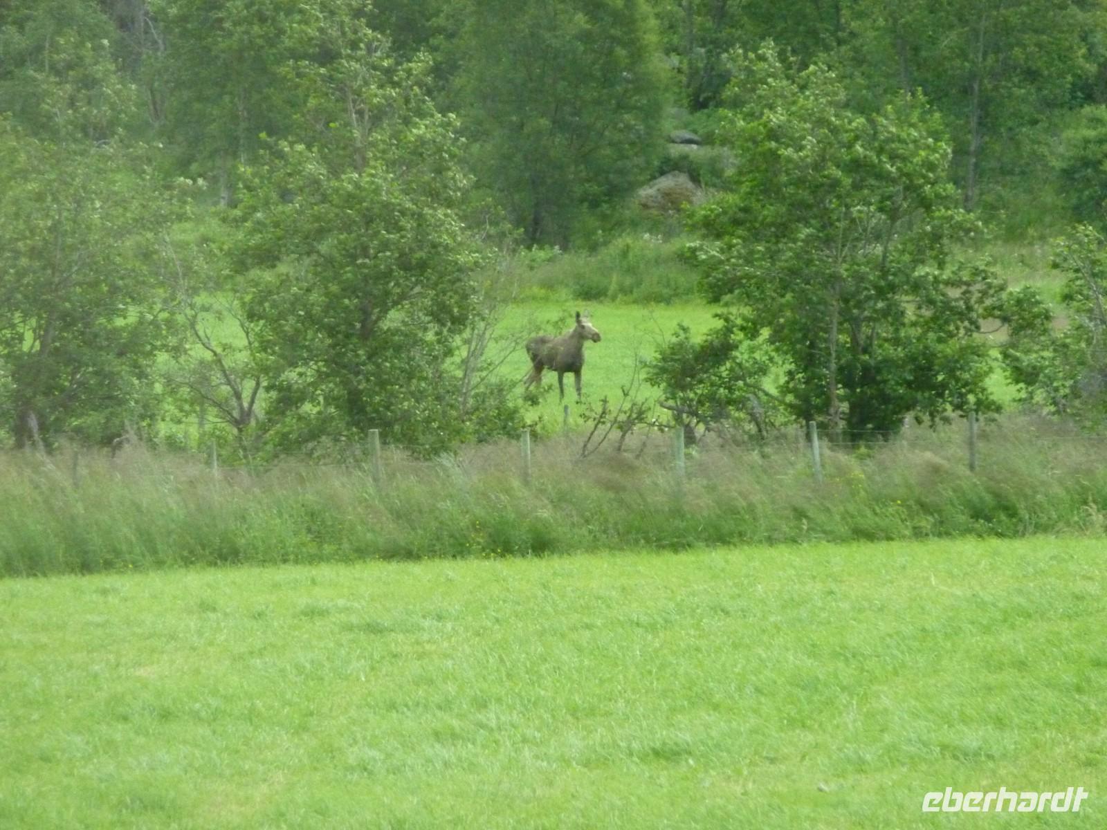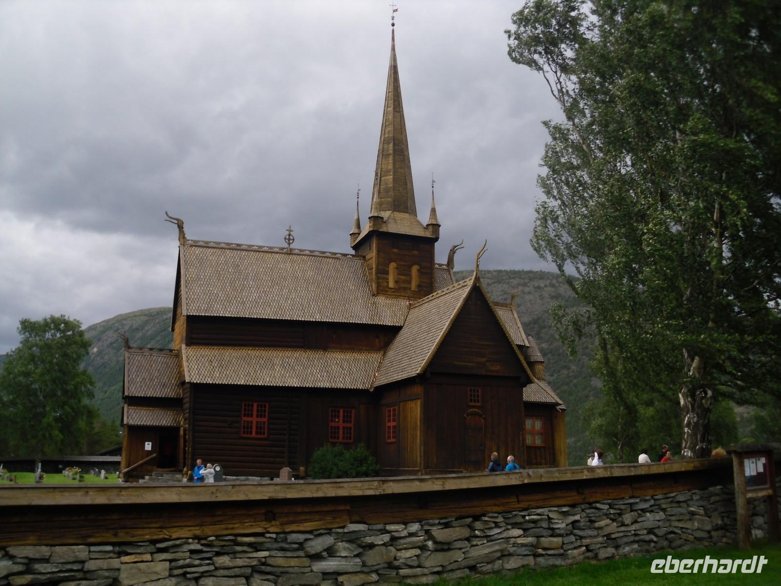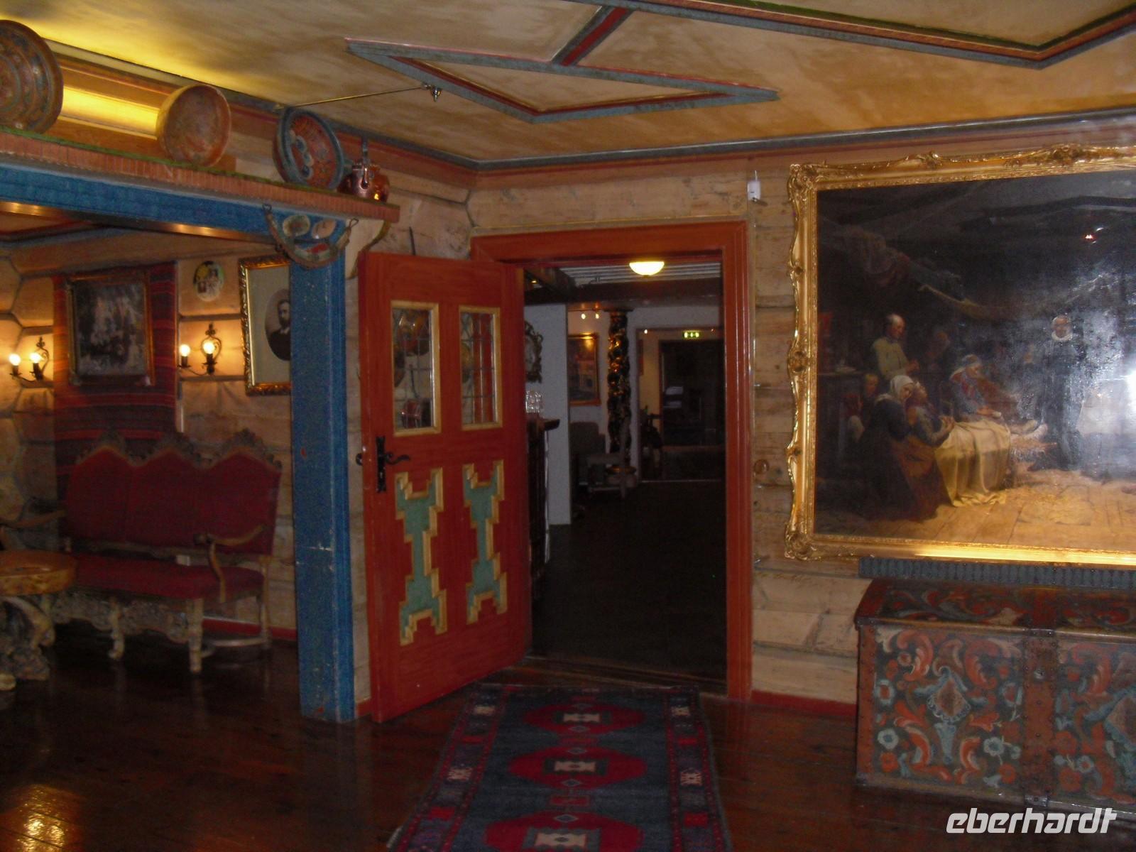 Heute früh können wir mit trockenem Wetter Gepäckverladen und stehen etwas weg vom Hotel, 3 Reisebusse haben die gleiche Abfahrtszeit. Unser Tagesprogramm sieht als Nächstes eine kurze Fährüberfahrt von Magerholm nach Ørsneset vor. Peter überrascht uns mit einer kurzen Fahrt zum Fährterminal der Kreuzfahrtschiffe, hier liegt die Queen Mary 2 vor Anker. Nach einer schönen Fahrt mit Blick in einen Gletscher erreichen wir Hellesylt und hier ist Start für die Kreuzfahrt auf dem Geirangerfjord. Er zählt wohl zu den schönsten und meistbesuchten Fjorden mit bis zu 800 Meter hohen Felswänden zu beiden Seiten und den in die Tiefe tosenden Wasserfällen mit Namen "Die sieben Schwestern" oder "Der Freier“. In Geiranger verlassen wir die Fähre und hier stoppen wir erst einmal für unsere Mittagspause. In mächtigen Spitzkehren schrauben wir uns danach durch das Bergmassiv, viel Wasser und auch Schnee auf dem Weg nach oben sehen wir. Bei einem Fotostopp weit oberhalb vom Geirangerfjord genießen wir atemberaubende Blicke in den smaragdgrünen Fjord. Für uns geht die Fahrt im Bus immer weiter auf der im Jahre 1885 fertiggestellten Straße RV 63 mit 8% Steigung, 20 engen Kehren und 1000m Höhenunterschied. Es wird auf der ca. 17 km langen Strecke vom Fjord wegführend rauer, ein mit Schnee und Eis gemischtes Gebirgsklima empfängt uns in der Höhe. Der Gipfel des 1495 m hohen Dalsnibba ist heute auch zu sehen. Unser Fotostopp an der Djupvatnethytta auf 1038m findet bei allen Gästen großen Anklang. Über Grotli vorüber an einigen großen Seen fahren wir durch das Ottadalen bis nach Lom. Zusammen gehen wir zum Bäcker und kaufen Kanelsnörr-ein lecker schmeckendes Zimtgebäck, ein. In der Stabkirche Lom erhalten wir bei einer Führung mit Lars Einblicke in die einzigartige Holzbauweise mit liebevollen Details, wie z.B. die Drachenköpfe an den Giebeln und er erzählt uns auch viel über Land und Traditionen. Durch den Nationalpark Jotunheimen fahren wir bis nach Bøverdal, wo wir heute im Traditionshotel Elveseter übernachten. Kurz vorher sehen wir einen Elch auf einer Wiese davonrennen, ein besonderes Erlebnis für uns alle im Bus. Wir wohnen heute wie im Museum und am Kamin nehmen wir in anheimelnder Atmosphäre den Kaffee nach dem Abendessen ein. Die Geschichte des Traditionshotels, welches seit 5 Generationen im Familienbesitz ist, bekommen wir vom Hausherrn sehr schön erklärt und in der Ahnengalerie können wir auch darüber lesen.