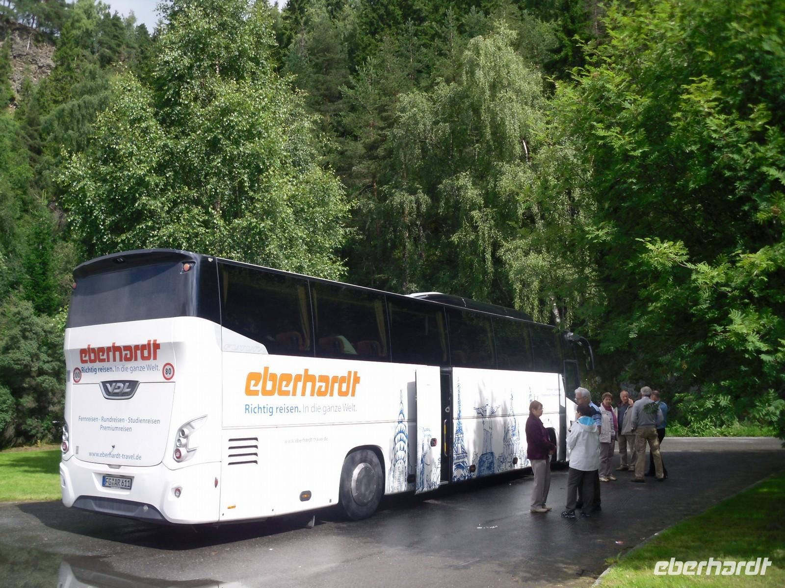 Mit unserem Reiseleiter Gei Eikanger erleben wir heute Morgen eine Stadtrundfahrt durch Bergen und die Führung im hanseatischen Viertel. Die Stadt ist fast schon südländisch geprägt, versprüht ein maritimes Flair-hier ist auch der Anfang der Linie der Hurtigruten und mit der Bergenbahn fährt man von hier bis in den Osten nach Oslo. Während der Hansezeit war sie die größte Stadt Skandinaviens. Wir starten mit trübem Wetter zur Rundfahrt und erleben einen Tag mit Sonne, blauen Himmel und tollen Sichtverhältnissen. Zur Mittagszeit verlassen wir die Stadt und setzen unsere Fahrt entlang des Hardangerfjordes fort. Am Steindalsfossen lassen wir unsere Gäste mal hinter einen Wasserfall schauen, die Legende sagt: Wer sich hierküsst, soll die ewige Liebe verspüren. Eine Fährüberfahrt von Bruravik nach Brimnes bringt uns weg aus Fjordnorwegen bis hin zum Dach dieses Traumlandes. Wir schrauben uns in einem gewaltigen Tunnelsystem im Mabödalen nach oben und bei Sonnenschein und angenehmen Temperaturen erleben wir heute den gigantischen Wasserfall Vøringfossen, er ergießt sich in eine Schlucht, 182m im freien Fall. Die Straße Nr.7 bringt uns direkt durch das weite Gebiet der Hardangervidda, diese beeindruckende Hochebene präsentiert sich als eine seen- und moorreiche, fast baum-und strauchlose Fjell-Landschaft. Wir können den uns bietenden Blick in den Gletscher Hardangerjokulen zum Super Foto werden lassen. Bei Ingrid im Samenshop wollen wir noch in die Hütte schauen, sie hat tolle Sachen zu verkaufen, Rentierfelle und Geweihe, aber leider ist sie krank und der Shop geschlossen. Ich habe sie als liebe Freundin vor Jahren kennengelernt und hoffe, sie im nächsten Jahr gesund wiederzusehen. Durch Geilo-auch das "Zermatt Norwegens" genannt, fahren wir weiter nach Noresund, hier übernachten wir heute im Best Western Sole Hotel. Der Abend ist traumhaft schön am See und so geht für uns alle ein schöner, langer Reisetag zu ende.