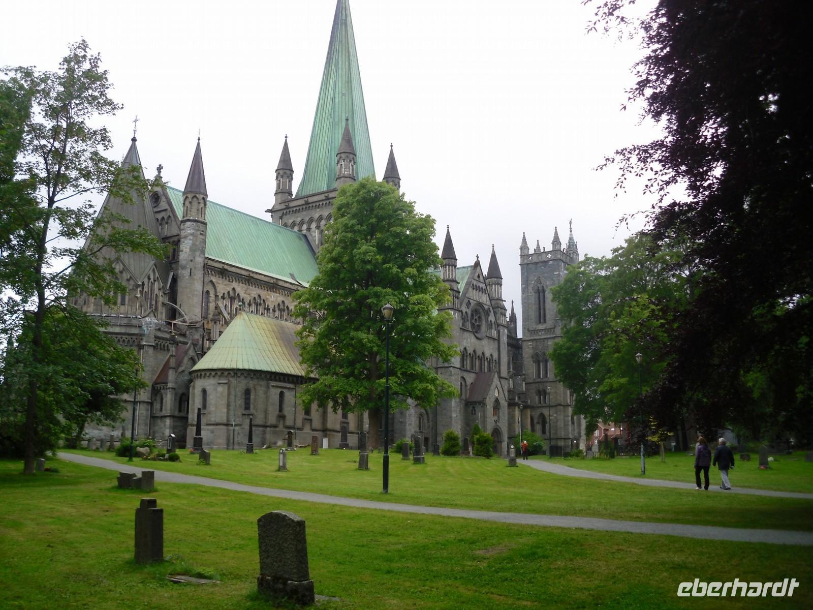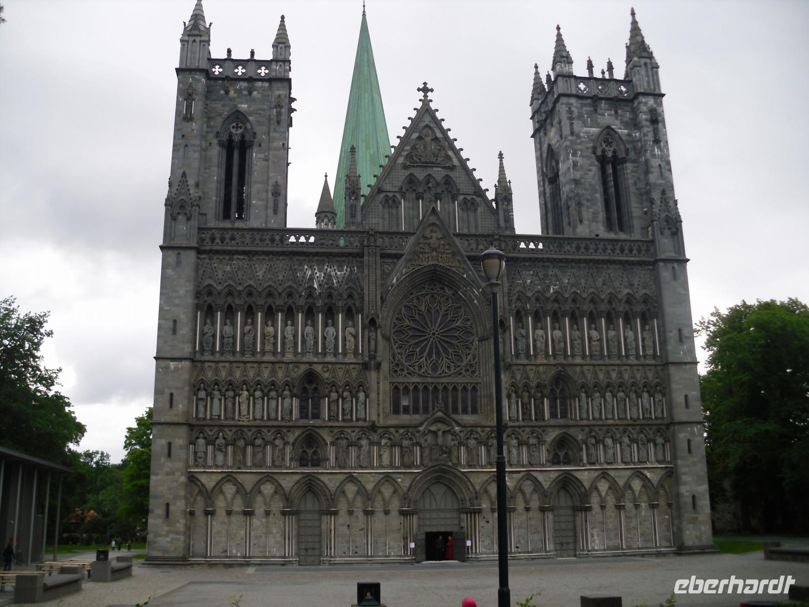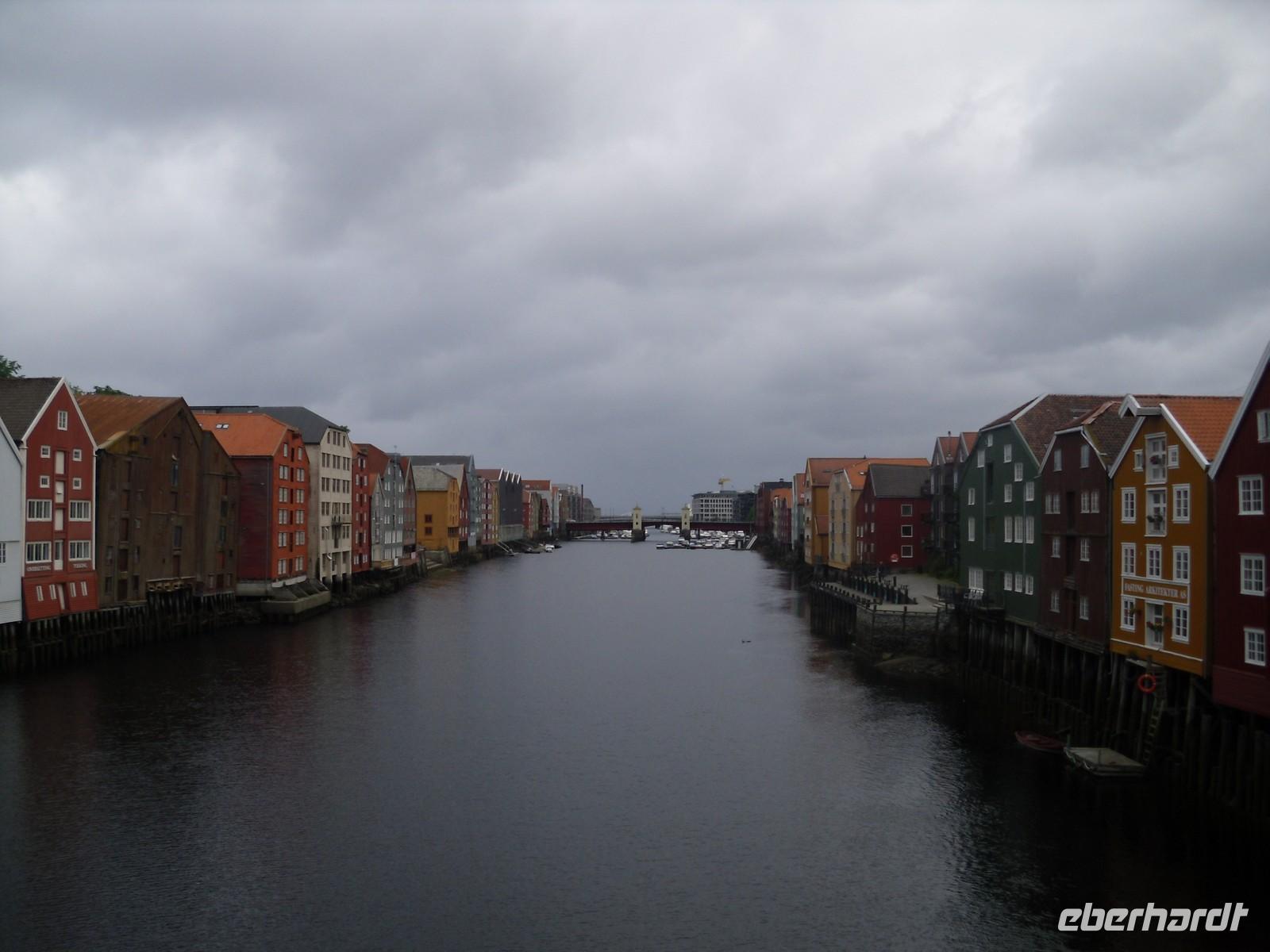 Bei noch trockenem Wetter heute Morgen führt uns die Tour als Erstes hin zur Olympiahalle Wikingship, ein Foto müssen wir jetzt und hier schießen. In die Stadt der Olympiade 1994, nach Lillehammer, fahren wir im Anschluss. Peter bringt uns im Bus sitzend bis ganz nach Oben zum Start und wer möchte läuft mit mir die vielen Stufen hinunter. Immer wieder müssen wir uns mit dem Schirm vor einsetzenden Regenschauern schützen. Der Abstieg geht ganz schön in die Waden und ich bin froh, am Ende alle Gäste wohlbehalten im Bus zurück zu haben. Wir erkunden noch kurz die Schanzenanlagen am Auslauf und nach einem Kaffee geht die Fahrt nach Maihaugen. Der Besuch des Freilichtmuseums ist für uns alle ein besonderes Erlebnis und auch hier geht’s nicht trocken ab. Ingrid ist heute gleich mit ihren roten Gummistiefeln unterwegs. Unsere 2 Führerinnen Vicky und Linda zeigen uns den alten Bauernhof - hier sitzen wir in den 2 schönen Wohnräumen, sehen und erfahren viel über das Leben der Menschen im ländlichen Raum des Gudbrandsdals. In der alten Schule lernen wir etwas norwegisch und auch ein Lied singen wir gemeinsam. Das Freilichtmuseum gibt einen grandiosen Einblick in die Geschichte Norwegens, eine Handwerkerausstellung und fantastisches Mobiliar können besichtigt werden. In die schöne alte Stabkirche von Garmo schauen wir auch hinein und Ingrid singt ein Loblied, vielleicht hilft es uns und sorgt für Wetterbesserung. Weiter geht es auf der E6 in Richtung Norden durch Norwegens bekanntes Tal, das Gudbrandsdal, es ist Schauplatz vieler alter Legenden, von Kunst und Kultur, hier verläuft auch der Peer Gynt Weg und wir haben dementsprechend die passende Musik eingelegt. Unterwegs nach Dombas sehen wir sogar die Sonne, aber auch Regenschauer ergießen sich über uns. Hier gibt es für uns alle die Möglichkeit, zum Einkauf von Souvenirs, wie Trolle, Elch -und Rentiersalami aber auch mit guten Prospekten aus der Touristeninformation haben wir uns eingedeckt. Über das einsam wirkende Dovrefjell setzen wir unsere Fahrt nach Trondheim fort. Schon immer mussten die Könige den beschwerlichen Weg auf dem Fjell nehmen, um in Trondheim ihre Weihe zu bekommen. Es ist daher auch der Königswegen-der historische Königs- und Pilgerweg nach Trondheim. Wir legen noch mehrere Fotopausen unterwegs ein, schneebedeckte Gipfel und herrliche Landschaft bannen wir aufs Bild. Am Abend beziehen wir im Rica Nidelven Quartier und nach dem großartigem Abendessen als Büffet lassen die Gäste den Tag am Nidelv ausklingen, denn bei gerade trockenem, aber windigen Wetter erkunden sie noch Teile der Altstadt, sehen die alten Speicherhäuser am Nidelv und kommen dabei bis hin zum Dom. Bei Ankunft in Trondheim war ja alles gesperrt wegen einer Bombendrohung in Nähe des Doms.