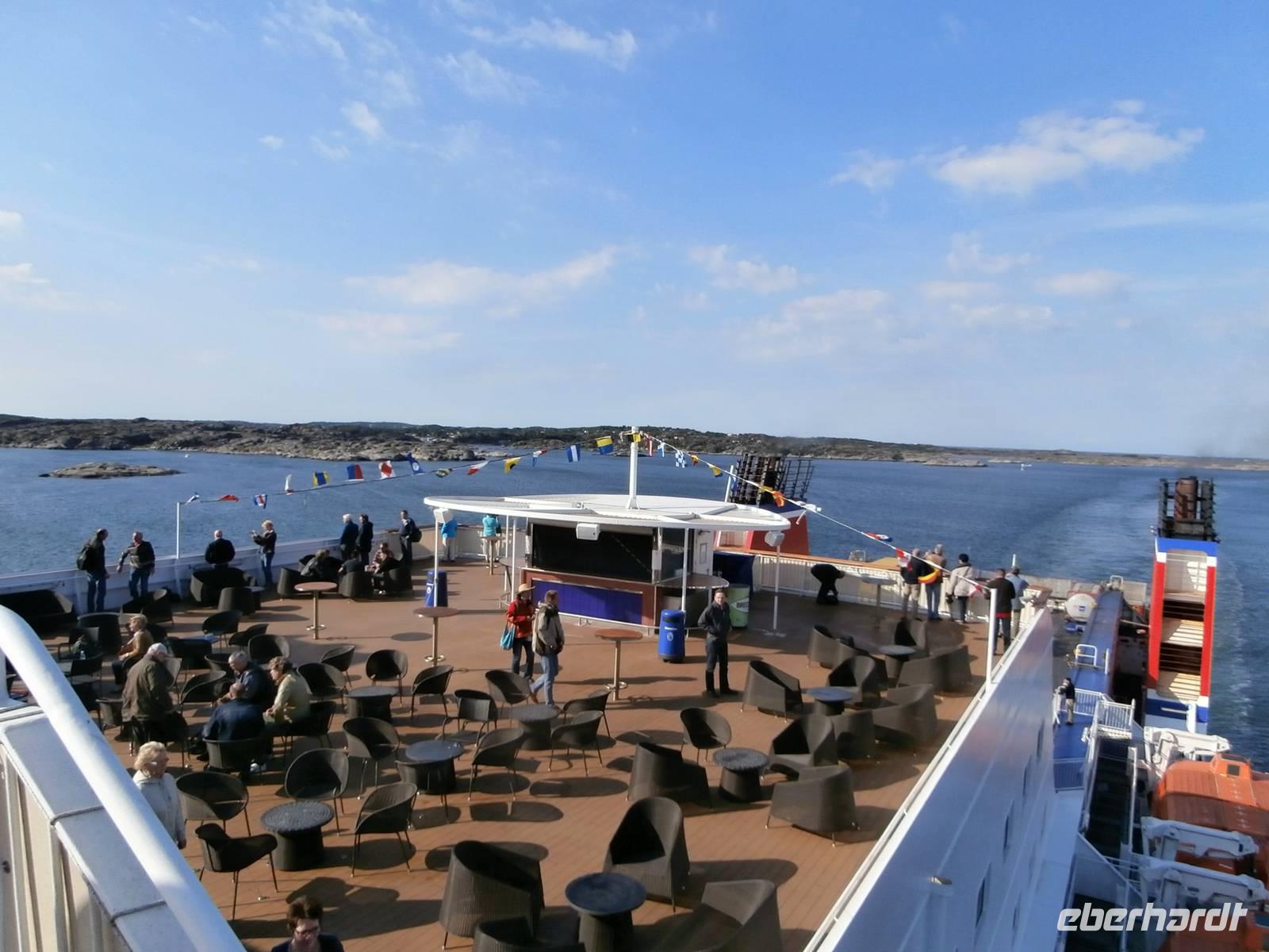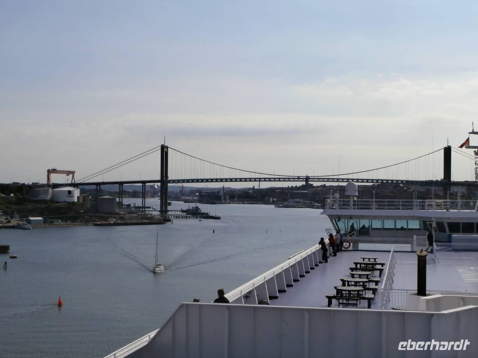 Wir starten unsere Reise am Morgen in Dresden und mit einigen Zustiegen geht für uns die Fahrt bei schönem Wetter über Leipzig nach Kiel. Wir sind als erste Gruppe vom Reiseunternehmen Eberhardt in diesem Jahr gen Norden unterwegs. Unser zeitiges Ankommen in Kiel ermöglicht es, noch einen Stadtrundgang durch Kiel zu machen und uns mit norwegischen Kronen einzudecken. 17 Uhr gehen wir gemeinsam an Bord unserer Fähre Stena Germanica. Zur ersten Sitzung treffen wir uns im Restaurant zum skandinavischen Schlemmerbuffet mit Weißwein und Rotwein sowie Bier als Gratisgetränke, so lassen wir den ersten Tag unserer Reise ganz entspannt ausklingen. Pünktlich stechen wir am Abend in See, bei schönem Wetter genießen wir das Auslaufen an Deck. In der Nacht passieren wir die beleuchtete Brücke des Großen Belt, einige Gäste erleben die Durchfahrt gegen Mitternacht.