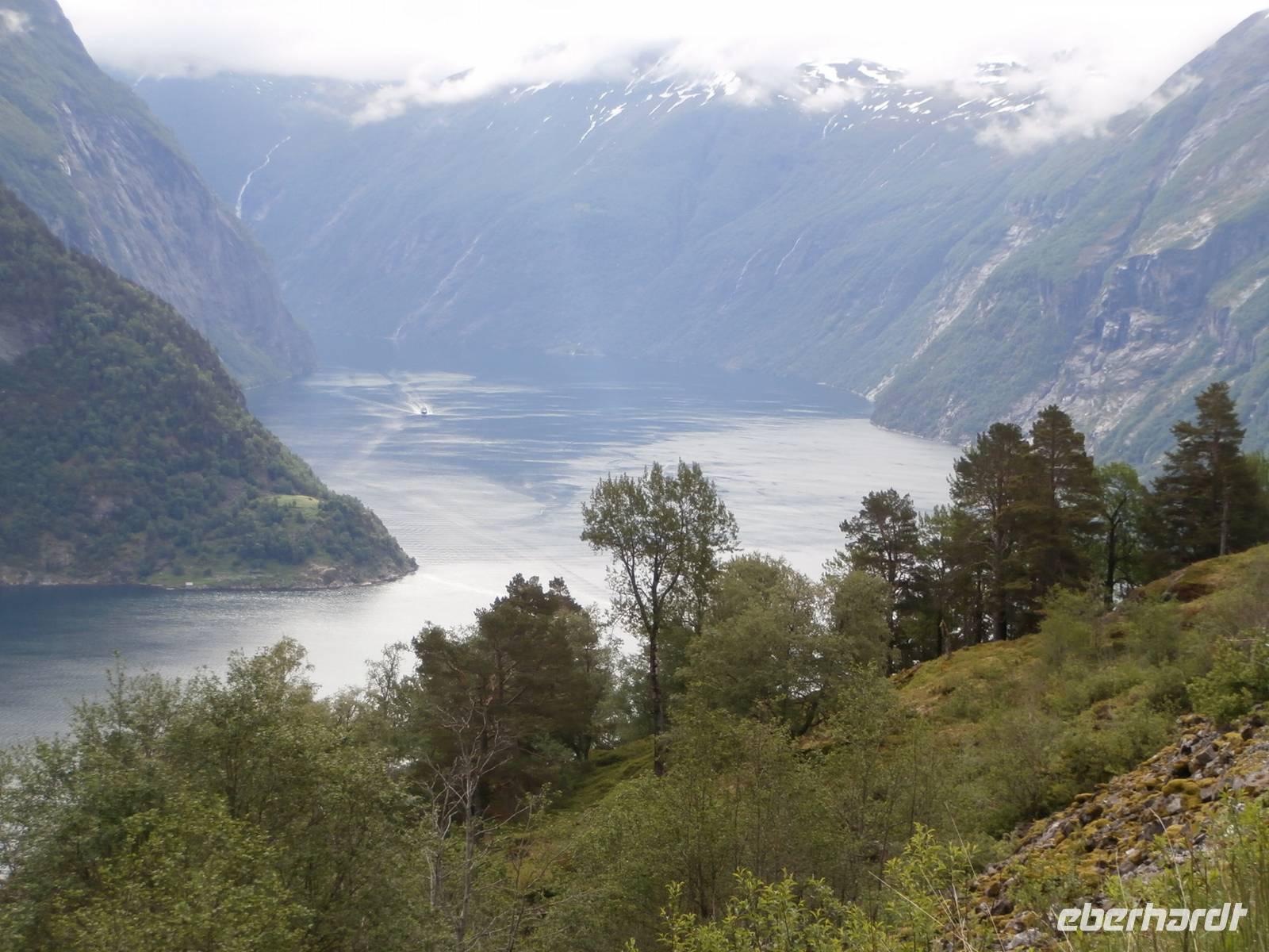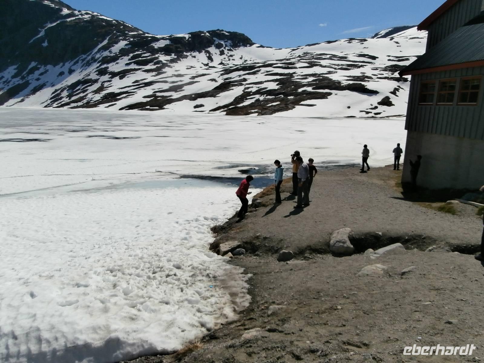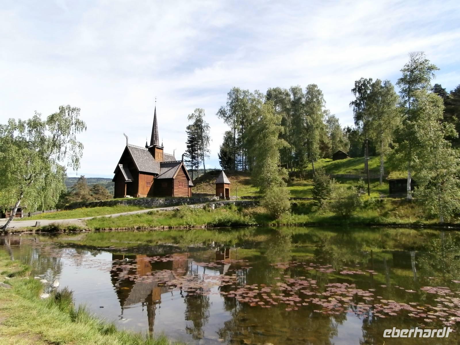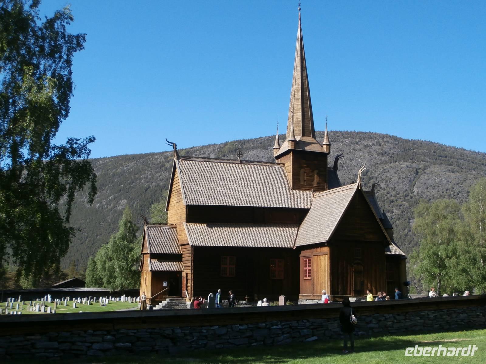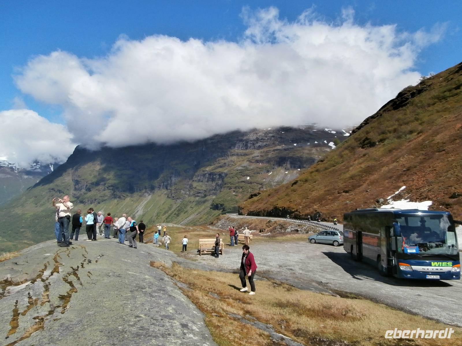 Heute früh können wir mit trockenem Wetter Gepäckverladen und unser Tagesprogramm sieht als Nächstes eine kurze Fährüberfahrt von Magerholm nach Ørsneset vor. Nach einer schönen Fahrt mit Blick in einen Gletscher und herrlichen Spiegelungen im Fjord erreichen wir Hellesylt und hier ist Start für die Kreuzfahrt auf dem Geirangerfjord. Er zählt wohl zu den schönsten und meistbesuchten Fjorden mit bis zu 800 Meter hohen Felswänden zu beiden Seiten und den in die Tiefe tosenden Wasserfällen mit Namen "Die sieben Schwestern" oder "Der Freier". In Geiranger verlassen wir die Fähre und hier liegt auch wieder ein Kreuzfahrtschiff im Hafen. In mächtigen Spitzkehren schrauben wir uns durch das Bergmassiv, viel Wasser, Schnee und azurblauer Himmel begleiten uns auf dem Weg nach oben. Bei einem Fotostopp weit oberhalb vom Geirangerfjord genießen wir atemberaubende Blicke in den smaragdgrünen Fjord, die Adlerstrasse und das Kreuzfahrtschiff. Für ein zweites Gruppenfoto nehmen wir Aufstellung, bietet der Geiranger Fjord doch den richtigen Rahmen dafür. Unsere Fahrt geht immer weiter auf der im Jahre 1885 fertiggestellten Straße RV 63 mit 8% Steigung, 20 engen Kehren und 1000m Höhenunterschied. Es wird auf der ca. 17 km langen Strecke vom Fjord wegführend rauer, ein mit Schnee und Eis gemischtes Gebirgsklima empfängt uns in der Höhe. Wir krönen das Geiranger Fjord Erlebnis in dieser Landschaft mit dem Sekt Empfang des Veranstalters Eberhardt travel. Der Gipfel des 1495 m hohen Dalsnibba ist heute wunderbar zu sehen. An der Djupvatnethytta auf 1038m verweilen wir kurz und blicken hier auf den gleichnamigen See, der noch voll unter Schnee und Eis liegt. Über Grotli vorüber an einigen großen Seen fahren wir durch das Ottadalen bis nach Lom. In der Stabkirche Lom erhalten wir bei einer Führung Einblicke in die einzigartige Holzbauweise mit liebevollen Details, wie z.B. die Drachenköpfe an den Giebeln. Durch den Nationalpark Jotunheimen, wo Norwegens höchste Berge stehen, fahren wir bis nach Elveseter, wo wir im Traditionshotel im Bøverdalen übernachten. Heute wohnen wir wie im Museum und am Kamin nehmen wir in anheimelnder Atmosphäre den Kaffee nach dem Abendessen ein. Die Geschichte des Traditionshotels, welches seit 5 Generationen im Familienbesitz ist und früher ein großer Bauernhof war, begeistert alle. In der Ahnengalerie können wir auch darüber nachlesen und die große Sagasäule im Foto festhalten.
