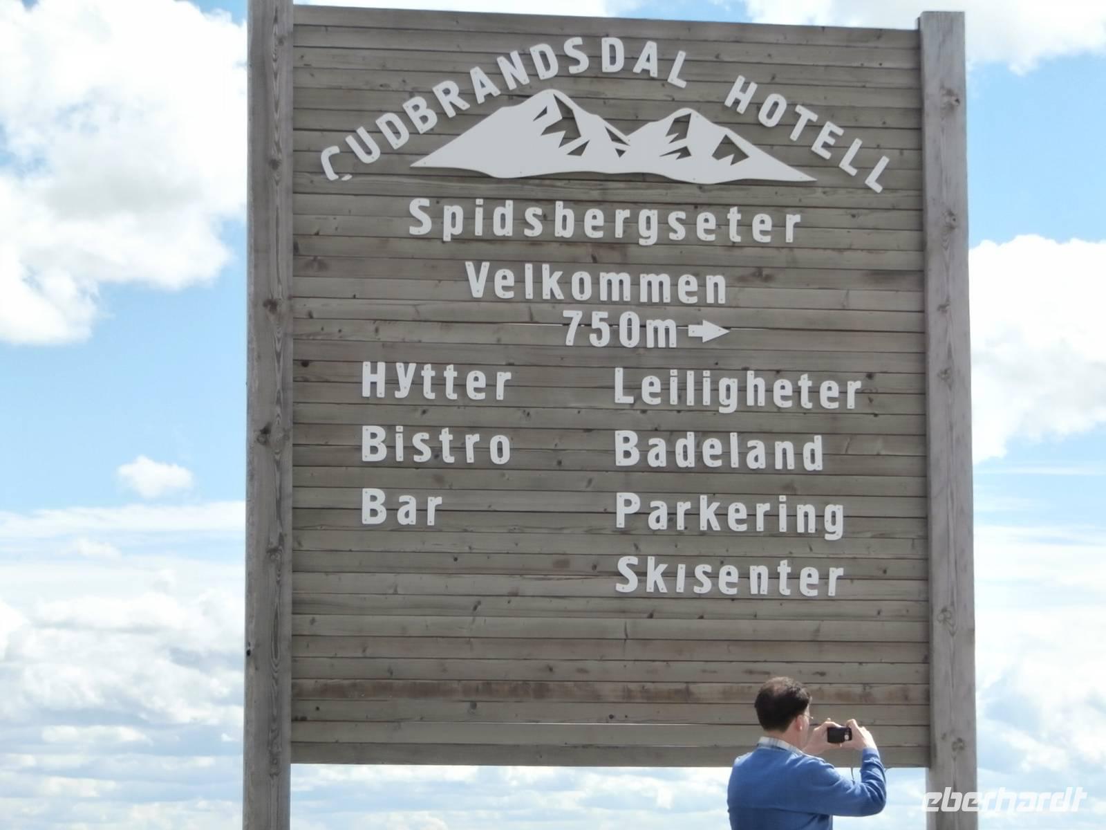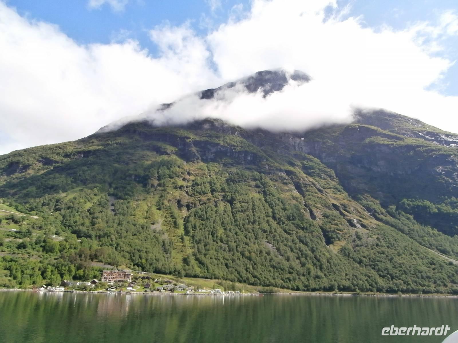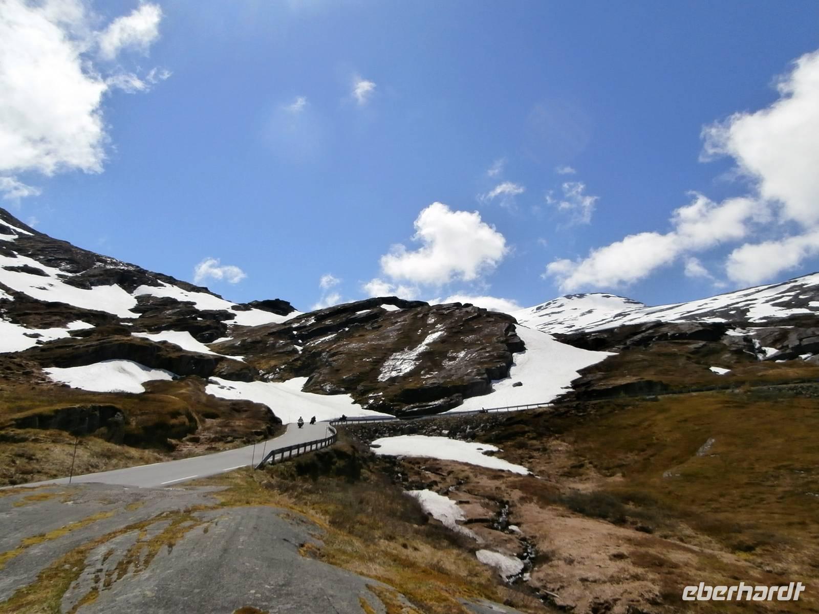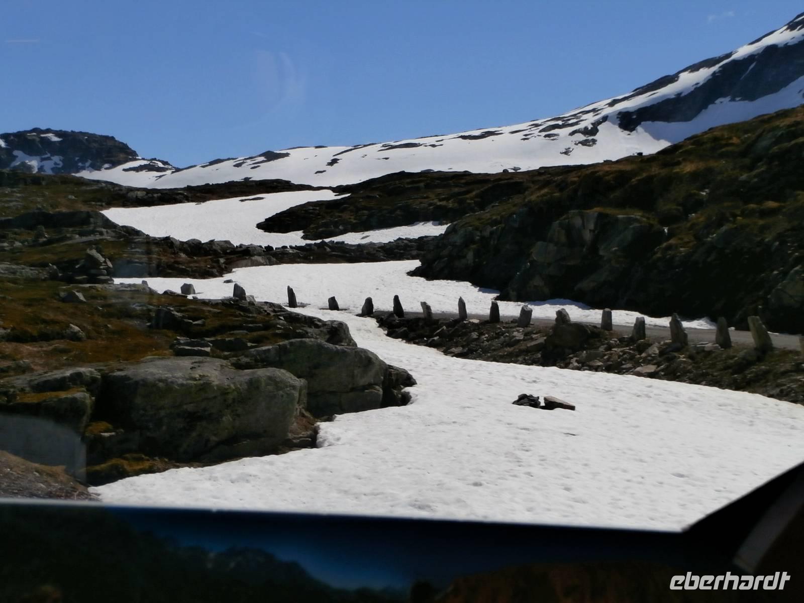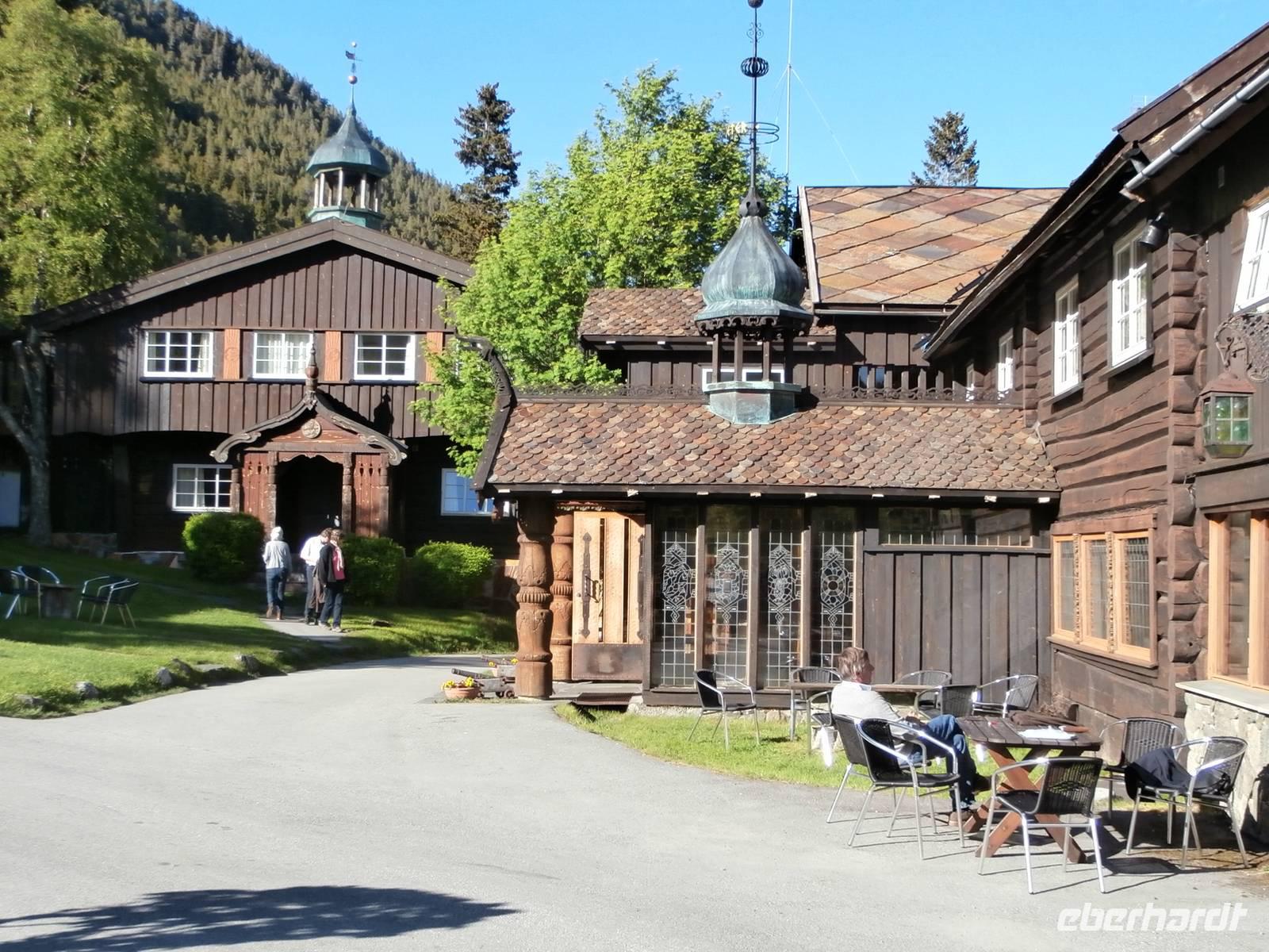 Heute früh können wir mit trockenem Wetter Gepäckverladen und unser Tagesprogramm sieht als Nächstes eine kurze Fährüberfahrt von Magerholm nach Ørsneset vor. Nach einer schönen Fahrt mit Blick in einen Gletscher und herrlichen Spiegelungen im Fjord erreichen wir Hellesylt und hier ist Start für die Kreuzfahrt auf dem Geirangerfjord. Er zählt wohl zu den schönsten und meistbesuchten Fjorden mit bis zu 800 Meter hohen Felswänden zu beiden Seiten und den in die Tiefe tosenden Wasserfällen mit Namen "Die sieben Schwestern" oder "Der Freier". In Geiranger verlassen wir die Fähre und hier liegt auch wieder ein Kreuzfahrtschiff im Hafen. In mächtigen Spitzkehren schrauben wir uns durch das Bergmassiv, viel Wasser, Schnee und azurblauer Himmel begleiten uns auf dem Weg nach oben. Bei einem Fotostopp weit oberhalb vom Geirangerfjord genießen wir atemberaubende Blicke in den smaragdgrünen Fjord, die Adlerstrasse und das Kreuzfahrtschiff. Für ein zweites Gruppenfoto nehmen wir Aufstellung, bietet der Geiranger Fjord doch den richtigen Rahmen dafür. Unsere Fahrt geht immer weiter auf der im Jahre 1885 fertiggestellten Straße RV 63 mit 8% Steigung, 20 engen Kehren und 1000m Höhenunterschied. Es wird auf der ca. 17 km langen Strecke vom Fjord wegführend rauer, ein mit Schnee und Eis gemischtes Gebirgsklima empfängt uns in der Höhe. Wir krönen das Geiranger Fjord Erlebnis in dieser Landschaft mit dem Sekt Empfang des Veranstalters Eberhardt travel. Der Gipfel des 1495 m hohen Dalsnibba ist heute wunderbar zu sehen. An der Djupvatnethytta auf 1038m verweilen wir kurz und blicken hier auf den gleichnamigen See, der noch voll unter Schnee und Eis liegt. Über Grotli vorüber an einigen großen Seen fahren wir durch das Ottadalen bis nach Lom. In der Stabkirche Lom erhalten wir bei einer Führung Einblicke in die einzigartige Holzbauweise mit liebevollen Details, wie z.B. die Drachenköpfe an den Giebeln. Durch den Nationalpark Jotunheimen, wo Norwegens höchste Berge stehen, fahren wir bis nach Elveseter, wo wir im Traditionshotel im Bøverdalen übernachten. Heute wohnen wir wie im Museum und am Kamin nehmen wir in anheimelnder Atmosphäre den Kaffee nach dem Abendessen ein. Die Geschichte des Traditionshotels, welches seit 5 Generationen im Familienbesitz ist und früher ein großer Bauernhof war, begeistert alle. In der Ahnengalerie können wir auch darüber nachlesen und die große Sagasäule im Foto festhalten.