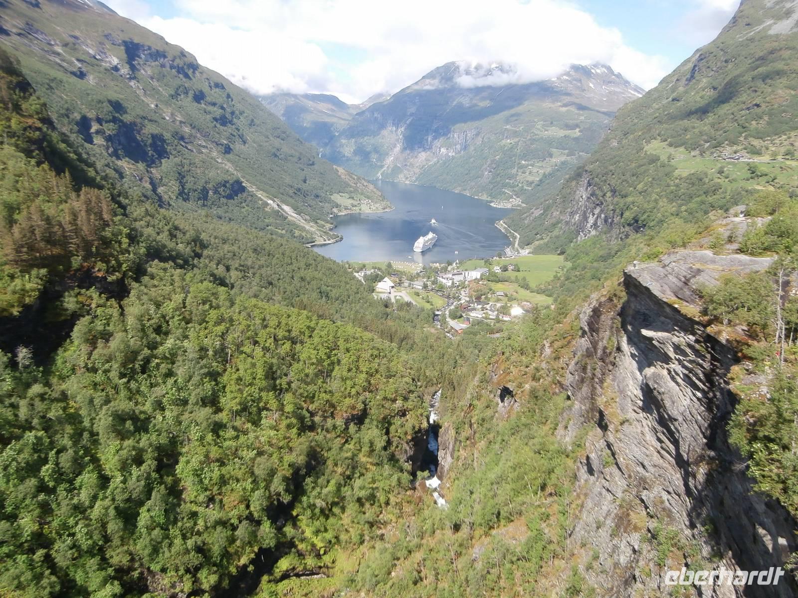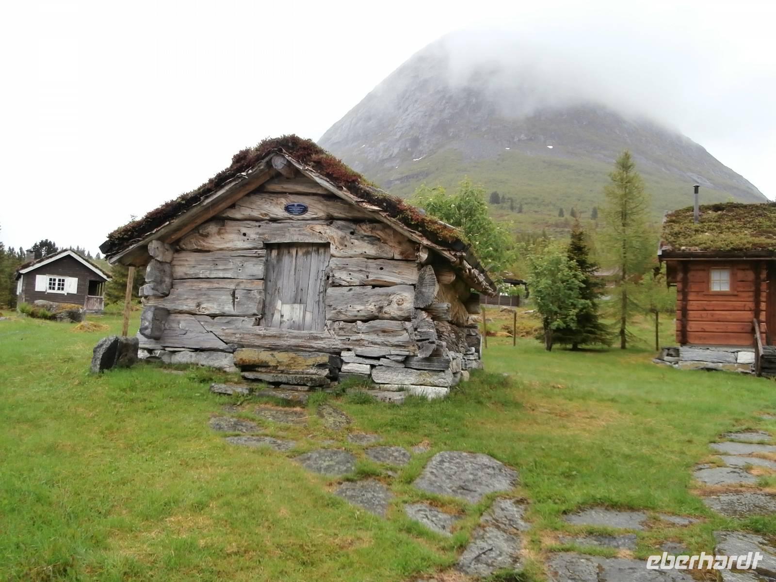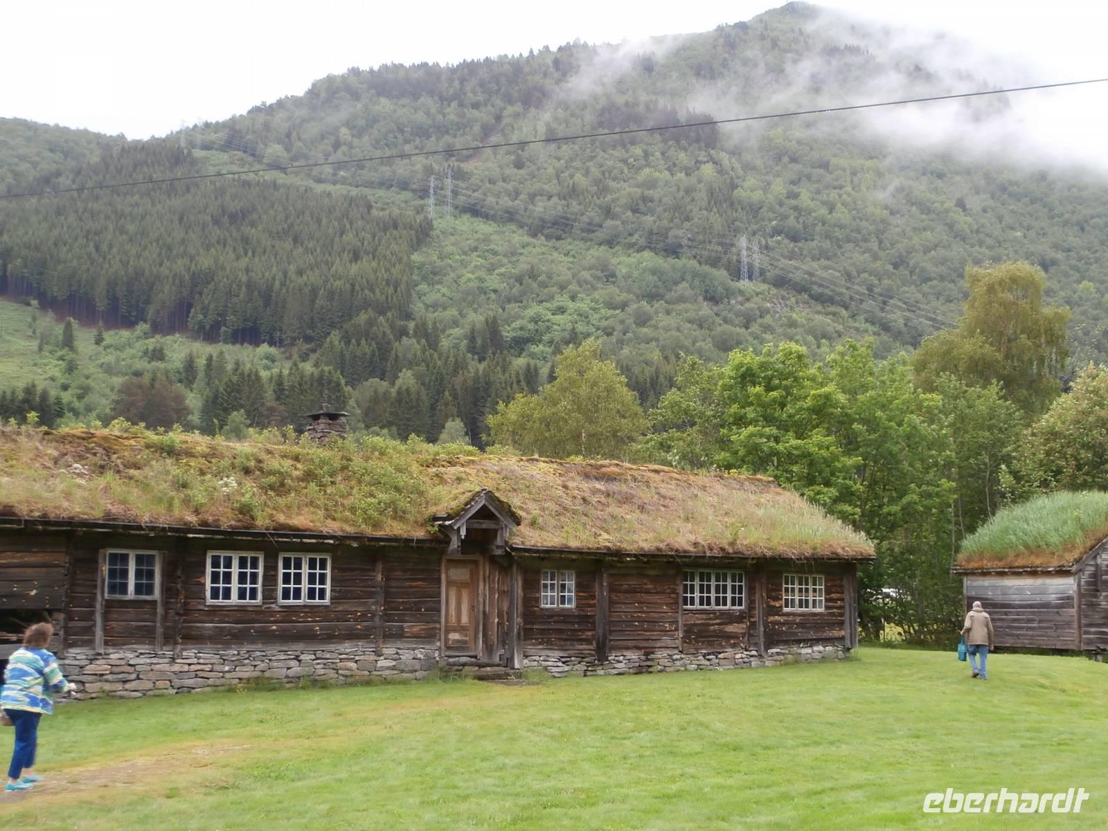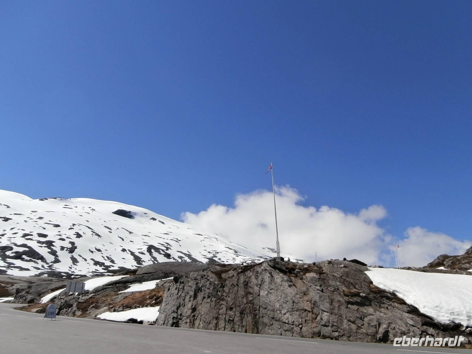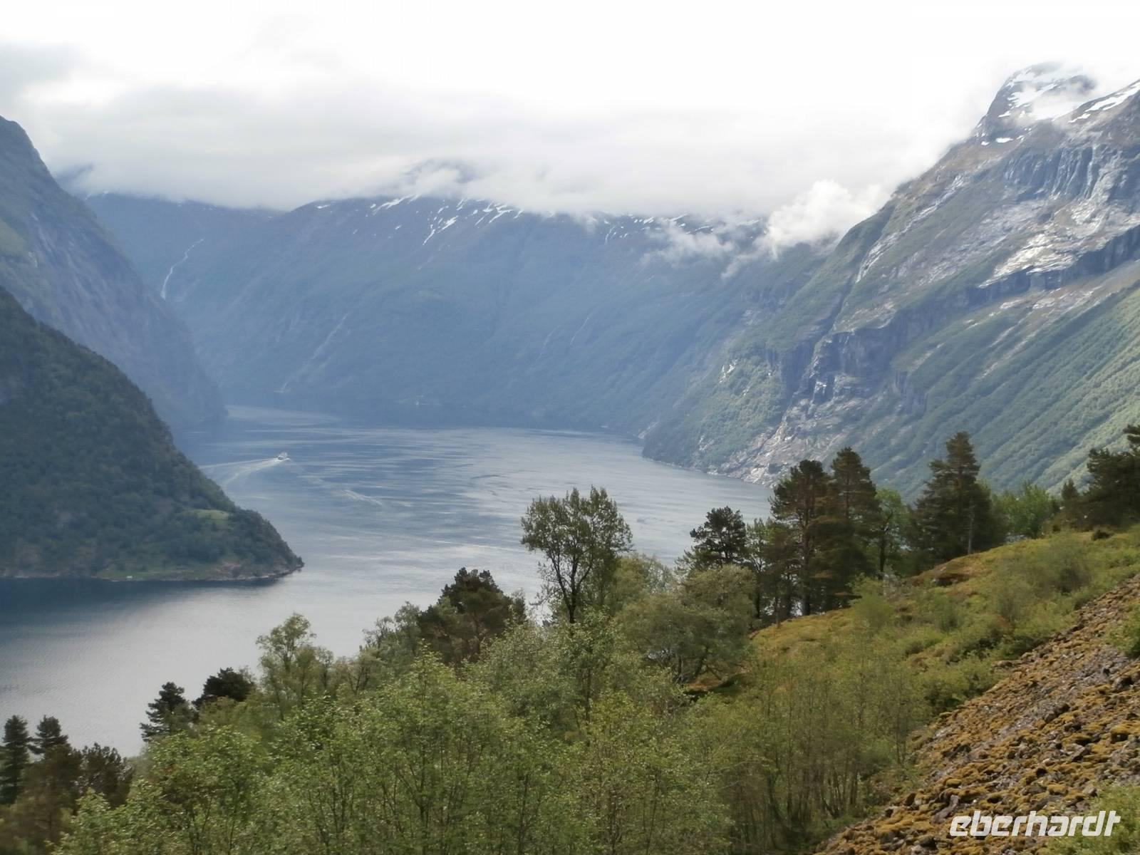 Heute früh können wir mit trockenem Wetter Gepäckverladen und unser Tagesprogramm sieht als Nächstes eine kurze Fährüberfahrt von Magerholm nach Ørsneset vor. Nach einer schönen Fahrt mit Blick in einen Gletscher und herrlichen Spiegelungen im Fjord erreichen wir Hellesylt und hier ist Start für die Kreuzfahrt auf dem Geirangerfjord. Er zählt wohl zu den schönsten und meistbesuchten Fjorden mit bis zu 800 Meter hohen Felswänden zu beiden Seiten und den in die Tiefe tosenden Wasserfällen mit Namen "Die sieben Schwestern" oder "Der Freier". In Geiranger verlassen wir die Fähre und hier liegt auch wieder ein Kreuzfahrtschiff im Hafen. In mächtigen Spitzkehren schrauben wir uns durch das Bergmassiv, viel Wasser, Schnee und azurblauer Himmel begleiten uns auf dem Weg nach oben. Bei einem Fotostopp weit oberhalb vom Geirangerfjord genießen wir atemberaubende Blicke in den smaragdgrünen Fjord, die Adlerstrasse und das Kreuzfahrtschiff. Für ein zweites Gruppenfoto nehmen wir Aufstellung, bietet der Geiranger Fjord doch den richtigen Rahmen dafür. Unsere Fahrt geht immer weiter auf der im Jahre 1885 fertiggestellten Straße RV 63 mit 8% Steigung, 20 engen Kehren und 1000m Höhenunterschied. Es wird auf der ca. 17 km langen Strecke vom Fjord wegführend rauer, ein mit Schnee und Eis gemischtes Gebirgsklima empfängt uns in der Höhe. Wir krönen das Geiranger Fjord Erlebnis in dieser Landschaft mit dem Sekt Empfang des Veranstalters Eberhardt travel. Der Gipfel des 1495 m hohen Dalsnibba ist heute wunderbar zu sehen. An der Djupvatnethytta auf 1038m verweilen wir kurz und blicken hier auf den gleichnamigen See, der noch voll unter Schnee und Eis liegt. Über Grotli vorüber an einigen großen Seen fahren wir durch das Ottadalen bis nach Lom. In der Stabkirche Lom erhalten wir bei einer Führung Einblicke in die einzigartige Holzbauweise mit liebevollen Details, wie z.B. die Drachenköpfe an den Giebeln. Durch den Nationalpark Jotunheimen, wo Norwegens höchste Berge stehen, fahren wir bis nach Elveseter, wo wir im Traditionshotel im Bøverdalen übernachten. Heute wohnen wir wie im Museum und am Kamin nehmen wir in anheimelnder Atmosphäre den Kaffee nach dem Abendessen ein. Die Geschichte des Traditionshotels, welches seit 5 Generationen im Familienbesitz ist und früher ein großer Bauernhof war, begeistert alle. In der Ahnengalerie können wir auch darüber nachlesen und die große Sagasäule im Foto festhalten.