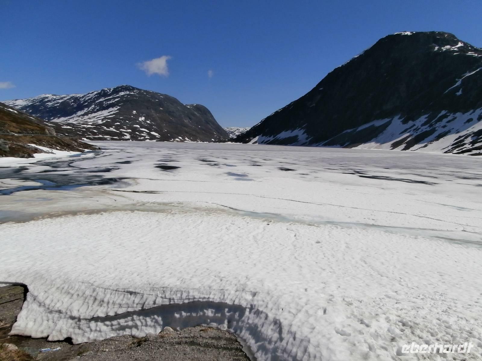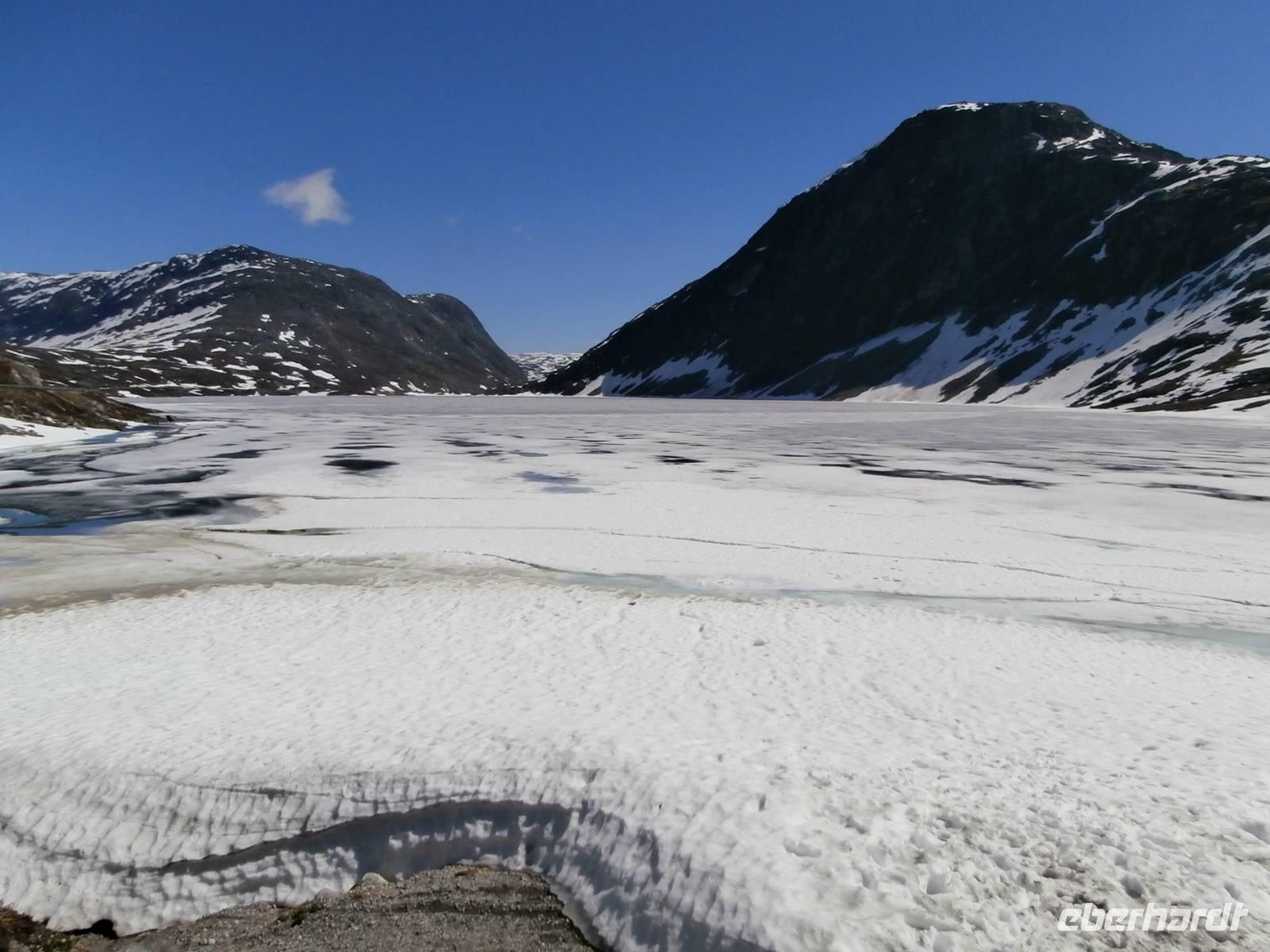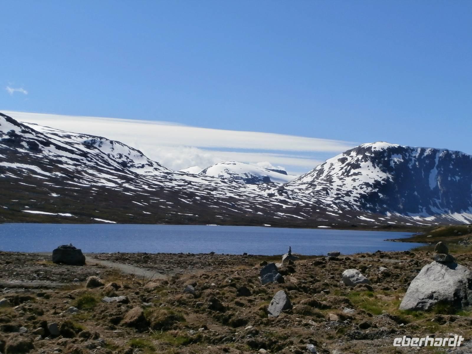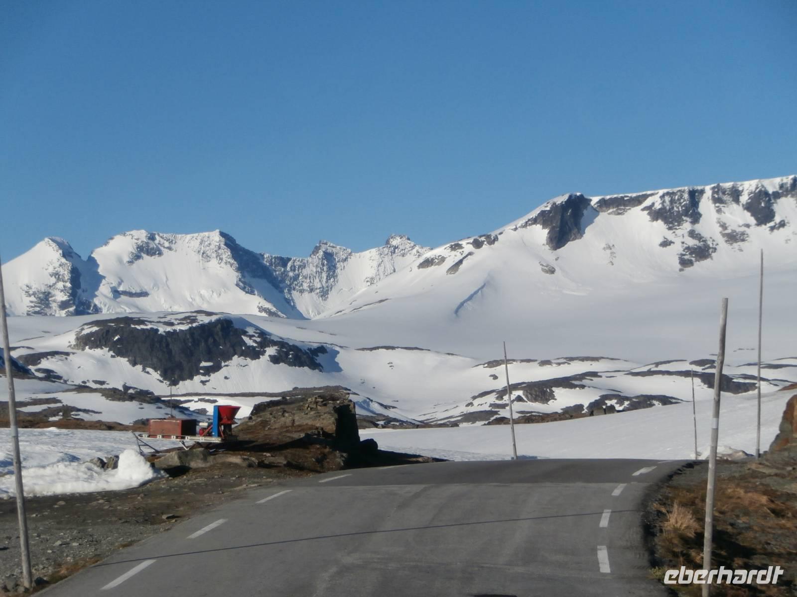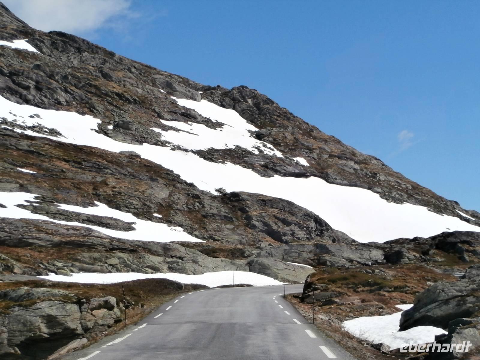 Heute früh können wir mit trockenem Wetter Gepäckverladen und unser Tagesprogramm sieht als Nächstes eine kurze Fährüberfahrt von Magerholm nach Ørsneset vor. Nach einer schönen Fahrt mit Blick in einen Gletscher und herrlichen Spiegelungen im Fjord erreichen wir Hellesylt und hier ist Start für die Kreuzfahrt auf dem Geirangerfjord. Er zählt wohl zu den schönsten und meistbesuchten Fjorden mit bis zu 800 Meter hohen Felswänden zu beiden Seiten und den in die Tiefe tosenden Wasserfällen mit Namen "Die sieben Schwestern" oder "Der Freier". In Geiranger verlassen wir die Fähre und hier liegt auch wieder ein Kreuzfahrtschiff im Hafen. In mächtigen Spitzkehren schrauben wir uns durch das Bergmassiv, viel Wasser, Schnee und azurblauer Himmel begleiten uns auf dem Weg nach oben. Bei einem Fotostopp weit oberhalb vom Geirangerfjord genießen wir atemberaubende Blicke in den smaragdgrünen Fjord, die Adlerstrasse und das Kreuzfahrtschiff. Für ein zweites Gruppenfoto nehmen wir Aufstellung, bietet der Geiranger Fjord doch den richtigen Rahmen dafür. Unsere Fahrt geht immer weiter auf der im Jahre 1885 fertiggestellten Straße RV 63 mit 8% Steigung, 20 engen Kehren und 1000m Höhenunterschied. Es wird auf der ca. 17 km langen Strecke vom Fjord wegführend rauer, ein mit Schnee und Eis gemischtes Gebirgsklima empfängt uns in der Höhe. Wir krönen das Geiranger Fjord Erlebnis in dieser Landschaft mit dem Sekt Empfang des Veranstalters Eberhardt travel. Der Gipfel des 1495 m hohen Dalsnibba ist heute wunderbar zu sehen. An der Djupvatnethytta auf 1038m verweilen wir kurz und blicken hier auf den gleichnamigen See, der noch voll unter Schnee und Eis liegt. Über Grotli vorüber an einigen großen Seen fahren wir durch das Ottadalen bis nach Lom. In der Stabkirche Lom erhalten wir bei einer Führung Einblicke in die einzigartige Holzbauweise mit liebevollen Details, wie z.B. die Drachenköpfe an den Giebeln. Durch den Nationalpark Jotunheimen, wo Norwegens höchste Berge stehen, fahren wir bis nach Elveseter, wo wir im Traditionshotel im Bøverdalen übernachten. Heute wohnen wir wie im Museum und am Kamin nehmen wir in anheimelnder Atmosphäre den Kaffee nach dem Abendessen ein. Die Geschichte des Traditionshotels, welches seit 5 Generationen im Familienbesitz ist und früher ein großer Bauernhof war, begeistert alle. In der Ahnengalerie können wir auch darüber nachlesen und die große Sagasäule im Foto festhalten.