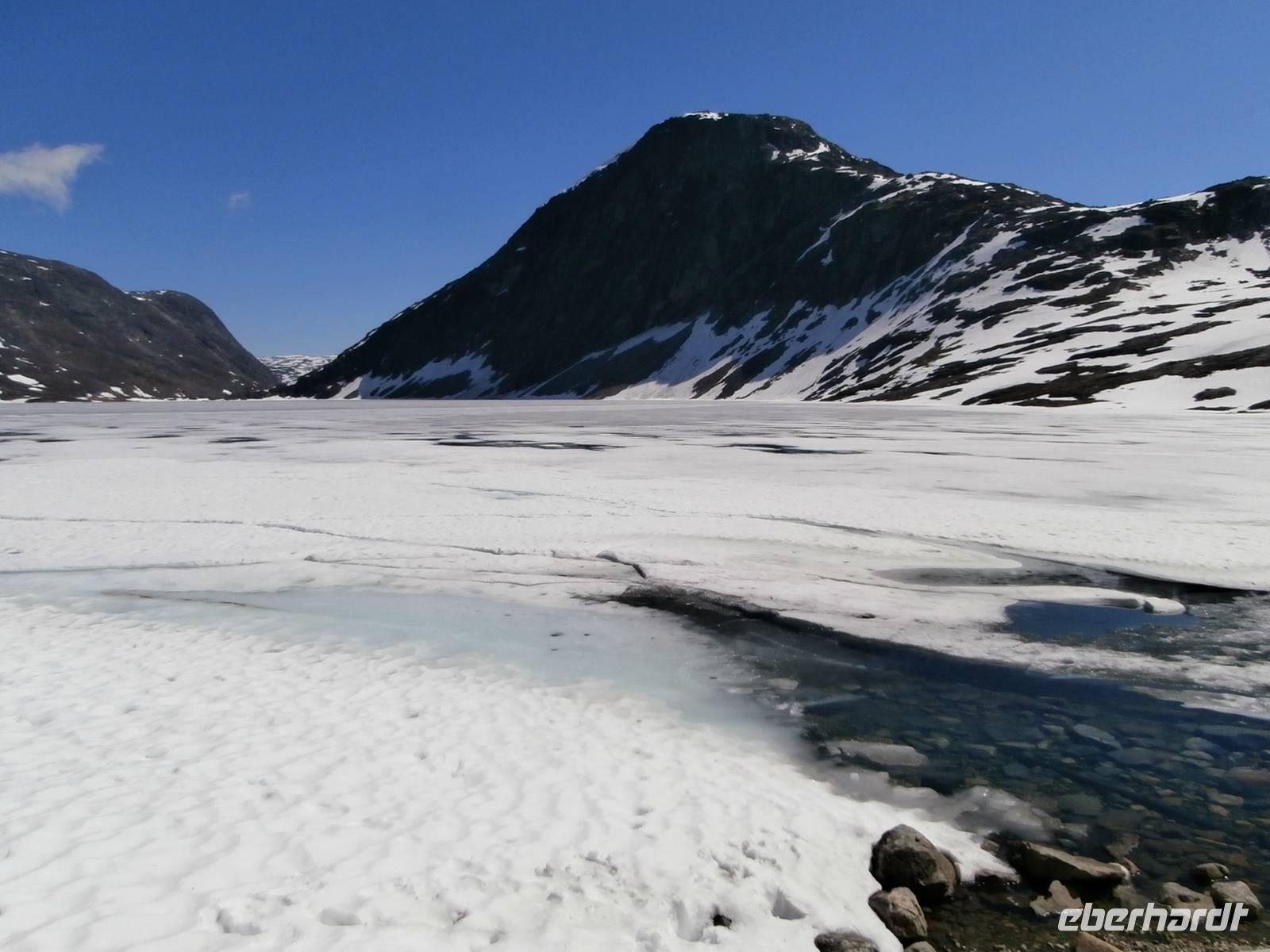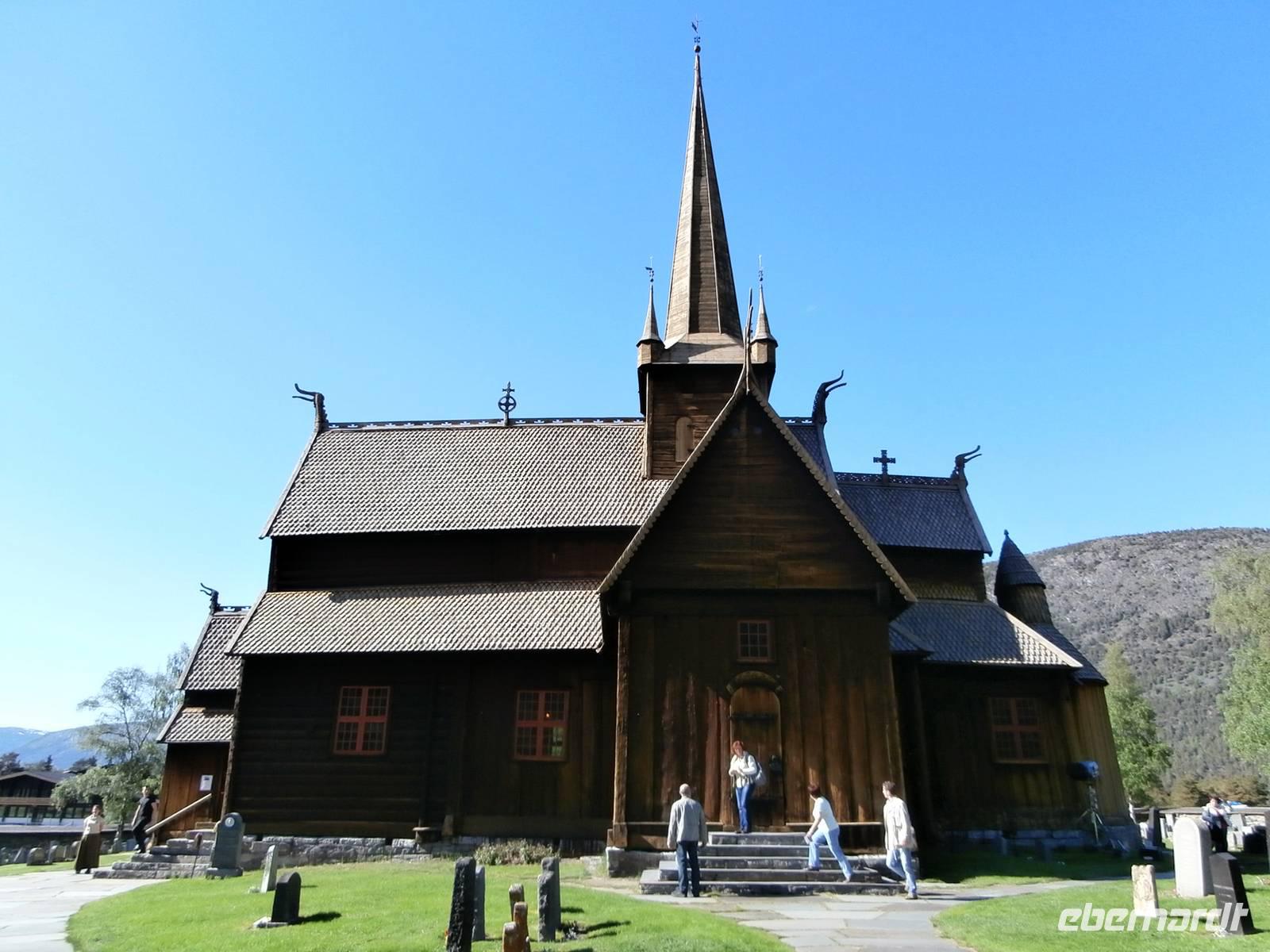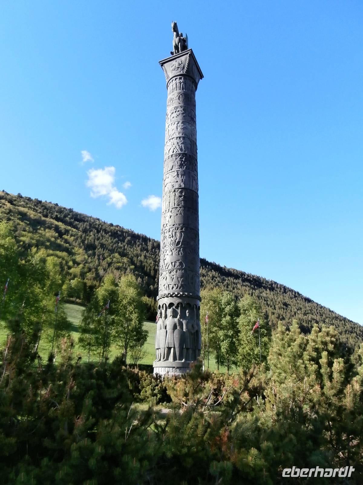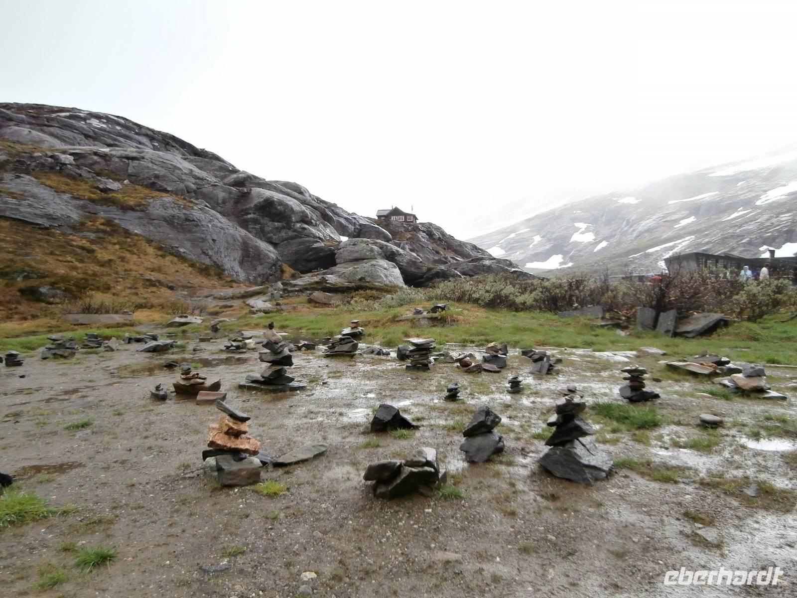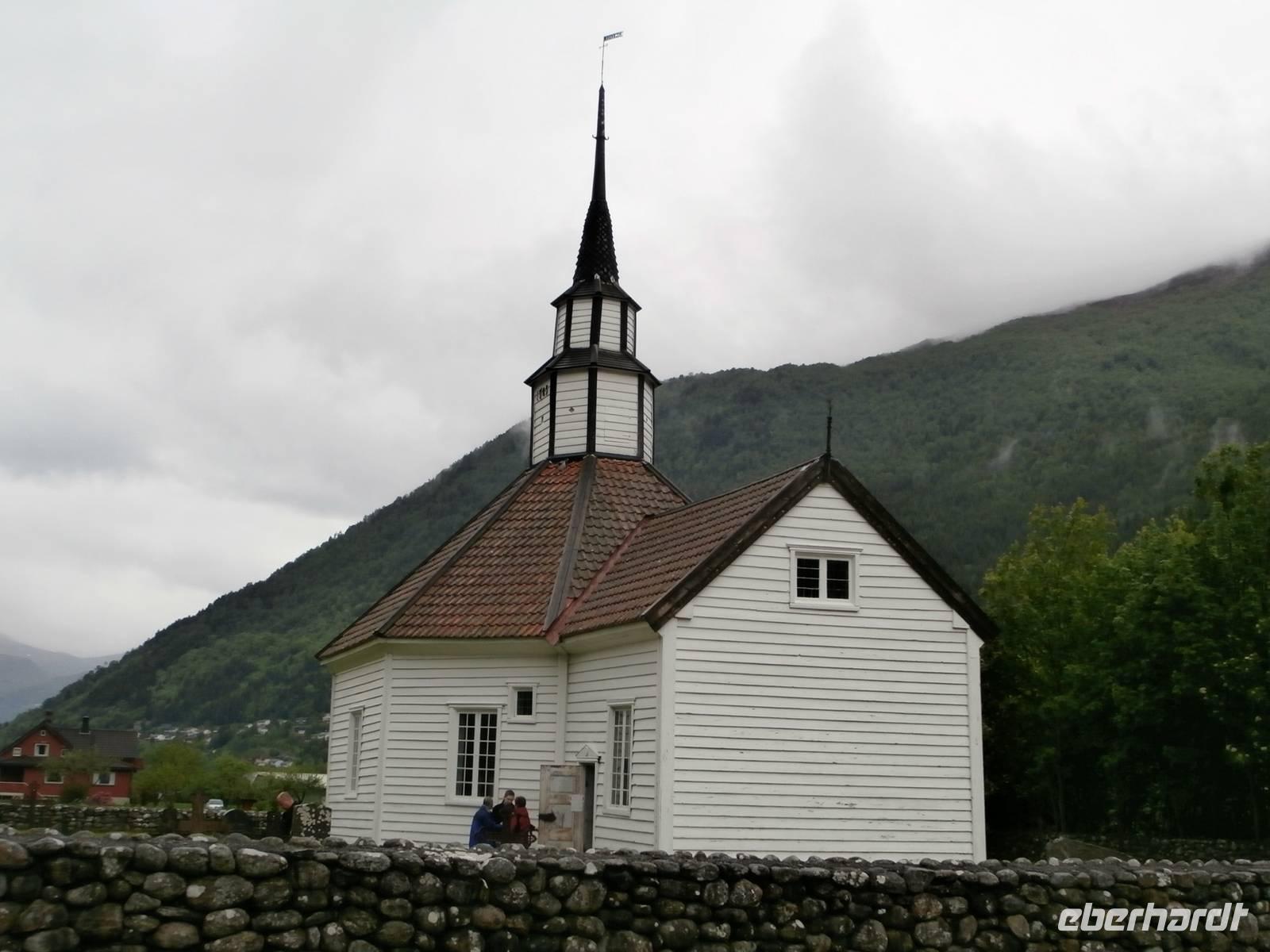Heute früh können wir mit trockenem Wetter Gepäckverladen und unser Tagesprogramm sieht als Nächstes eine kurze Fährüberfahrt von Magerholm nach Ørsneset vor. Nach einer schönen Fahrt mit Blick in einen Gletscher und herrlichen Spiegelungen im Fjord erreichen wir Hellesylt und hier ist Start für die Kreuzfahrt auf dem Geirangerfjord. Er zählt wohl zu den schönsten und meistbesuchten Fjorden mit bis zu 800 Meter hohen Felswänden zu beiden Seiten und den in die Tiefe tosenden Wasserfällen mit Namen "Die sieben Schwestern" oder "Der Freier". In Geiranger verlassen wir die Fähre und hier liegt auch wieder ein Kreuzfahrtschiff im Hafen. In mächtigen Spitzkehren schrauben wir uns durch das Bergmassiv, viel Wasser, Schnee und azurblauer Himmel begleiten uns auf dem Weg nach oben. Bei einem Fotostopp weit oberhalb vom Geirangerfjord genießen wir atemberaubende Blicke in den smaragdgrünen Fjord, die Adlerstrasse und das Kreuzfahrtschiff. Für ein zweites Gruppenfoto nehmen wir Aufstellung, bietet der Geiranger Fjord doch den richtigen Rahmen dafür. Unsere Fahrt geht immer weiter auf der im Jahre 1885 fertiggestellten Straße RV 63 mit 8% Steigung, 20 engen Kehren und 1000m Höhenunterschied. Es wird auf der ca. 17 km langen Strecke vom Fjord wegführend rauer, ein mit Schnee und Eis gemischtes Gebirgsklima empfängt uns in der Höhe. Wir krönen das Geiranger Fjord Erlebnis in dieser Landschaft mit dem Sekt Empfang des Veranstalters Eberhardt travel. Der Gipfel des 1495 m hohen Dalsnibba ist heute wunderbar zu sehen. An der Djupvatnethytta auf 1038m verweilen wir kurz und blicken hier auf den gleichnamigen See, der noch voll unter Schnee und Eis liegt. Über Grotli vorüber an einigen großen Seen fahren wir durch das Ottadalen bis nach Lom. In der Stabkirche Lom erhalten wir bei einer Führung Einblicke in die einzigartige Holzbauweise mit liebevollen Details, wie z.B. die Drachenköpfe an den Giebeln. Durch den Nationalpark Jotunheimen, wo Norwegens höchste Berge stehen, fahren wir bis nach Elveseter, wo wir im Traditionshotel im Bøverdalen übernachten. Heute wohnen wir wie im Museum und am Kamin nehmen wir in anheimelnder Atmosphäre den Kaffee nach dem Abendessen ein. Die Geschichte des Traditionshotels, welches seit 5 Generationen im Familienbesitz ist und früher ein großer Bauernhof war, begeistert alle. In der Ahnengalerie können wir auch darüber nachlesen und die große Sagasäule im Foto festhalten.