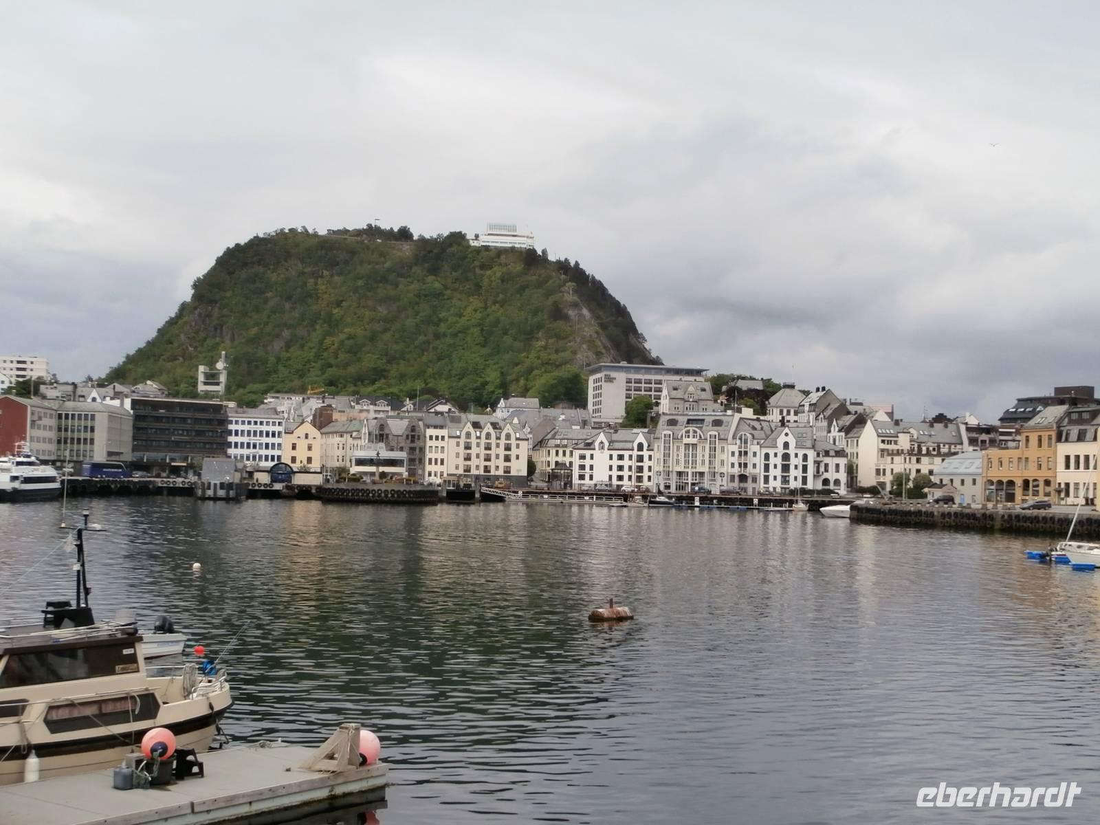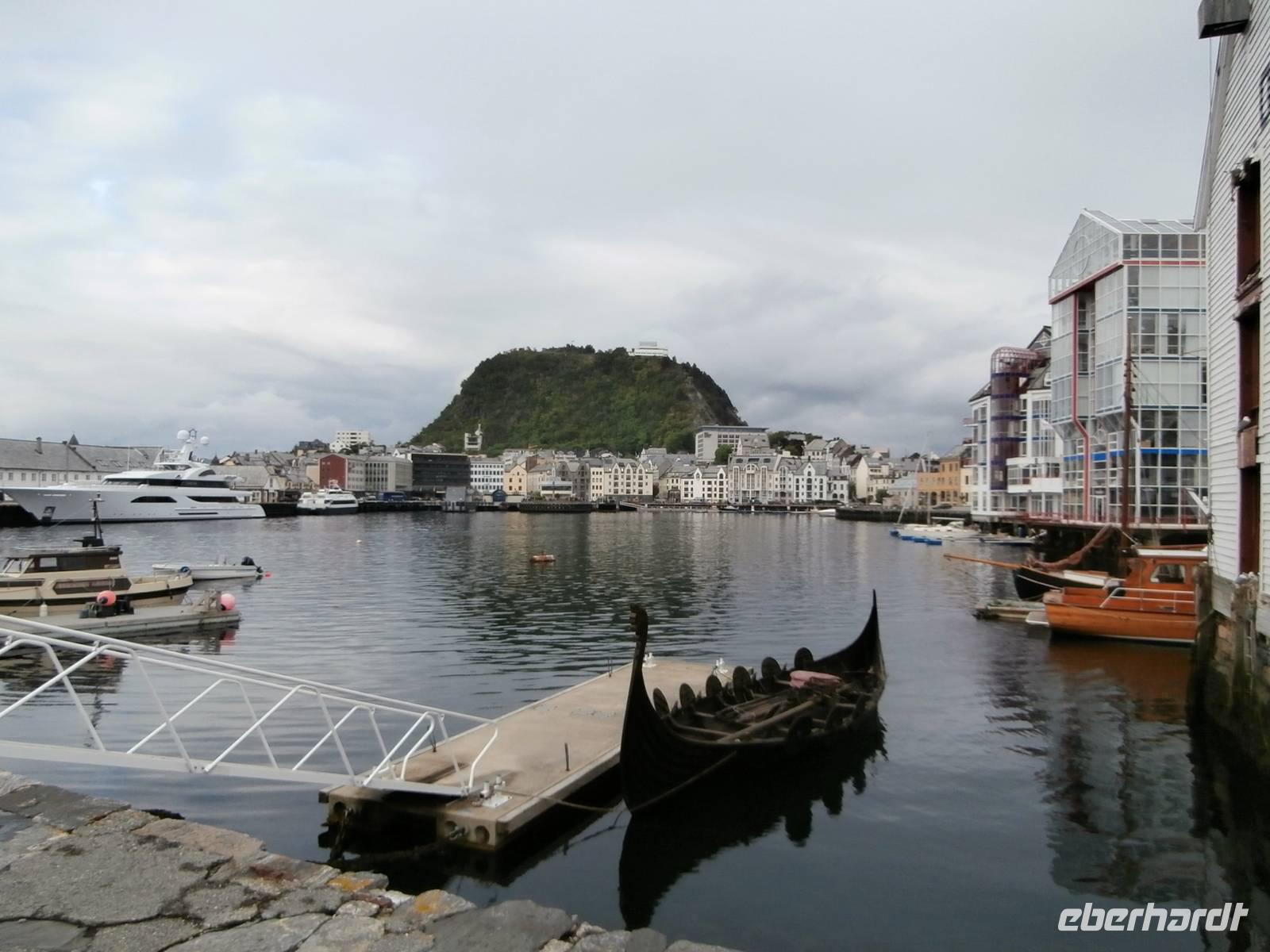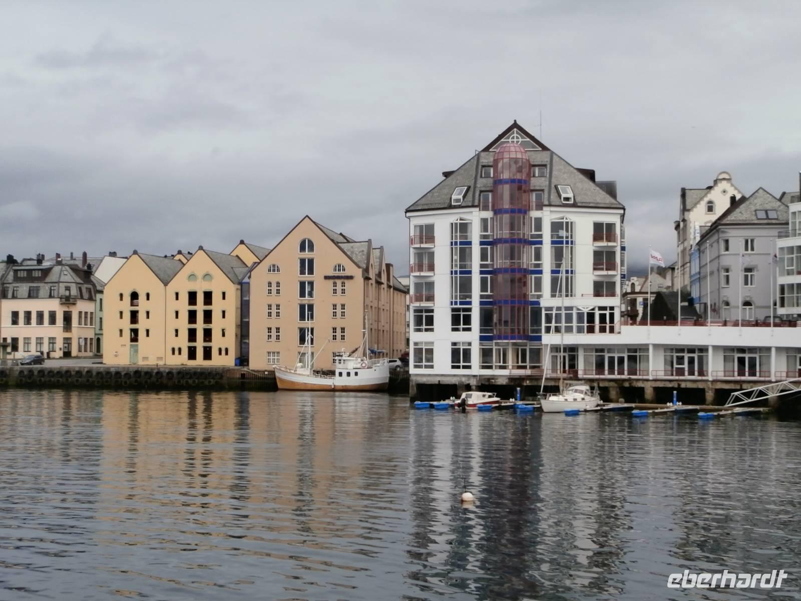 Die Nacht hat den Regen nach Molde gebracht und so starten wir mit viel Regen und einem wolkenverhangenem Himmel in den Tag. Nach einem vorzüglichen Sonntagsfrühstück verstauen wir wieder unsere Koffer im Bus und die Fahrt hinauf auf den Varden, den Hausberg von Molde, schenken wir uns bei diesem Wetter. Am heutigen Tag haben wir auch eine kurze Fährüberfahrt von Sølsnes nach Afarnes, ein ganz neues Erlebnis für unsere Reisegäste. Das Erklimmen der "Trollstigen" ist unser nächster Höhepunkt. Vorbei an Andalsnes, hier ist der Endpunkt der Raumabahn, die eine der schönsten Eisenbahnstrecken Norwegens ist. An der Trollwand im Regen legen wir einen Fotostopp ein. Danach machen wir uns auf den Weg, die von hohen Gipfeln und tiefen Schluchten umgebene Bergstraße Trollstige, die ihren Namen von der Volkssage um die dort "hausenden Trolle" erhalten hat, zu erkunden. Die 11 Haarnadelkurven überwinden wir mit Hochachtung vor der Fahrkunst unseres Fahrers Bernd Ihle, leider ist im dicken Nebel und Regen nicht viel von der Schönheit der Umgebung zu sehen. Unser Stoßgebet ist wahrscheinlich weiter oben angekommen, denn auf dem Plateau wird mehr Sicht in das Tal und die Wassermassen im Trollstigfossen. Durch das Meierdal vorbei am Canyon Gudbrandsjuvet, hier machen wir unsere Mittagspause und auch einen Fotostopp. Weiter geht es hinunter ins romantische Valldal, das Zentrum des Erdbeeranbaus und nun kommen wir an den großartigen Tafjord, der ein Seitenarm des Storfjordes ist. Fjorde sind das gewisse Etwas in Skandinavien, was aber zeichnet dieses Gewässer aus? Ein Fjord ist ein Berg und ein Fluss, die sich in einer viele tausend Jahre zurückliegenden Eiszeit miteinander verbunden haben. Auf unserer Strecke liegen die Fjordhauptstadt Bergen, der Sognefjord und der Nordfjord inmitten von Gletschern. In Stordal werfen wir einen kurzen Blick in die herrliche Rosenkirche mit schöner Malerei. Unsere Ankunft in Alesund bekommen wir trocken hin und so nutzen die Gäste die Freizeit zum Erkunden der Fischereihauptstadt im Jugendstil, sie ist 1904 bei einem großen Brand fast völlig zerstört wurden.