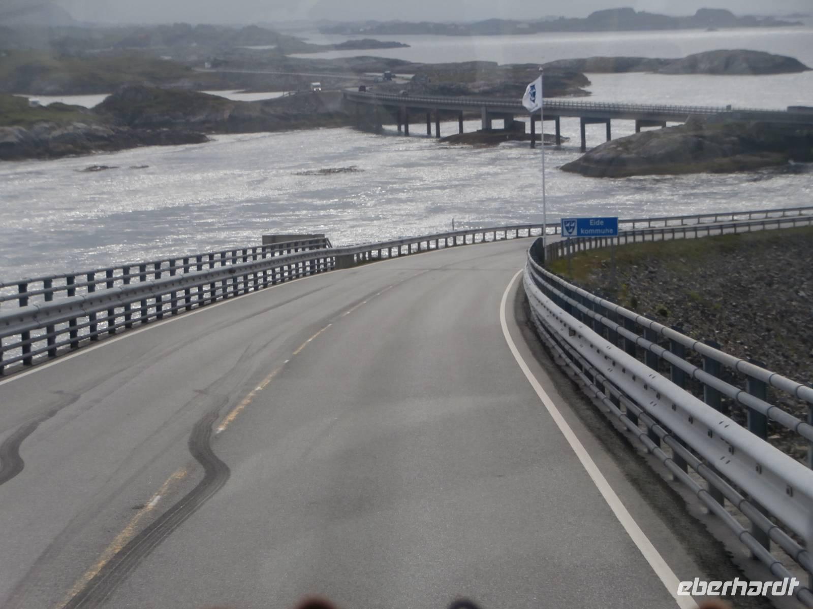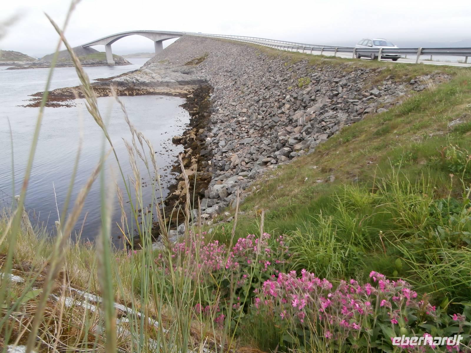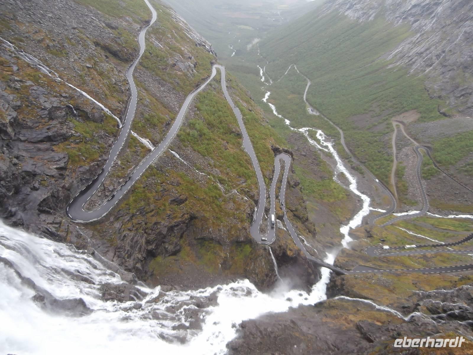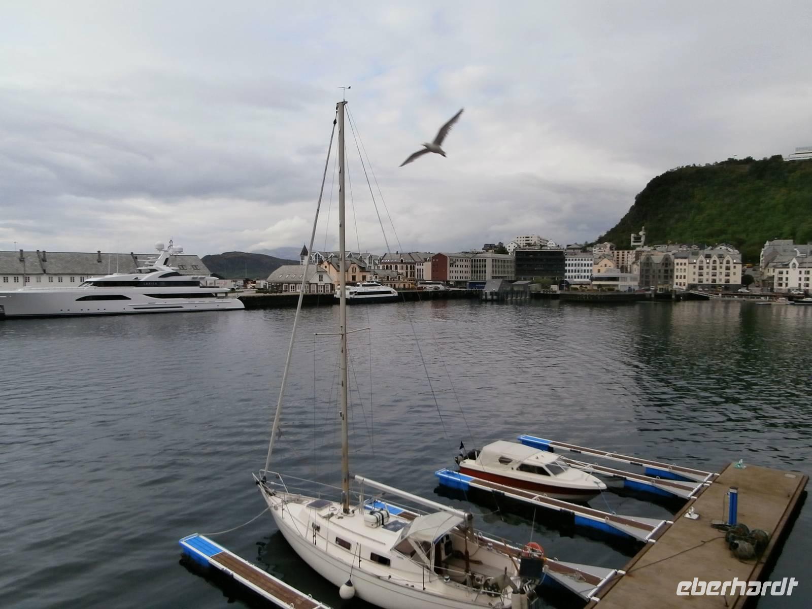 Die Nacht hat den Regen nach Molde gebracht und so starten wir mit viel Regen und einem wolkenverhangenem Himmel in den Tag. Nach einem vorzüglichen Sonntagsfrühstück verstauen wir wieder unsere Koffer im Bus und die Fahrt hinauf auf den Varden, den Hausberg von Molde, schenken wir uns bei diesem Wetter. Am heutigen Tag haben wir auch eine kurze Fährüberfahrt von Sølsnes nach Afarnes, ein ganz neues Erlebnis für unsere Reisegäste. Das Erklimmen der "Trollstigen" ist unser nächster Höhepunkt. Vorbei an Andalsnes, hier ist der Endpunkt der Raumabahn, die eine der schönsten Eisenbahnstrecken Norwegens ist. An der Trollwand im Regen legen wir einen Fotostopp ein. Danach machen wir uns auf den Weg, die von hohen Gipfeln und tiefen Schluchten umgebene Bergstraße Trollstige, die ihren Namen von der Volkssage um die dort "hausenden Trolle" erhalten hat, zu erkunden. Die 11 Haarnadelkurven überwinden wir mit Hochachtung vor der Fahrkunst unseres Fahrers Bernd Ihle, leider ist im dicken Nebel und Regen nicht viel von der Schönheit der Umgebung zu sehen. Unser Stoßgebet ist wahrscheinlich weiter oben angekommen, denn auf dem Plateau wird mehr Sicht in das Tal und die Wassermassen im Trollstigfossen. Durch das Meierdal vorbei am Canyon Gudbrandsjuvet, hier machen wir unsere Mittagspause und auch einen Fotostopp. Weiter geht es hinunter ins romantische Valldal, das Zentrum des Erdbeeranbaus und nun kommen wir an den großartigen Tafjord, der ein Seitenarm des Storfjordes ist. Fjorde sind das gewisse Etwas in Skandinavien, was aber zeichnet dieses Gewässer aus? Ein Fjord ist ein Berg und ein Fluss, die sich in einer viele tausend Jahre zurückliegenden Eiszeit miteinander verbunden haben. Auf unserer Strecke liegen die Fjordhauptstadt Bergen, der Sognefjord und der Nordfjord inmitten von Gletschern. In Stordal werfen wir einen kurzen Blick in die herrliche Rosenkirche mit schöner Malerei. Unsere Ankunft in Alesund bekommen wir trocken hin und so nutzen die Gäste die Freizeit zum Erkunden der Fischereihauptstadt im Jugendstil, sie ist 1904 bei einem großen Brand fast völlig zerstört wurden.