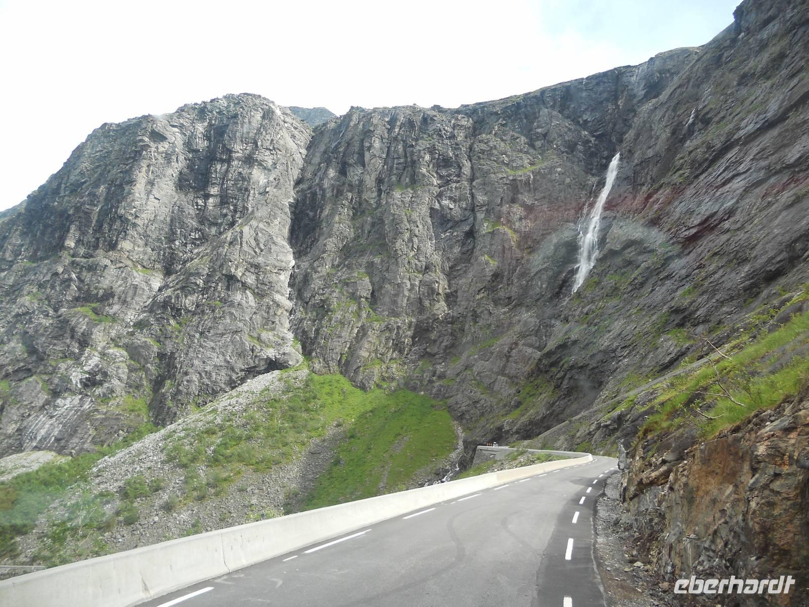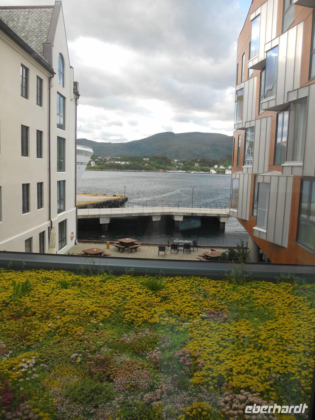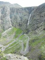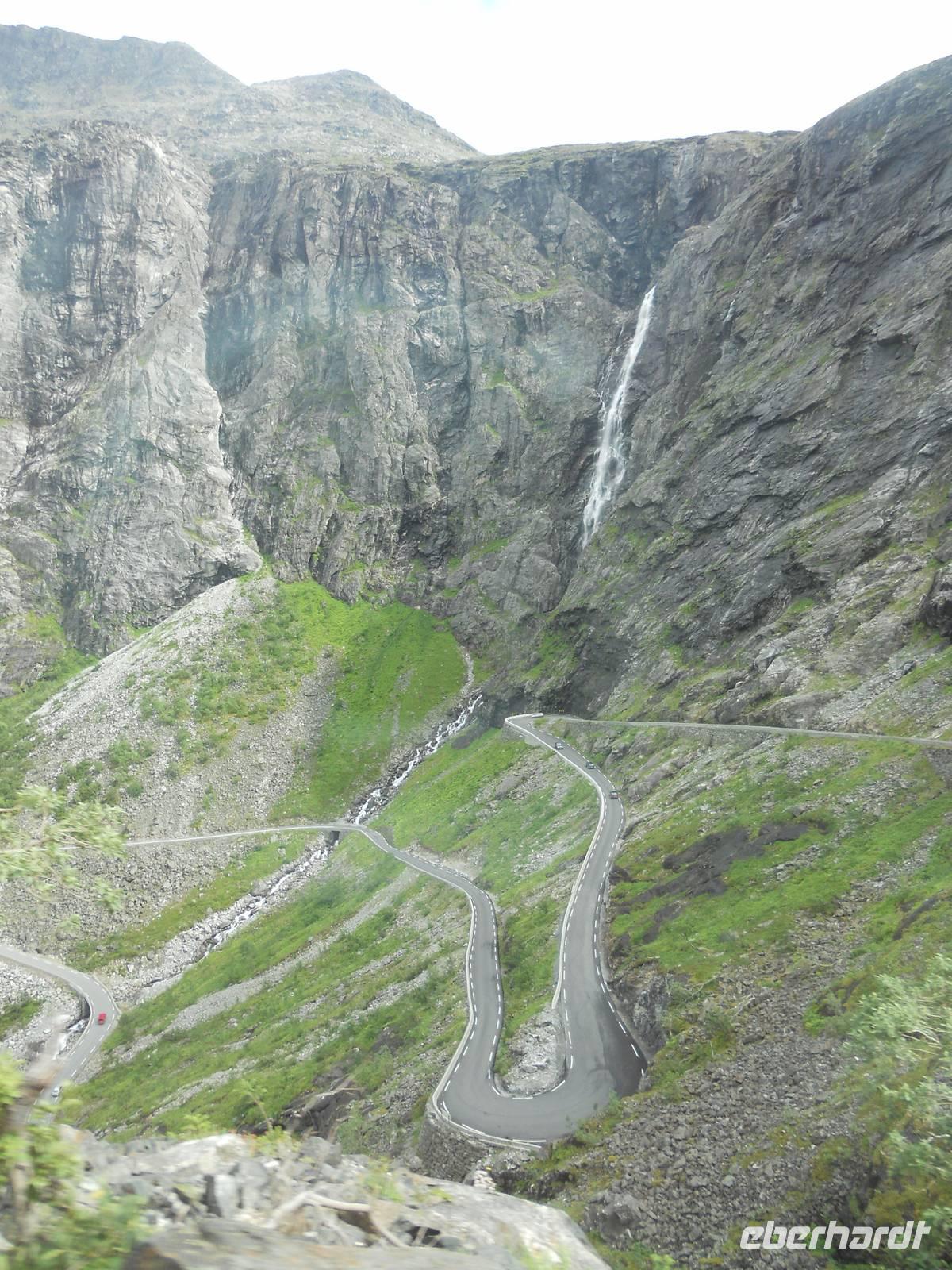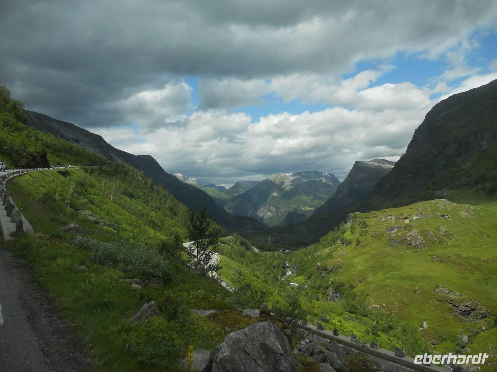Als Sonntagsauftakt geht es auf den Hausberg von Molde, den Varden. Obwohl dieser nur 407 m hoch ist, erleben wir ein traumhaftes Panorama der Stadt, zum Teil noch mit Nebelschleiern verdeckt, mit all den vielen Inselchen, und der Bergkulisse der Romsdalen dahinter. Einfach herrlich! Danach geht die Fahrt Richtung Trollwand und Trollstiegen, mit fantastischen Wasserfällen und Steilwänden, und der beeindruckenden Straße der Trollstiegen. Hier hat unser Chauffeur Dieter ganze Arbeit zu leisten, es geht in sogenannten "Haarnadelkurven" nach oben. Am Paß dann eine längere Pause mit kleinen Erkundungen auf gut ausgebauten Wegen. Fotomotive überall, der Blick zurück über die Kehren mit all den Wasserfällen ist toll. Der weitere Weg führt durch das Gebirge der Romsdalen, entlang des Norddalsfjorden und des Storfjorden bis Alesund. Wir bestaunen rauschende Strudeltöpfe und essen frische Erdbeeren - denn wir sind hier im Erdbeerland Norwegens. Der nahe Golfstrom sorgt für mildes Klima in den Fjorden, beste Bedingungen für Obst und Gemüse. Gegen Abend erreichen wir die Küstenstadt Alesund.