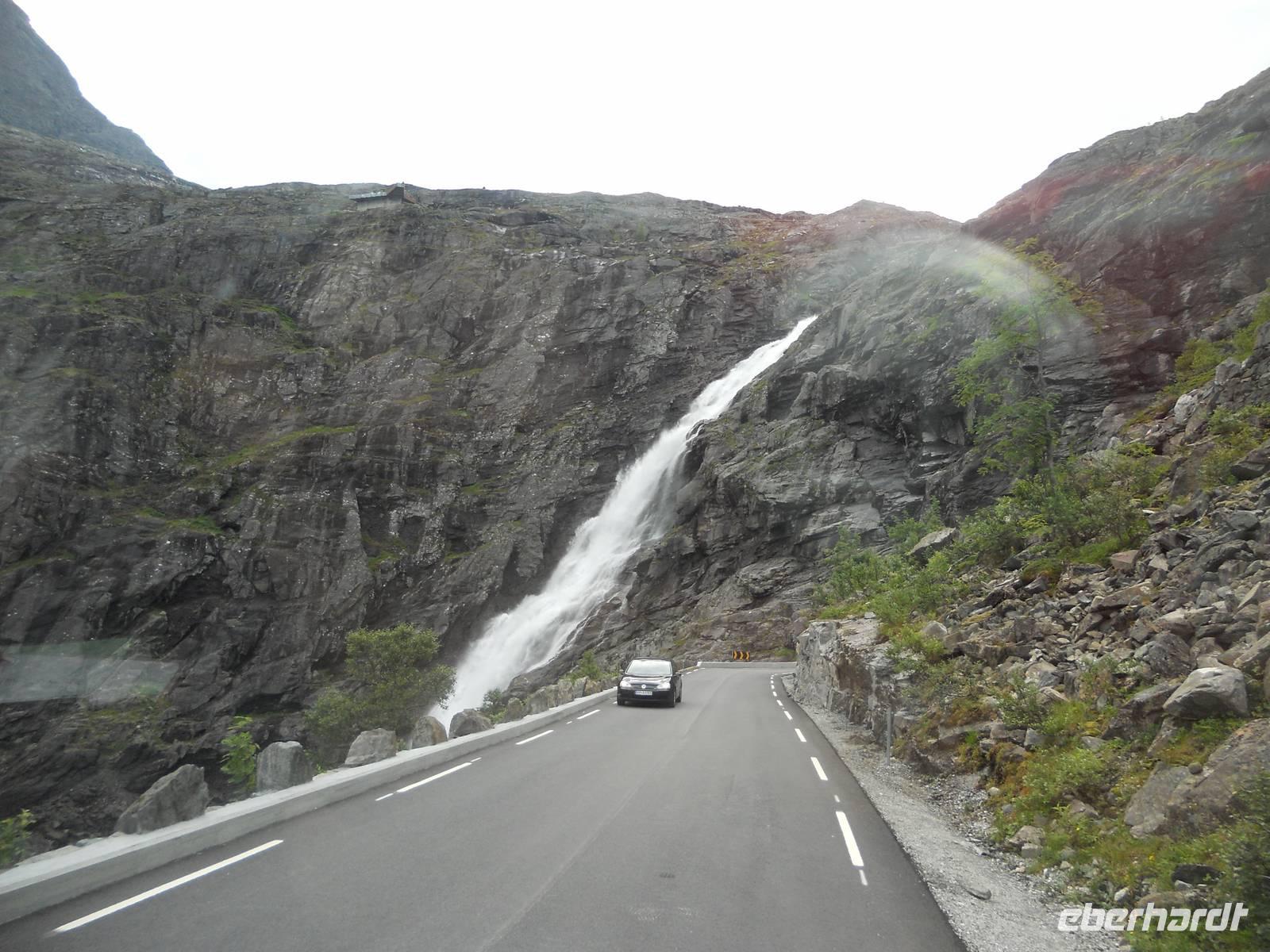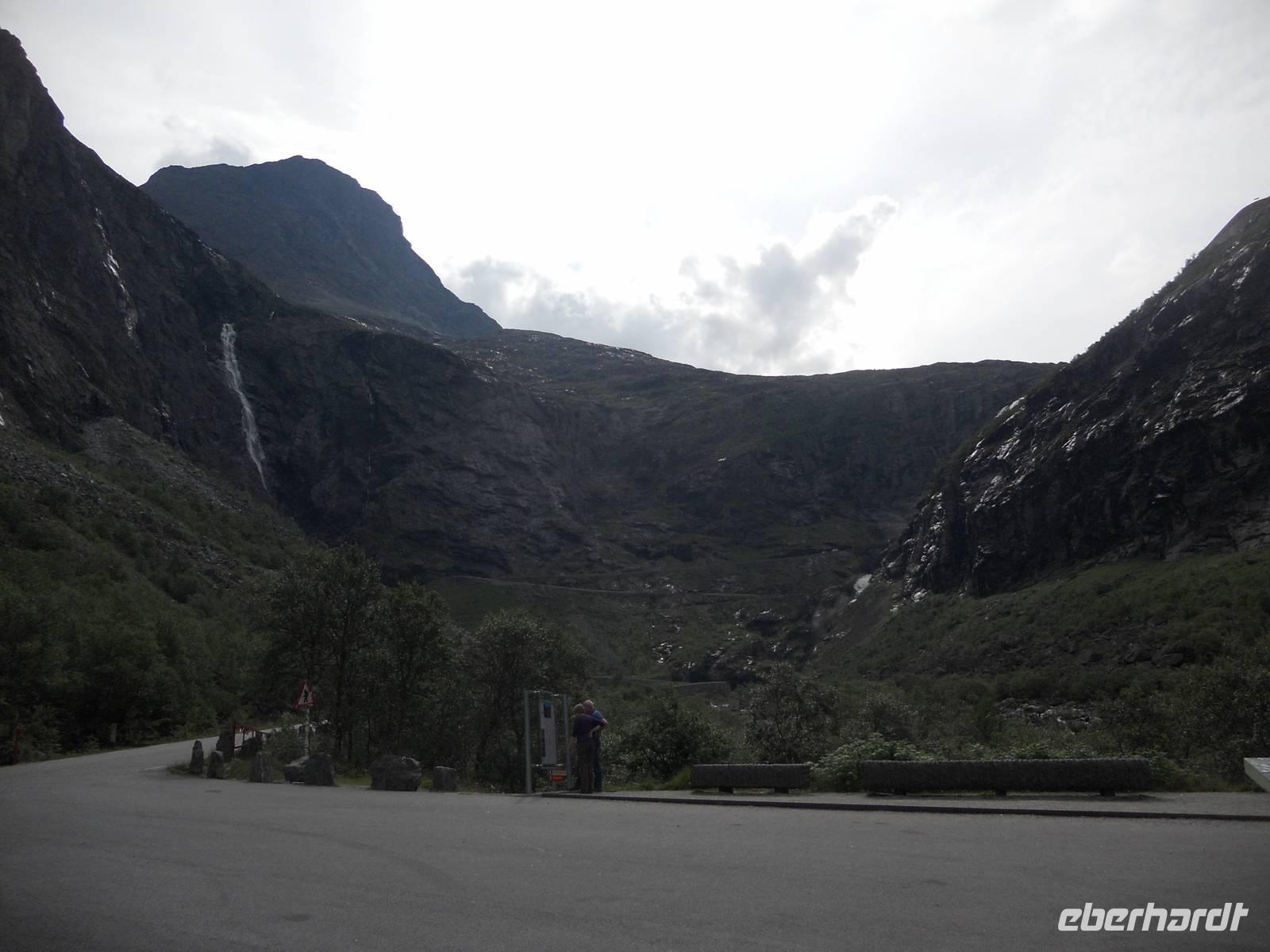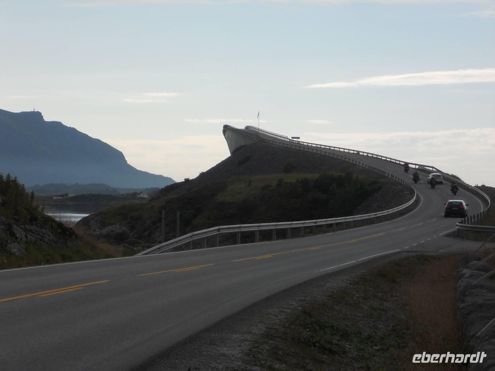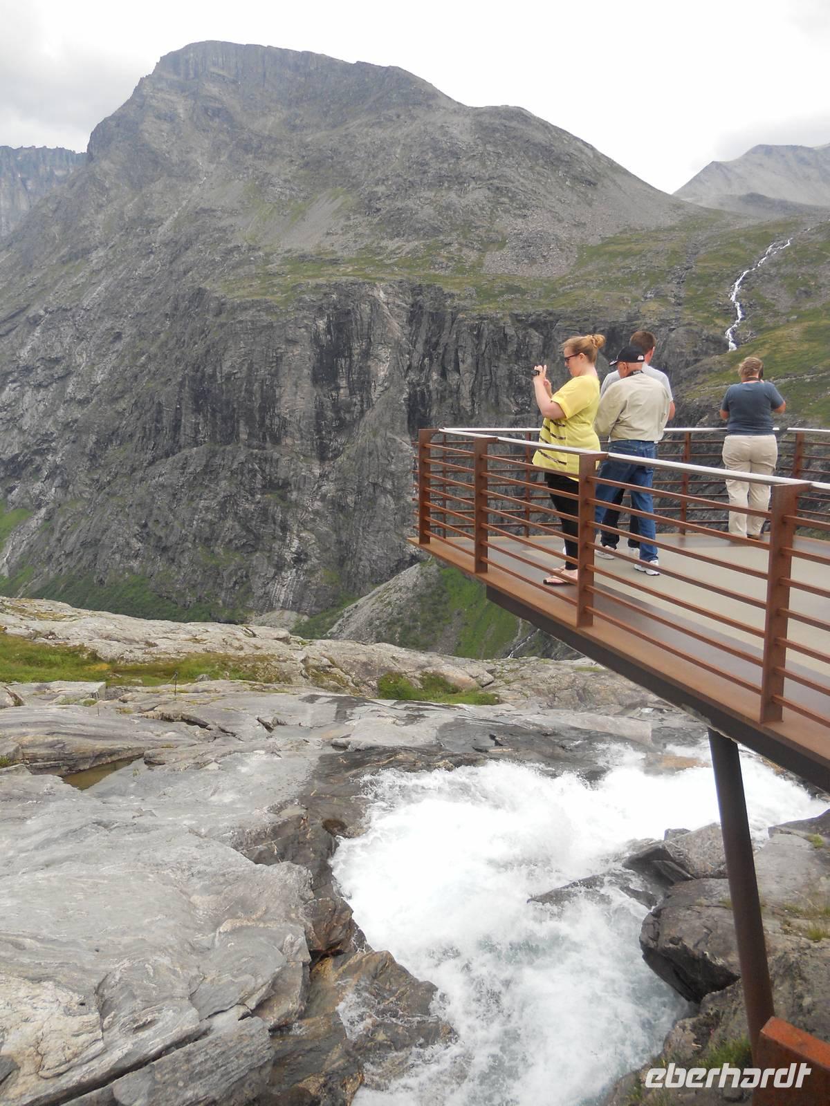 Als Sonntagsauftakt geht es auf den Hausberg von Molde, den Varden. Obwohl dieser nur 407 m hoch ist, erleben wir ein traumhaftes Panorama der Stadt, zum Teil noch mit Nebelschleiern verdeckt, mit all den vielen Inselchen, und der Bergkulisse der Romsdalen dahinter. Einfach herrlich! Danach geht die Fahrt Richtung Trollwand und Trollstiegen, mit fantastischen Wasserfällen und Steilwänden, und der beeindruckenden Straße der Trollstiegen. Hier hat unser Chauffeur Dieter ganze Arbeit zu leisten, es geht in sogenannten "Haarnadelkurven" nach oben. Am Paß dann eine längere Pause mit kleinen Erkundungen auf gut ausgebauten Wegen. Fotomotive überall, der Blick zurück über die Kehren mit all den Wasserfällen ist toll. Der weitere Weg führt durch das Gebirge der Romsdalen, entlang des Norddalsfjorden und des Storfjorden bis Alesund. Wir bestaunen rauschende Strudeltöpfe und essen frische Erdbeeren - denn wir sind hier im Erdbeerland Norwegens. Der nahe Golfstrom sorgt für mildes Klima in den Fjorden, beste Bedingungen für Obst und Gemüse. Gegen Abend erreichen wir die Küstenstadt Alesund.