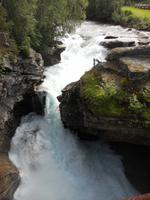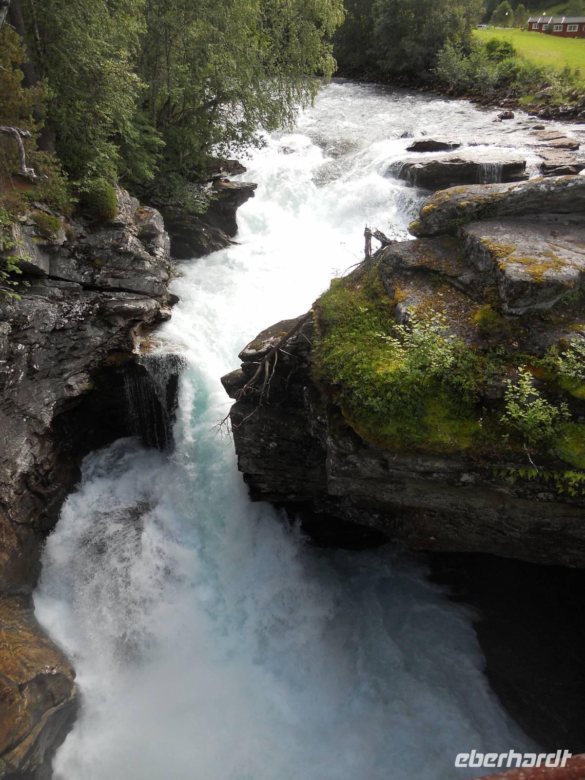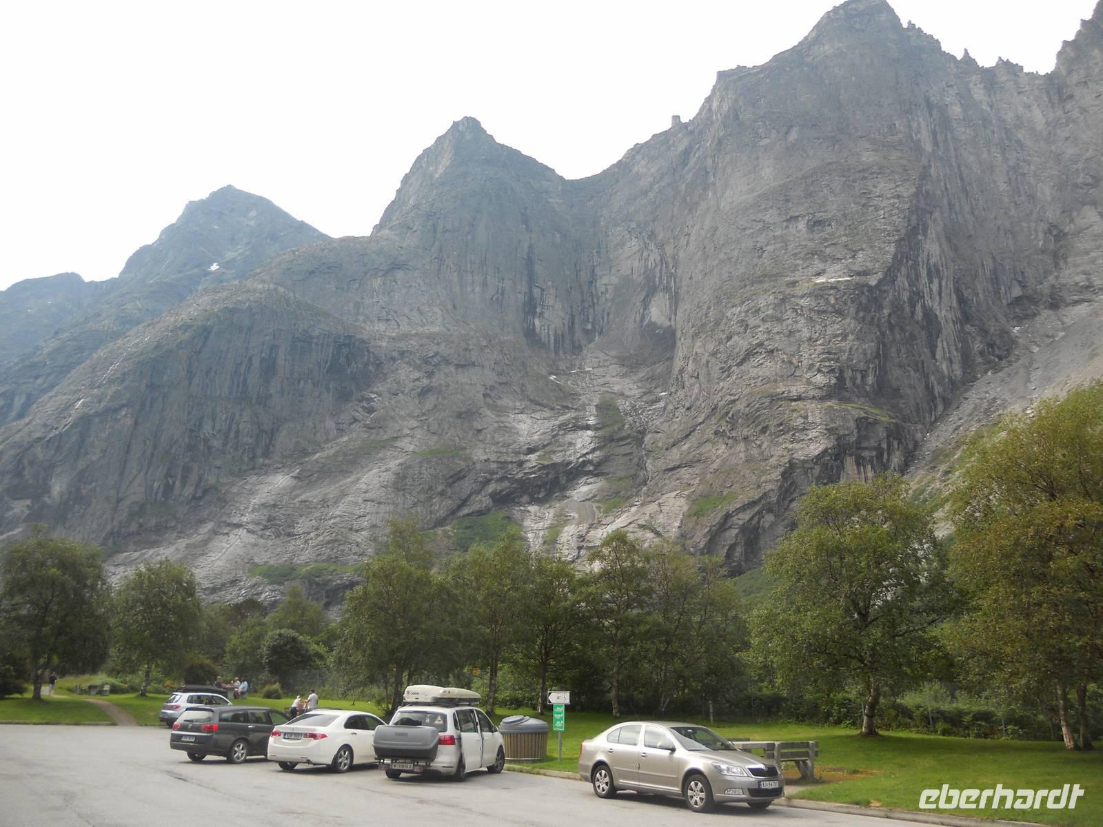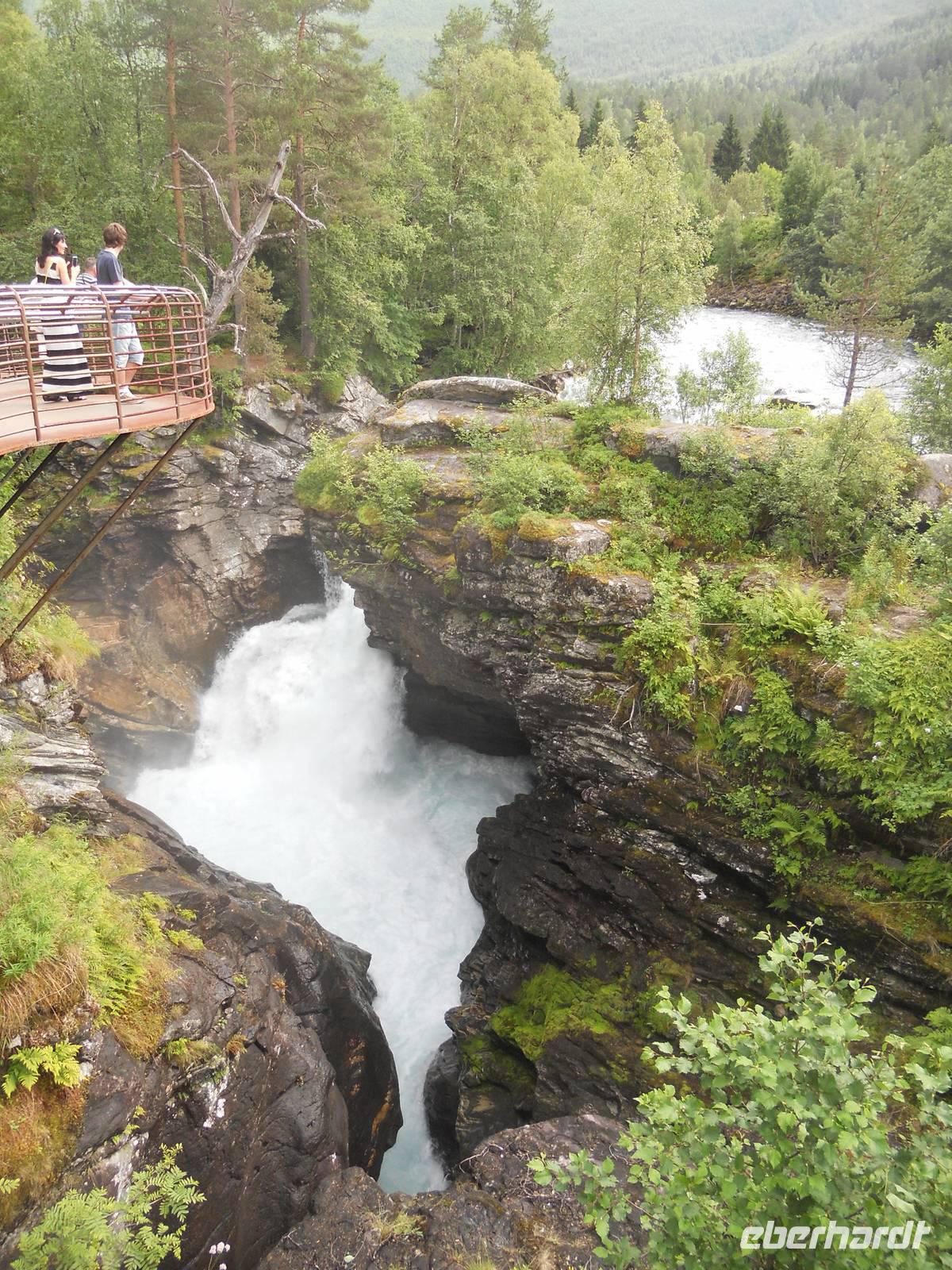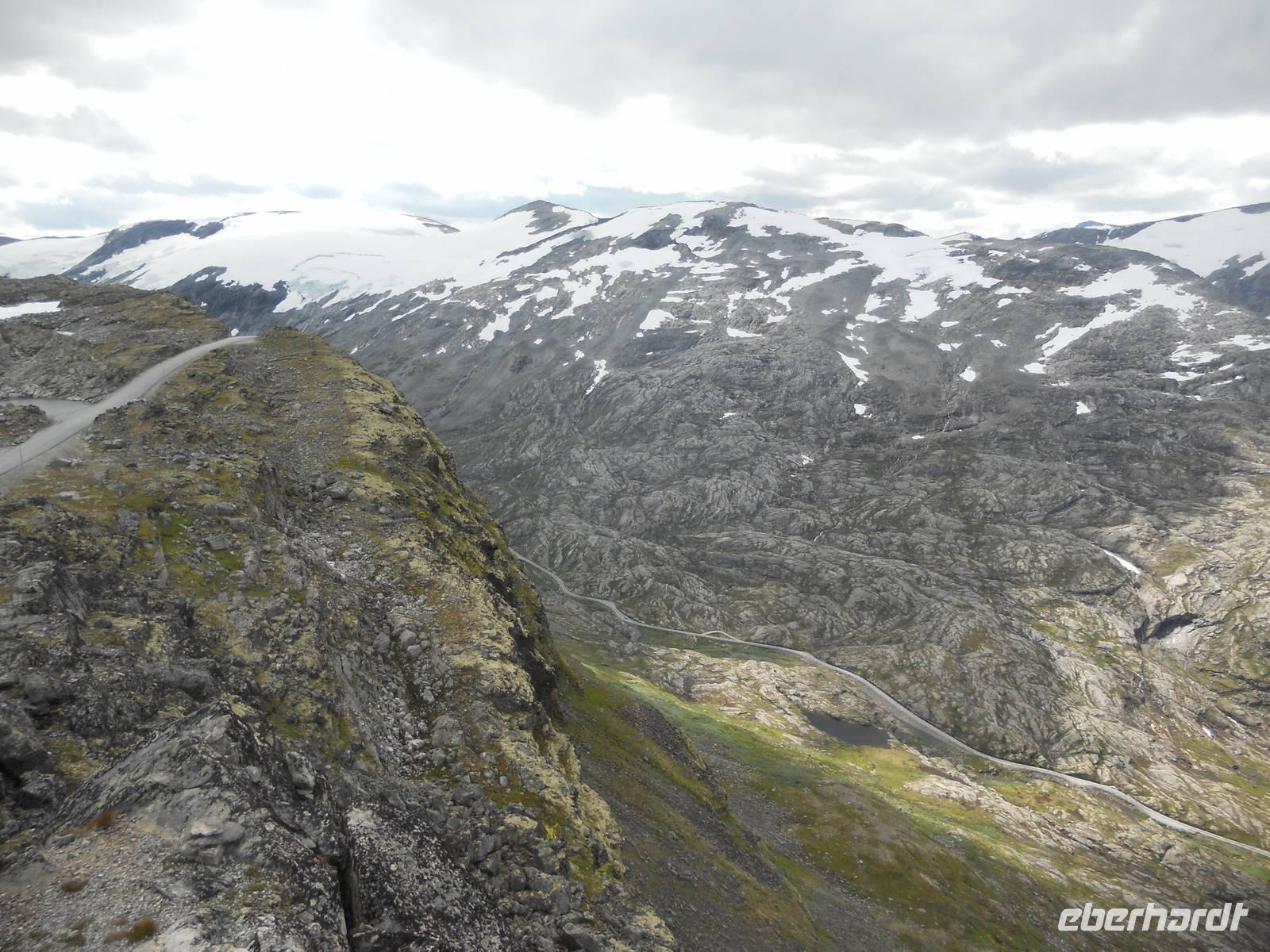 Als Sonntagsauftakt geht es auf den Hausberg von Molde, den Varden. Obwohl dieser nur 407 m hoch ist, erleben wir ein traumhaftes Panorama der Stadt, zum Teil noch mit Nebelschleiern verdeckt, mit all den vielen Inselchen, und der Bergkulisse der Romsdalen dahinter. Einfach herrlich! Danach geht die Fahrt Richtung Trollwand und Trollstiegen, mit fantastischen Wasserfällen und Steilwänden, und der beeindruckenden Straße der Trollstiegen. Hier hat unser Chauffeur Dieter ganze Arbeit zu leisten, es geht in sogenannten "Haarnadelkurven" nach oben. Am Paß dann eine längere Pause mit kleinen Erkundungen auf gut ausgebauten Wegen. Fotomotive überall, der Blick zurück über die Kehren mit all den Wasserfällen ist toll. Der weitere Weg führt durch das Gebirge der Romsdalen, entlang des Norddalsfjorden und des Storfjorden bis Alesund. Wir bestaunen rauschende Strudeltöpfe und essen frische Erdbeeren - denn wir sind hier im Erdbeerland Norwegens. Der nahe Golfstrom sorgt für mildes Klima in den Fjorden, beste Bedingungen für Obst und Gemüse. Gegen Abend erreichen wir die Küstenstadt Alesund.