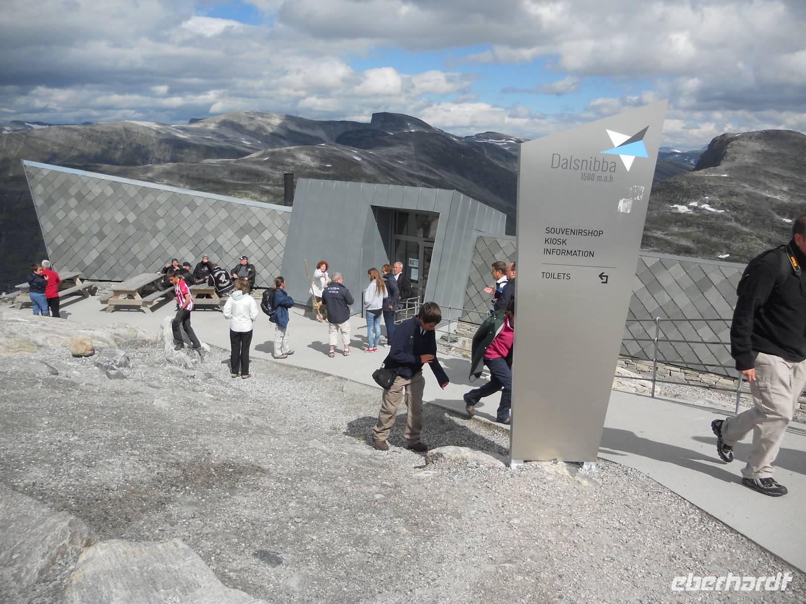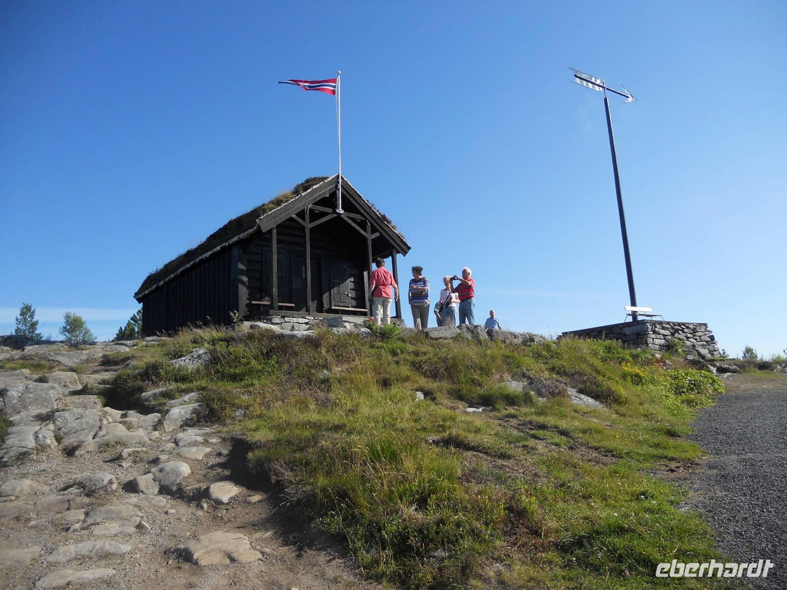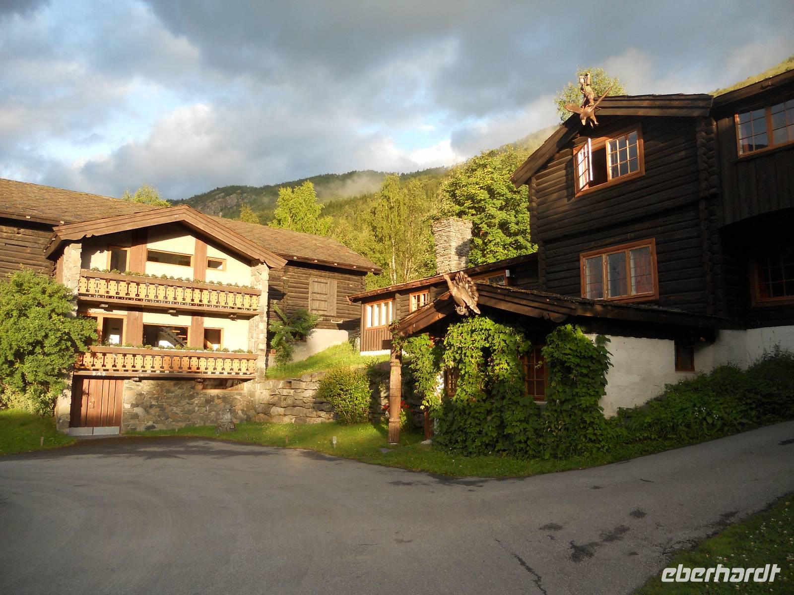 Zuerst gibt es noch eine kurze Fährüberfahrt, dann die Fahrt wieder durch das Romsdalen-Gebirge, bis nach Hellesylt. Dort startet unsere Kreuzfahrt. Vorbei an den berühmten Wasserfällen der "Sieben Schwestern", dem "Freier" und dem "Brautschleier". In Geiranger angekommen sind wir nicht ganz allein. Zwei große Kreuzschiffe haben angelegt. Wir fahren im Ort nach oben zu einer sehr schönen Aussichtsfläche mit Blick zurück zum Fjord. Hier ist der richtige Platz für unser Gruppenfoto, bei diesem Hintergrund. Doch das schöne Wetter verspricht uns noch mehr: wir fahren weiter bis zur Passhöhe und dann auf den Gipfel das Dalsnibba. Auf fast 1500 m Höhe können wir eine einmalige Aussicht genießen! Traumhaft schön - und dieses Erlebnis begießen wir auch mit einem Glas Wackerbarth! Mit weiteren Fotostopps an besonders schönen Aussichtspunkten oder Wasserfällen führt unser Weg weiter ostwärts durch das Ottadalen bis nach Lom. Hier besichtigen wir die schöne alte Stabkirche. Unser junger Kirchenführer trägt heute Festkleidung, denn es ist der St.-Olafs-Tag! Davon haben wir schon in Trondheim gehört, wo eine ganze Woche lang gefeiert wird. Von Lom ist es nicht mehr weit bis zu unserer Übernachtung im Traditionshotel Elveseter. Verwunschen liegt es am Fusse des höchsten Berges von Norwegen, dem Galdhöppigen.
