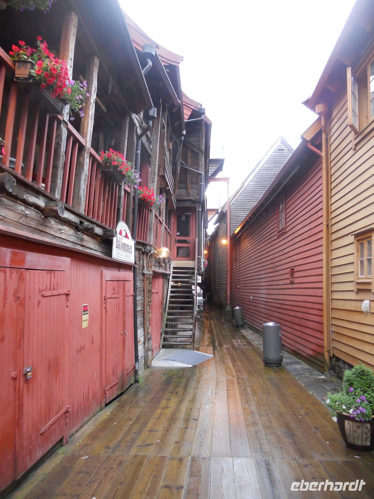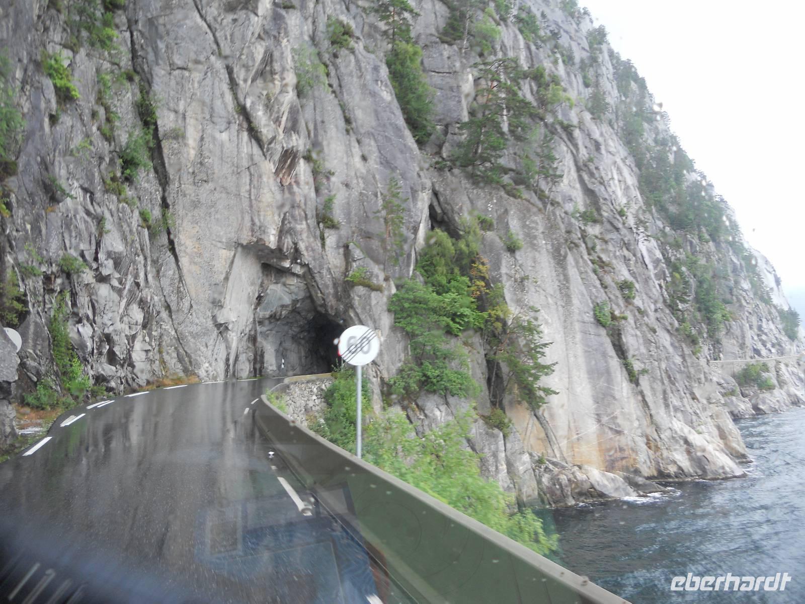 Auch heute wollen wir einen weiteren berühmten Fjord kennenlernen, den Sognefjord. Von Kaupanger geht die Fahrt durch den Aurlandsfjorden bis nach Gudvangen. Doch zuvor erleben wir wieder eine Busstrecke voller landschaftlicher Höhepunkte. Vom Sognefjell können wir so manche Gletscherzunge der schneebedeckten Jotunheimer Bergriesen bewundern, und natürlich im Bild festhalten. Und die Gebirgsregion ist weit und menschenleer - Natur pur. Die Schifffahrt wird ein weiteres Erlebnis in malerischer Bergwelt. Bis Bergen führt unser Weg, und das letzte Stück zeigt viele Tunnel. In Bergen begrüßt uns naturgemäß Regen, doch wir lassen uns nicht entmutigen. Einen Stadtbummel und die Fahrt auf den Hausberg Floy muss dennoch sein. Da hat sogar der Regen ein Einsehen und pausiert extra für uns.