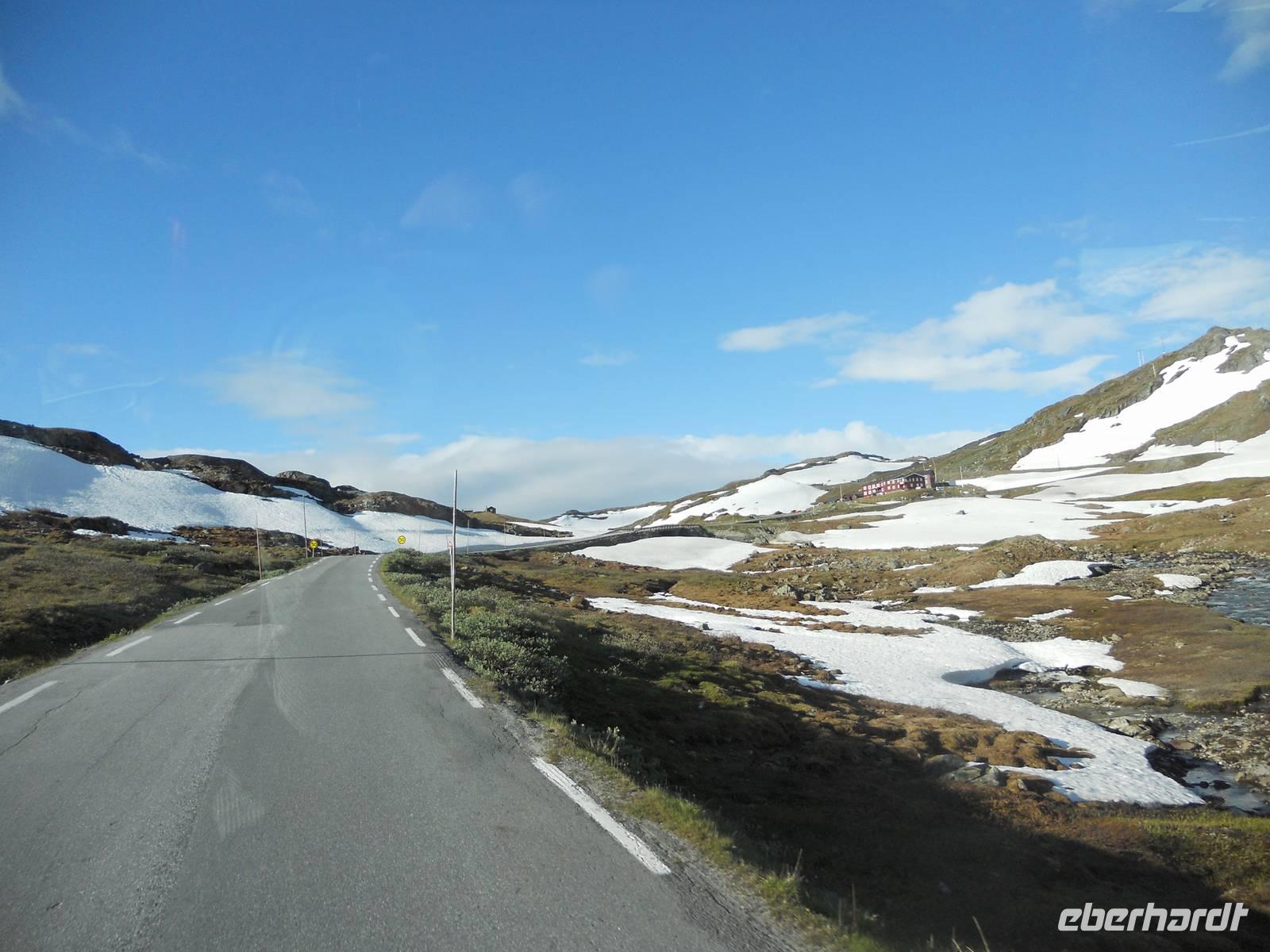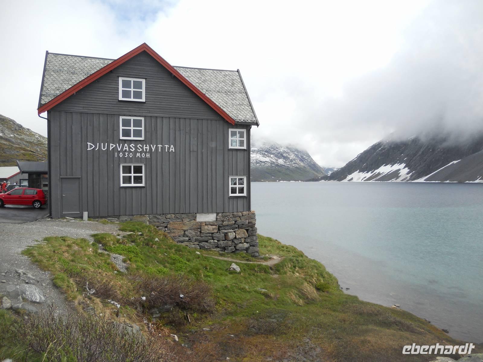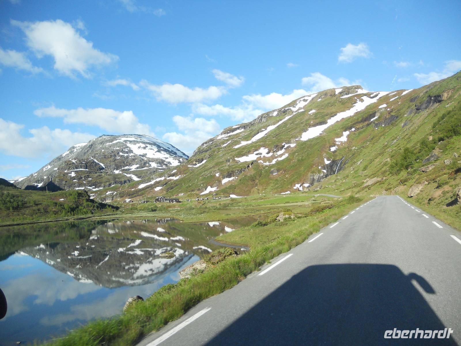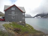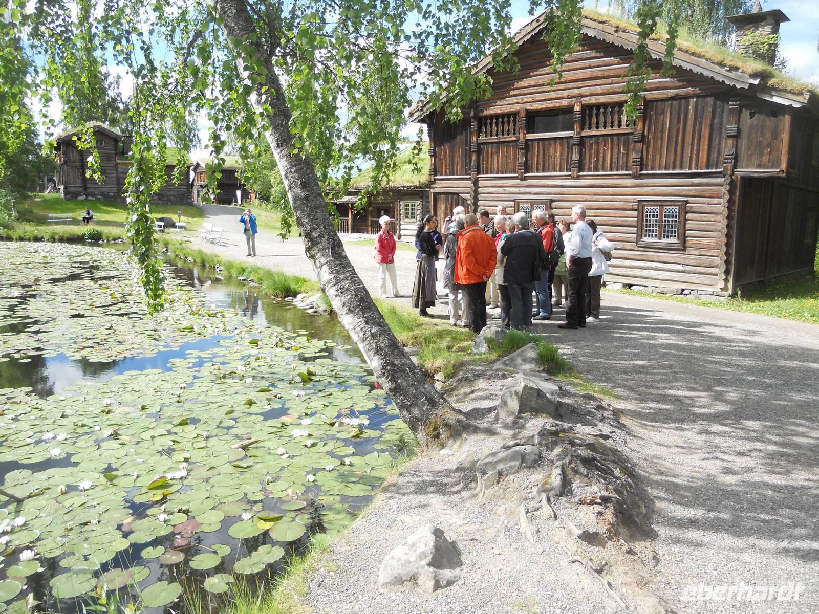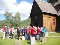 Zuerst gibt es noch eine kurze Fährüberfahrt, dann die Fahrt wieder durch das Romsdalen-Gebirge, bis nach Hellesylt. Dort startet unsere Kreuzfahrt. Vorbei an den berühmten Wasserfällen der "Sieben Schwestern", dem "Freier" und dem "Brautschleier". In Geiranger angekommen sind wir nicht ganz allein. Ein großes Kreuzschiff hat angelegt, viele Busse sind wie wir unterwegs. Wir fahren im gleichnamigen Ort Geiranger nach oben zu einer sehr schönen Aussichtsfläche mit Blick hinunter zum Fjord. Hier ist der richtige Platz für unser 1. Gruppenfoto, bei diesem Hintergrund. Doch das Wetter könnte schöner sein. Allmählich beginnt es zumindest langsam besser zu werden. Wir fahren weiter bis zur Passhöhe von 1030 Metern, und machen eine Pause. Mit weiteren Fotostopps an besonders schönen Aussichtspunkten oder Wasserfällen führt unser Weg weiter ostwärts durch das Ottadalen bis nach Lom. Endlich ringt sich die lang ersehnte Sonne durch, und in Lom ist richtig schönes Sommerwetter. Hier besichtigen wir die schöne alte Stabkirche. Unser junger Kirchenführer erläutert uns viele interessante Details dieser berühmten Kirchen Norwegens. Von Lom ist es nicht mehr weit bis zu unserer Übernachtung im Traditionshotel Elveseter. Verwunschen liegt es am Fusse des höchsten Berges von Norwegen, dem Galdhöppigen.