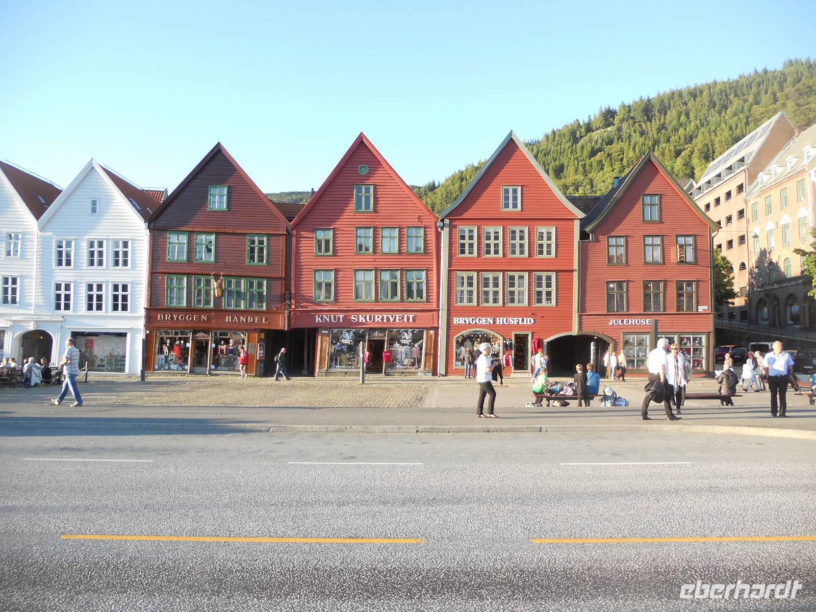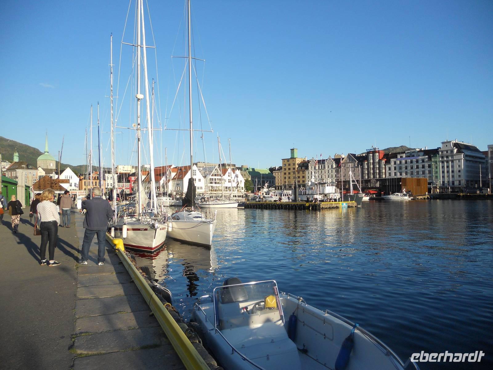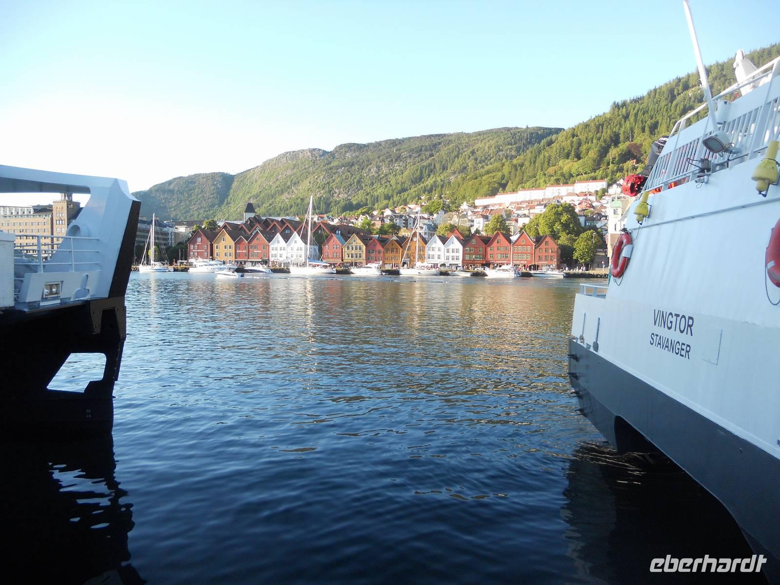 Am Morgen beginnen wir mit einer Stadtrundfahrt in Begleitung einer jungen Stadtführerin aus Deutschland, die erst seit letztem Jahr hier in Bergen lebt, und uns dennoch schon bestens durch die Geschichte der Stadt führt. Zuerst sehen wir den Hafen südseitig, dann ein typisches altes Wohnviertel mit schönen weißen Holzhäusern. Später dann das alte Hanseviertel Bryggen, das Ende ist am Fischmarkt, und hier können wir noch ein wenig nach lokalen Produkten Ausschau halten. Mit weiteren Fotosstopps verlassen wir die Küstenregion Richtung Hordaland, entlang des Hardangerfjorden bis nach Bruravik. Hier ist die alte Fähre außer Betreib, denn die neue große Hardangerbrücke ist fertiggestellt. Etliche große Wasserfälle gab es unterwegs zu sehen, etwa den Steinsdalsfossen oder den Vöringfossen. Die Landschaft der Hardangervidda ist atemberaubend, das Wetter super und wir haben herrliche Weitsicht. In Noresund erreichen wir unser letztes Hotel dieser Reise.